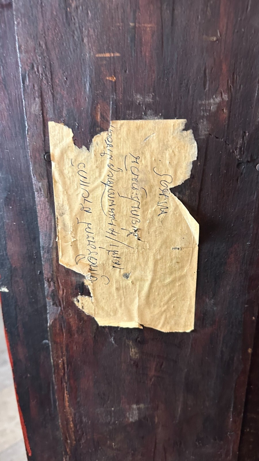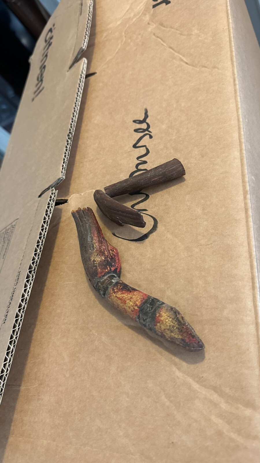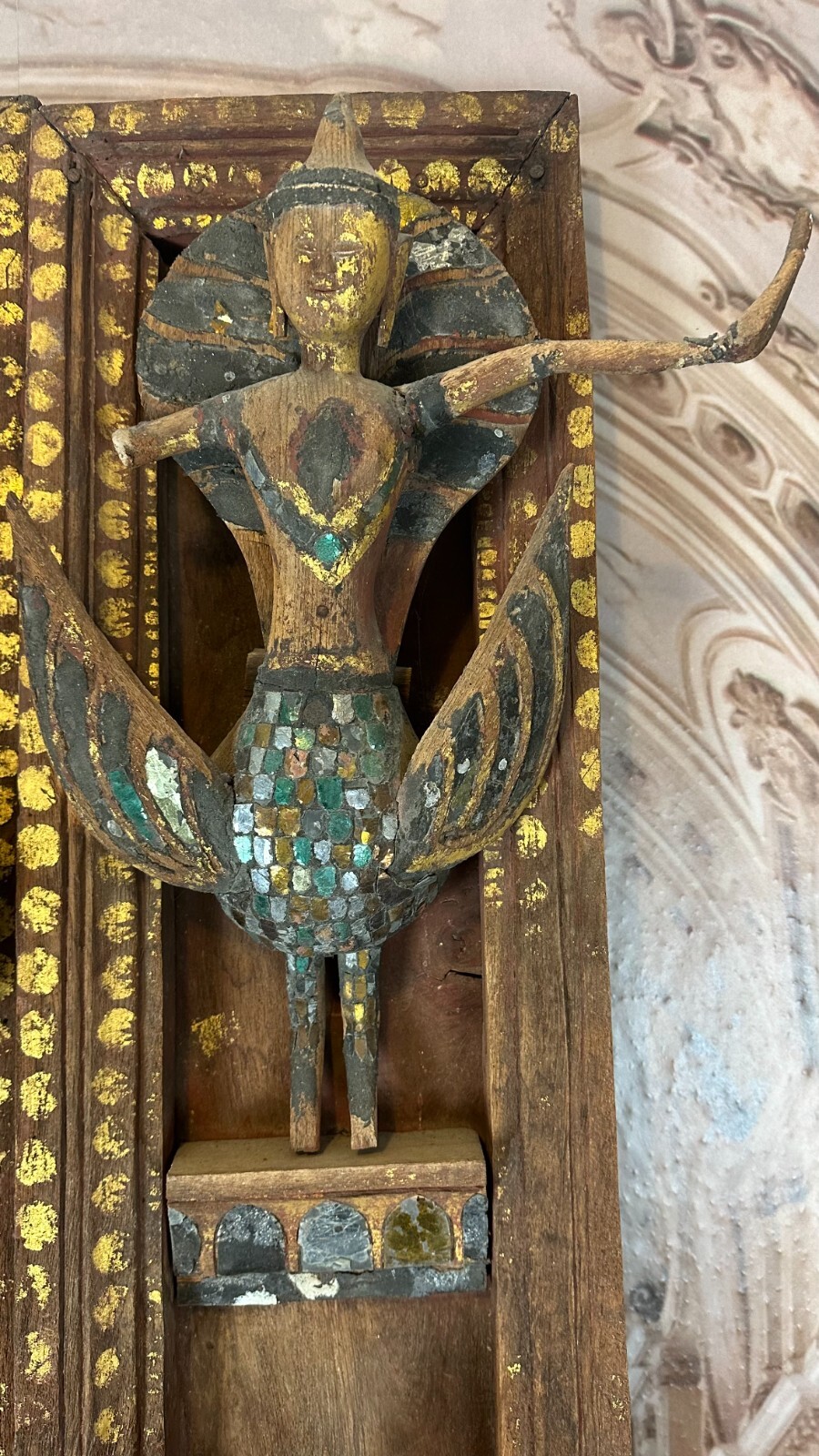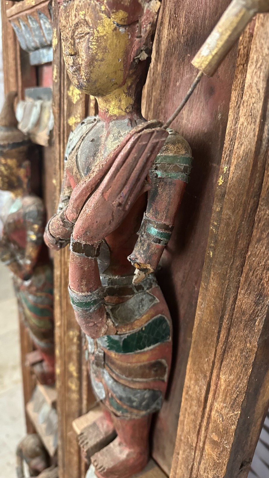 Paar antike thailändische Wandelemente um 1900. Massives Holz, Polychrom gefasst und zum Teil vergoldet. Die Figuren sind zusätzlich mit Glas- und Metallschmuck versehen worden. Zwei Arme lose beiliegend, Teile partiell altgeklebt. Abmessungen BTH ca: 29x20x252cm. Oberfläche zum Teil berieben, die Schmuckelemente zum Teil unvollständig.