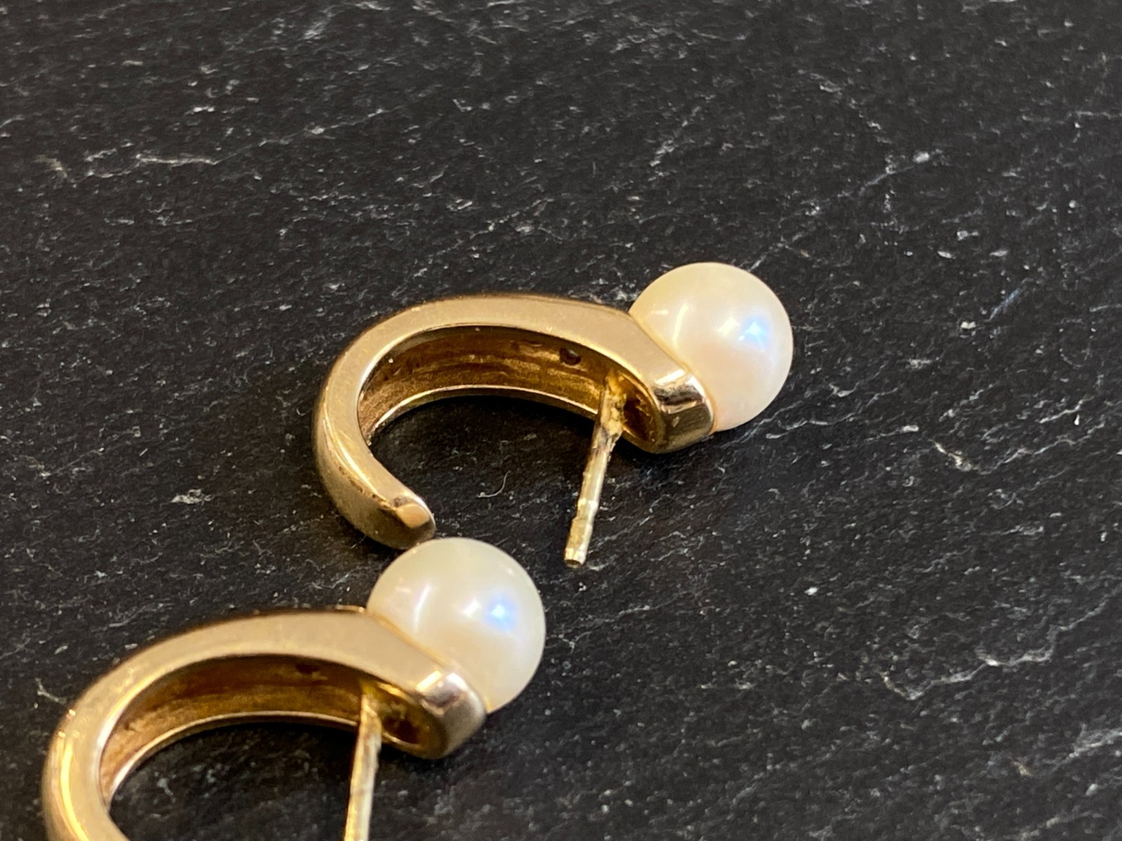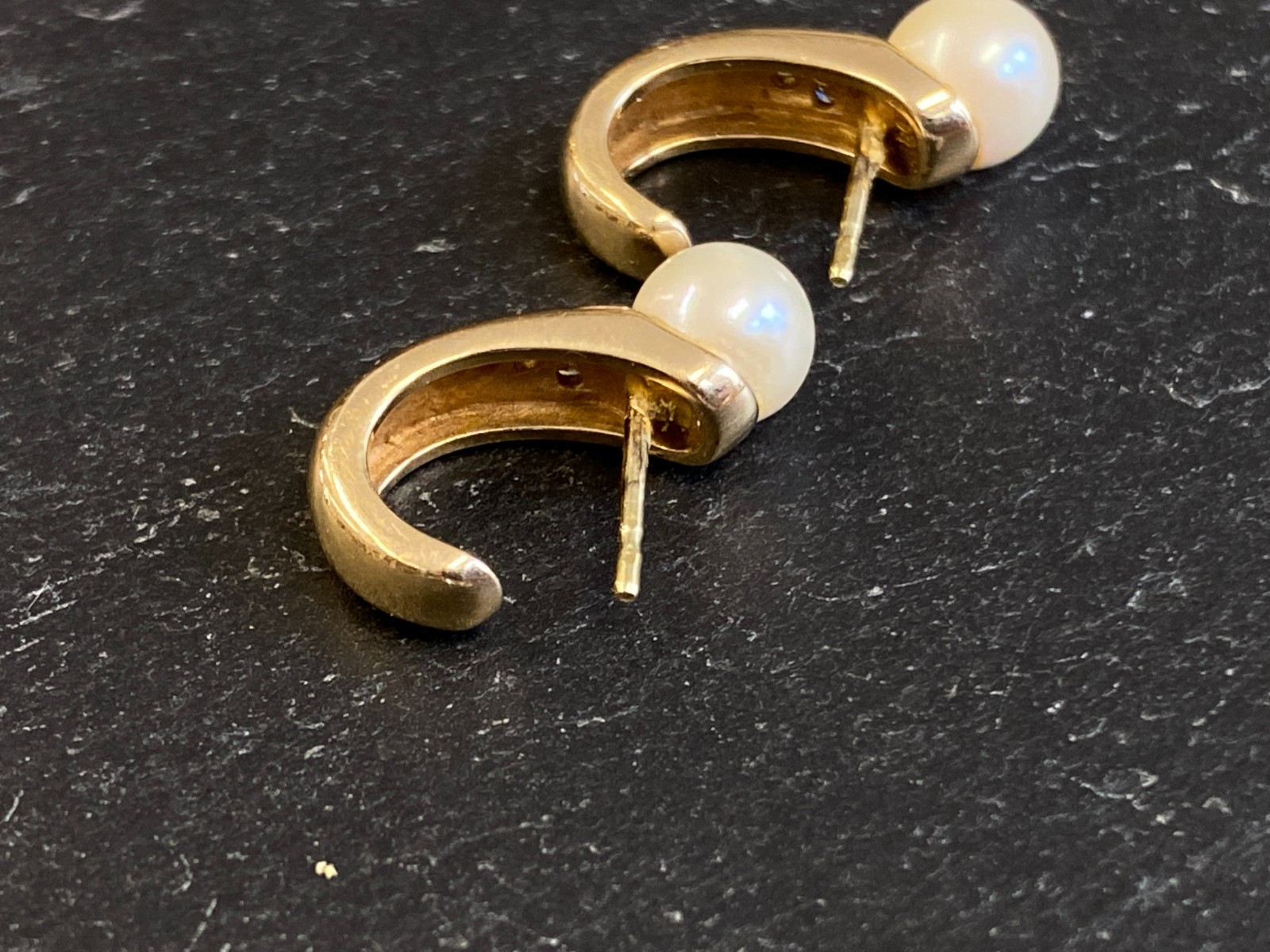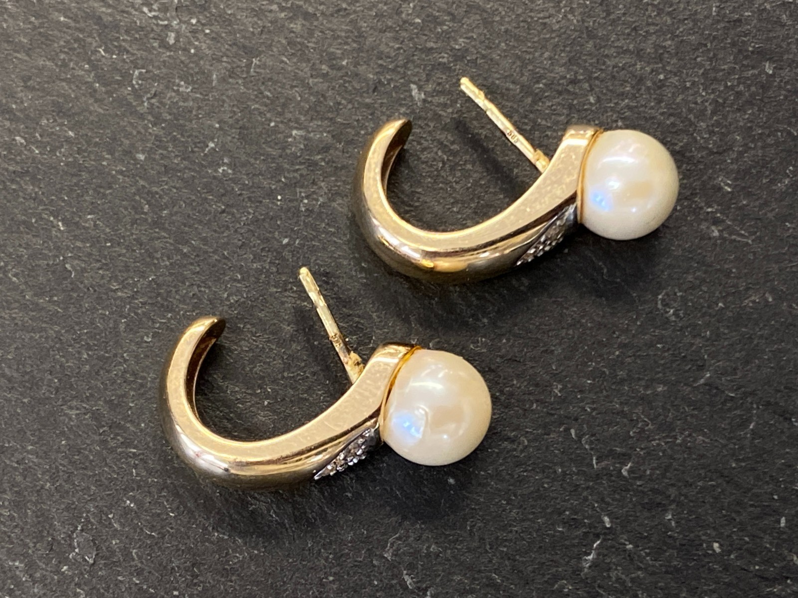 Paar elegante Ohrringe, Gelbgold, punziert mit 585, mit je einer Perle mit einem Durchmesser von ca. 0,68cm. Abgerundet werden die Ohrringe von jeweils 3 kleinen Diamanten unterhalb der Perle, diese haben zus. ca. 0,04ct. in P/I, soweit in den Fassungen messbar. Mit der Lupe sieht man mehrere Abplatzer an den Steinen, mit bloßem Auge merkt man diese nicht. Das Metall der Ohrringe selbst weist minimalsten Abrieb aufleicht angelaufen. BTH der gesamten Ohrringe ca. 0,5/1,5/2cm, Gesamtgewicht ca. 5,73g. Die Begutachtung der Stücke wird vorgenommen von einem Fachmitglied der deutschen gemmologischen Gesellschaft E.V. Ein Schmuckpass wird mitgeliefert.