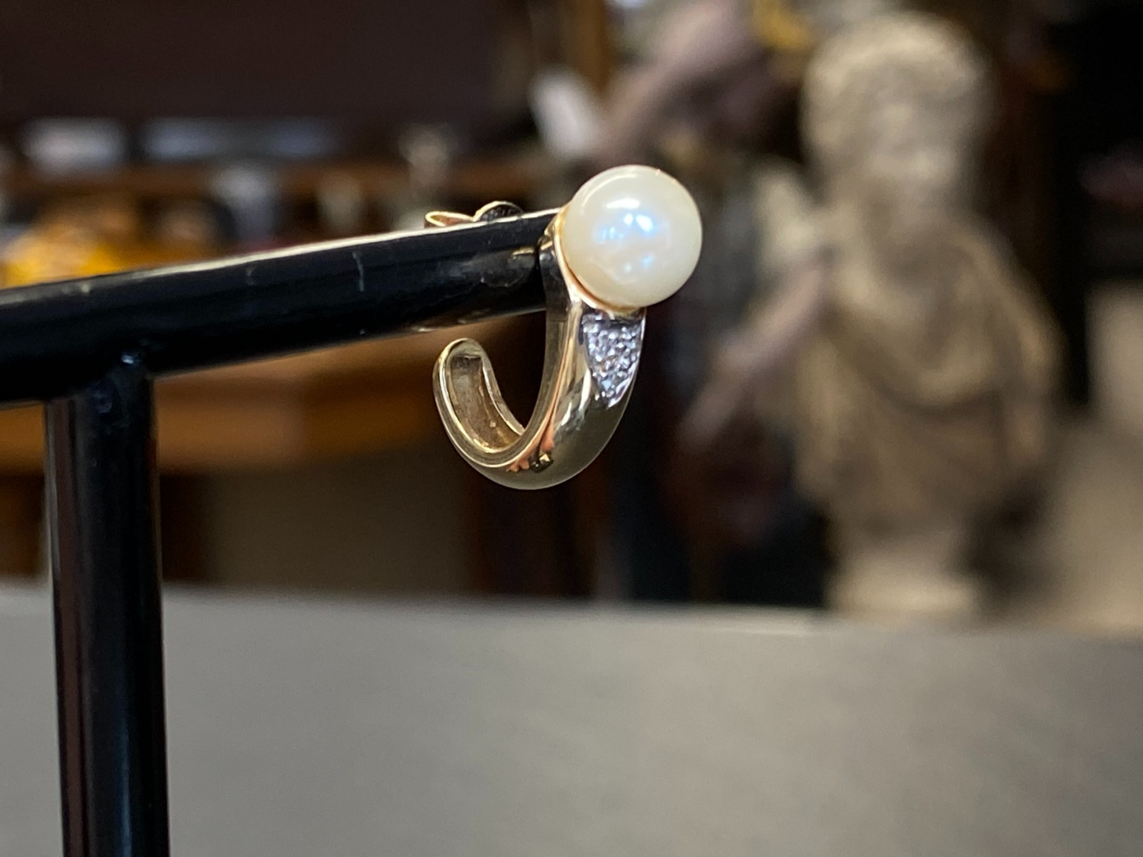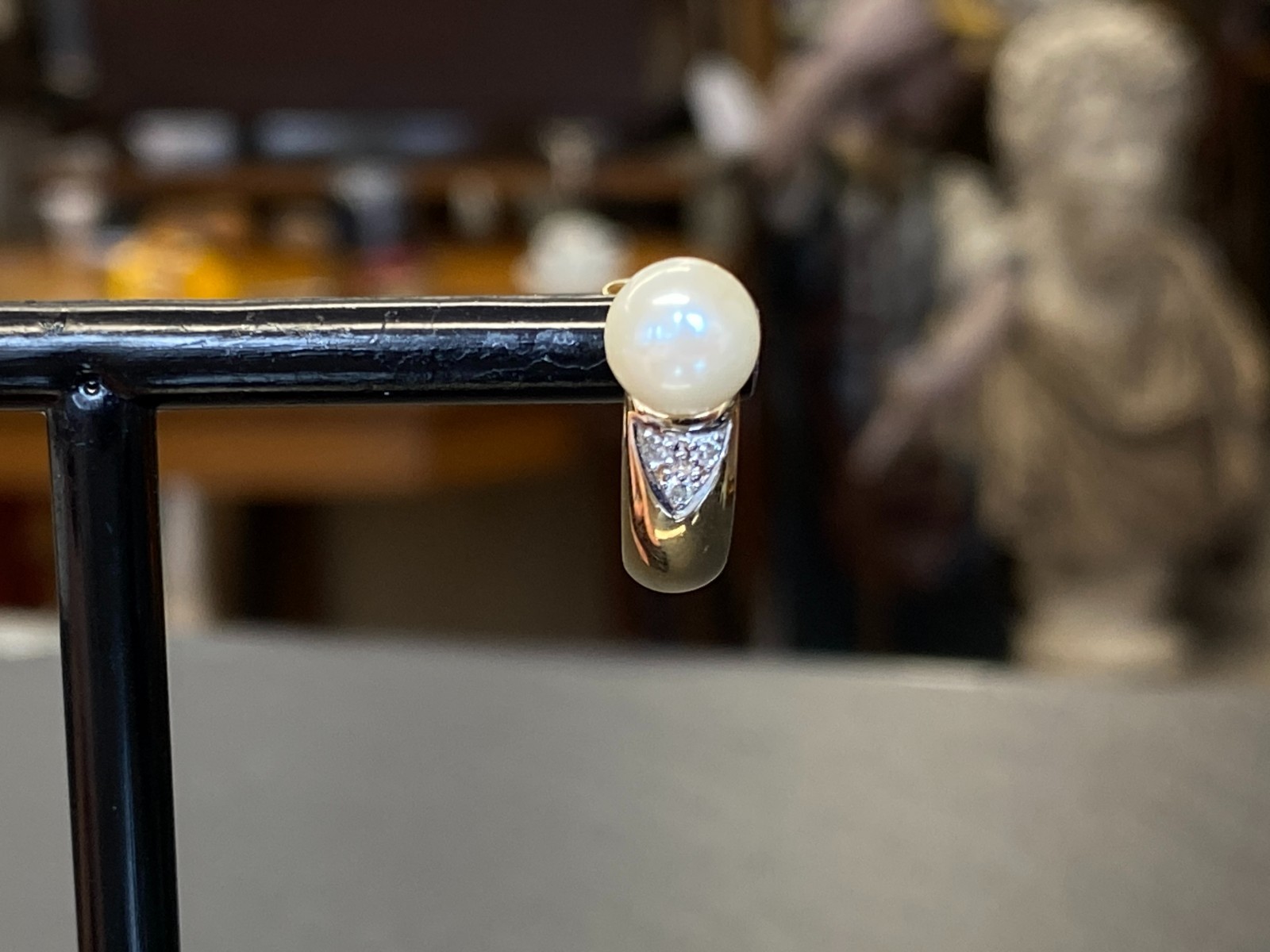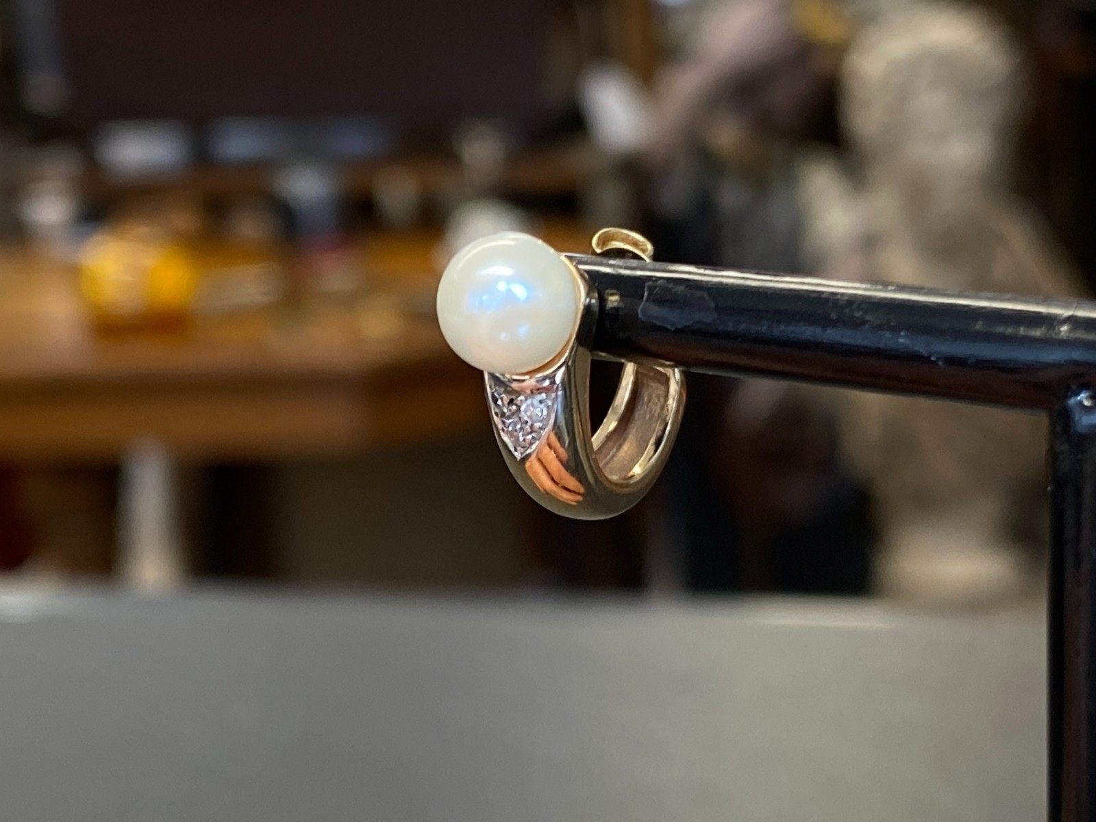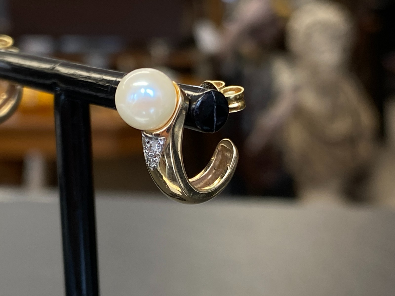 Paar elegante Ohrringe, Gelbgold, punziert mit 585, mit je einer Perle mit einem Durchmesser von ca. 0,68cm. Abgerundet werden die Ohrringe von jeweils 3 kleinen Diamanten unterhalb der Perle, diese haben zus. ca. 0,04ct. in P/I, soweit in den Fassungen messbar. Mit der Lupe sieht man mehrere Abplatzer an den Steinen, mit bloßem Auge merkt man diese nicht. Das Metall der Ohrringe selbst weist minimalsten Abrieb aufleicht angelaufen. BTH der gesamten Ohrringe ca. 0,5/1,5/2cm, Gesamtgewicht ca. 5,73g. Die Begutachtung der Stücke wird vorgenommen von einem Fachmitglied der deutschen gemmologischen Gesellschaft E.V. Ein Schmuckpass wird mitgeliefert.