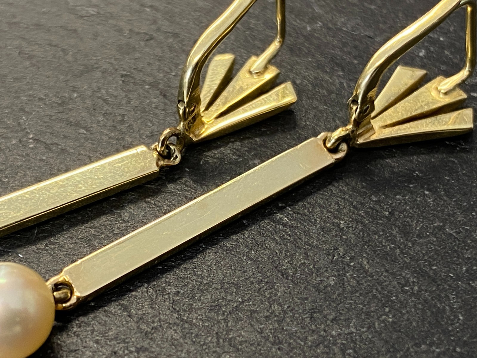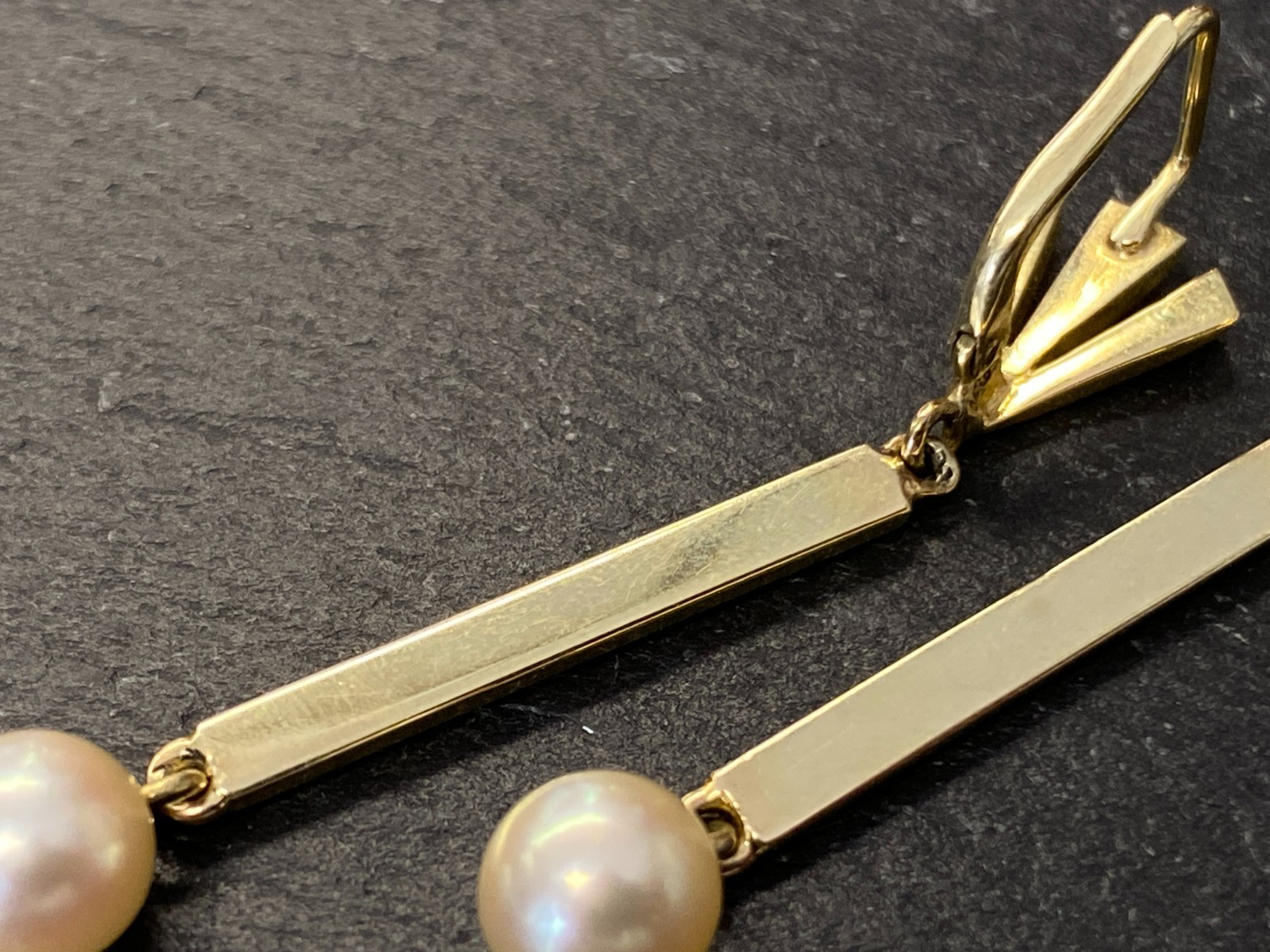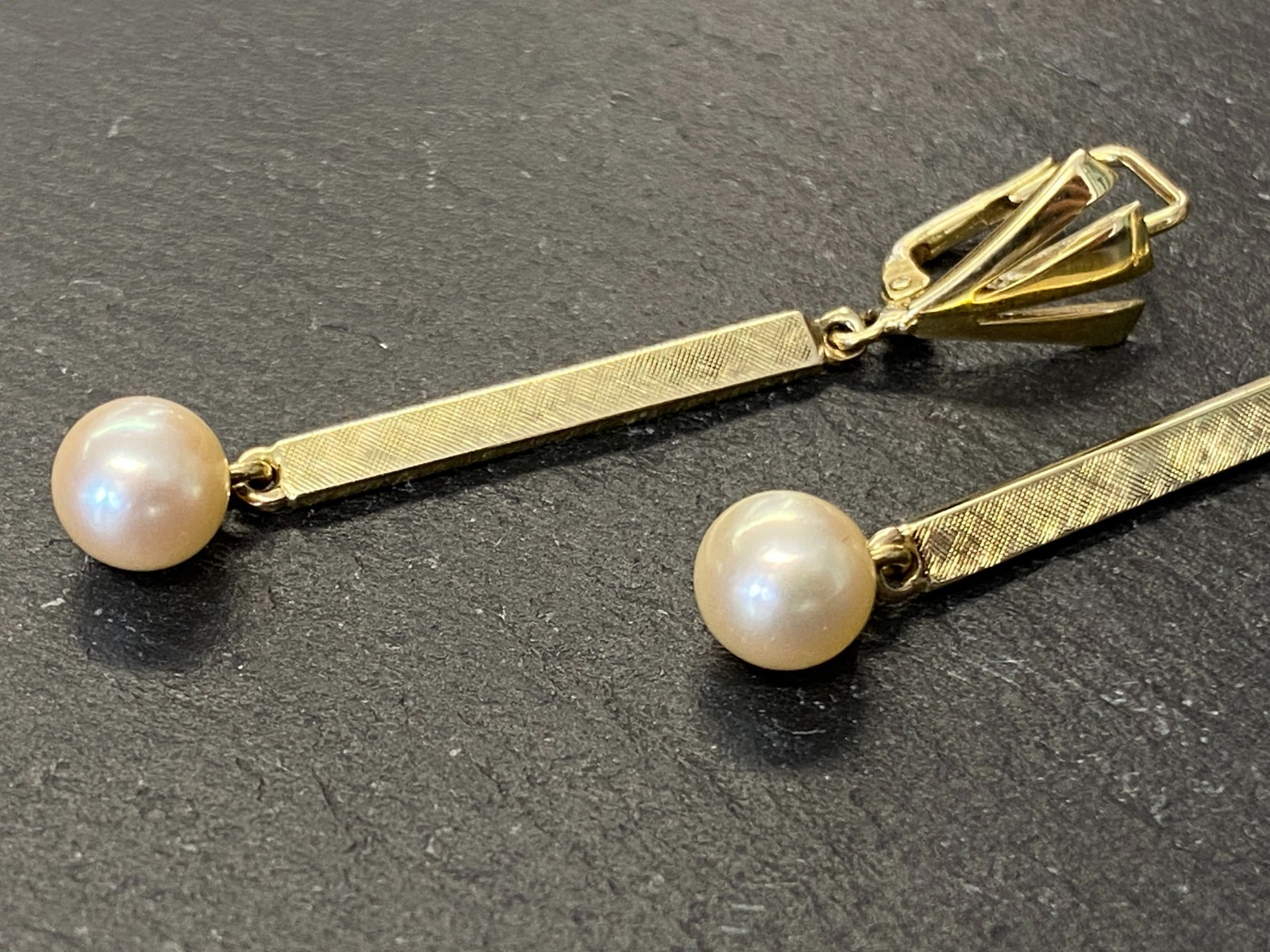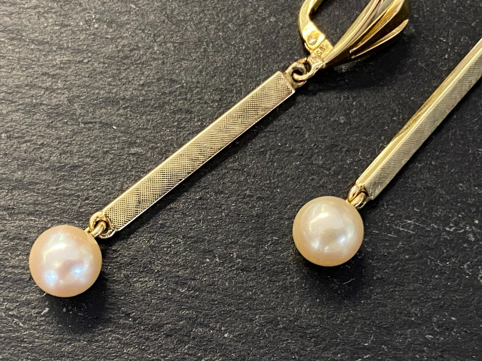 Paar elegante Hängeohrringe mit je einer freihängenden Perle. Punziert mit 585. Die Perlen haben einen Durchmesser von je ca. 0,7cm, oberflächlich sieht man minimale Unebenheiten. Das Metall insgesamt weist ebenfalls minimalen Abrieb auf. Die Verschlüsse sind funktionsfähig, die Höhe der beiden Ohrhänger unterscheidet sich leicht. Diese liegen bei 5,3cm und 5,5cm. Gesamtgewicht ca. 7,39g. Die Begutachtung der Stücke wird vorgenommen von einem Fachmitglied der deutschen gemmologischen Gesellschaft E.V. Ein Schmuckpass wird mitgeliefert.
