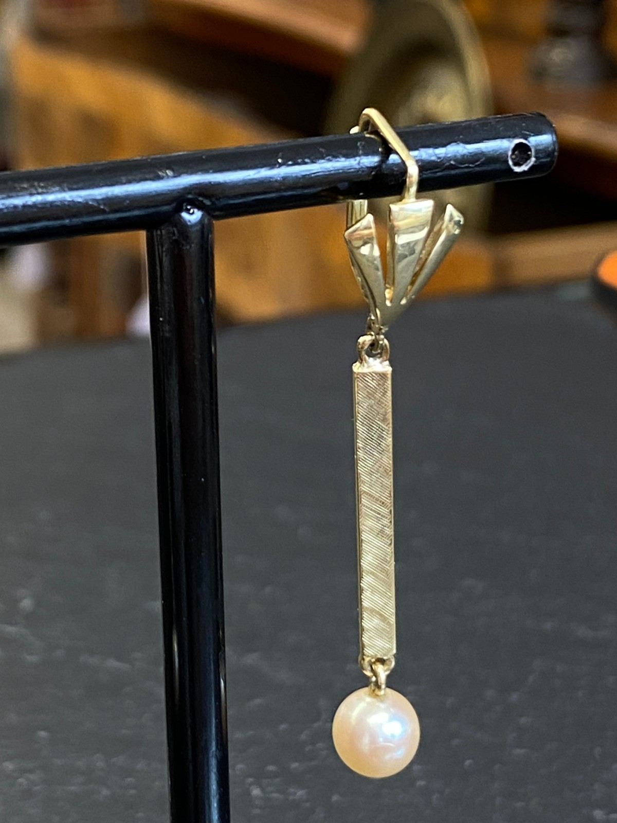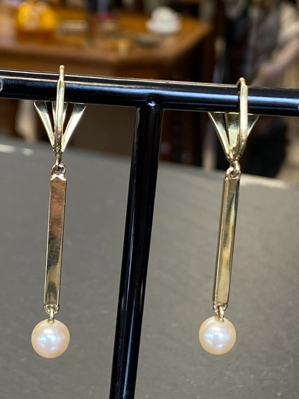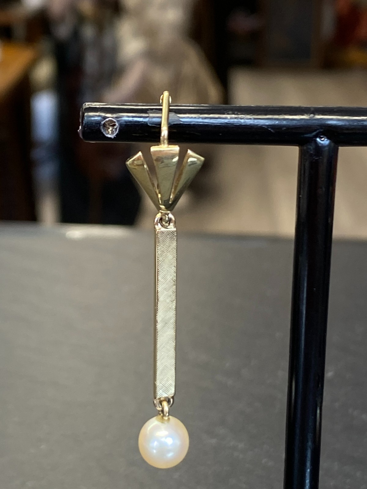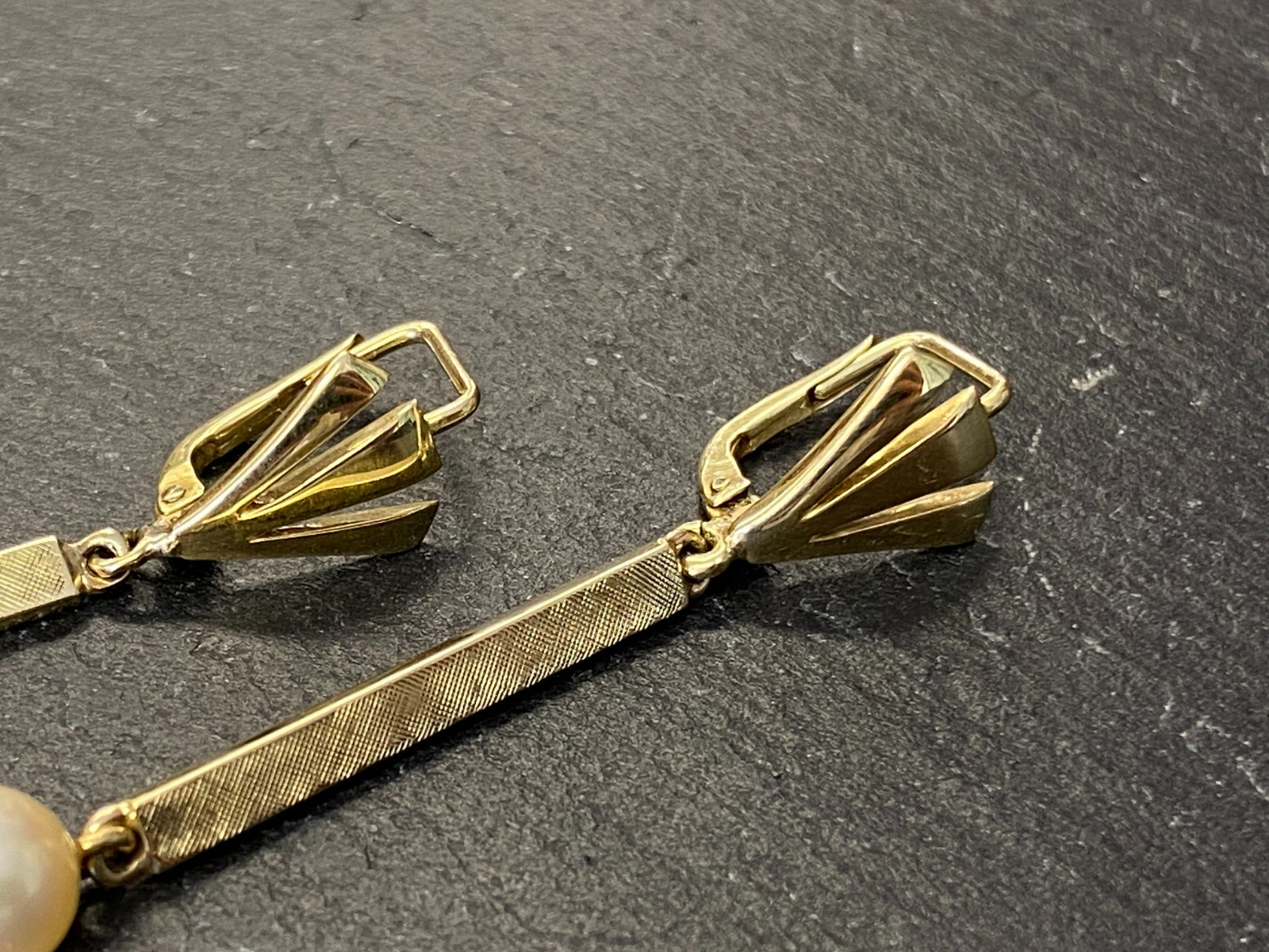 Paar elegante Hängeohrringe mit je einer freihängenden Perle. Punziert mit 585. Die Perlen haben einen Durchmesser von je ca. 0,7cm, oberflächlich sieht man minimale Unebenheiten. Das Metall insgesamt weist ebenfalls minimalen Abrieb auf. Die Verschlüsse sind funktionsfähig, die Höhe der beiden Ohrhänger unterscheidet sich leicht. Diese liegen bei 5,3cm und 5,5cm. Gesamtgewicht ca. 7,39g. Die Begutachtung der Stücke wird vorgenommen von einem Fachmitglied der deutschen gemmologischen Gesellschaft E.V. Ein Schmuckpass wird mitgeliefert.