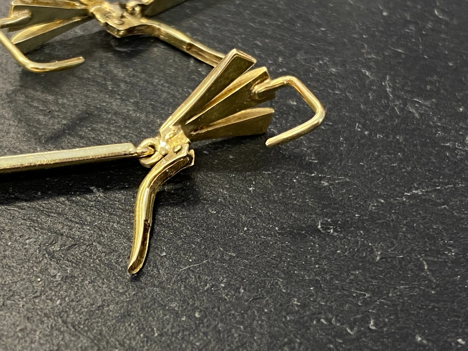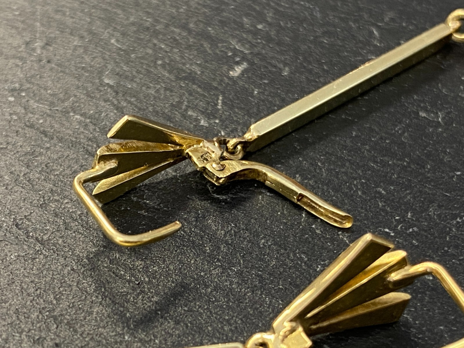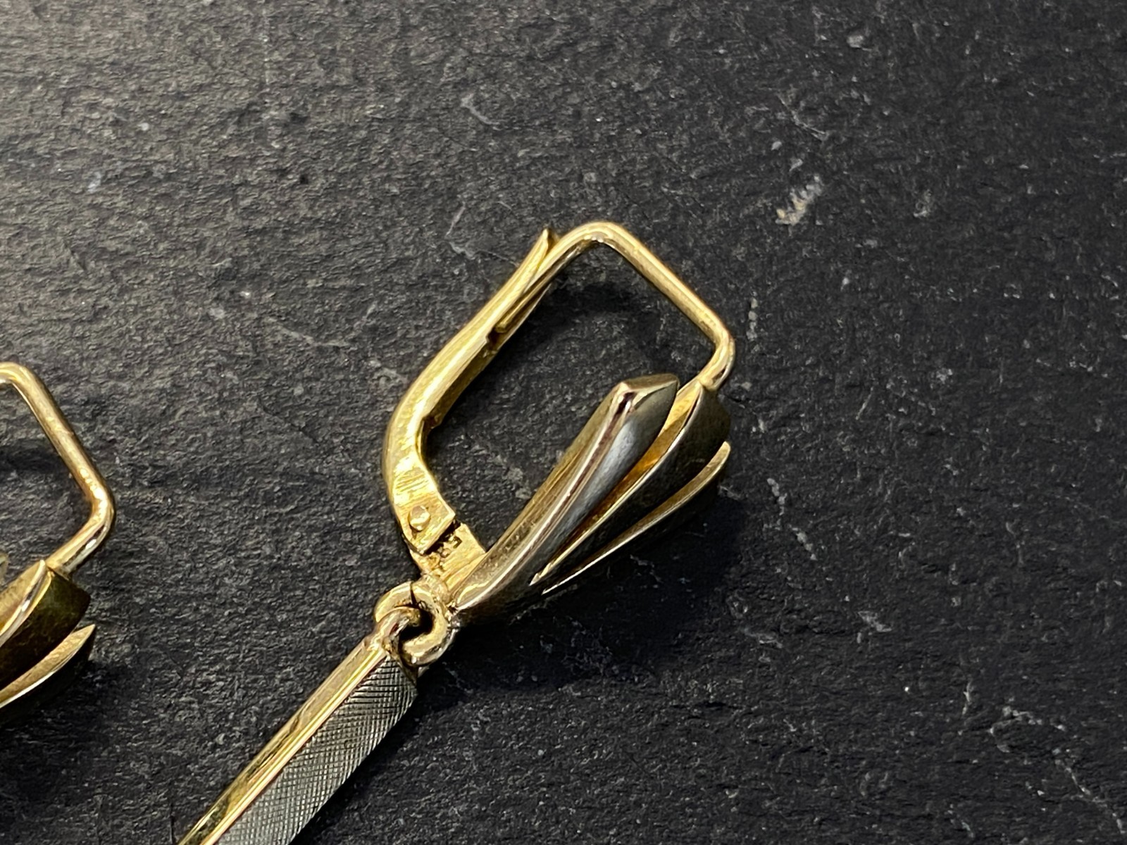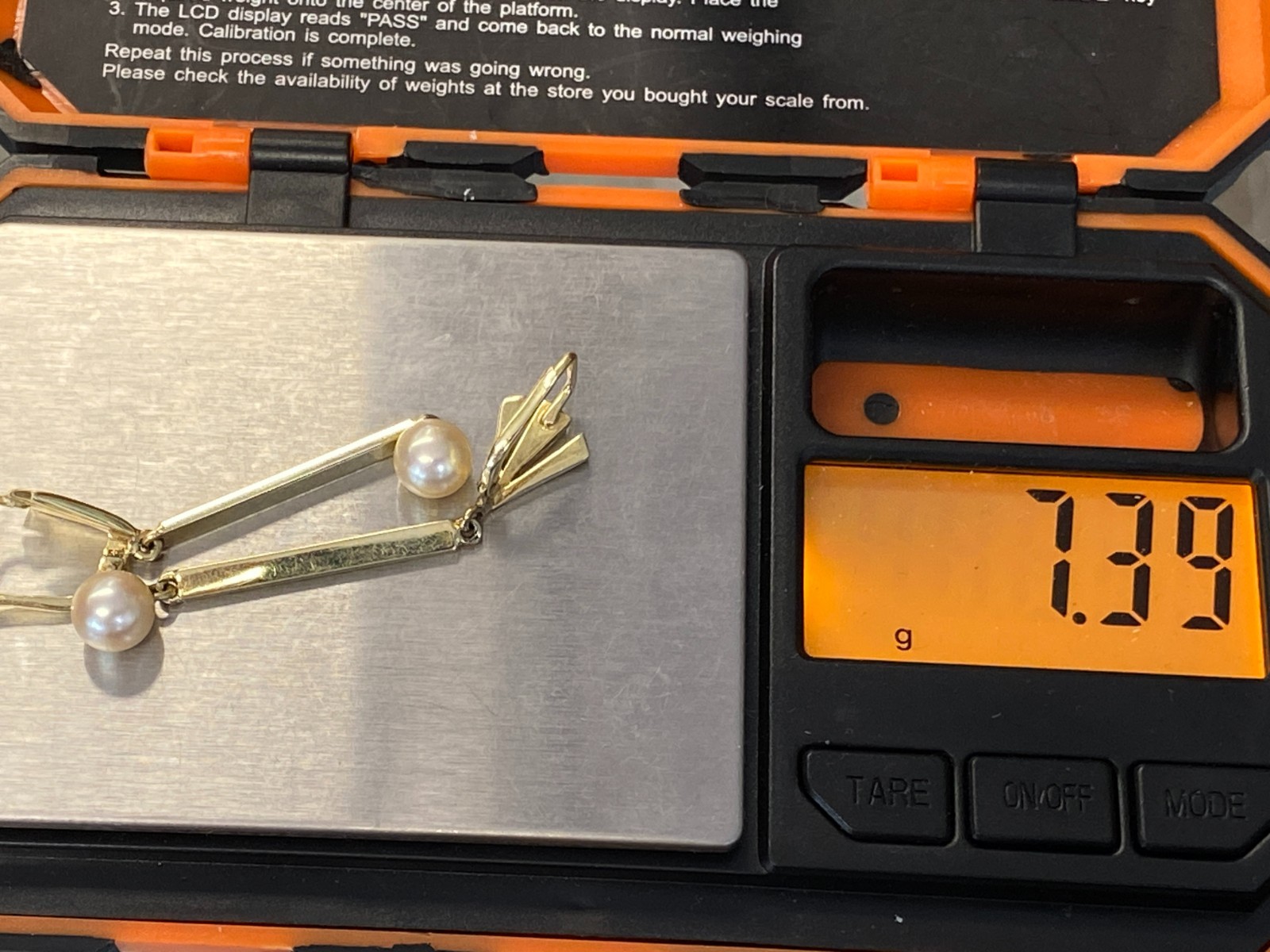 Paar elegante Hängeohrringe mit je einer freihängenden Perle. Punziert mit 585. Die Perlen haben einen Durchmesser von je ca. 0,7cm, oberflächlich sieht man minimale Unebenheiten. Das Metall insgesamt weist ebenfalls minimalen Abrieb auf. Die Verschlüsse sind funktionsfähig, die Höhe der beiden Ohrhänger unterscheidet sich leicht. Diese liegen bei 5,3cm und 5,5cm. Gesamtgewicht ca. 7,39g. Die Begutachtung der Stücke wird vorgenommen von einem Fachmitglied der deutschen gemmologischen Gesellschaft E.V. Ein Schmuckpass wird mitgeliefert.