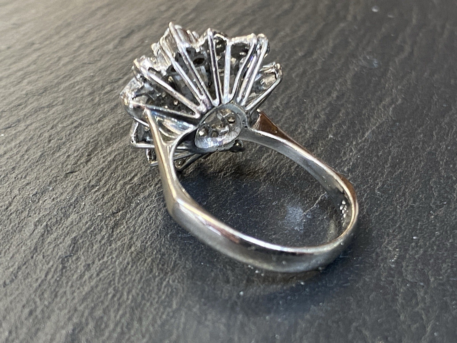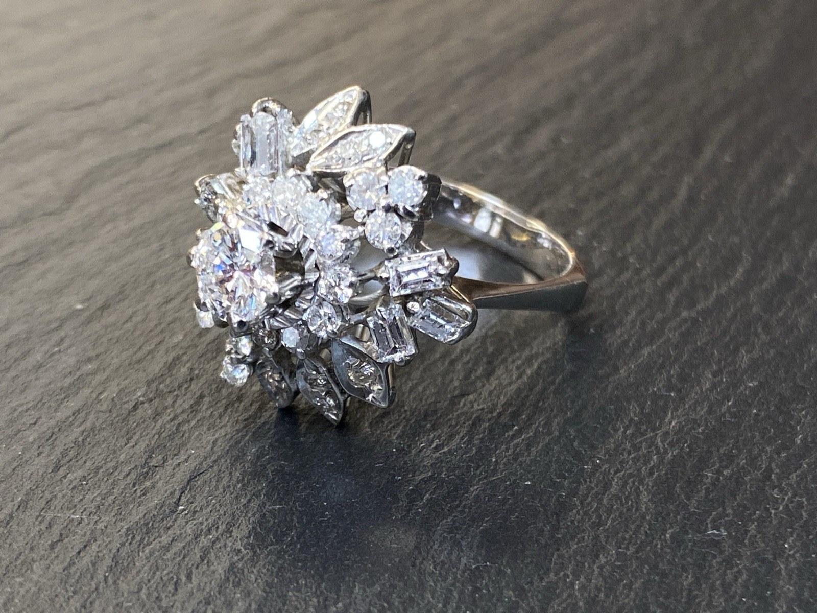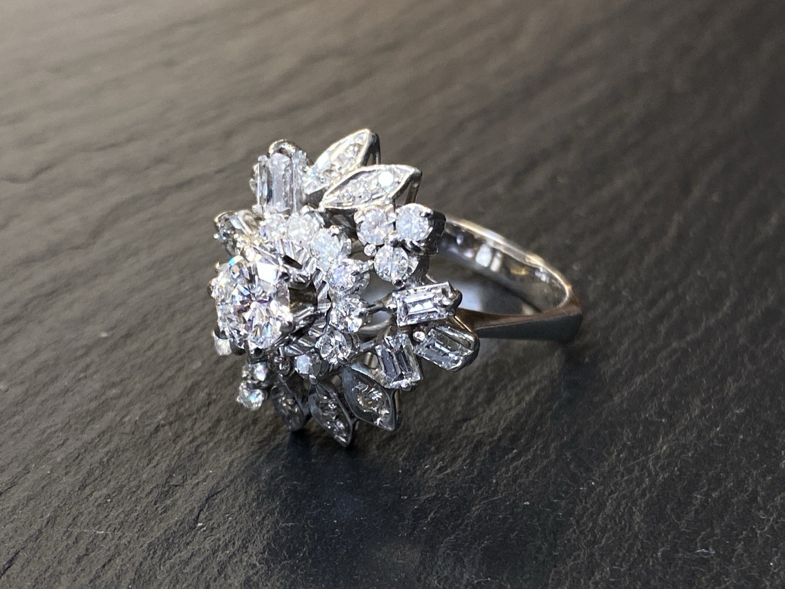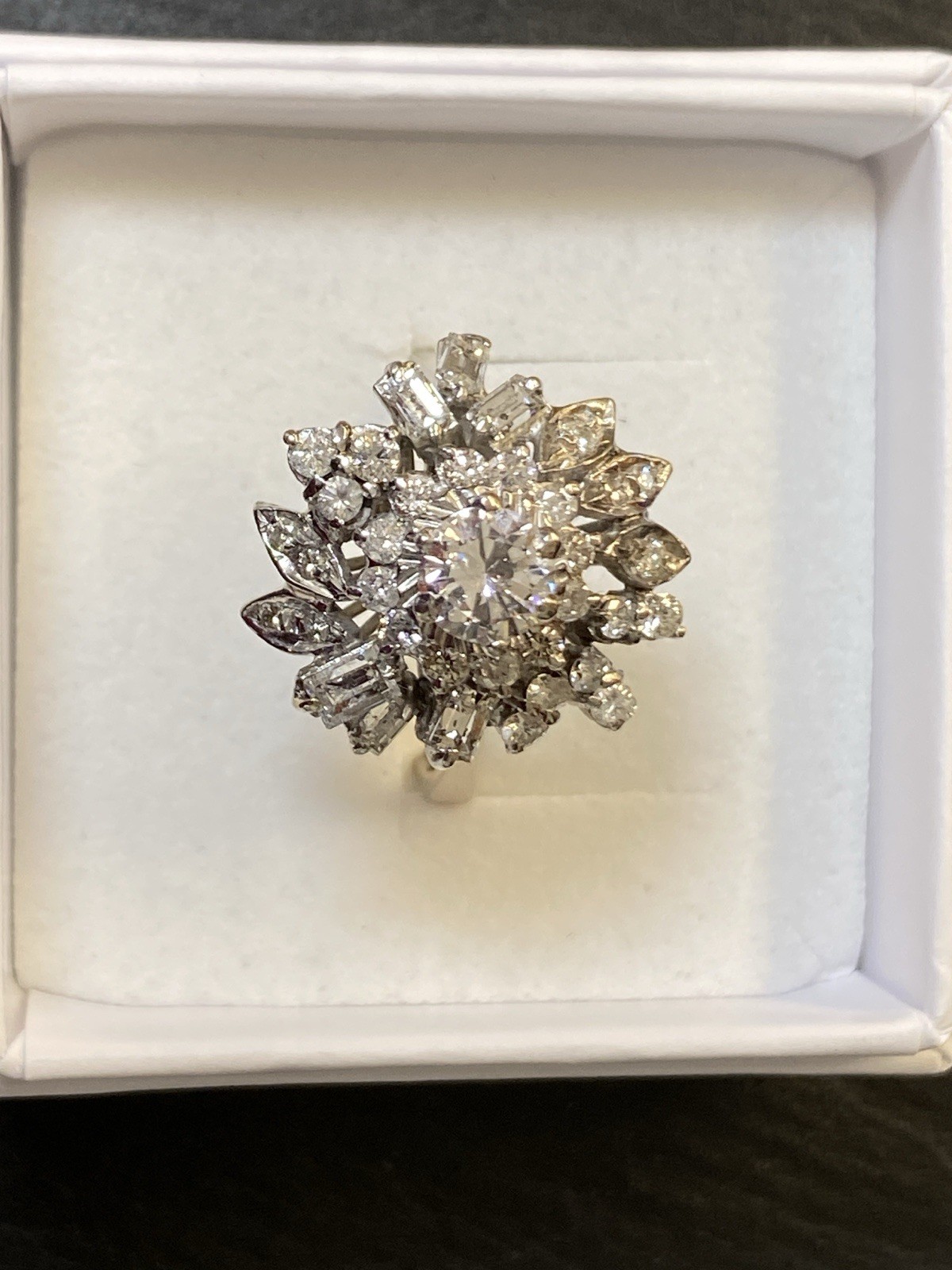 Ein prächtiger Entourage Ring, der mit Diamanten von zus. ca. 2,06 ct. An Reinheit ist von P – VVS 1 alles dabei, der zentrale Stein und die grösseren Steine sind alle P1-P3, Farbe G. Gesamtgewicht ca. 7,72g, Weissgold 18K, HxBxT Kopf ca. 2,0×1,9×1,5 cm. Seitlich ein Stein bestossen und etwas locker in der Fassung, mit blossem Auge nicht erkennbar. Der Aufbau ist gewollt nicht zentral zur Schiene aufgebaut, somit kann der Ring „seitlich“ am Finger getragen werden und der Kranz ragt nur über zwei Finger, nicht über drei, wie wenn er zentral wäre. Alle Angaben soweit Sie in der Fassung messbar sind. Die Begutachtung der Stücke wird vorgenommen von einem Fachmitglied der deutschen gemmologischen Gesellschaft E.V. Ein Schmuckpass wird mitgeliefert.