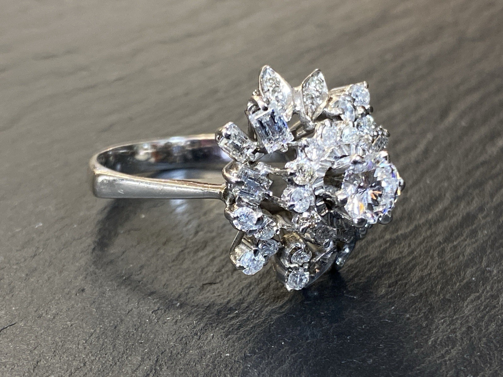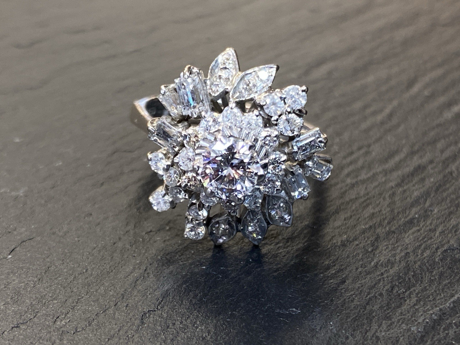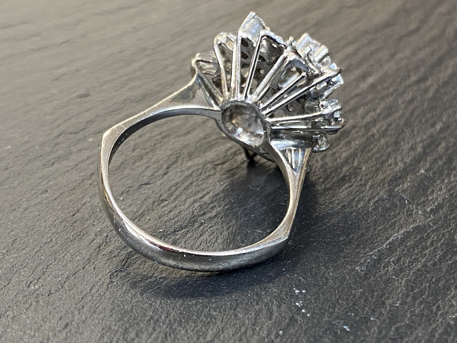 Ein prächtiger Entourage Ring, der mit Diamanten von zus. ca. 2,06 ct. An Reinheit ist von P – VVS 1 alles dabei, der zentrale Stein und die grösseren Steine sind alle P1-P3, Farbe G. Gesamtgewicht ca. 7,72g, Weissgold 18K, HxBxT Kopf ca. 2,0×1,9×1,5 cm. Seitlich ein Stein bestossen und etwas locker in der Fassung, mit blossem Auge nicht erkennbar. Der Aufbau ist gewollt nicht zentral zur Schiene aufgebaut, somit kann der Ring „seitlich“ am Finger getragen werden und der Kranz ragt nur über zwei Finger, nicht über drei, wie wenn er zentral wäre. Alle Angaben soweit Sie in der Fassung messbar sind. Die Begutachtung der Stücke wird vorgenommen von einem Fachmitglied der deutschen gemmologischen Gesellschaft E.V. Ein Schmuckpass wird mitgeliefert.