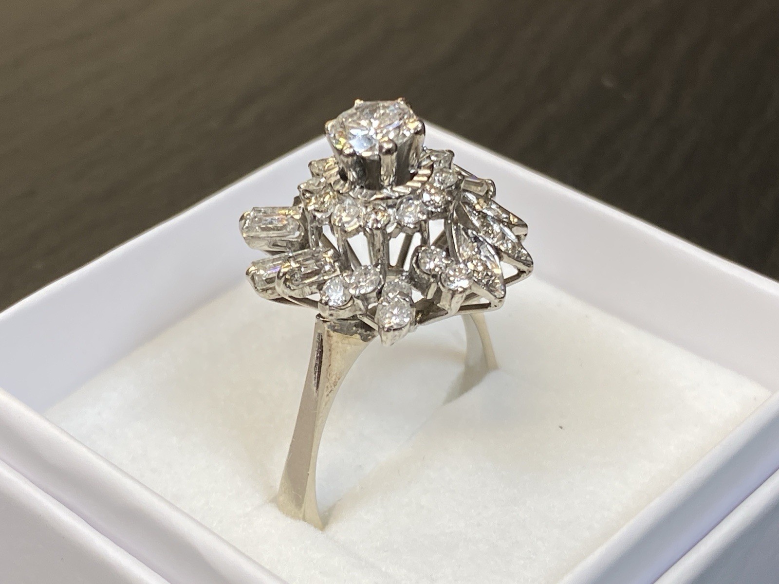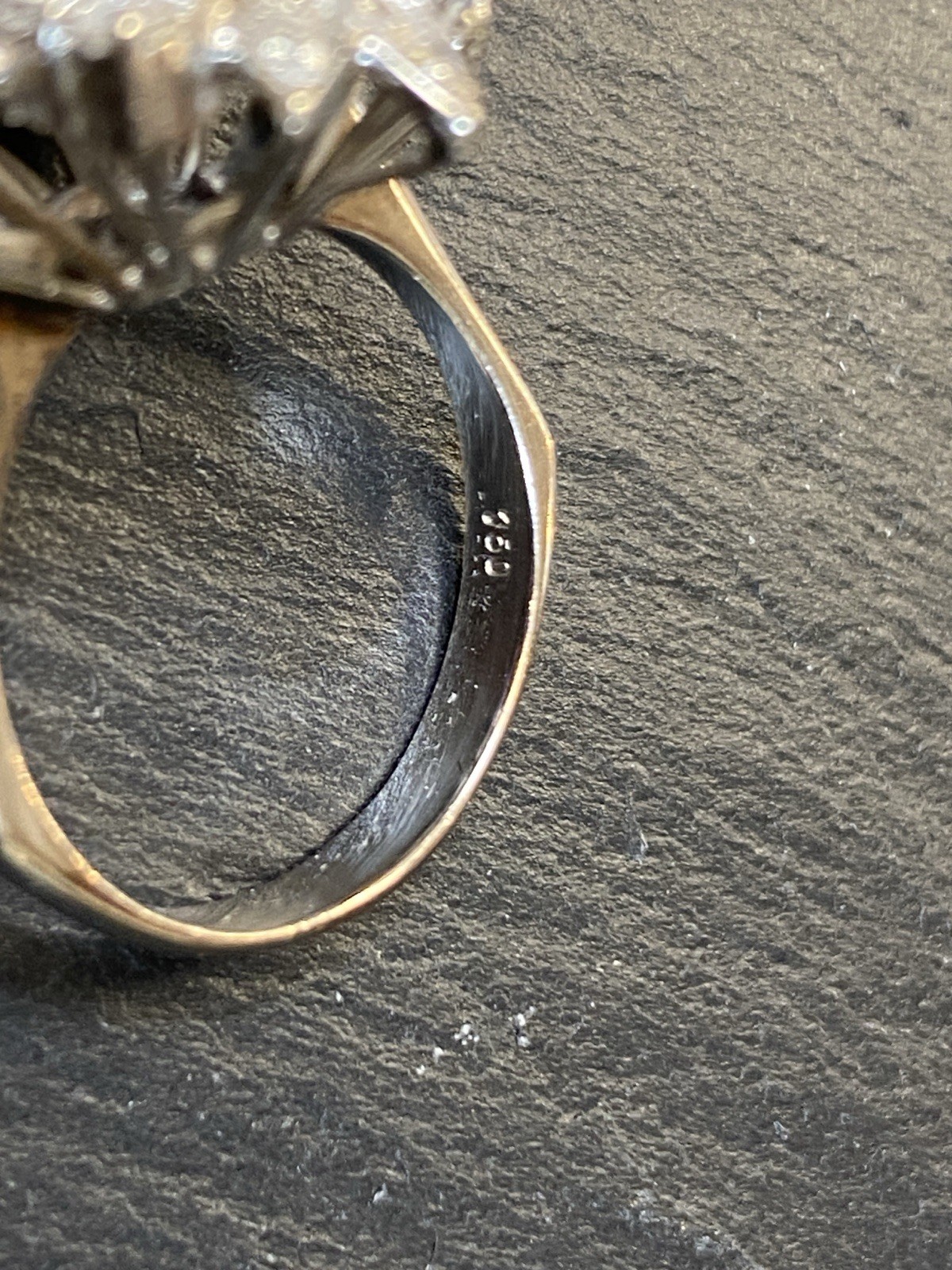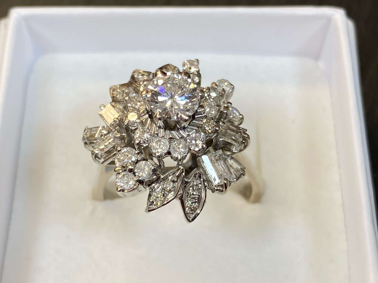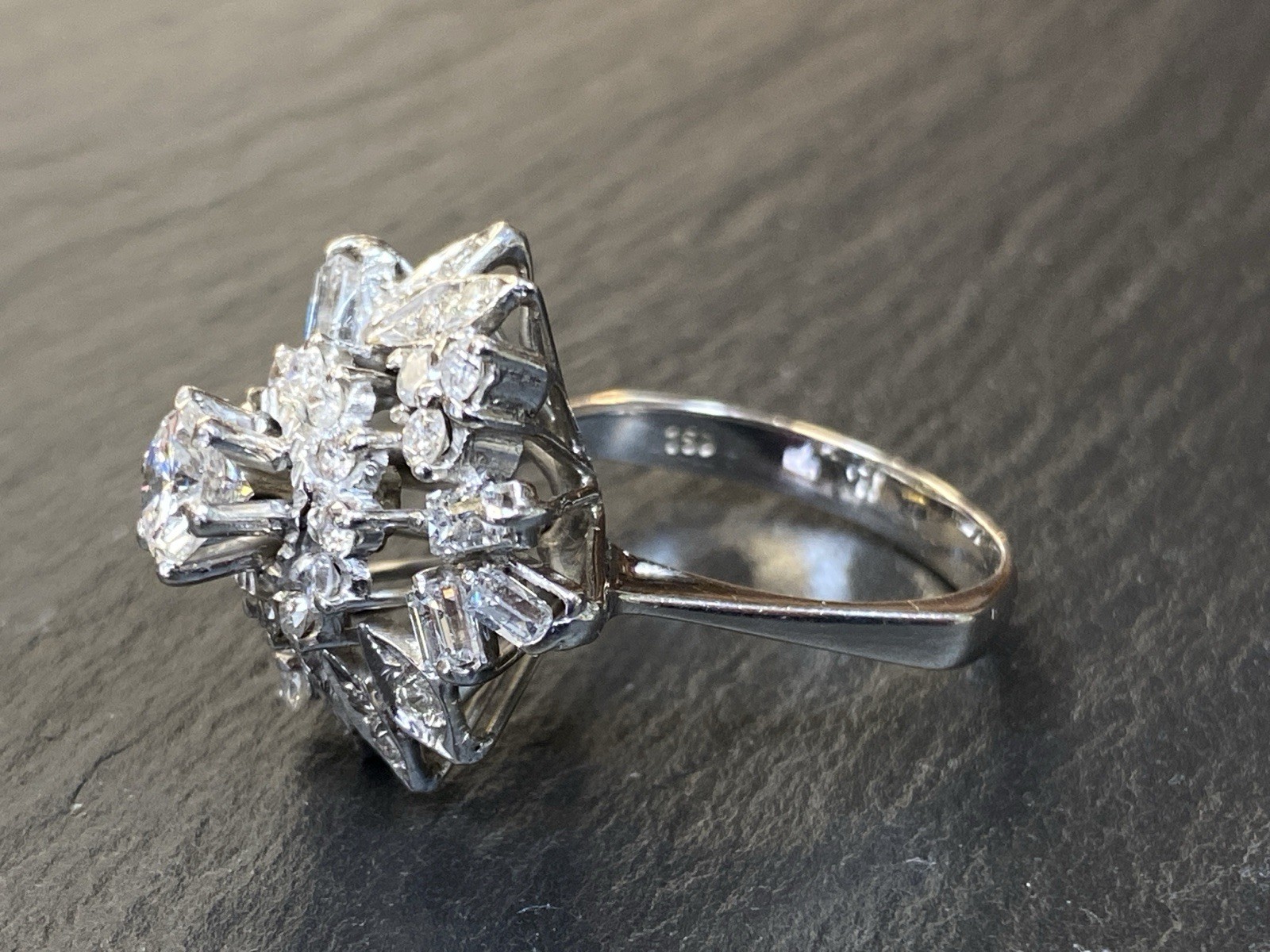 Ein prächtiger Entourage Ring, der mit Diamanten von zus. ca. 2,06 ct. An Reinheit ist von P – VVS 1 alles dabei, der zentrale Stein und die grösseren Steine sind alle P1-P3, Farbe G. Gesamtgewicht ca. 7,72g, Weissgold 18K, HxBxT Kopf ca. 2,0×1,9×1,5 cm. Seitlich ein Stein bestossen und etwas locker in der Fassung, mit blossem Auge nicht erkennbar. Der Aufbau ist gewollt nicht zentral zur Schiene aufgebaut, somit kann der Ring „seitlich“ am Finger getragen werden und der Kranz ragt nur über zwei Finger, nicht über drei, wie wenn er zentral wäre. Alle Angaben soweit Sie in der Fassung messbar sind. Die Begutachtung der Stücke wird vorgenommen von einem Fachmitglied der deutschen gemmologischen Gesellschaft E.V. Ein Schmuckpass wird mitgeliefert.