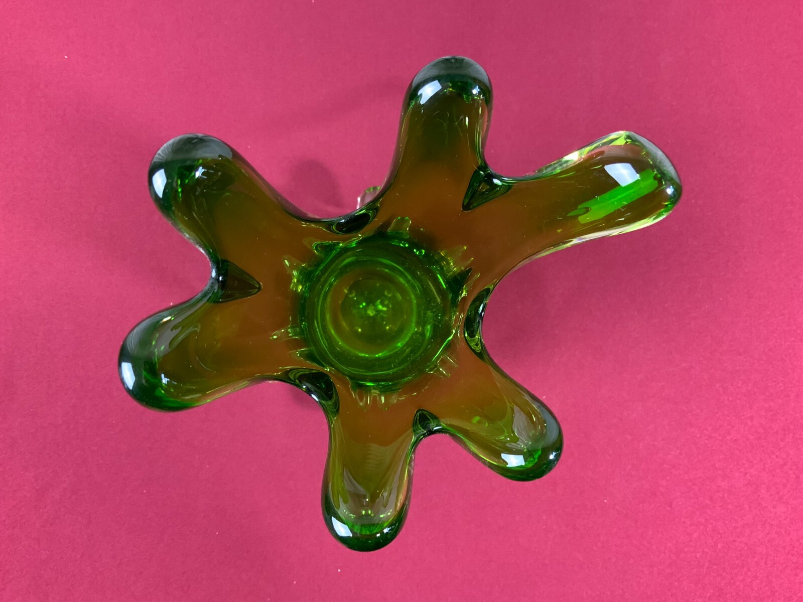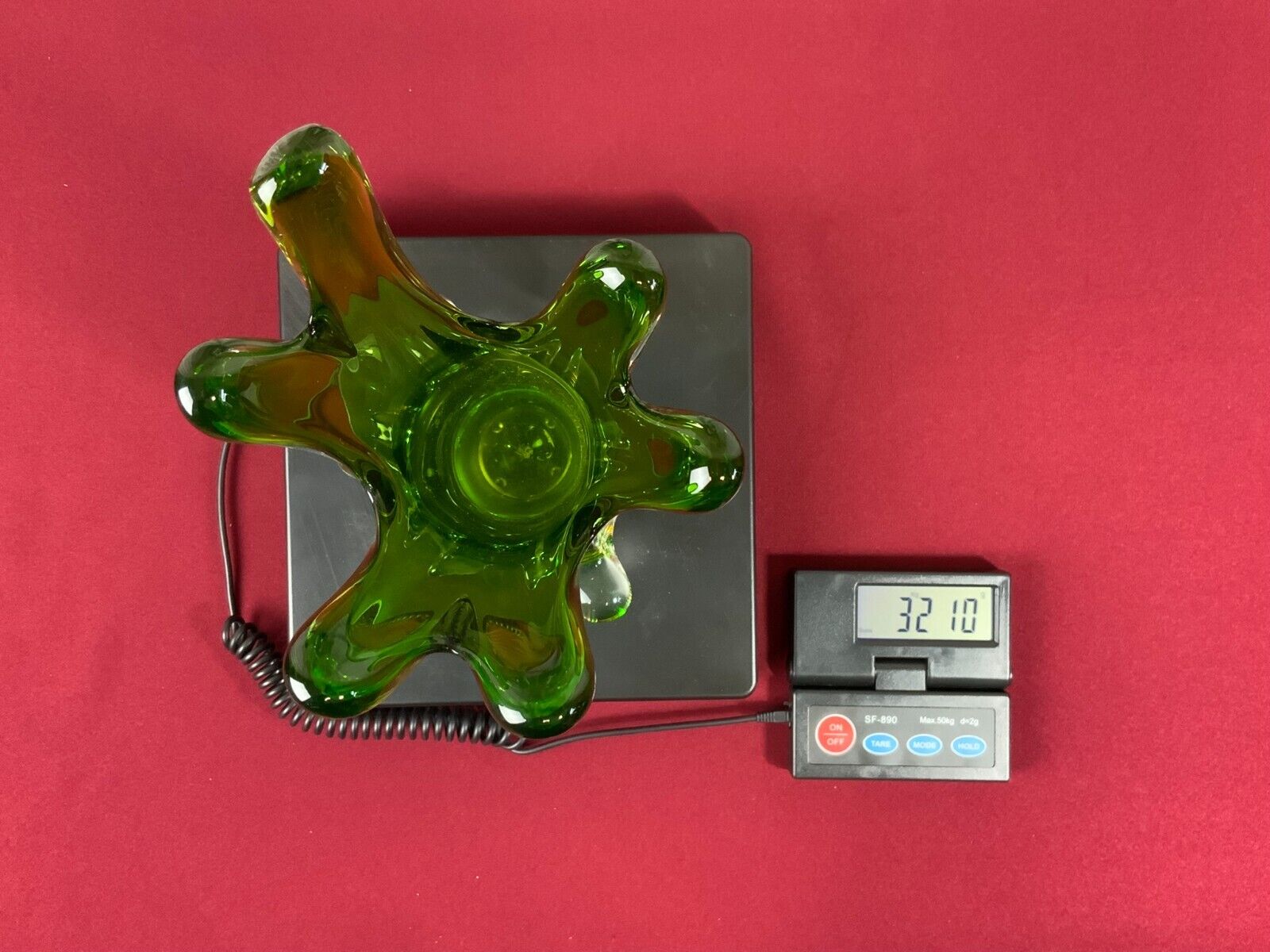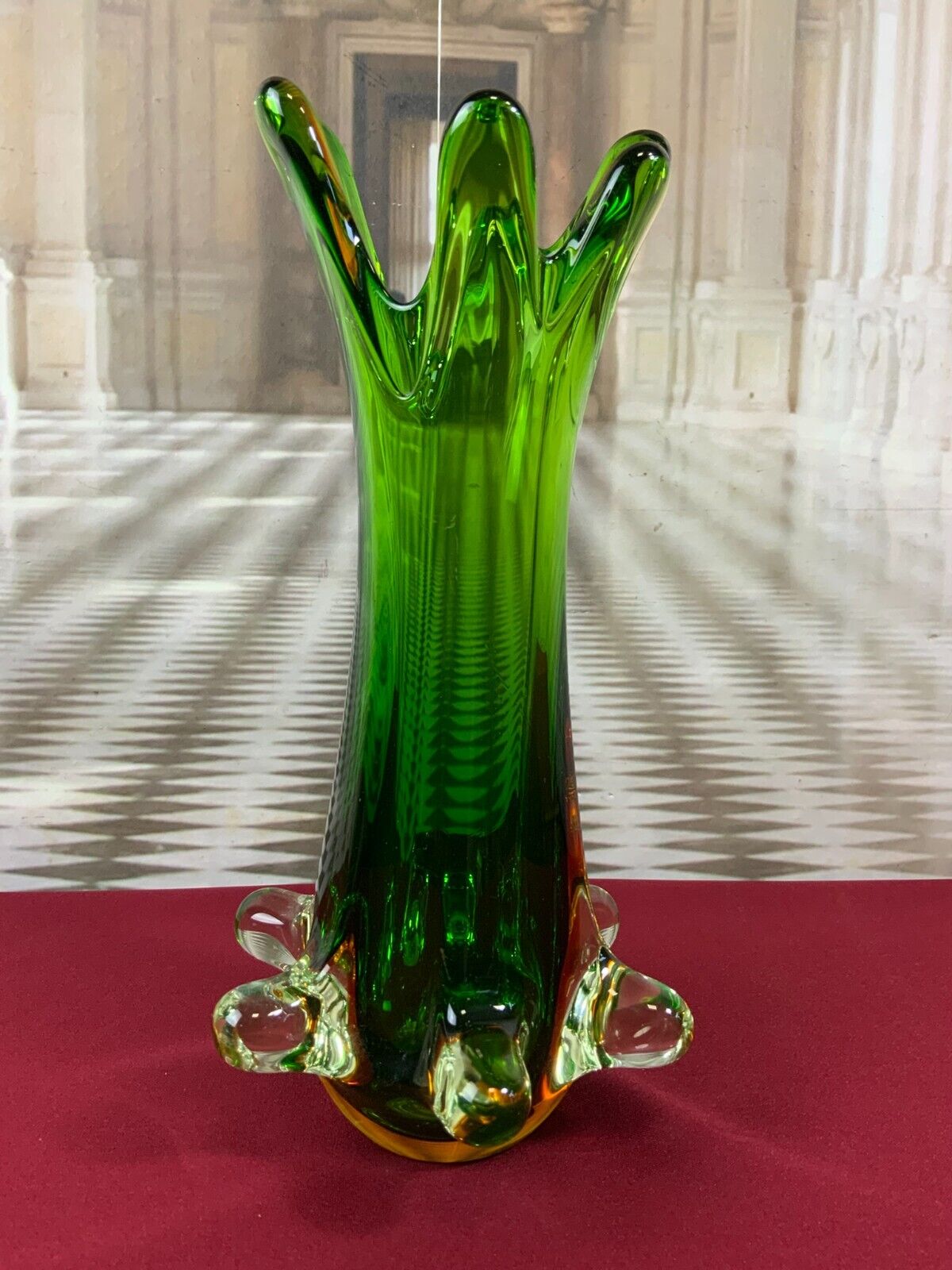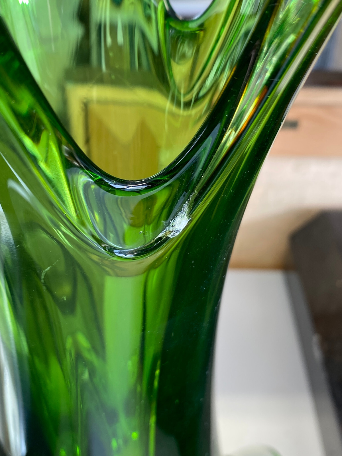 Wundervolle Prunkvase aus Glas, mundgeblasen. Am Bodenring und der Öffnung je ein winziger Chip. Die Vase wurde nie als solche benutzt. An der Außenwand sind noch einige Fäden zu sehen und minimaler Abrieb. Höhe/Durchmesser 36/17cm.