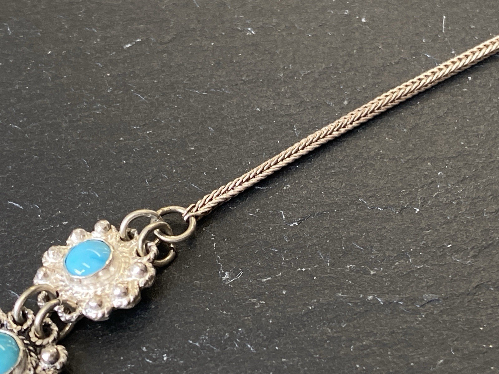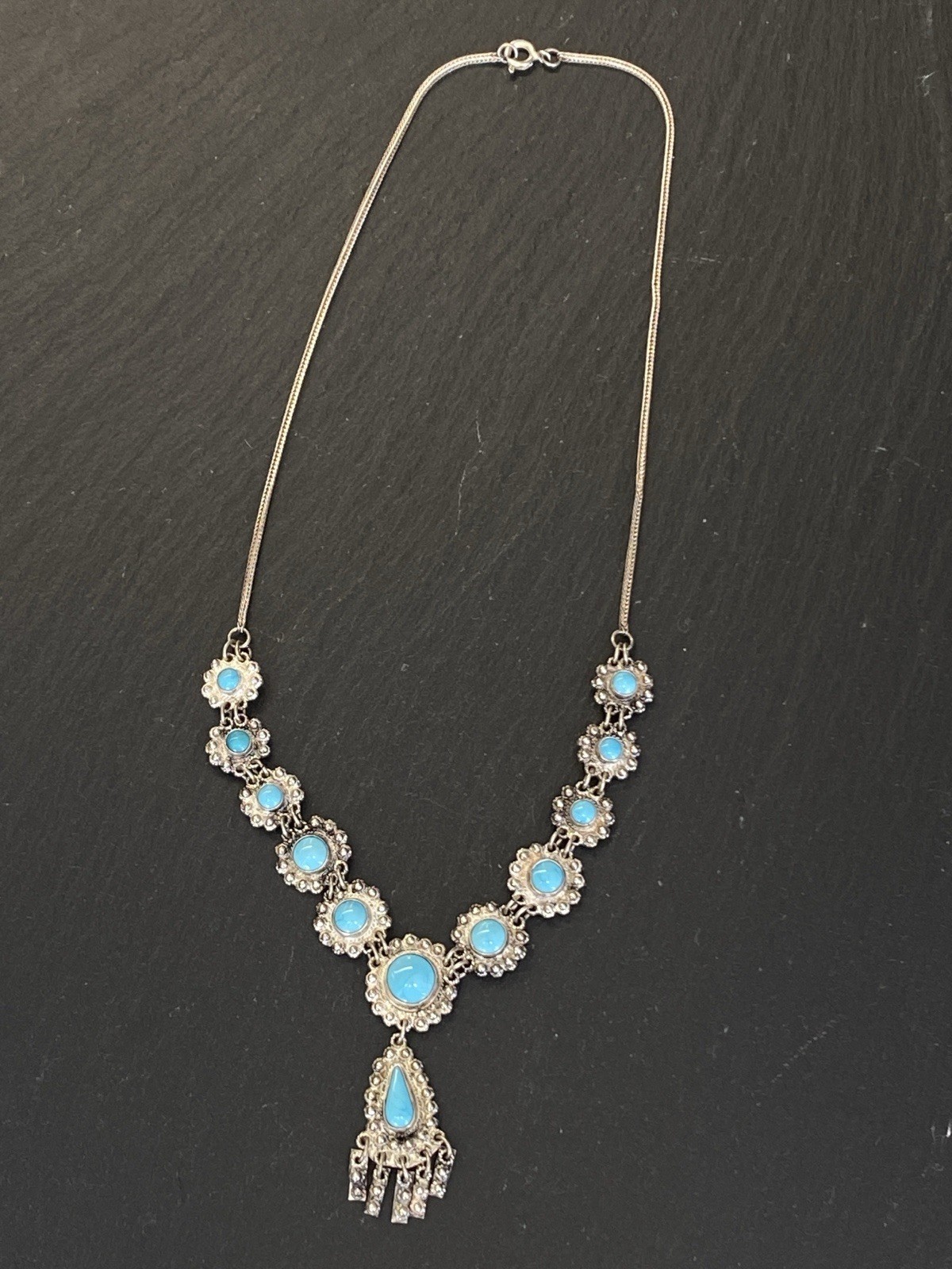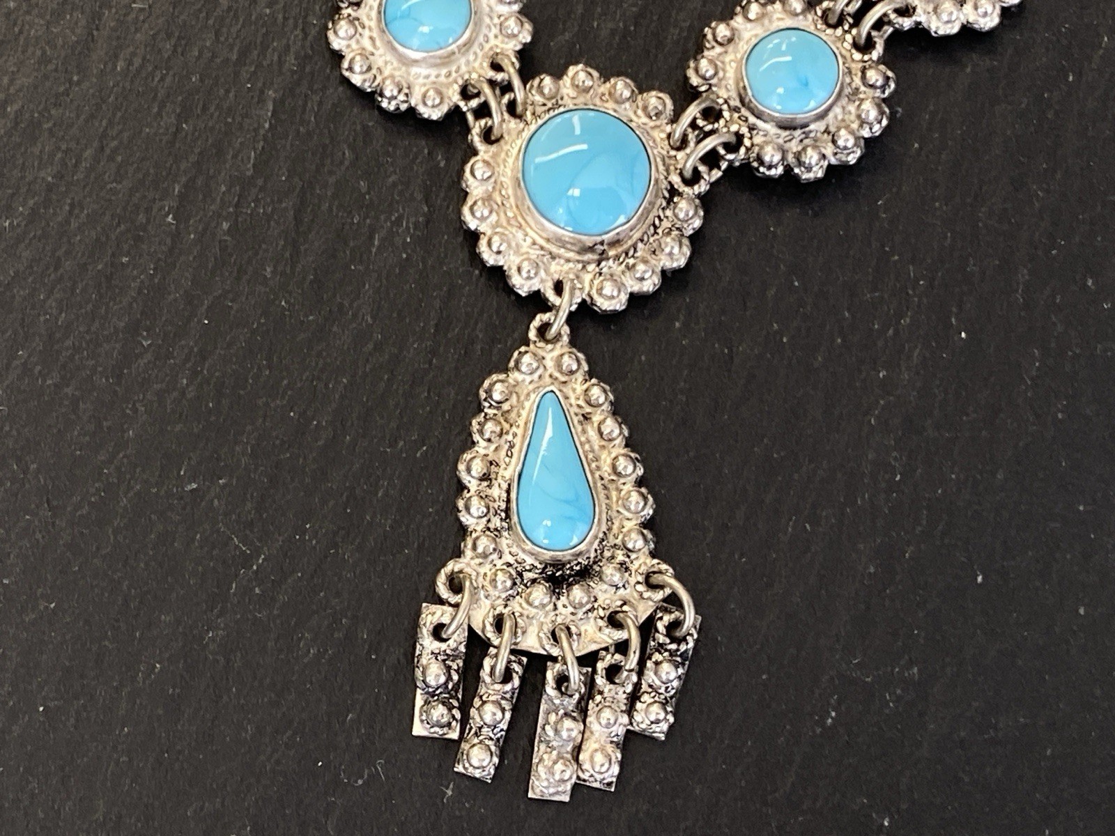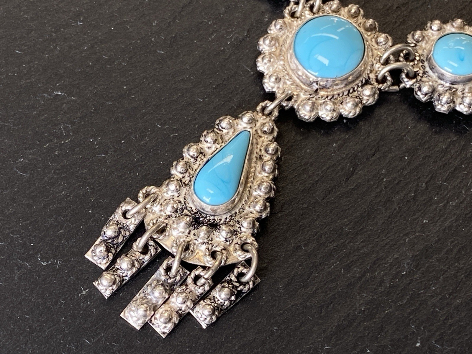 Aufwendige Kette aus 950 Sterling Silber mit mehreren Cabochons aus Türkis von zus. ca. 11,7 ct., soweit in den Fassungen messbar. Die Kette ist aufwendig verziert und mit Hängeelementen ergänzt. Die Kette ist stellenweise leicht verbogen, Breite 0,15cm. B/H des Mittelstücks 16/5,3cm. Länge der Kette 47,5cm, Gesamtgewicht ca. 28,40g.