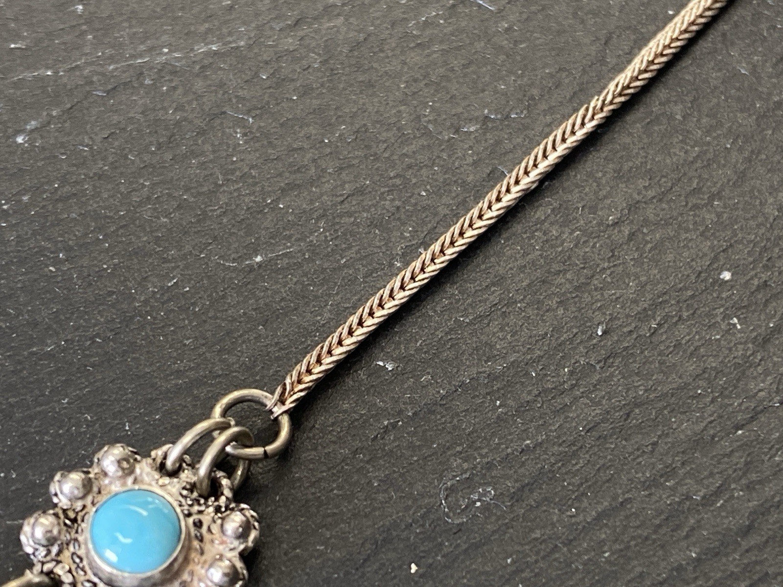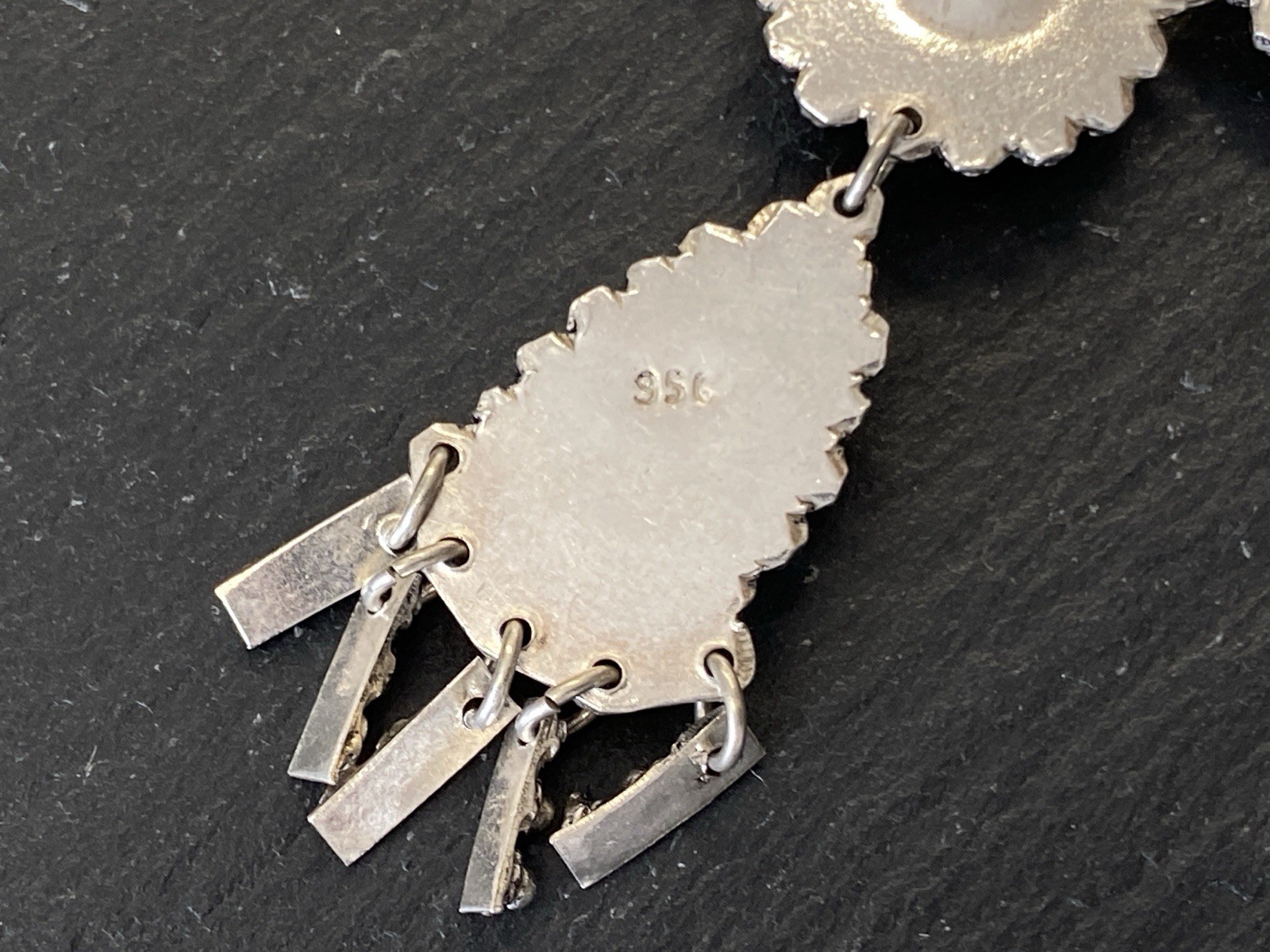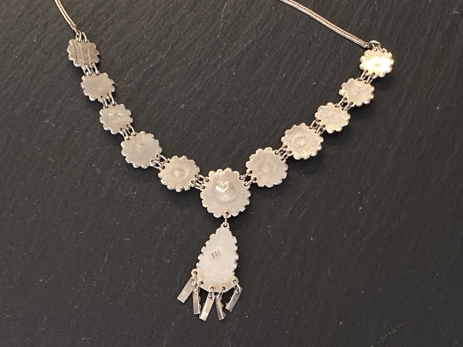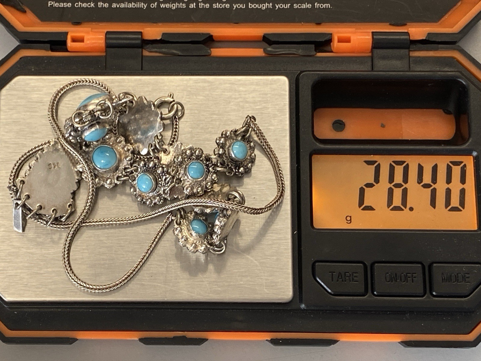 Aufwendige Kette aus 950 Sterling Silber mit mehreren Cabochons aus Türkis von zus. ca. 11,7 ct., soweit in den Fassungen messbar. Die Kette ist aufwendig verziert und mit Hängeelementen ergänzt. Die Kette ist stellenweise leicht verbogen, Breite 0,15cm. B/H des Mittelstücks 16/5,3cm. Länge der Kette 47,5cm, Gesamtgewicht ca. 28,40g.