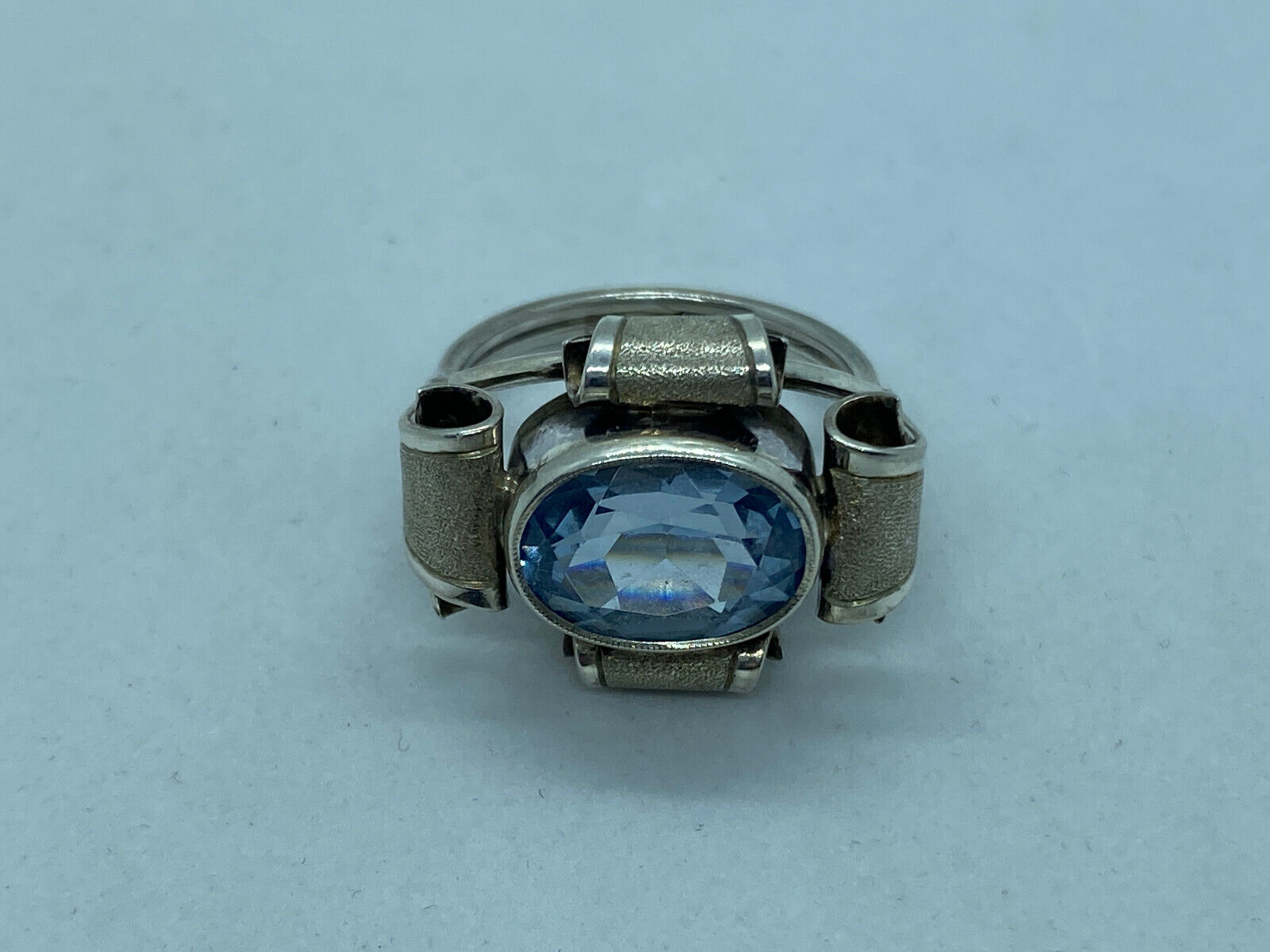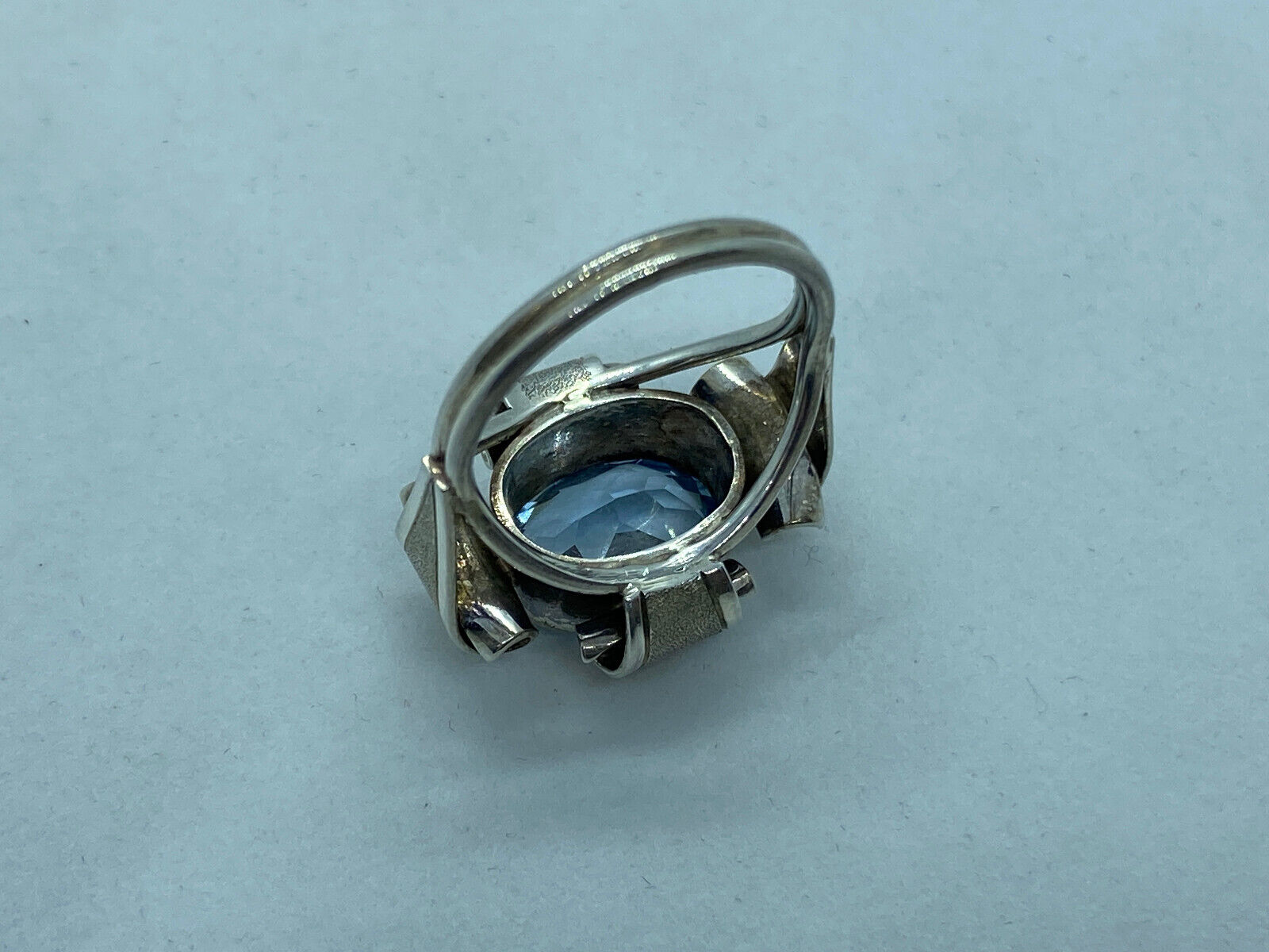 Prunkvoller Ring aus 835 Silber mit einem Aquamarin von ca. 1,9 ct., soweit in der Fassung messbar und Silberdekor. BTH des Mittelstücks 2,2/1,6/0,8cm, Breite der Ringschiene oben 0,9cm, unten 0,2cm. Ringgröße 55, Gewicht ca. 6,8g. Die Teile wurden im Ultraschallbad gereinigt und teils mit Silberpaste poliert, Überreste möglich. Den genauen Zustand entnehmen Sie bitte den Bildern. Die Lieferung erfolgt mit personalisierter Rechnung, ohne Zertifikat.