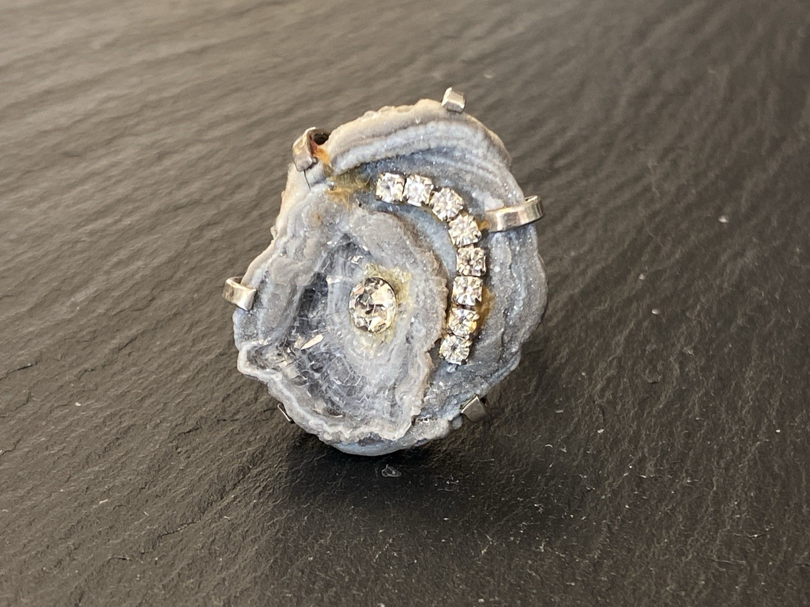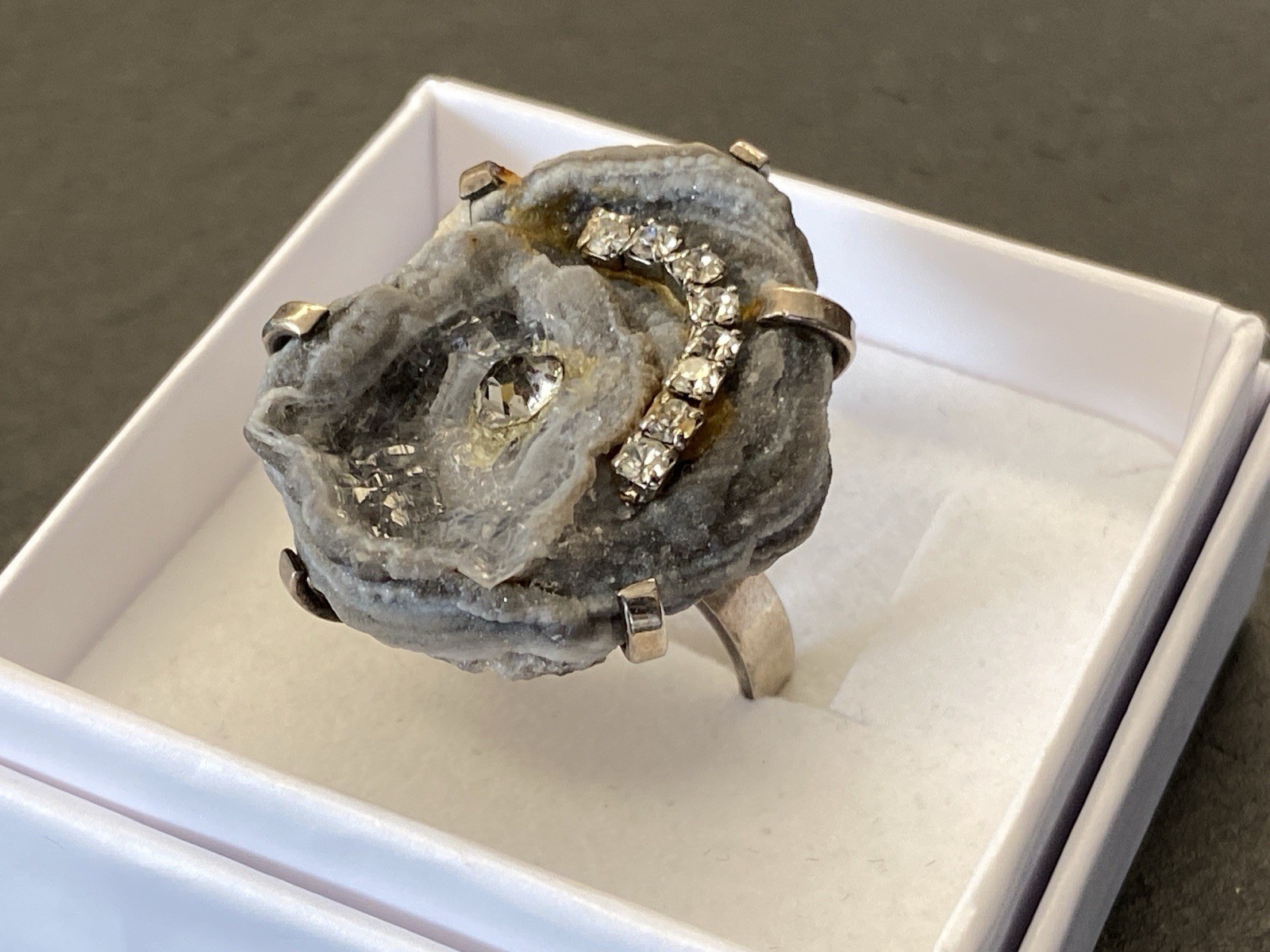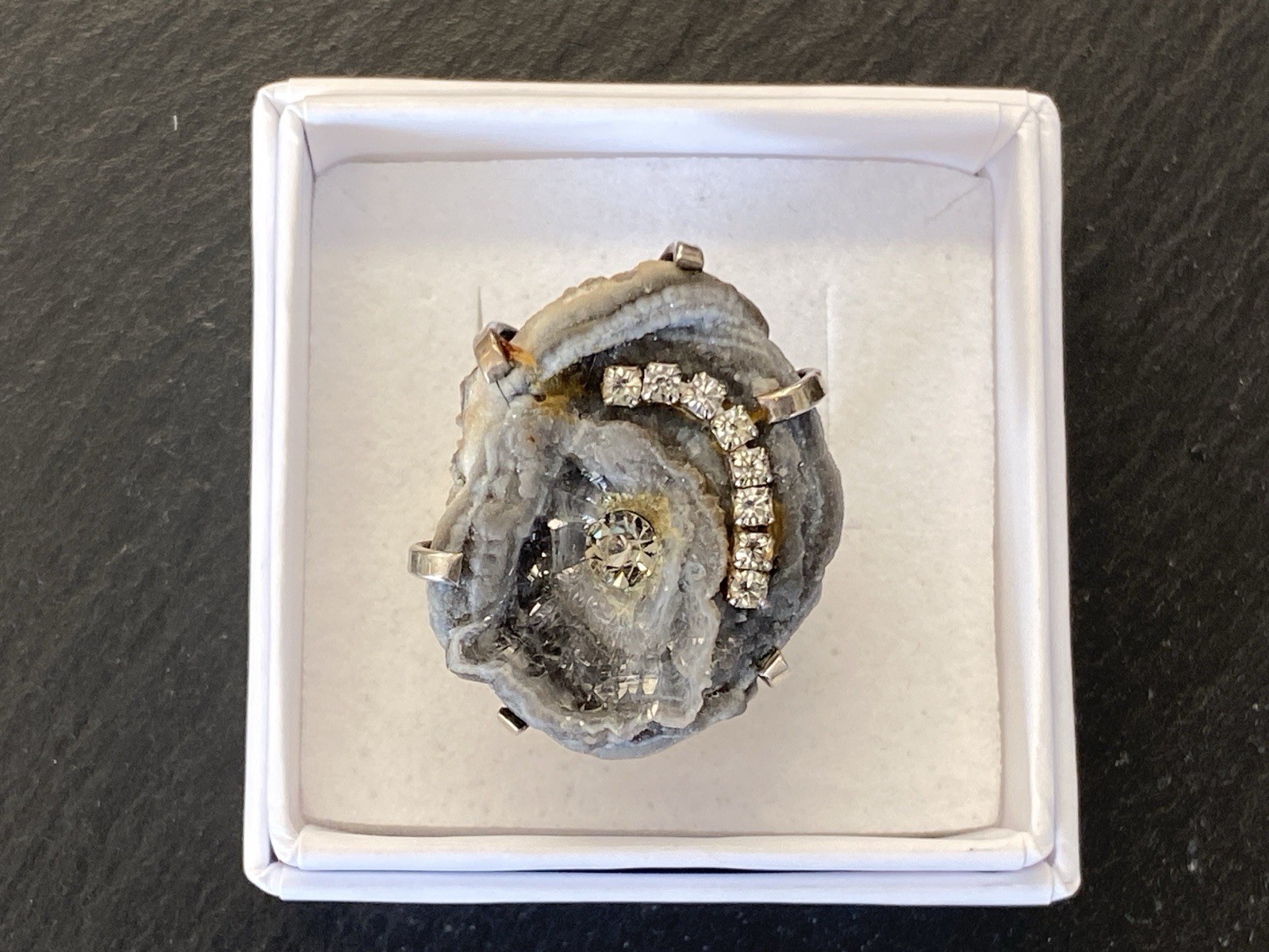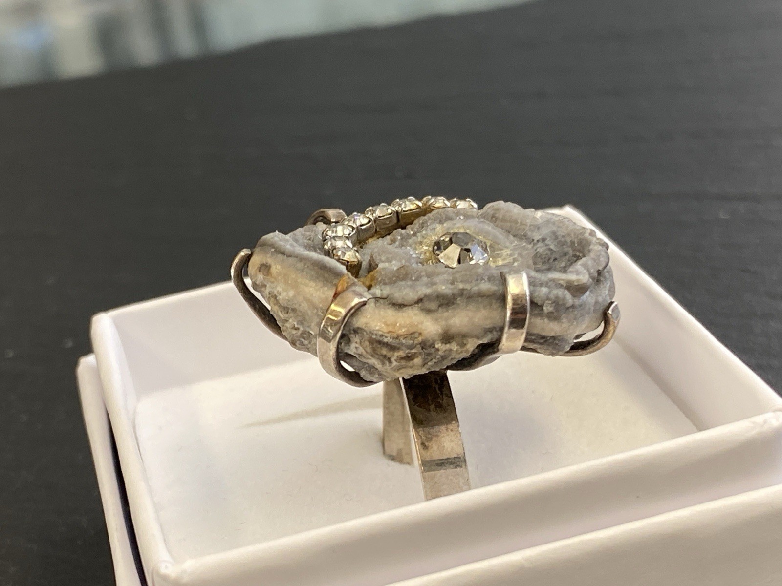 Ausgefallener Ring aus 830 Silber, gestempelt, mit grau gefächertem Achat Kristall. Dieser ist mit farblosen Glassteinen besetzt, um deren Bereich sind Kleberückstände zu sehen. Die Oberfläche des Ringes selbst ist berieben und angelaufen. Der Ring ist Größenverstellbar, aktuell hat er RG 58. BTH des Mittelteils 2,4/1,2/3,07cm, B/H Ringschiene 0,5/0,1cm, Gesamtgewicht ca. 12,15g.
