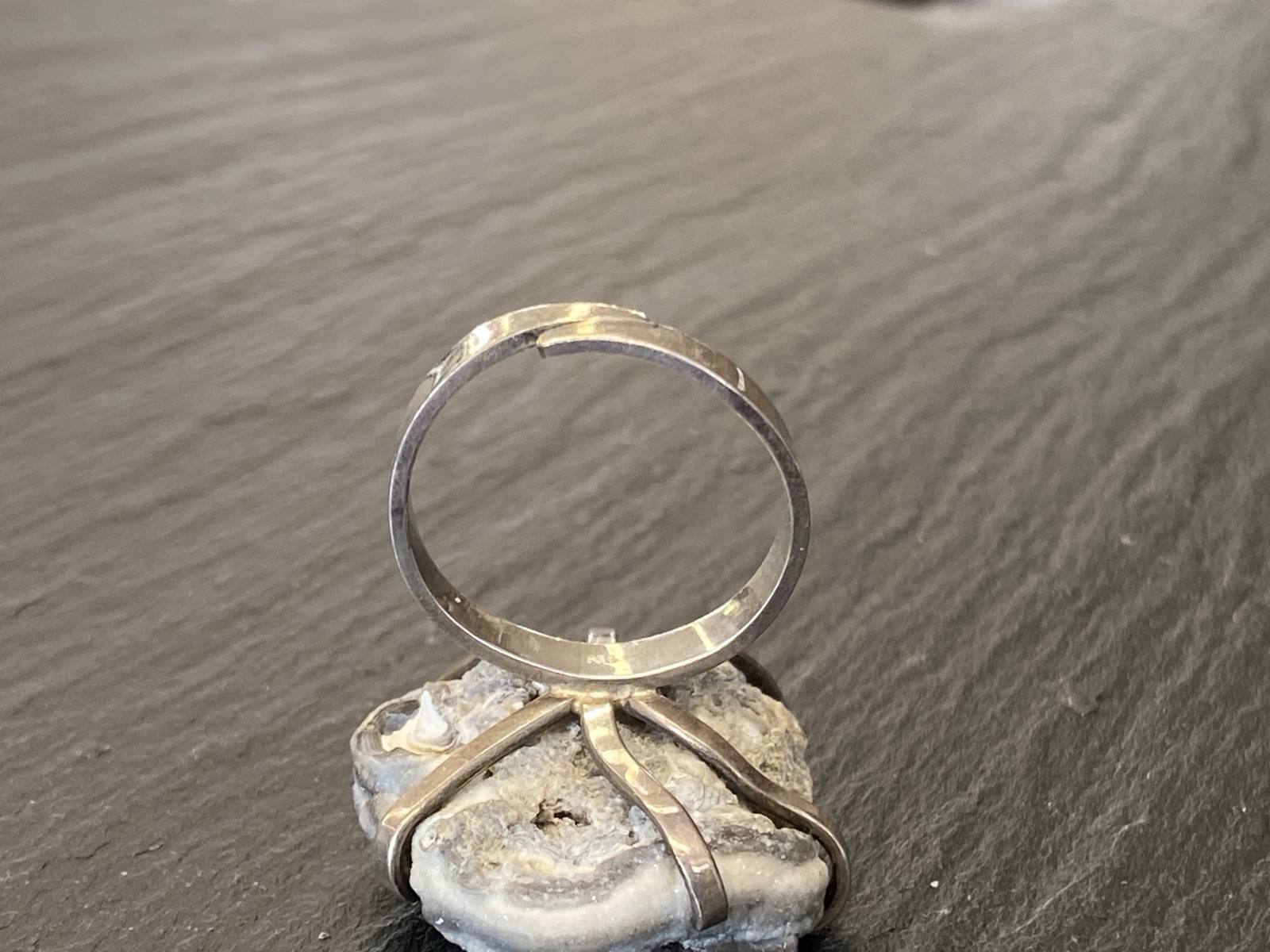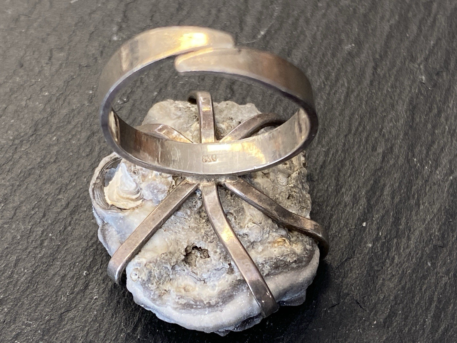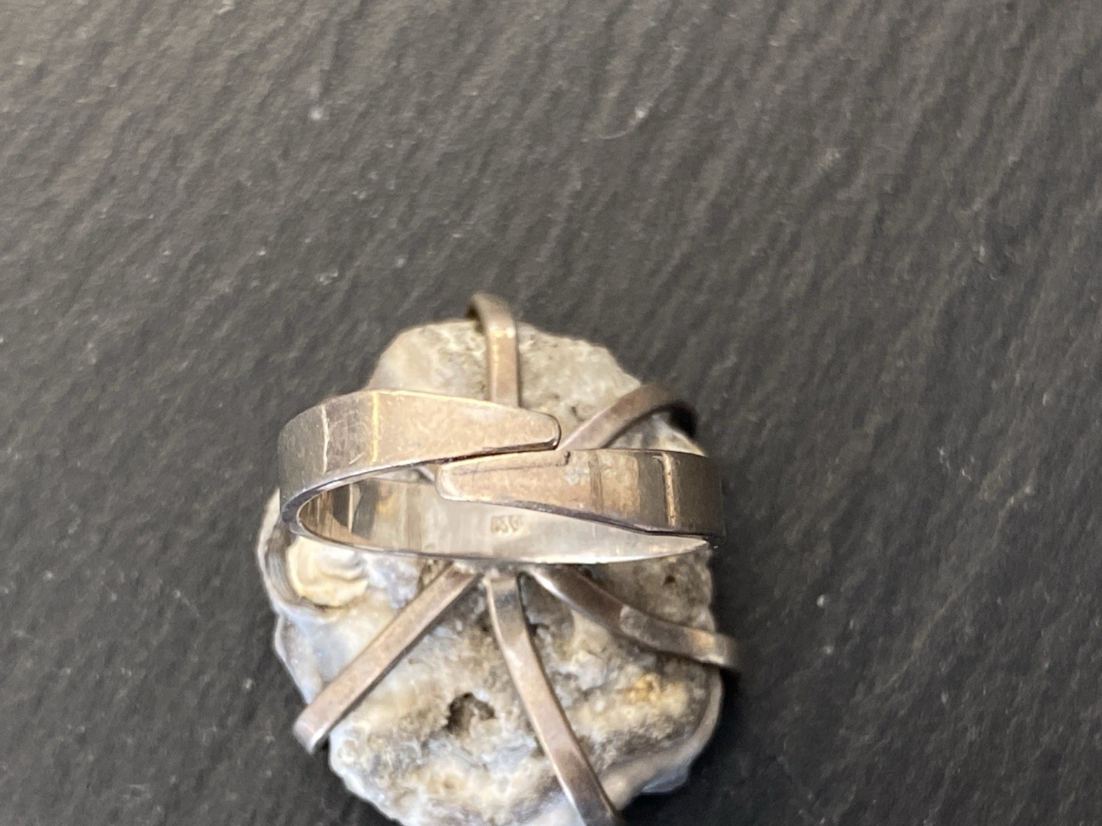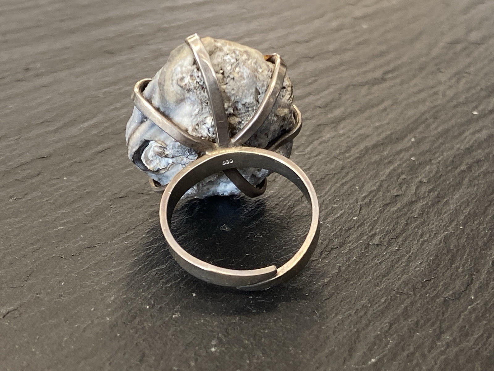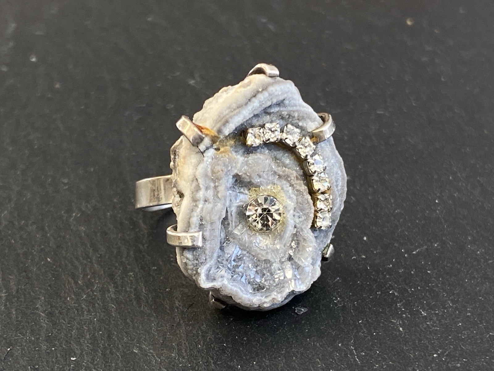 Ausgefallener Ring aus 830 Silber, gestempelt, mit grau gefächertem Achat Kristall. Dieser ist mit farblosen Glassteinen besetzt, um deren Bereich sind Kleberückstände zu sehen. Die Oberfläche des Ringes selbst ist berieben und angelaufen. Der Ring ist Größenverstellbar, aktuell hat er RG 58. BTH des Mittelteils 2,4/1,2/3,07cm, B/H Ringschiene 0,5/0,1cm, Gesamtgewicht ca. 12,15g.