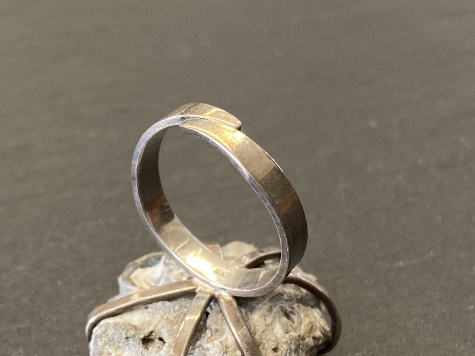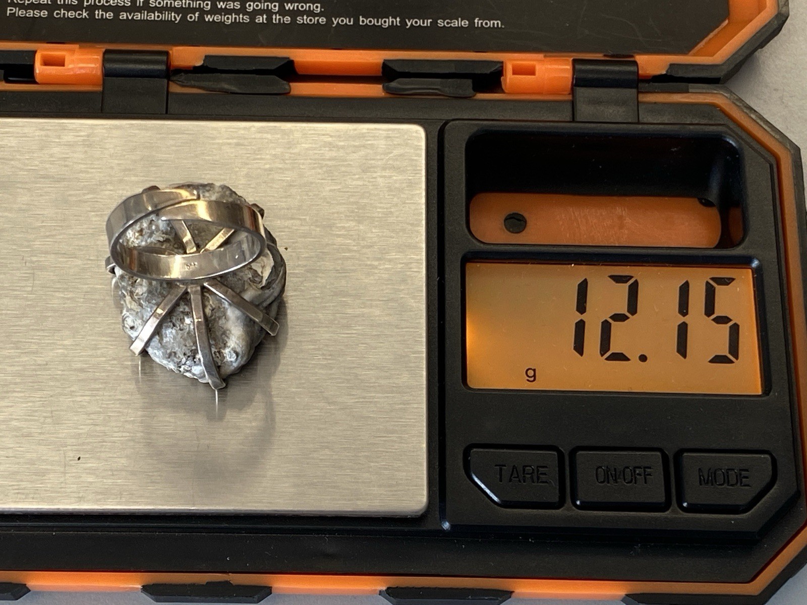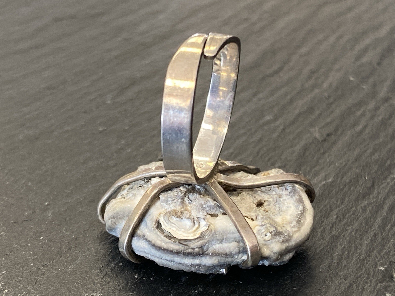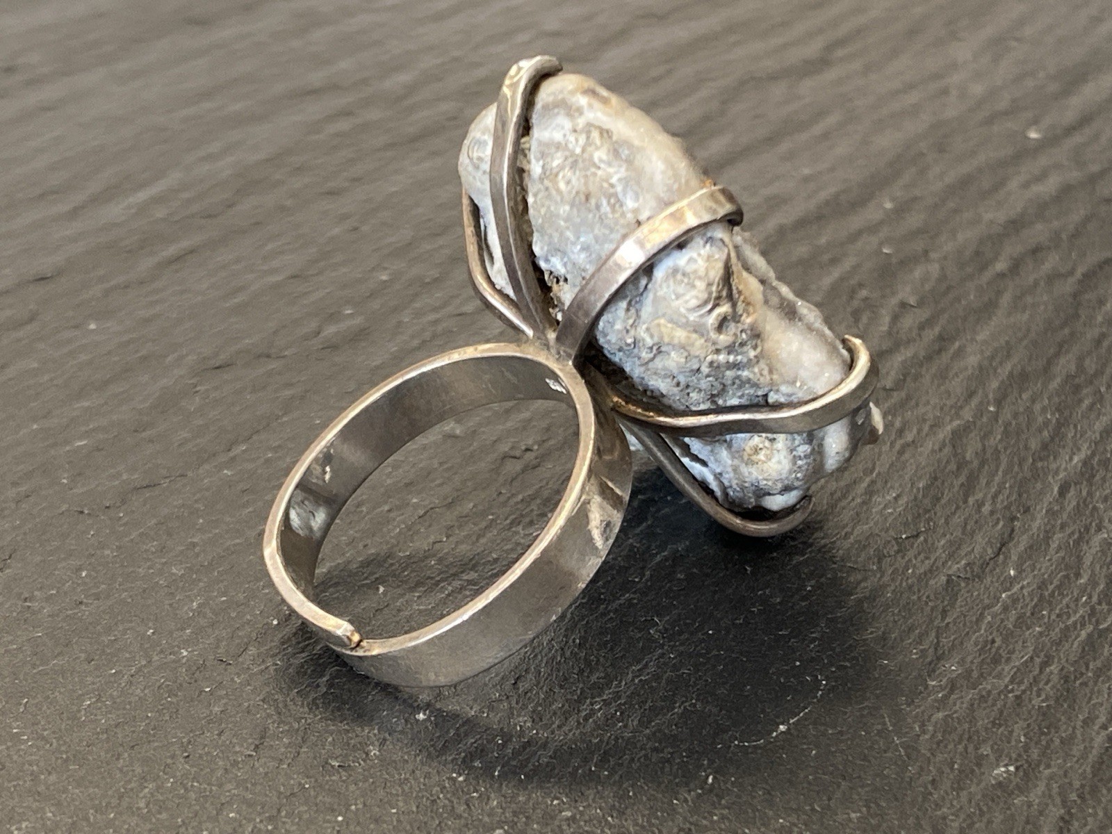 Ausgefallener Ring aus 830 Silber, gestempelt, mit grau gefächertem Achat Kristall. Dieser ist mit farblosen Glassteinen besetzt, um deren Bereich sind Kleberückstände zu sehen. Die Oberfläche des Ringes selbst ist berieben und angelaufen. Der Ring ist Größenverstellbar, aktuell hat er RG 58. BTH des Mittelteils 2,4/1,2/3,07cm, B/H Ringschiene 0,5/0,1cm, Gesamtgewicht ca. 12,15g.