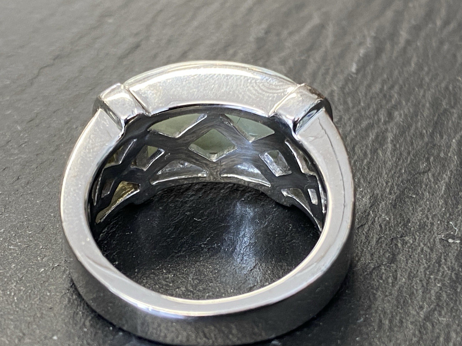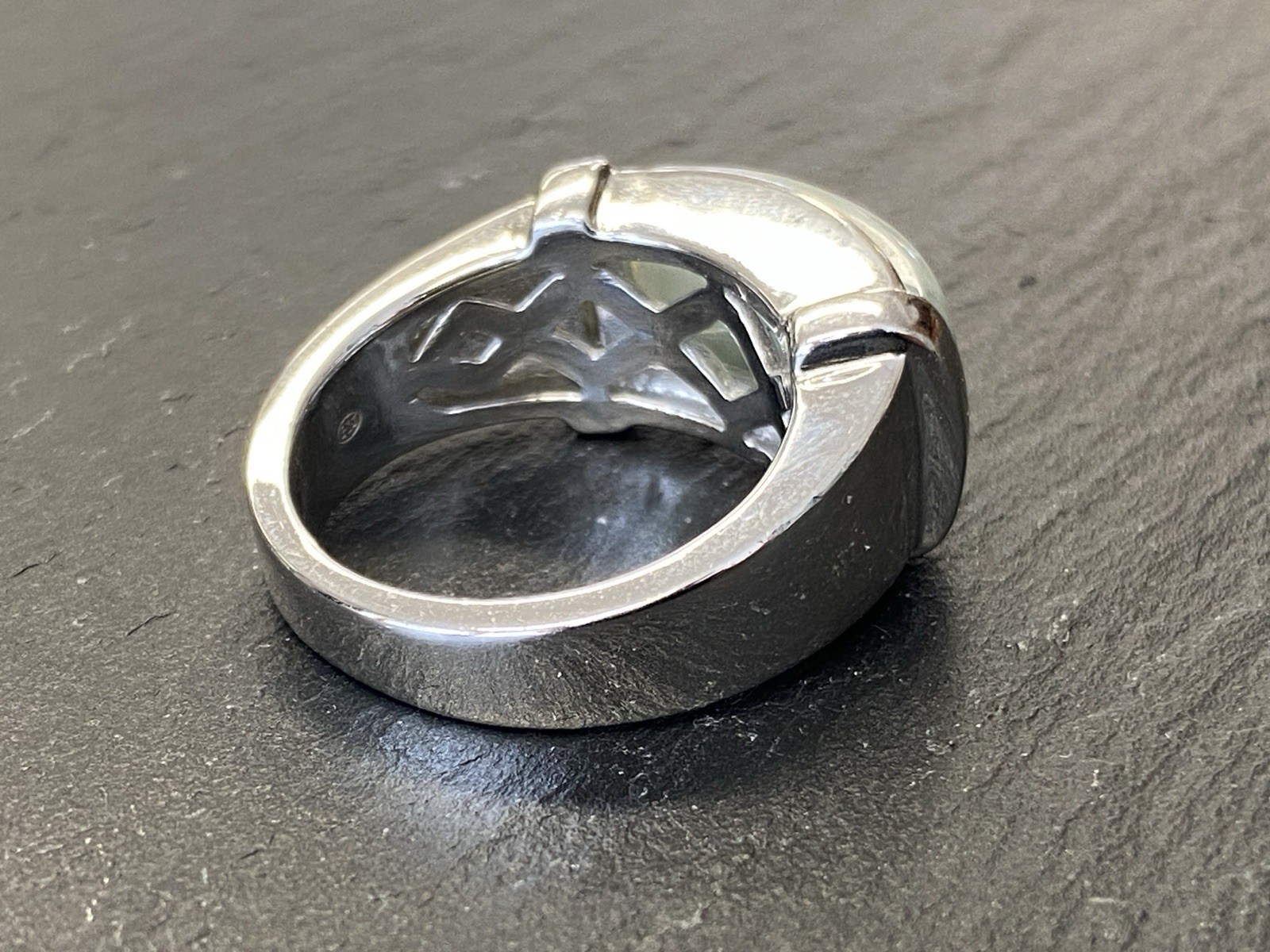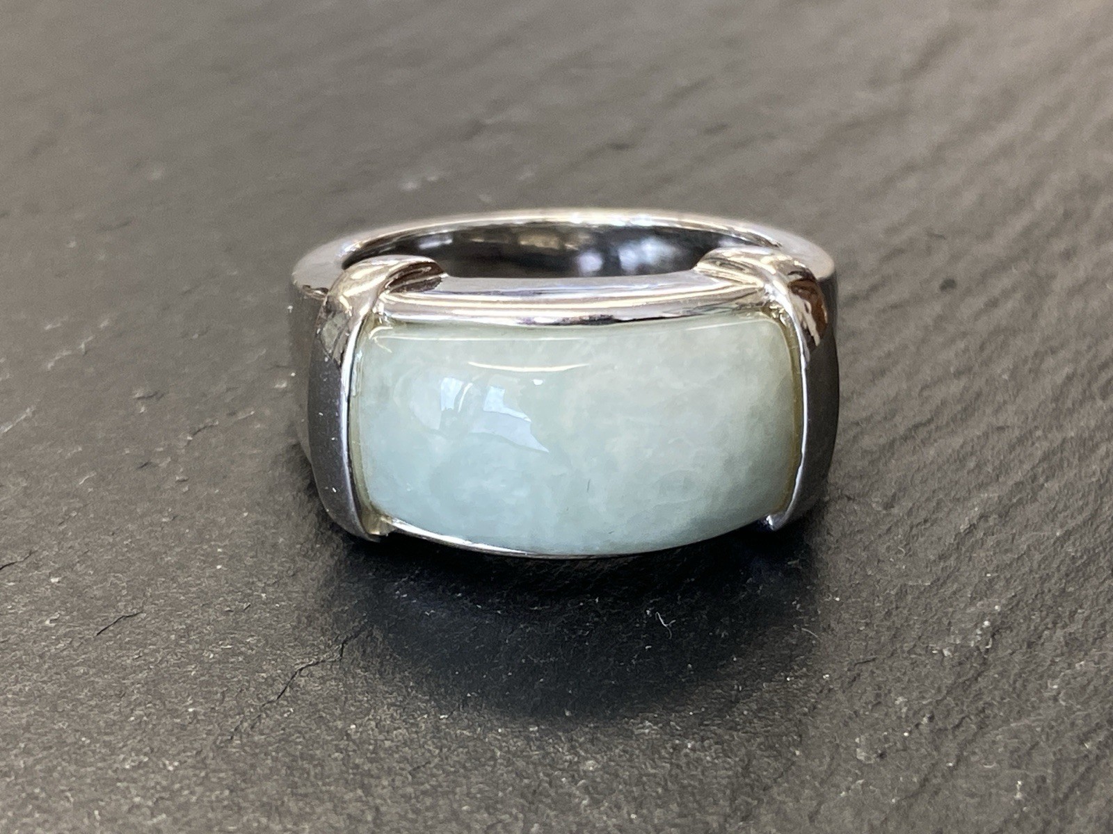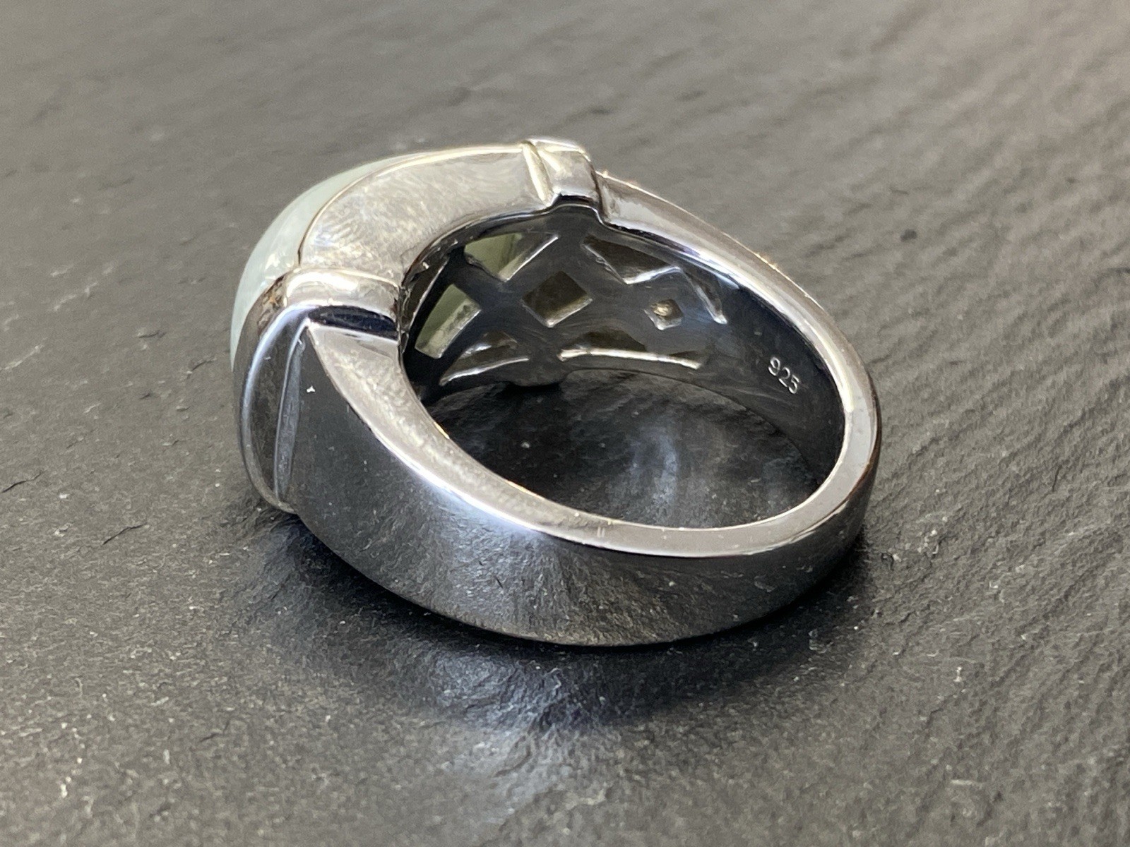 Schicker Ring aus 925 Sterling Silber, mit 925 und Juwelierspunze gestempelt, mit Cabochon aus Aventurinquarz. Der Stein ist nicht bestoßen, die Oberfläche des Ringes ist leicht berieben. RG 59, BTH des Oberteils 2,2/1,2/0,9cm, B/H der Ringschiene 0,6/0,2cm, Gesamtgewicht ca. 12,64g.