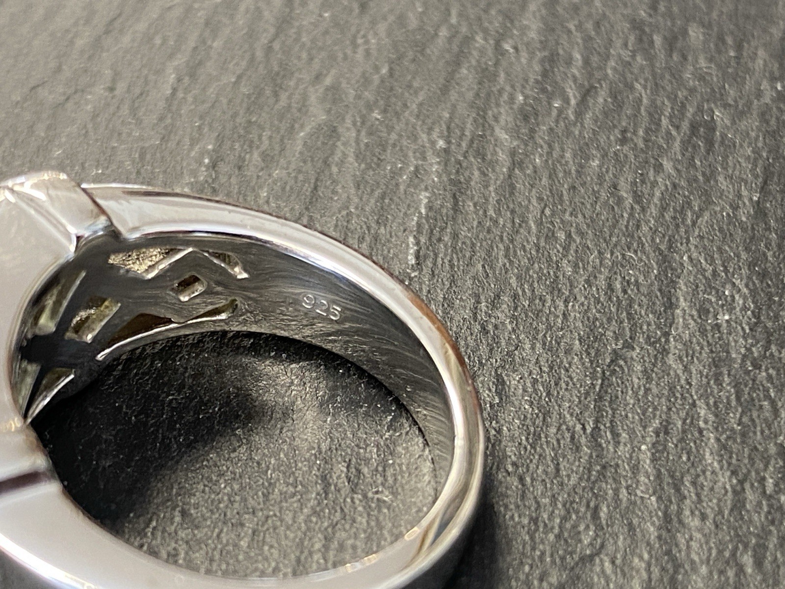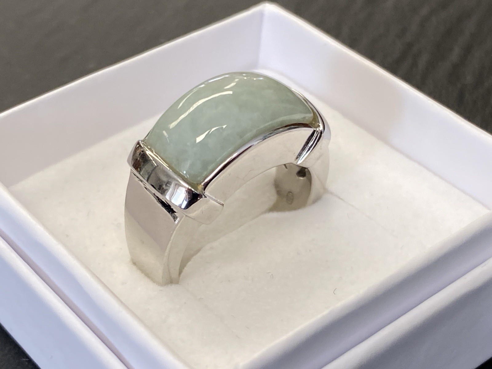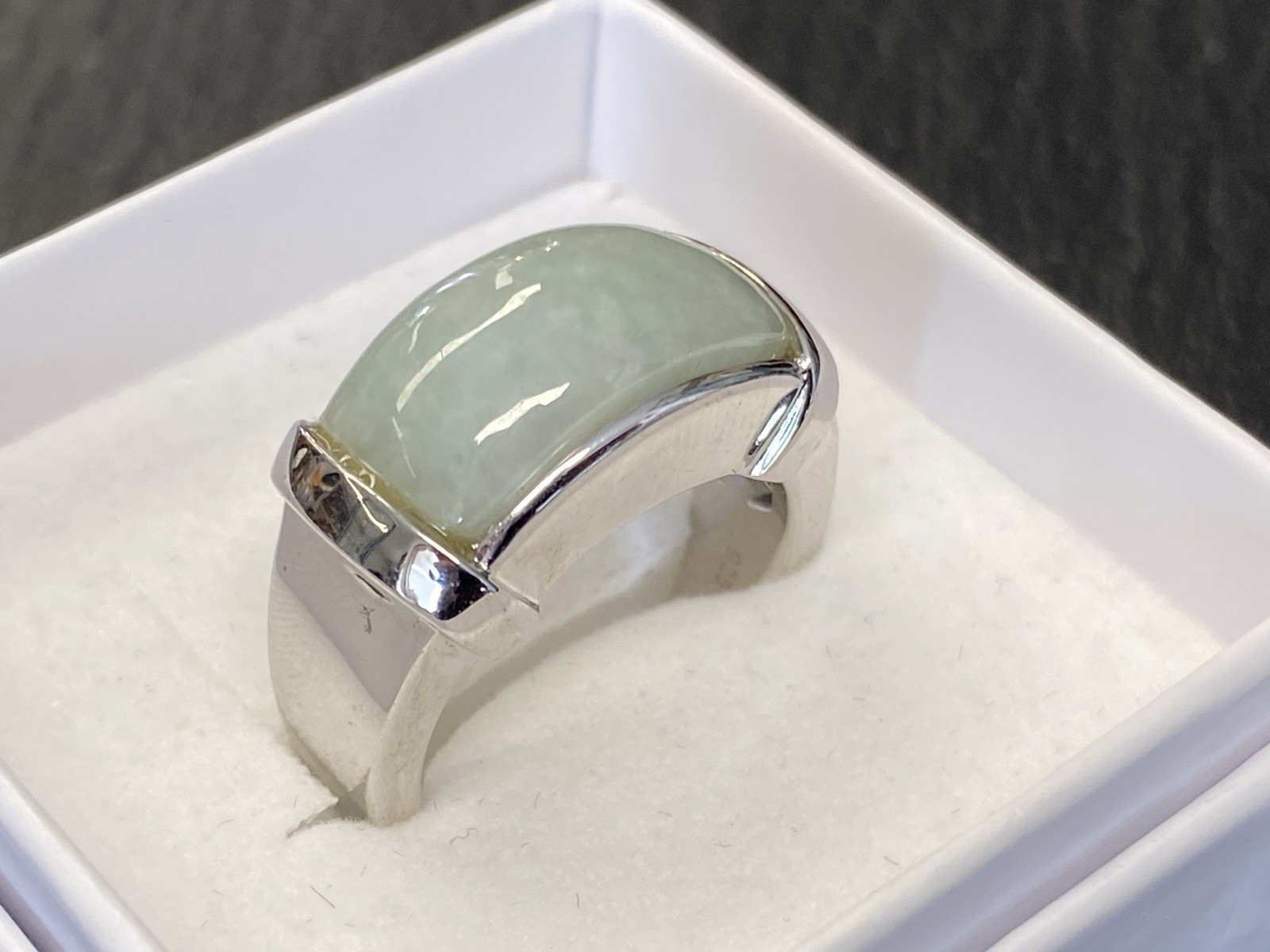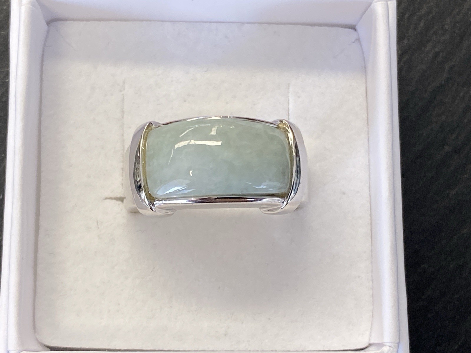 Schicker Ring aus 925 Sterling Silber, mit 925 und Juwelierspunze gestempelt, mit Cabochon aus Aventurinquarz. Der Stein ist nicht bestoßen, die Oberfläche des Ringes ist leicht berieben. RG 59, BTH des Oberteils 2,2/1,2/0,9cm, B/H der Ringschiene 0,6/0,2cm, Gesamtgewicht ca. 12,64g.