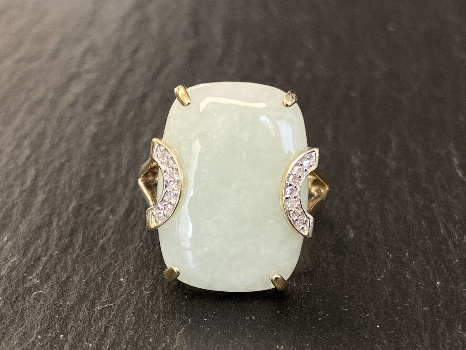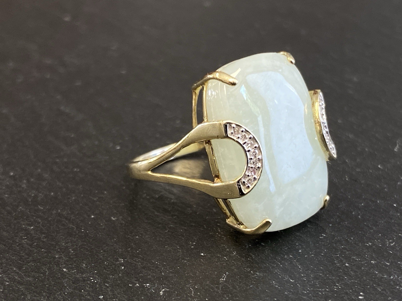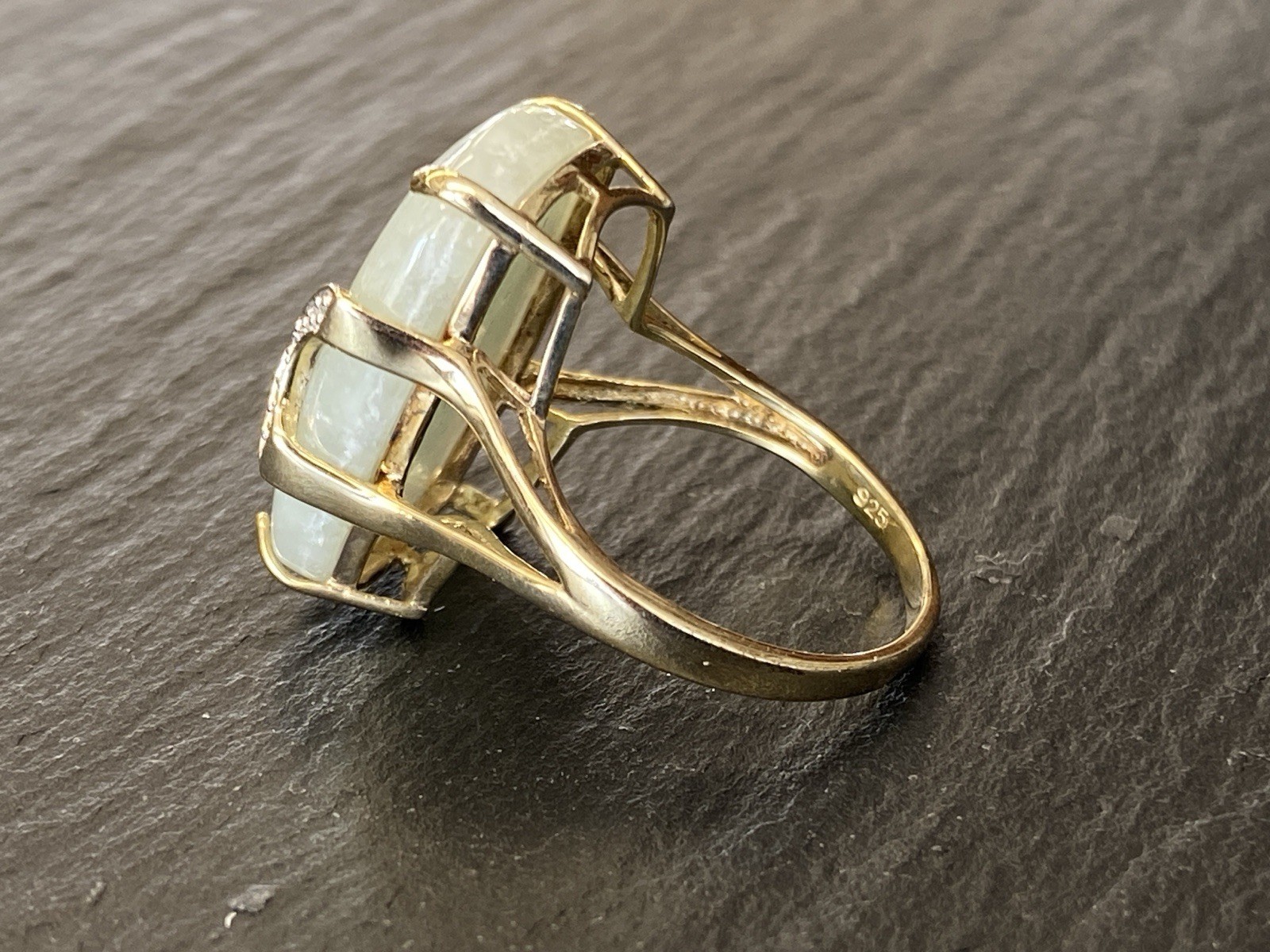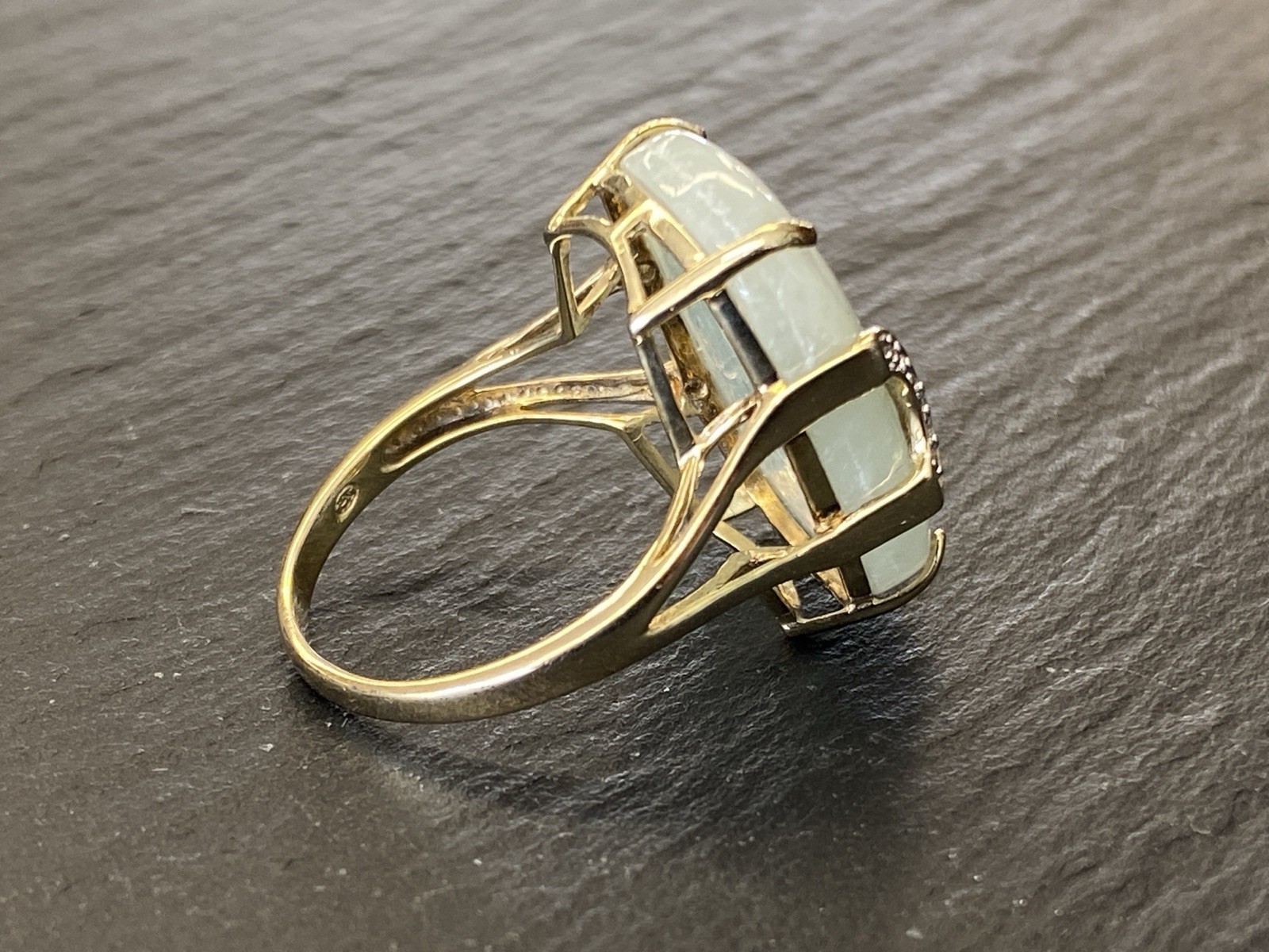 Eleganter Ring aus 925 Sterling Silber, gestempelt und vergoldet, mit Cabochon aus Aventurinquarz. Dieser wird von Diamanten von zus. ca. 0,07ct., soweit in der Fassung messbar, in VS1/G begleitet. Die Steine sind intakt, die Oberfläche des Ringes ist minimal berieben. BTH Mittelteil 1,7/0,8/2,2cm, B/H Ringschiene 0,2/0,1cm, RG 59,5, Gesamtgewicht ca. 7,06g.