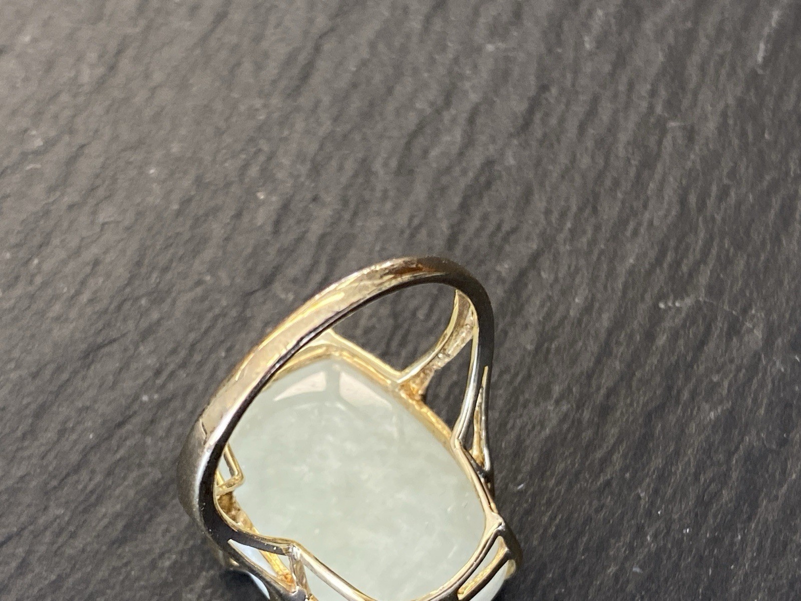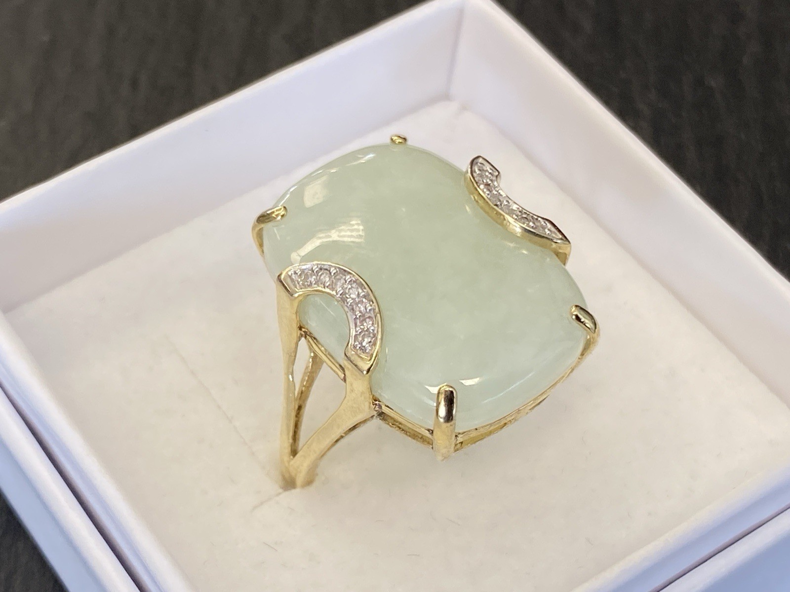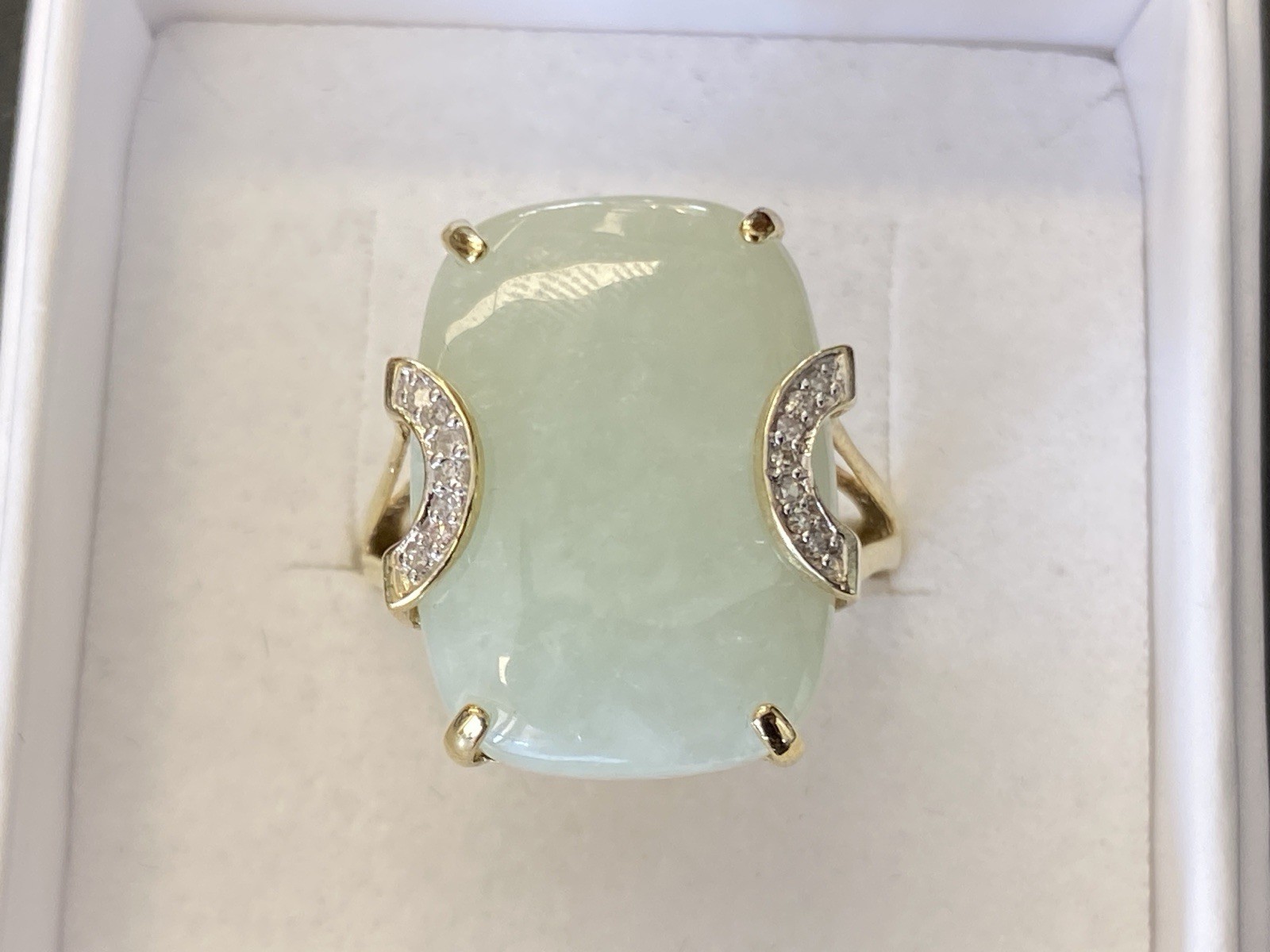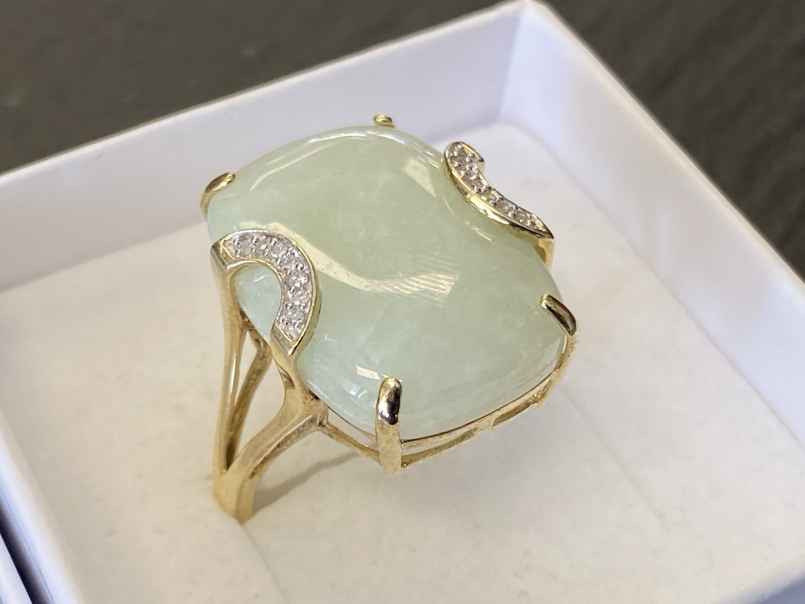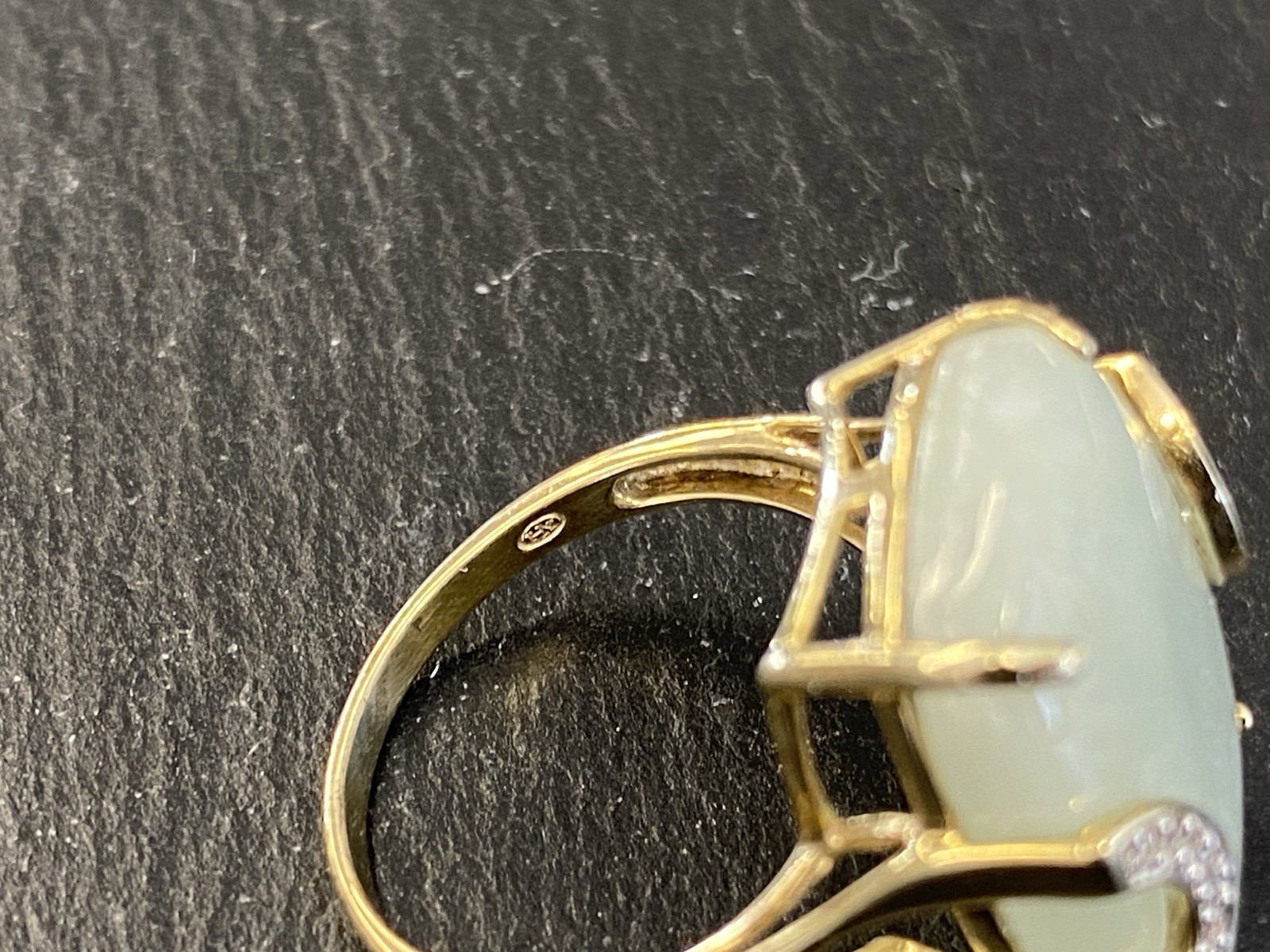 Eleganter Ring aus 925 Sterling Silber, gestempelt und vergoldet, mit Cabochon aus Aventurinquarz. Dieser wird von Diamanten von zus. ca. 0,07ct., soweit in der Fassung messbar, in VS1/G begleitet. Die Steine sind intakt, die Oberfläche des Ringes ist minimal berieben. BTH Mittelteil 1,7/0,8/2,2cm, B/H Ringschiene 0,2/0,1cm, RG 59,5, Gesamtgewicht ca. 7,06g.