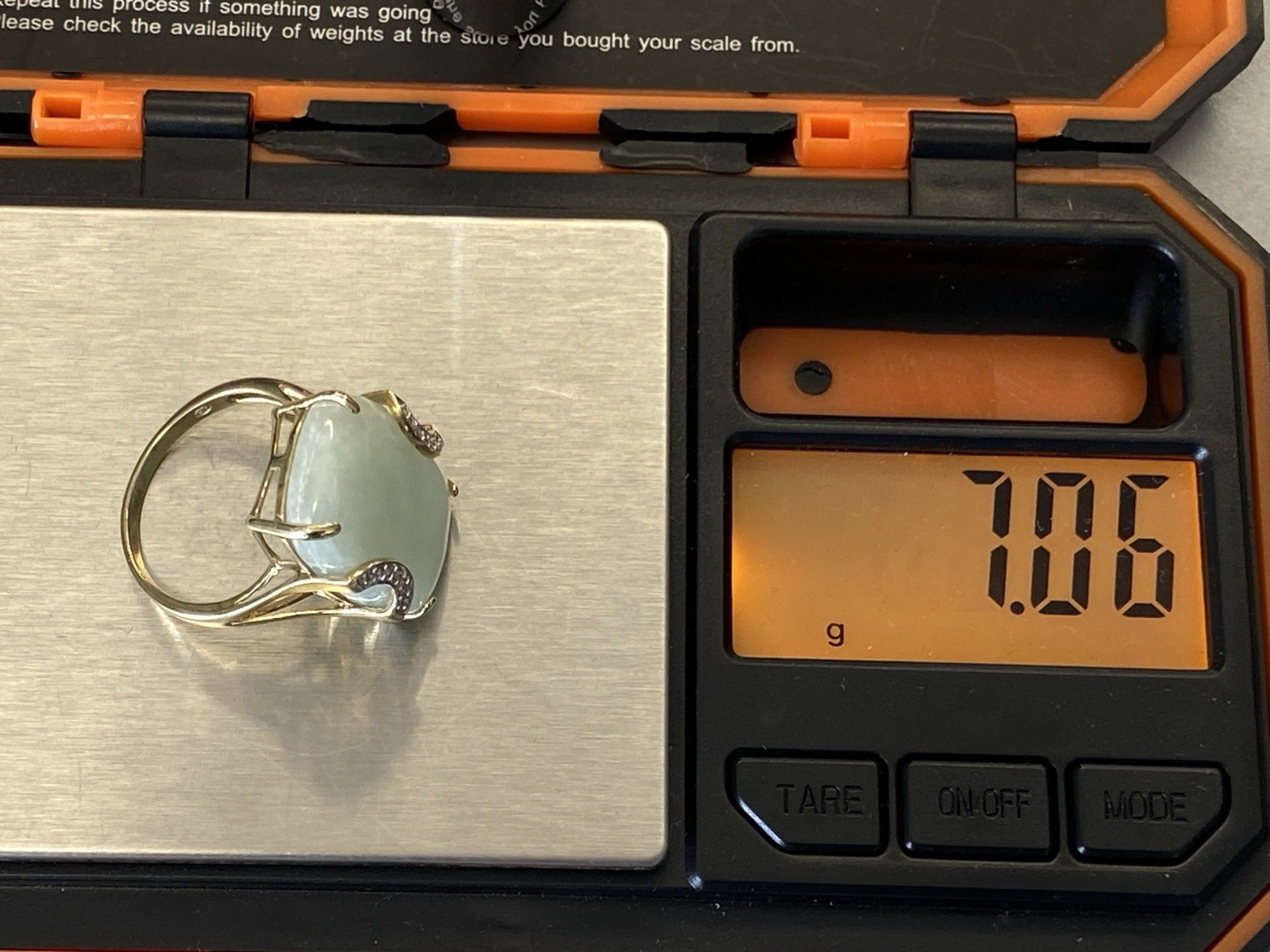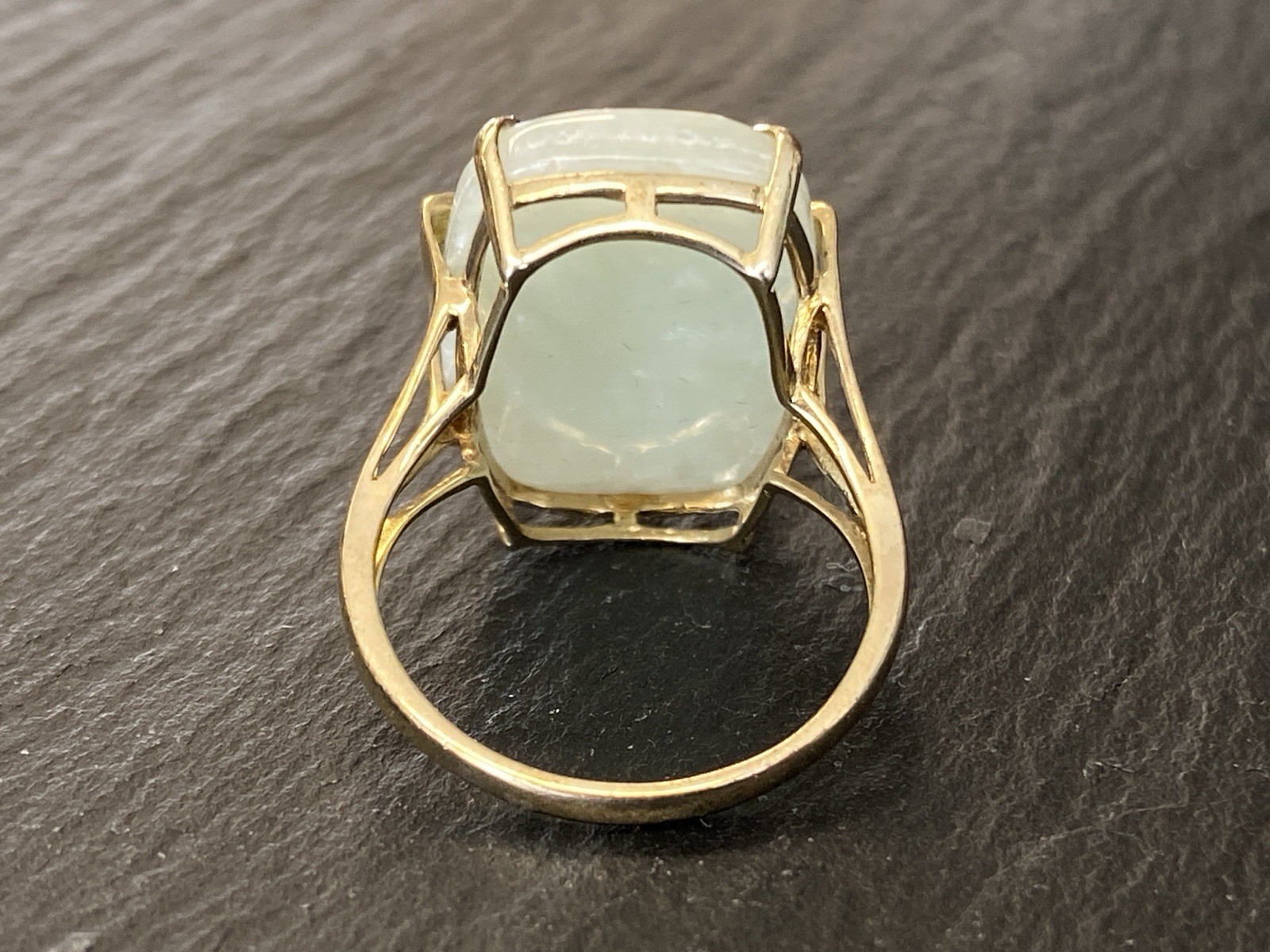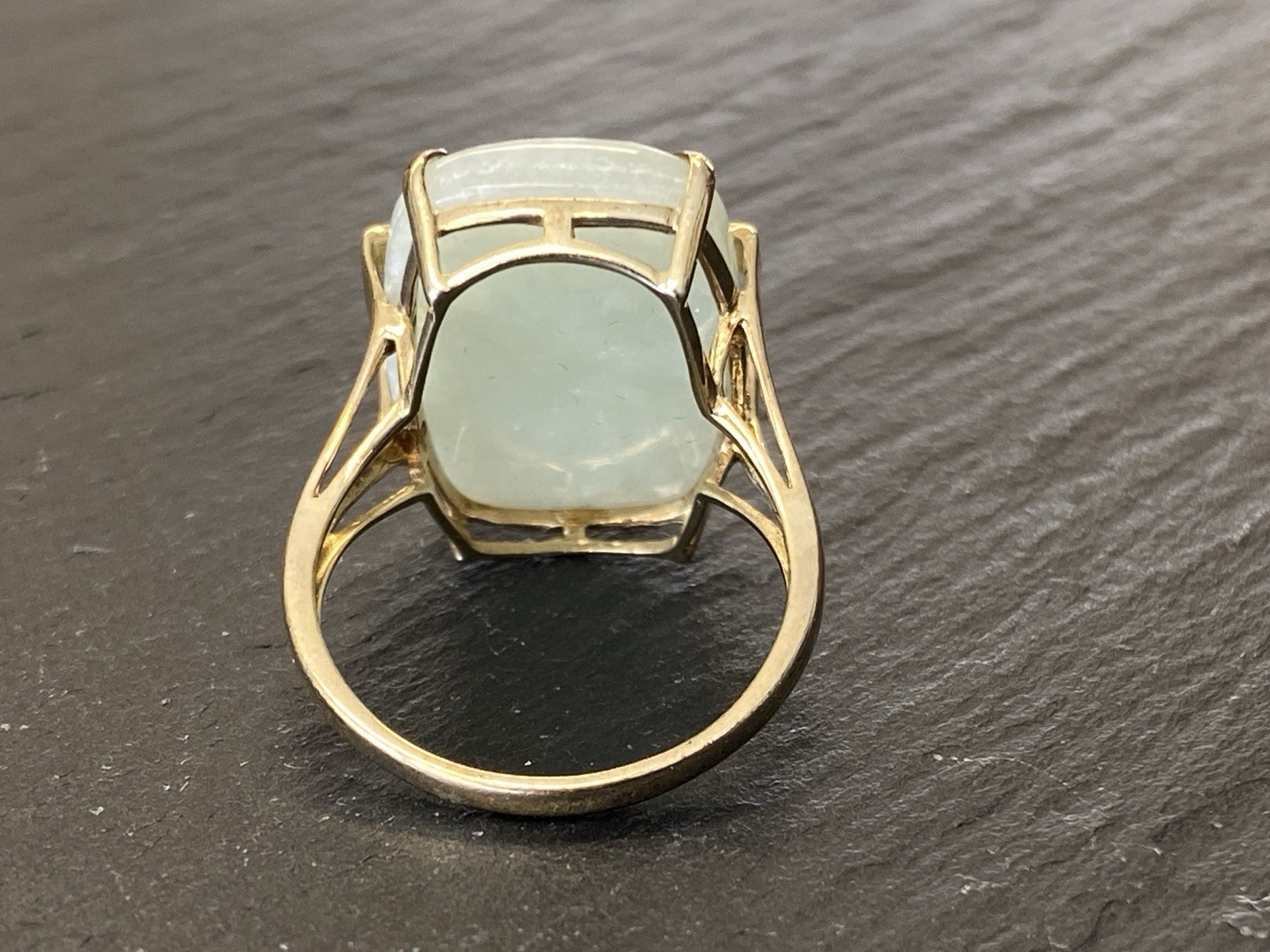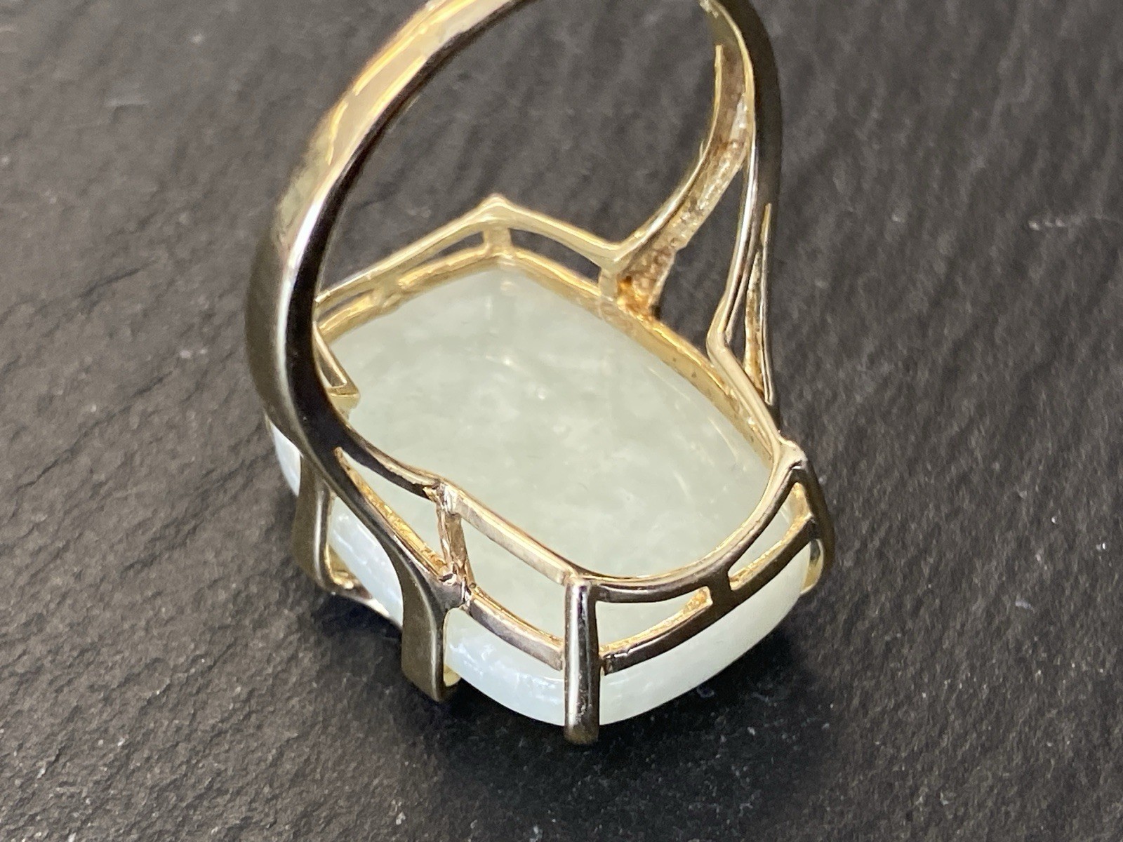 Eleganter Ring aus 925 Sterling Silber, gestempelt und vergoldet, mit Cabochon aus Aventurinquarz. Dieser wird von Diamanten von zus. ca. 0,07ct., soweit in der Fassung messbar, in VS1/G begleitet. Die Steine sind intakt, die Oberfläche des Ringes ist minimal berieben. BTH Mittelteil 1,7/0,8/2,2cm, B/H Ringschiene 0,2/0,1cm, RG 59,5, Gesamtgewicht ca. 7,06g.