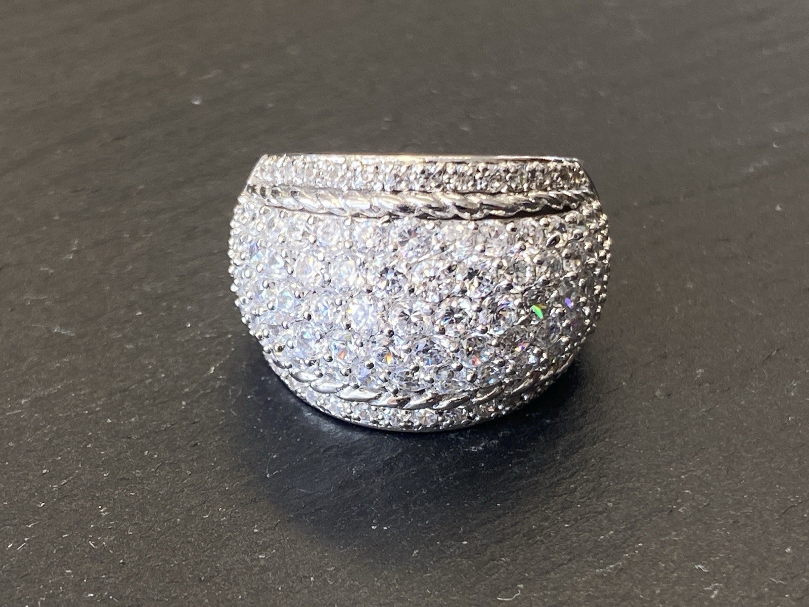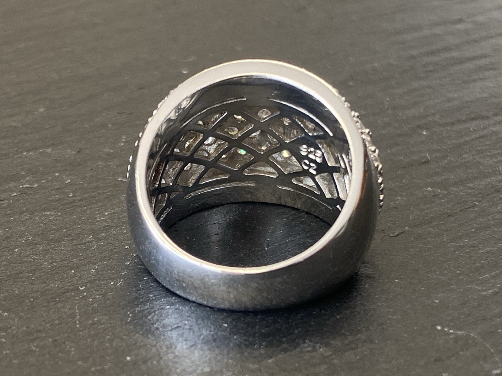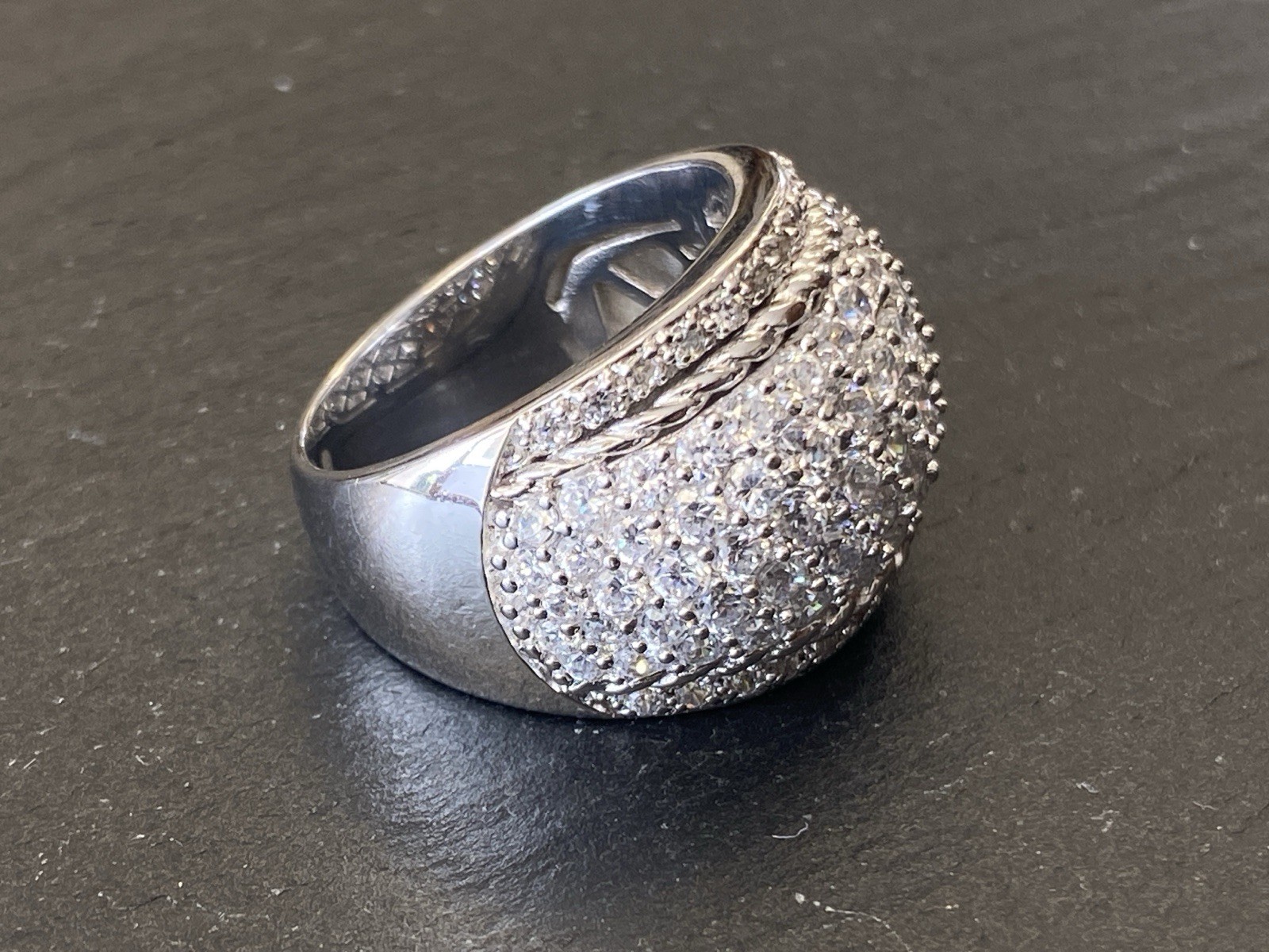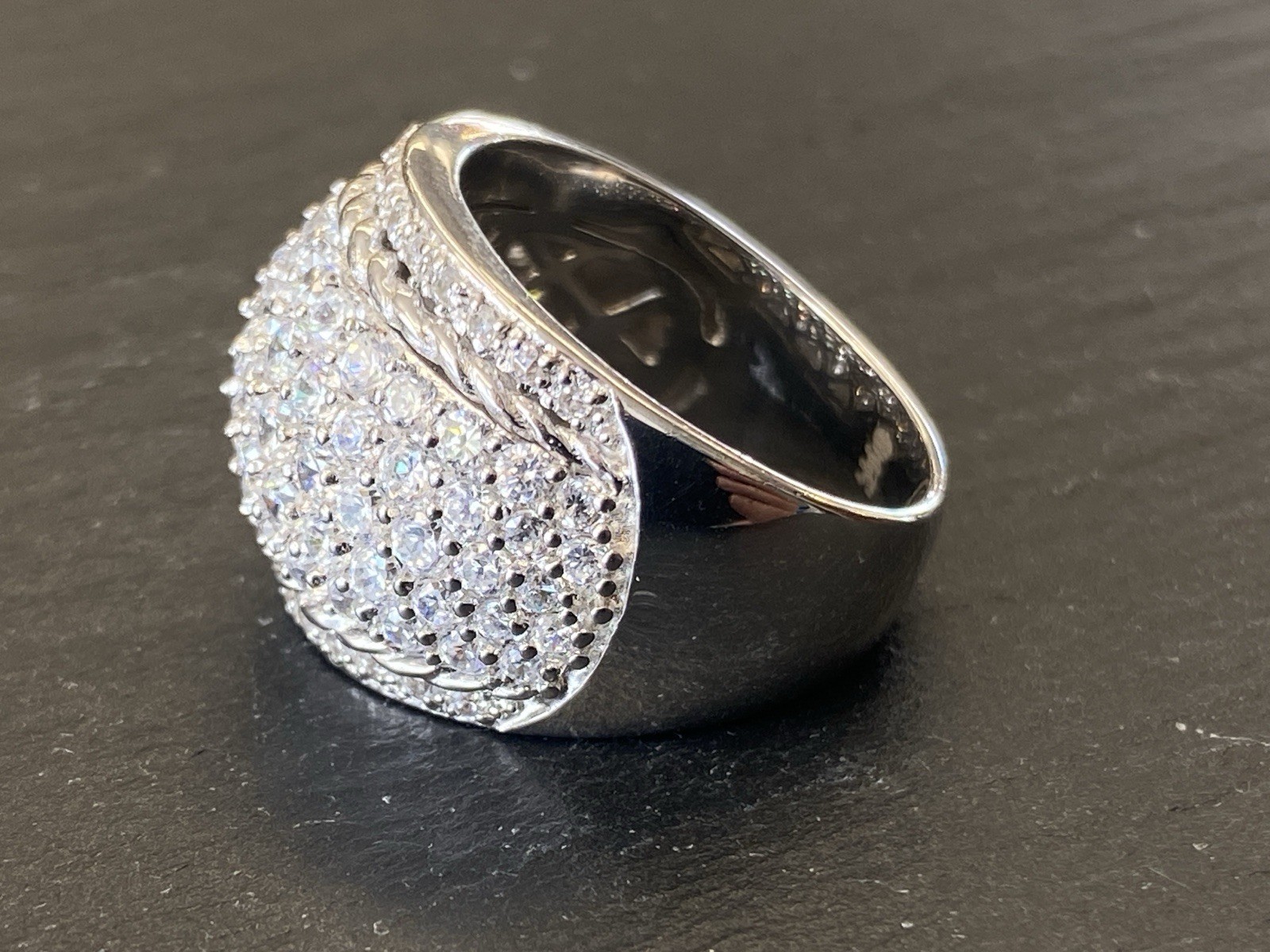 Breiter Ring aus 925 Sterling Silber, gestempelt mit 925 und CZ, mit vielen farblosen Cubic Zirkonia Steinen. Die Steine sind vollständig und intakt, die Oberfläche des Ringes ist minimal berieben. B/H des Oberteils 1,8/0,66cm, B/H Ringschiene 0,6/0,15cm, RG 59, Gesamtgewicht ca. 14,37g.