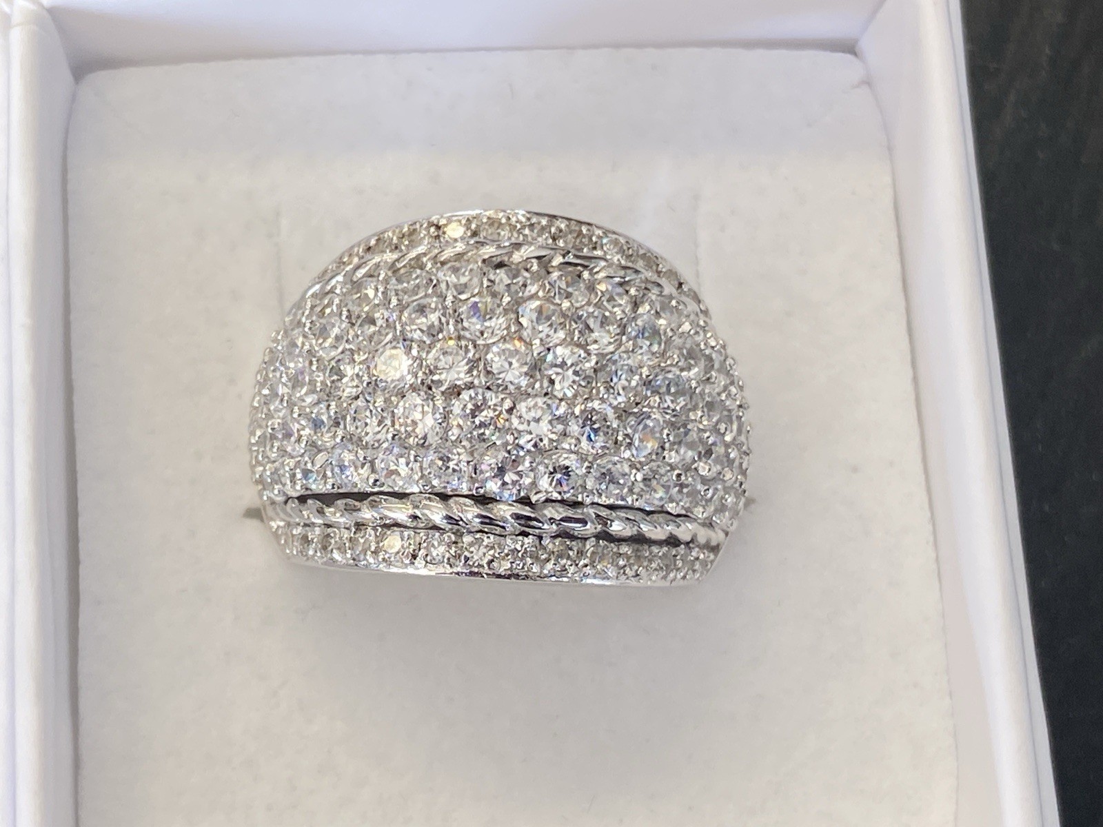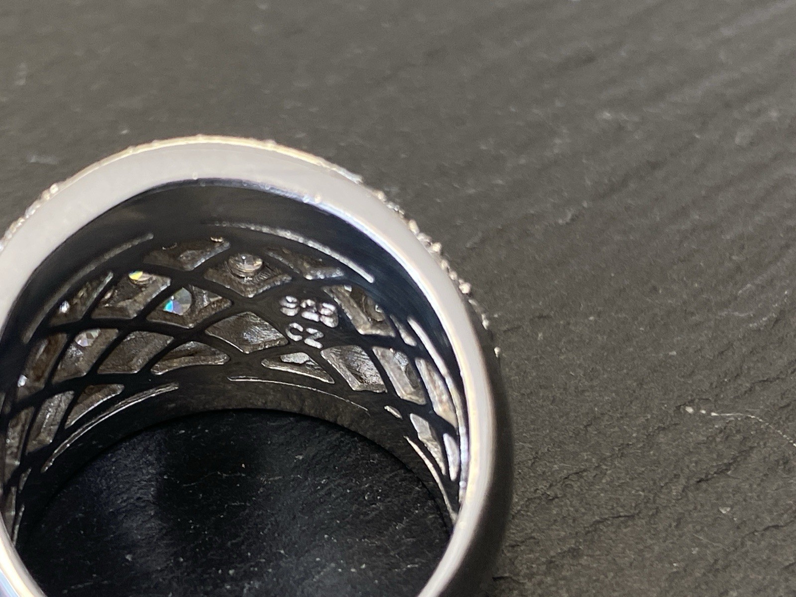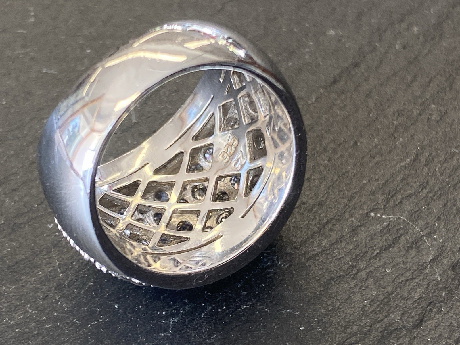 Breiter Ring aus 925 Sterling Silber, gestempelt mit 925 und CZ, mit vielen farblosen Cubic Zirkonia Steinen. Die Steine sind vollständig und intakt, die Oberfläche des Ringes ist minimal berieben. B/H des Oberteils 1,8/0,66cm, B/H Ringschiene 0,6/0,15cm, RG 59, Gesamtgewicht ca. 14,37g.