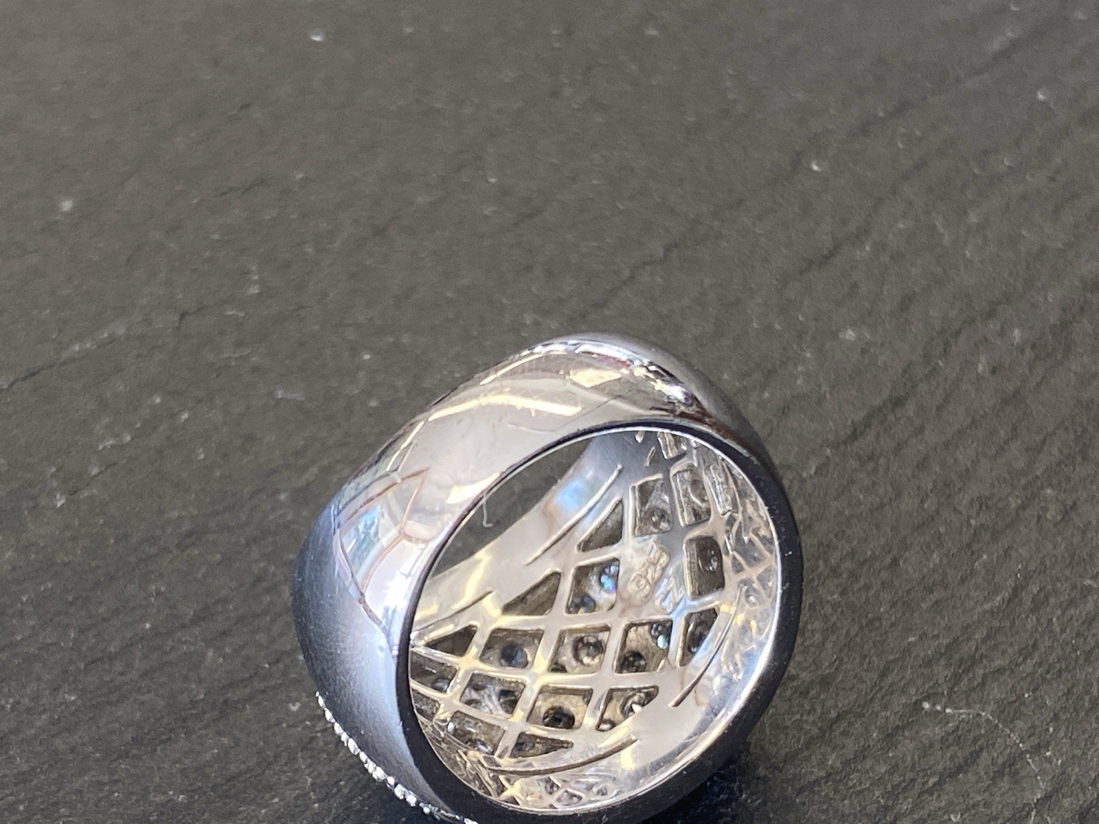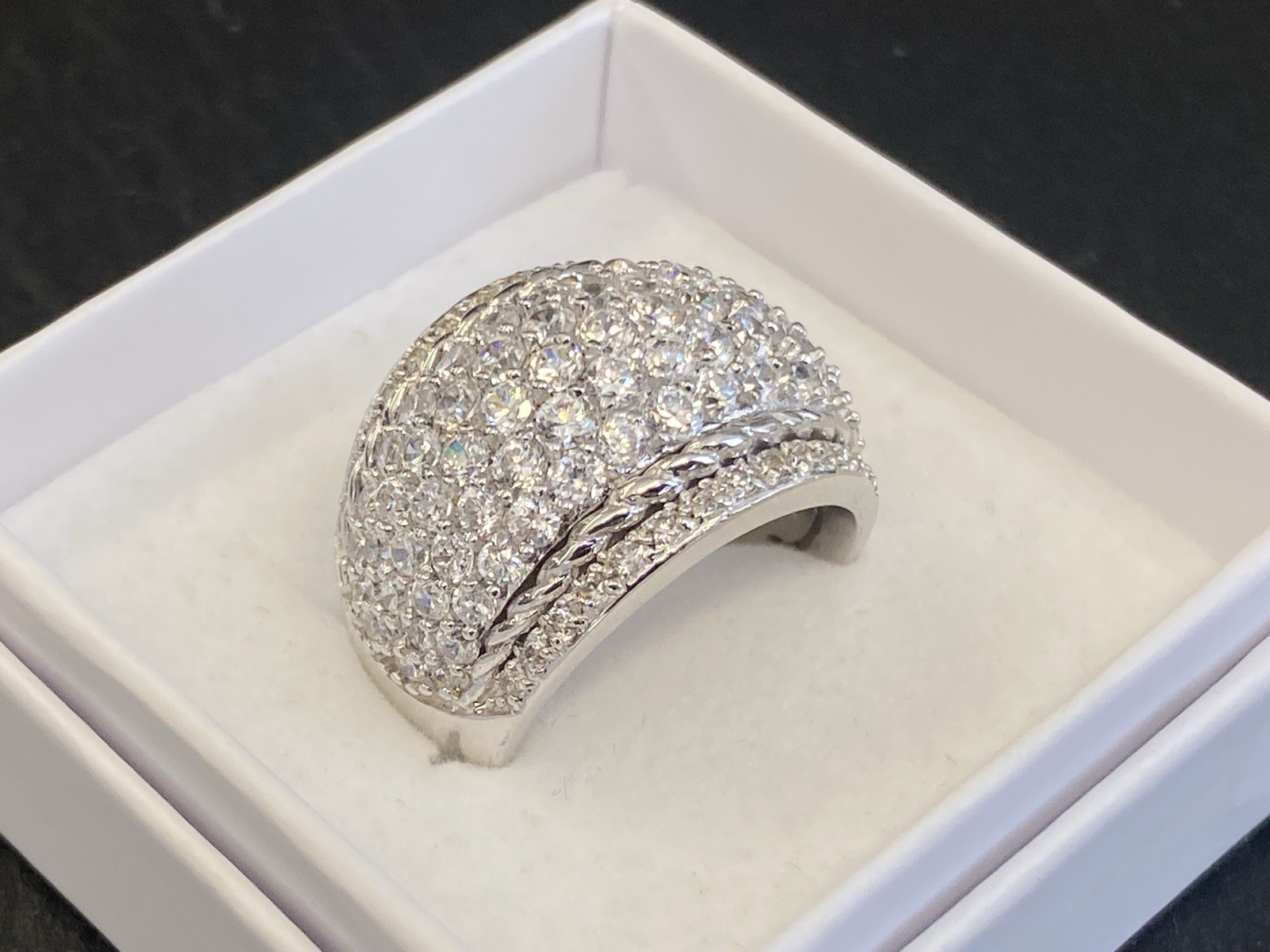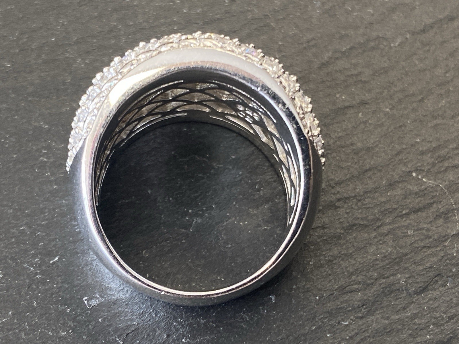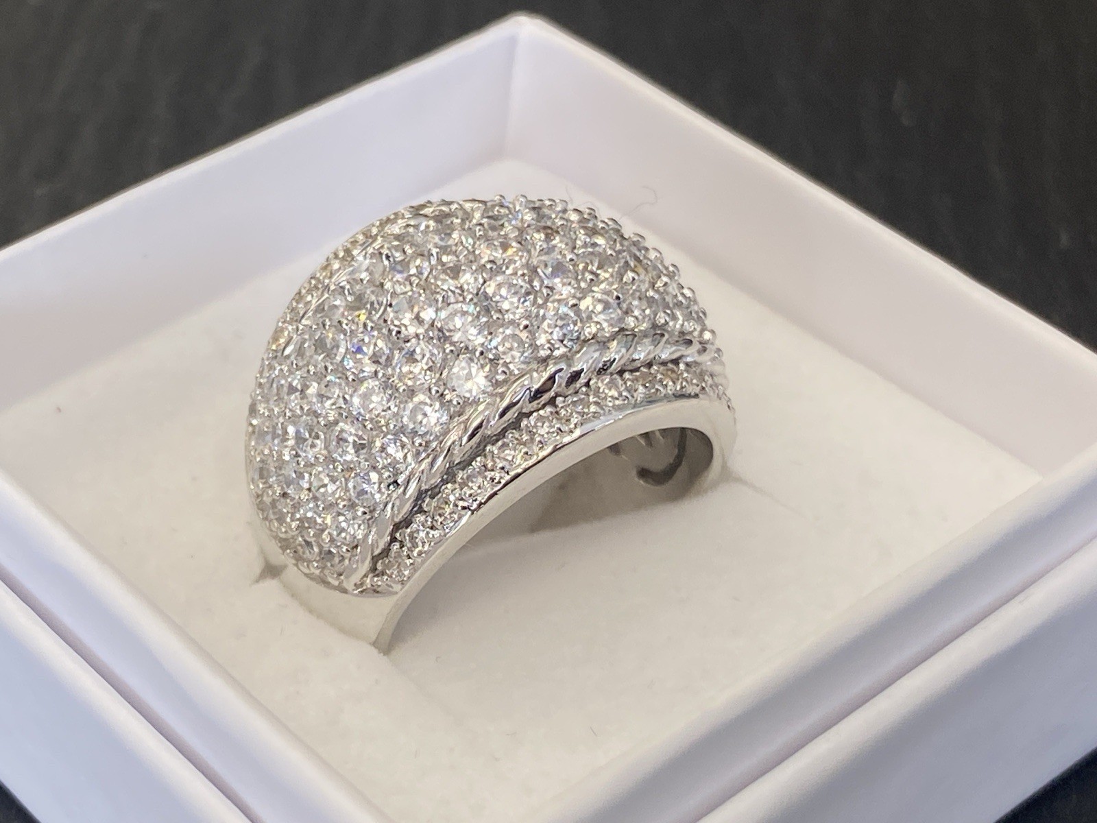 Breiter Ring aus 925 Sterling Silber, gestempelt mit 925 und CZ, mit vielen farblosen Cubic Zirkonia Steinen. Die Steine sind vollständig und intakt, die Oberfläche des Ringes ist minimal berieben. B/H des Oberteils 1,8/0,66cm, B/H Ringschiene 0,6/0,15cm, RG 59, Gesamtgewicht ca. 14,37g.