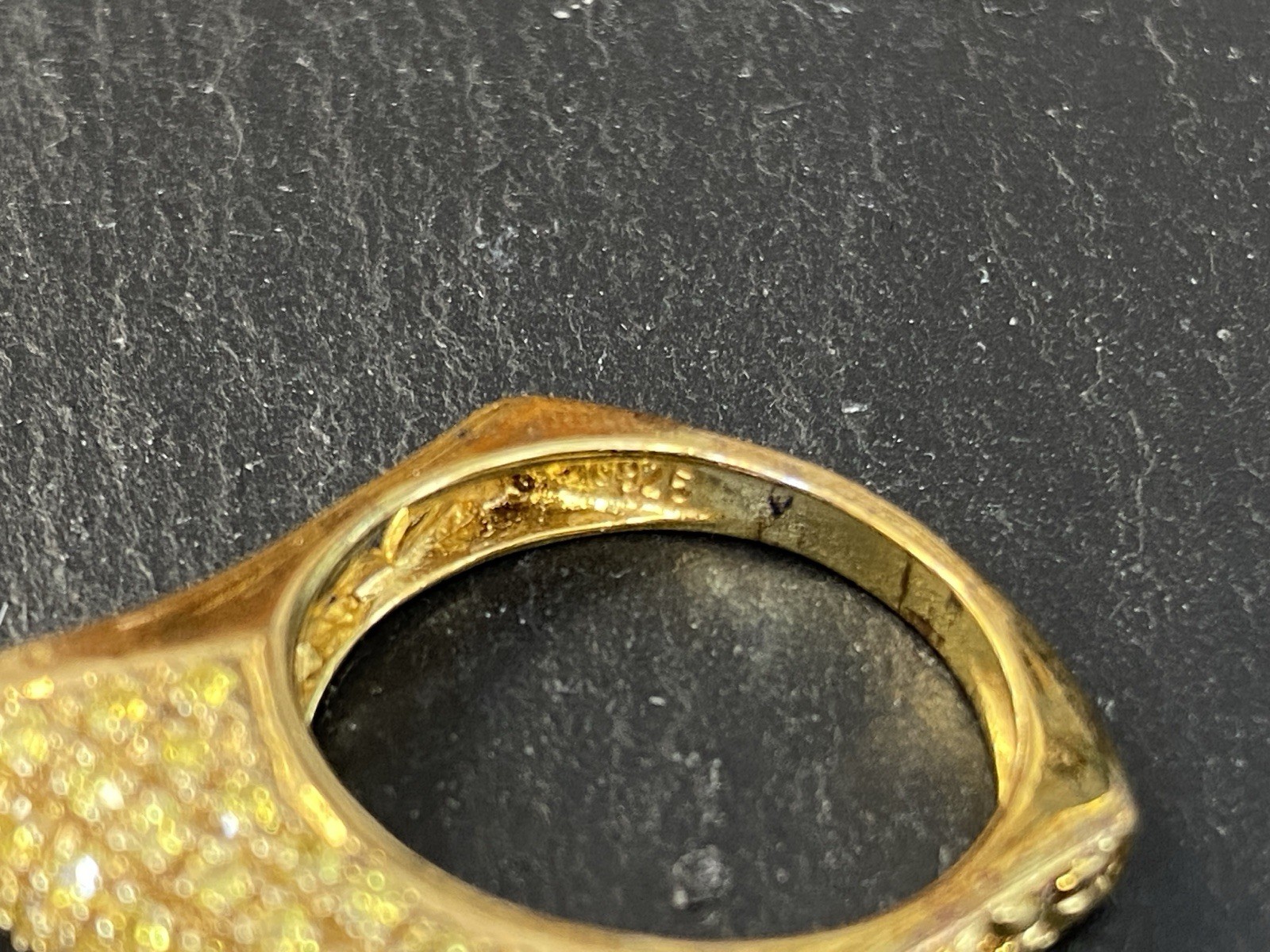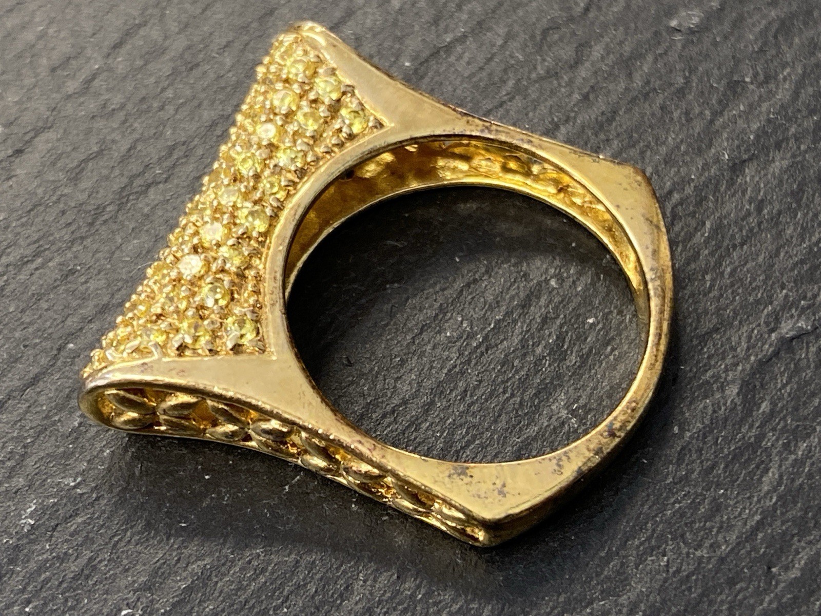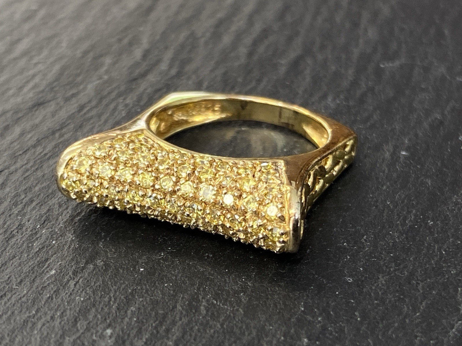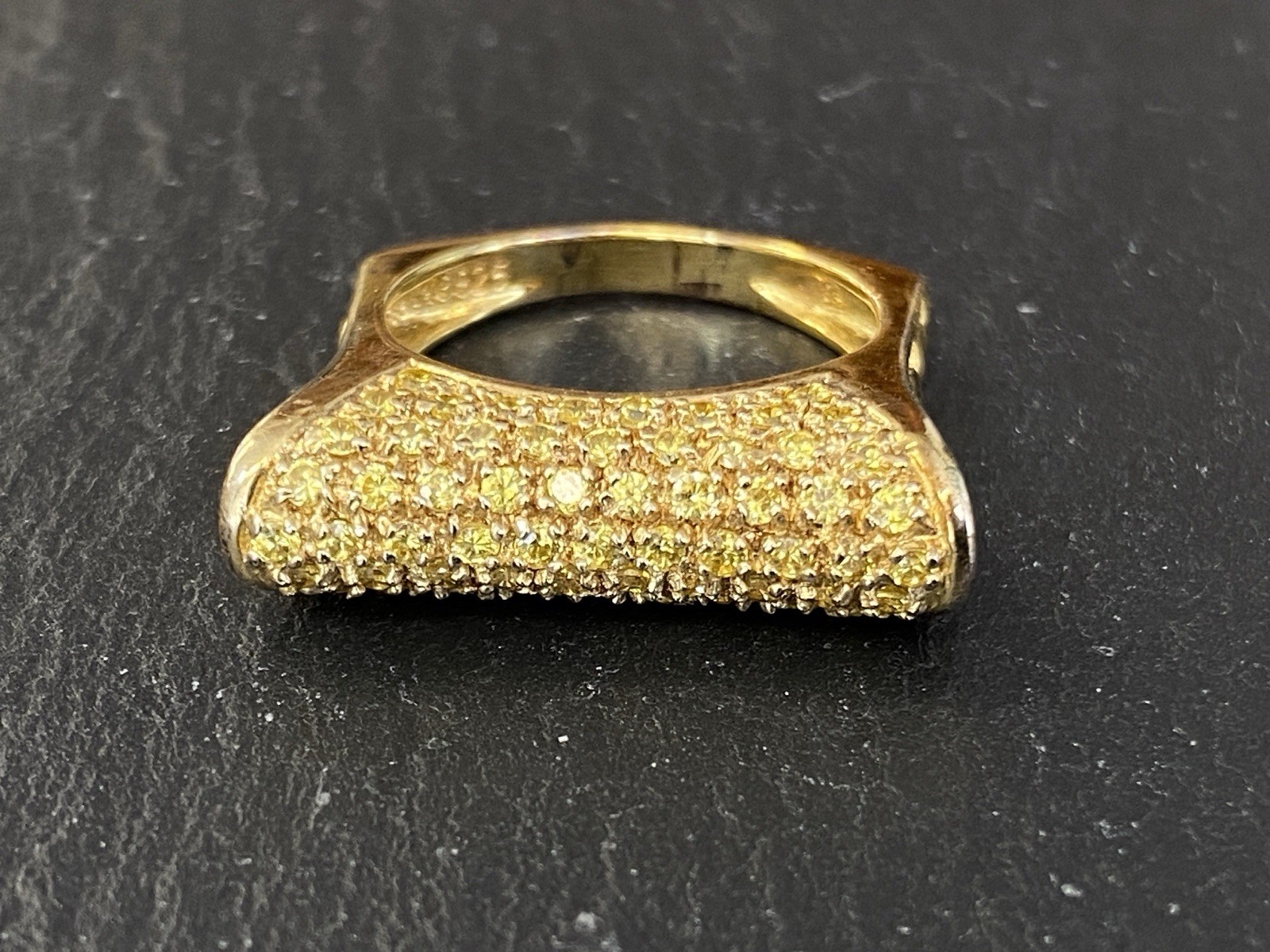 Hoher Ring aus vergoldetem 925 Sterling Silber, gestempelt, mit gelben Glassteinen. Die Steine sind vollständig und intakt, die Oberfläche des Ringes ist stark angelaufen. BTH des Oberteils 2,46/0,6/0,7cm, B/H Ringschiene 0,3/0,1cm, RG 56, Gesamtgewicht ca. 5,72g.