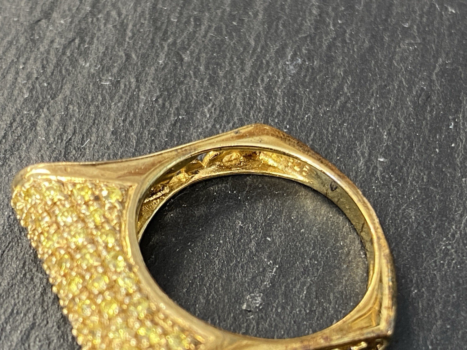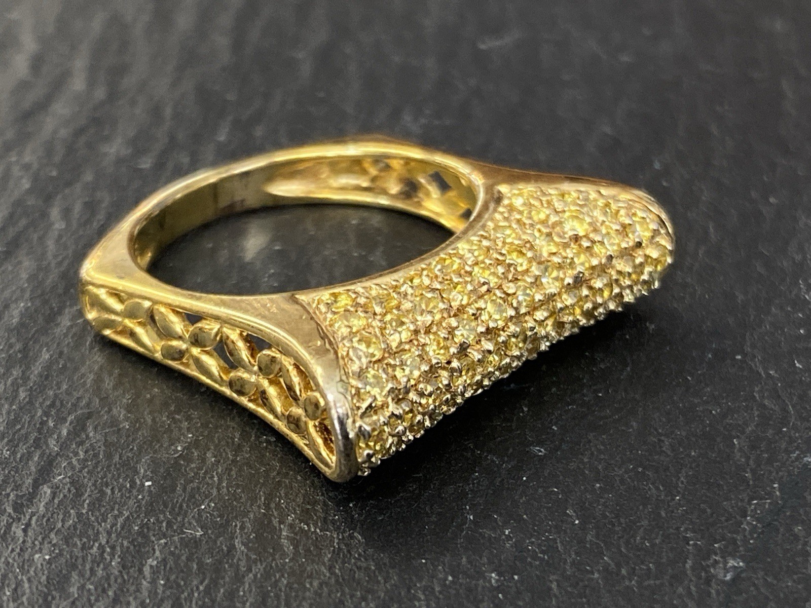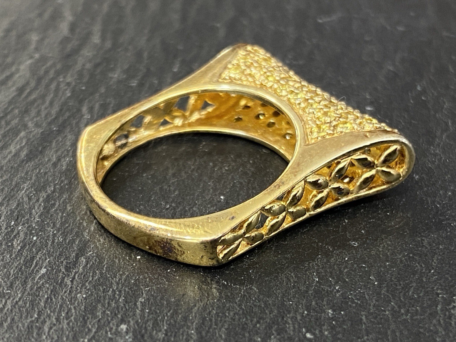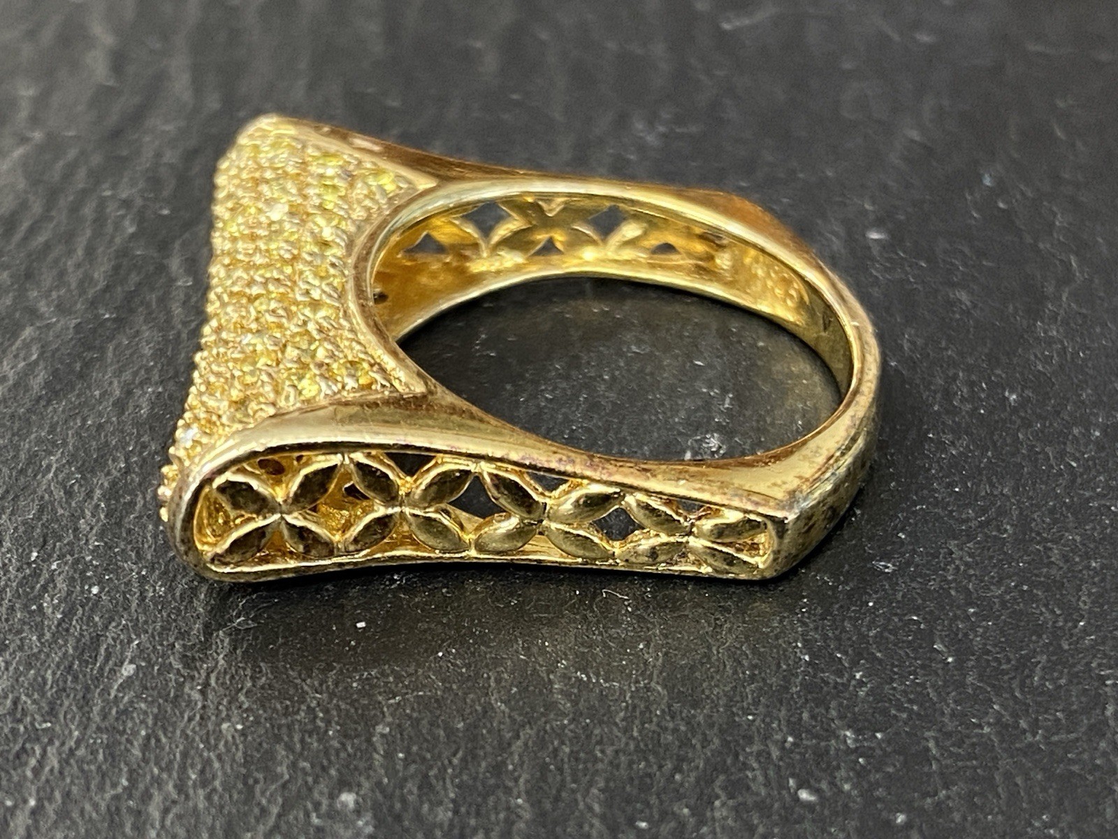 Hoher Ring aus vergoldetem 925 Sterling Silber, gestempelt, mit gelben Glassteinen. Die Steine sind vollständig und intakt, die Oberfläche des Ringes ist stark angelaufen. BTH des Oberteils 2,46/0,6/0,7cm, B/H Ringschiene 0,3/0,1cm, RG 56, Gesamtgewicht ca. 5,72g.