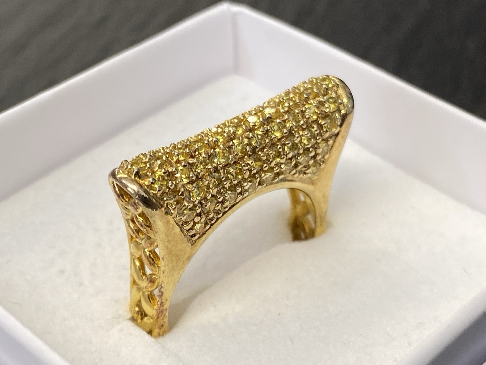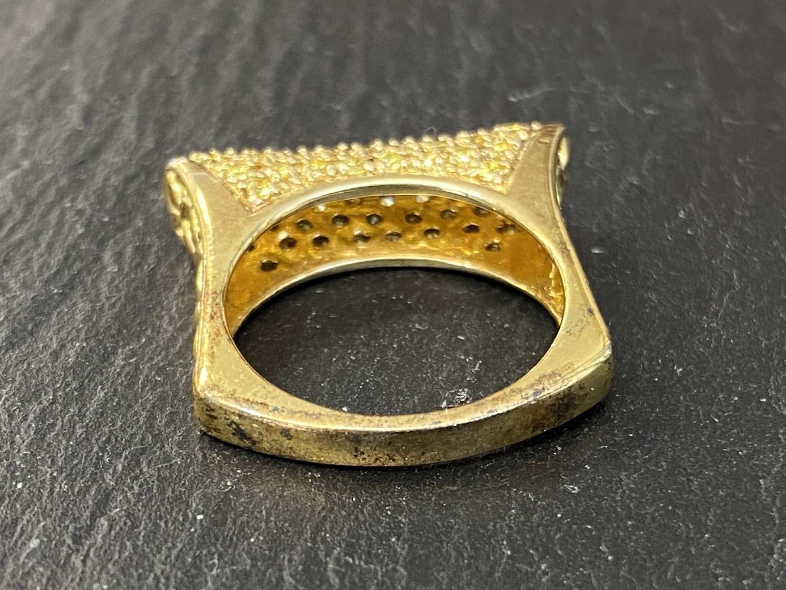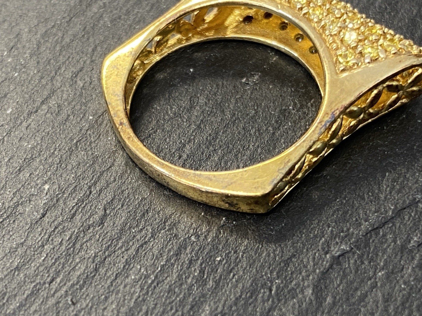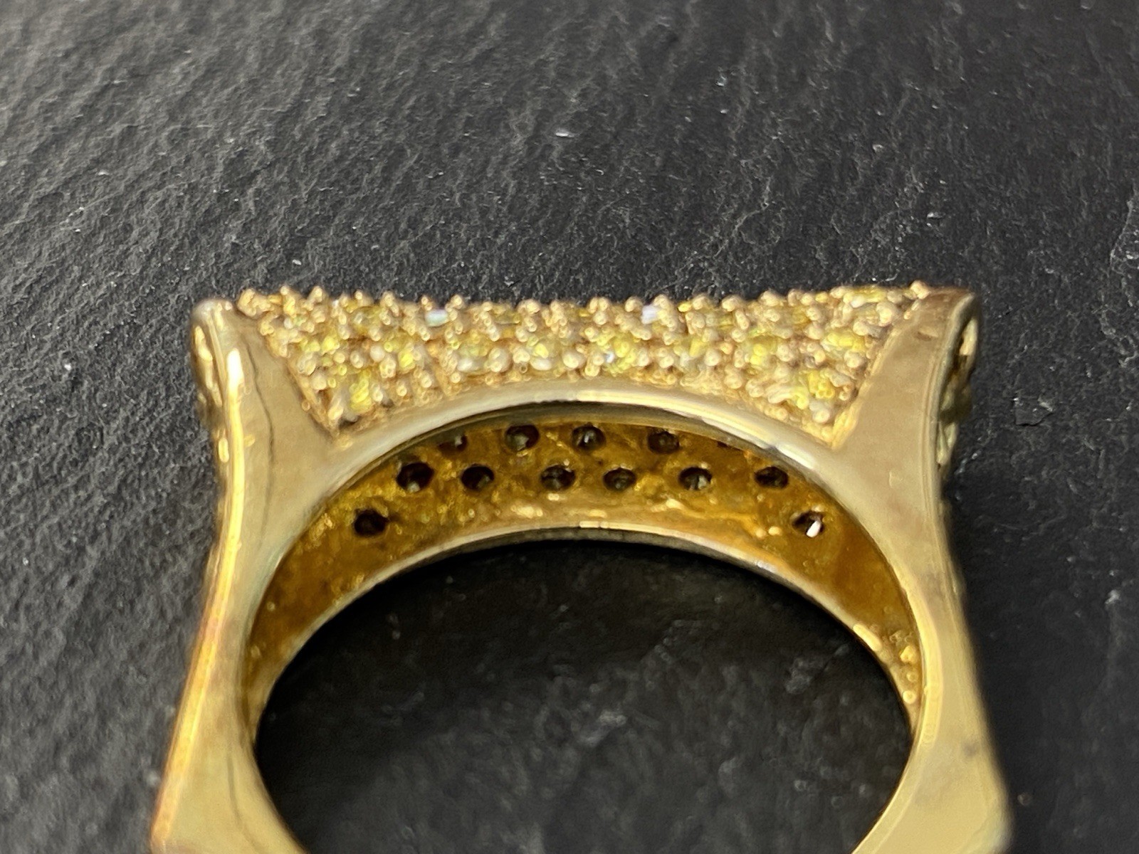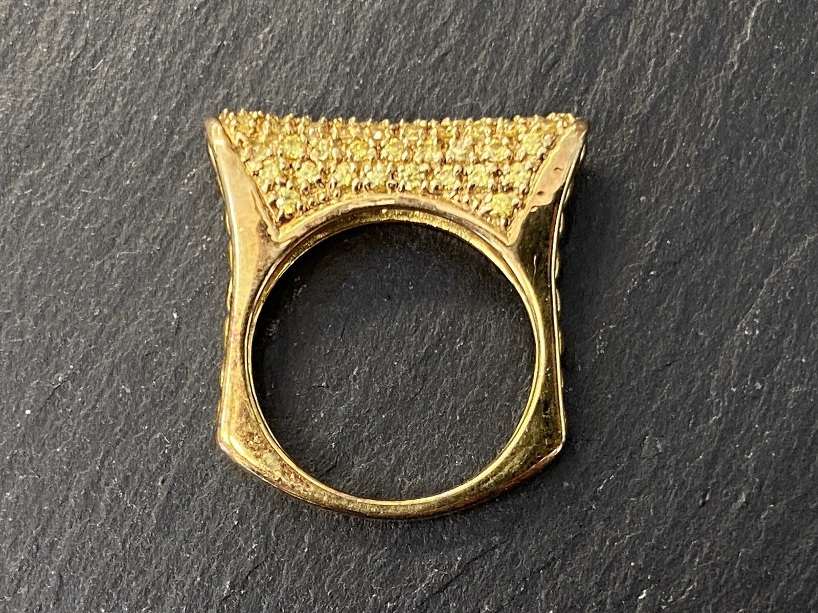 Hoher Ring aus vergoldetem 925 Sterling Silber, gestempelt, mit gelben Glassteinen. Die Steine sind vollständig und intakt, die Oberfläche des Ringes ist stark angelaufen. BTH des Oberteils 2,46/0,6/0,7cm, B/H Ringschiene 0,3/0,1cm, RG 56, Gesamtgewicht ca. 5,72g.