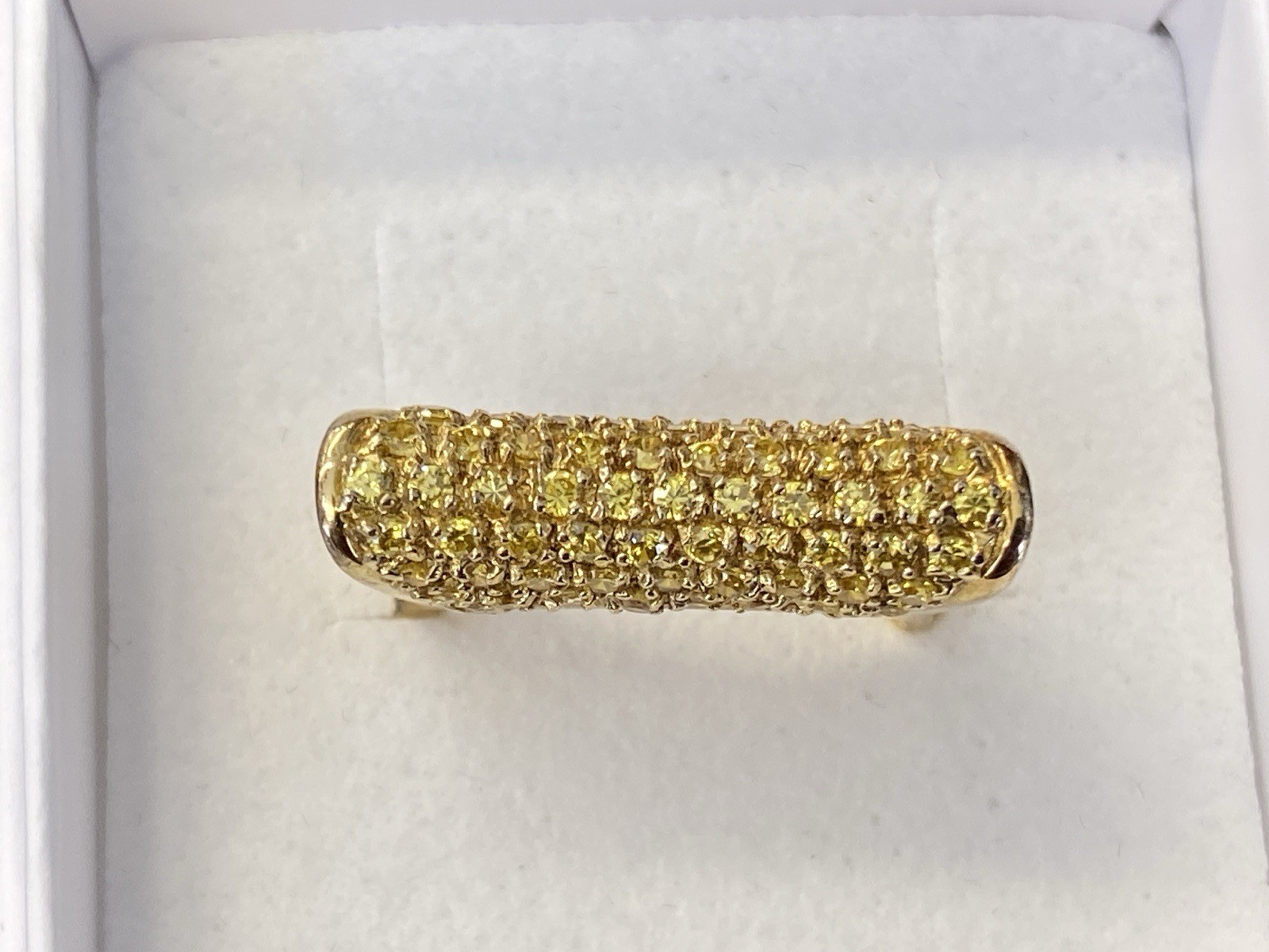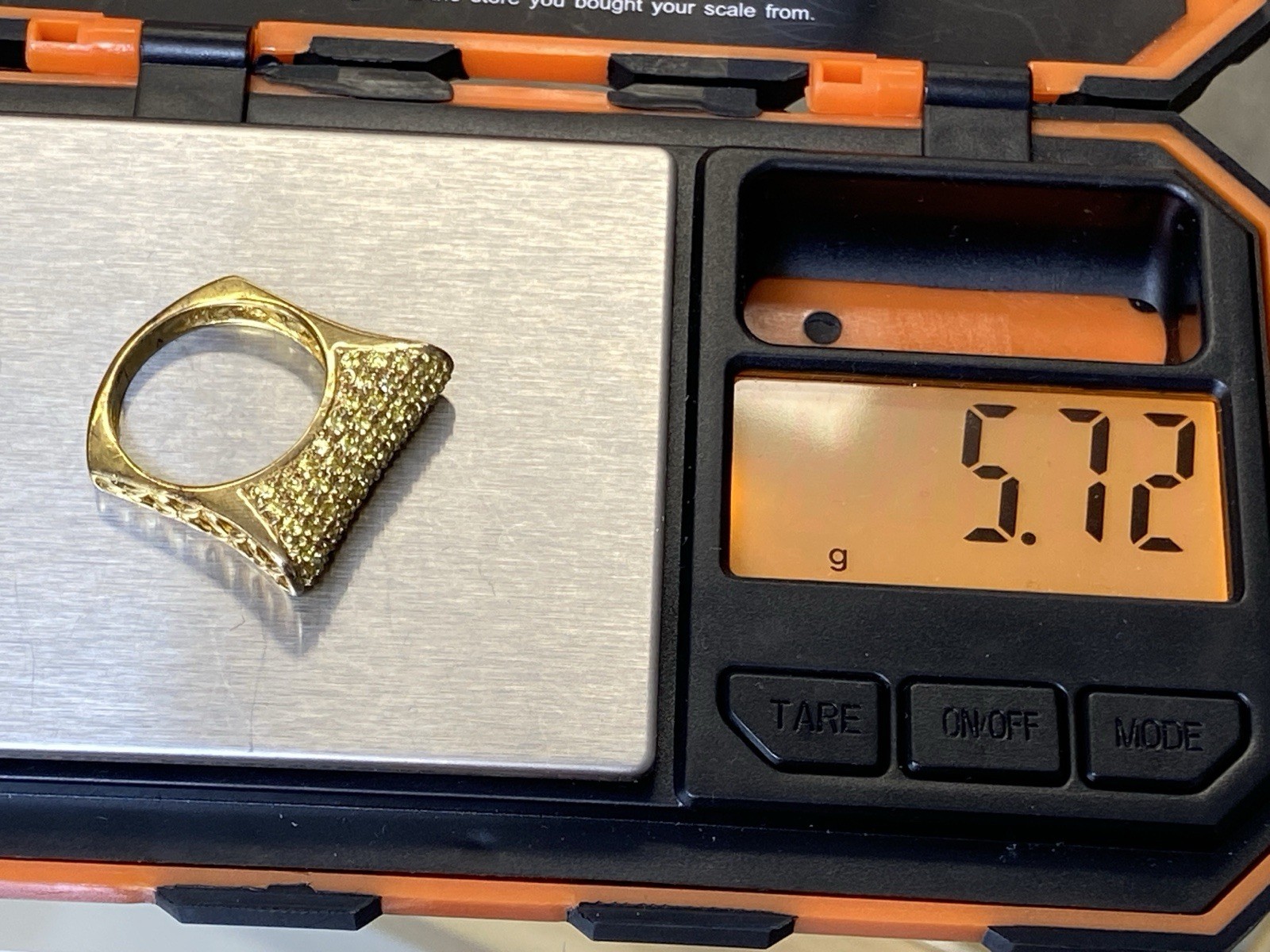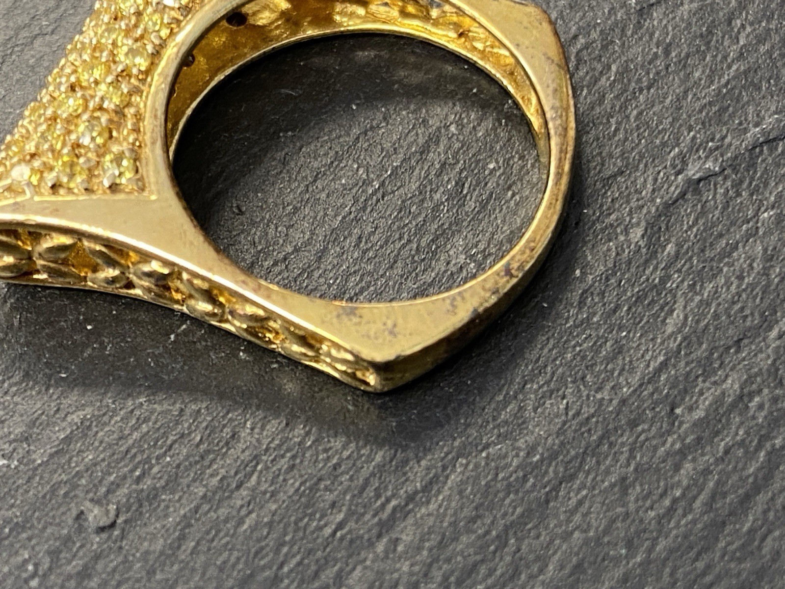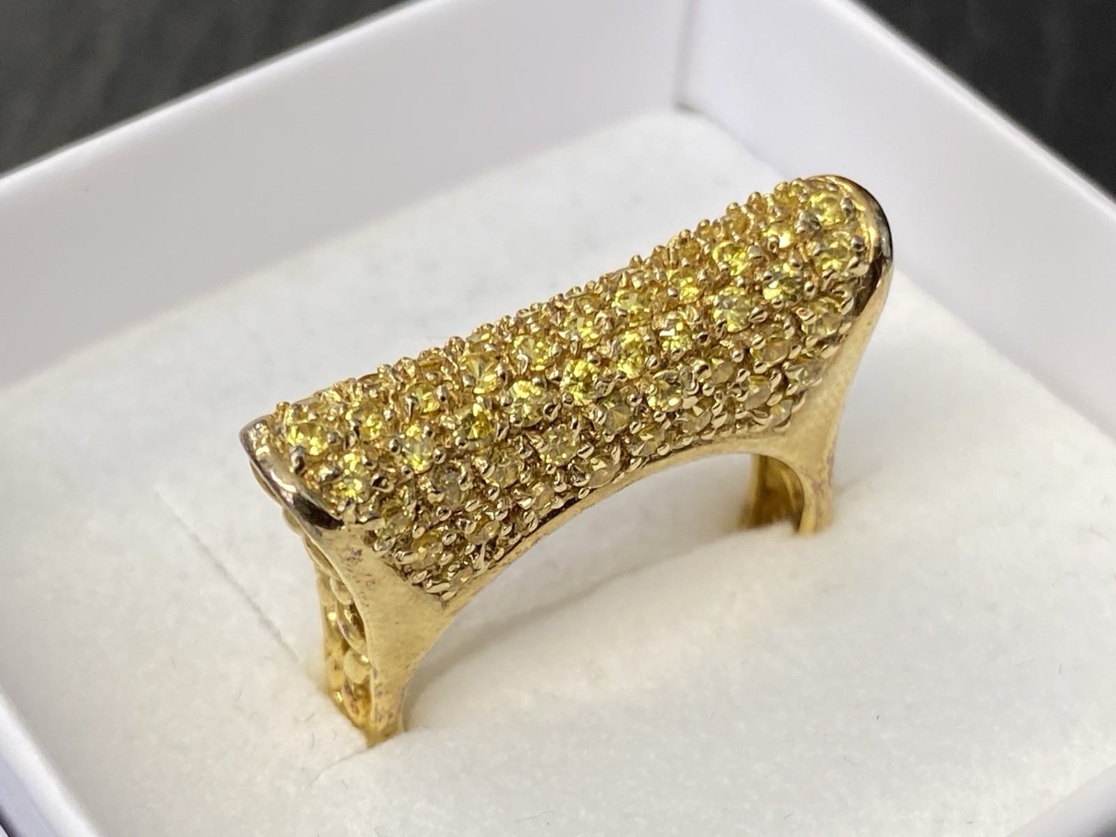 Hoher Ring aus vergoldetem 925 Sterling Silber, gestempelt, mit gelben Glassteinen. Die Steine sind vollständig und intakt, die Oberfläche des Ringes ist stark angelaufen. BTH des Oberteils 2,46/0,6/0,7cm, B/H Ringschiene 0,3/0,1cm, RG 56, Gesamtgewicht ca. 5,72g.