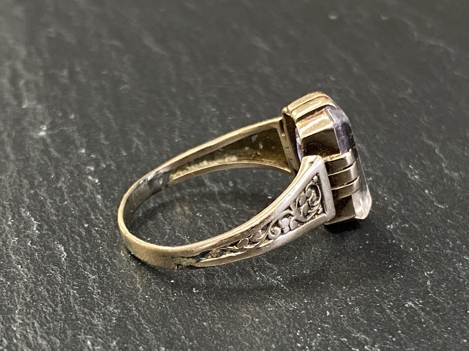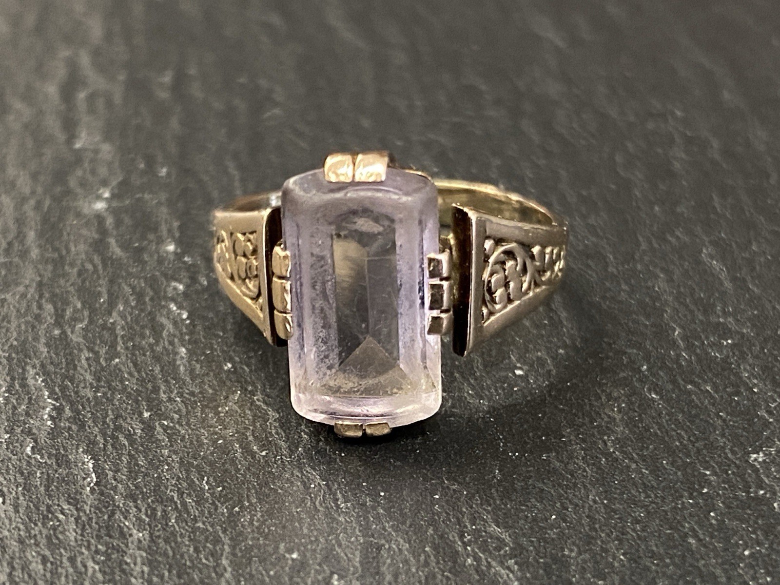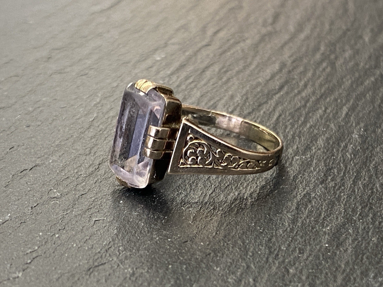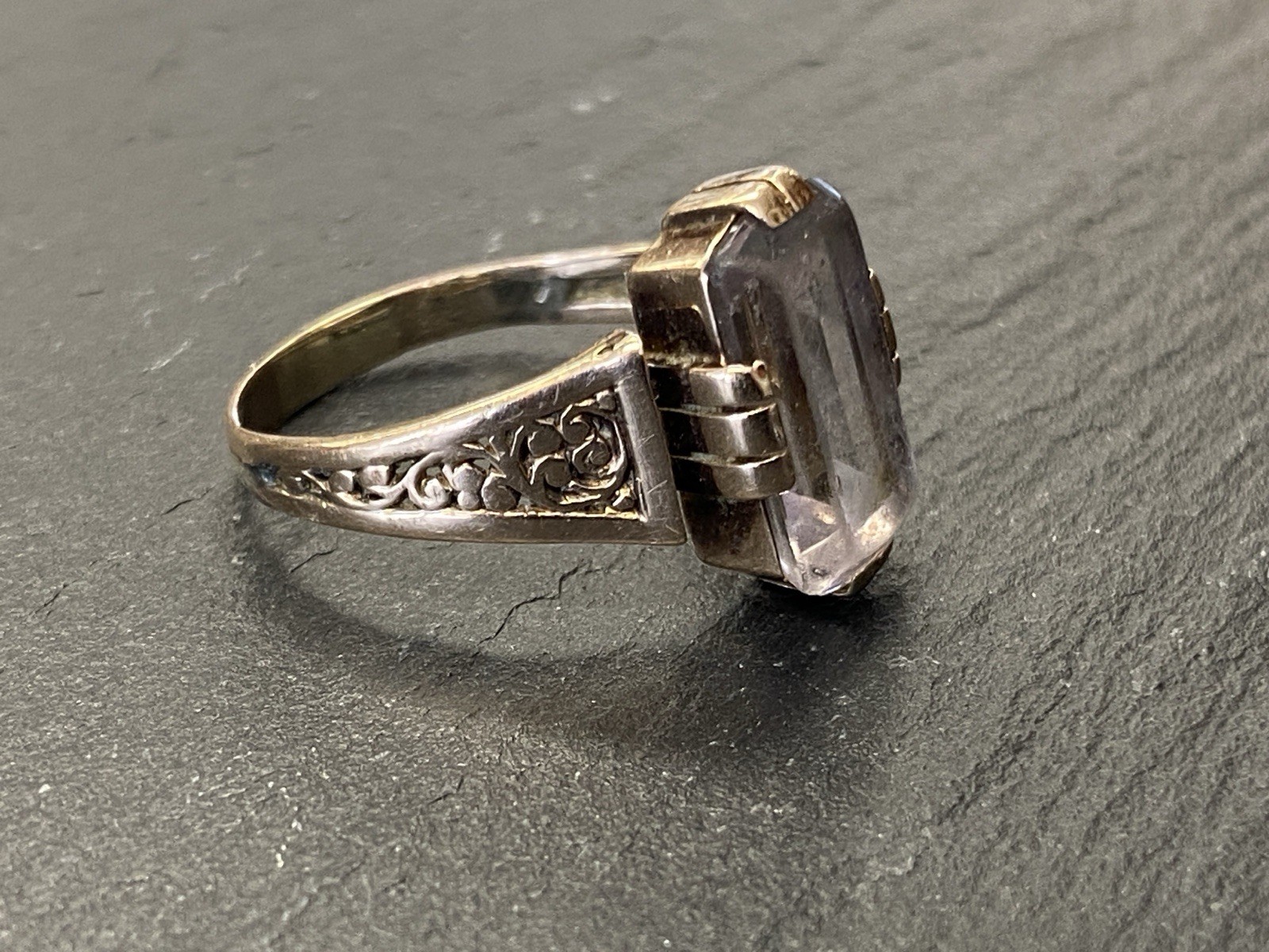 Alter Ring, ungestempelt, mit farblosen Bergkristall als Hauptstein. Zum Stein hin ist der Ring mit filigranem Blumendekor versehen. Der Stein ist stark bestoßen und zerkratzt, die restliche Oberfläche ebenfalls. Stellenweise Oxydation, RG 60. BTH des Oberteils 1/0,56/1,5cm, B/H der Ringschiene 0,3/0,1cm, Gesamtgewicht ca. 4,10g. Die Begutachtung der Stücke wird vorgenommen von einem Fachmitglied der deutschen gemmologischen Gesellschaft E.V. Ein Schmuckpass wird mitgeliefert.