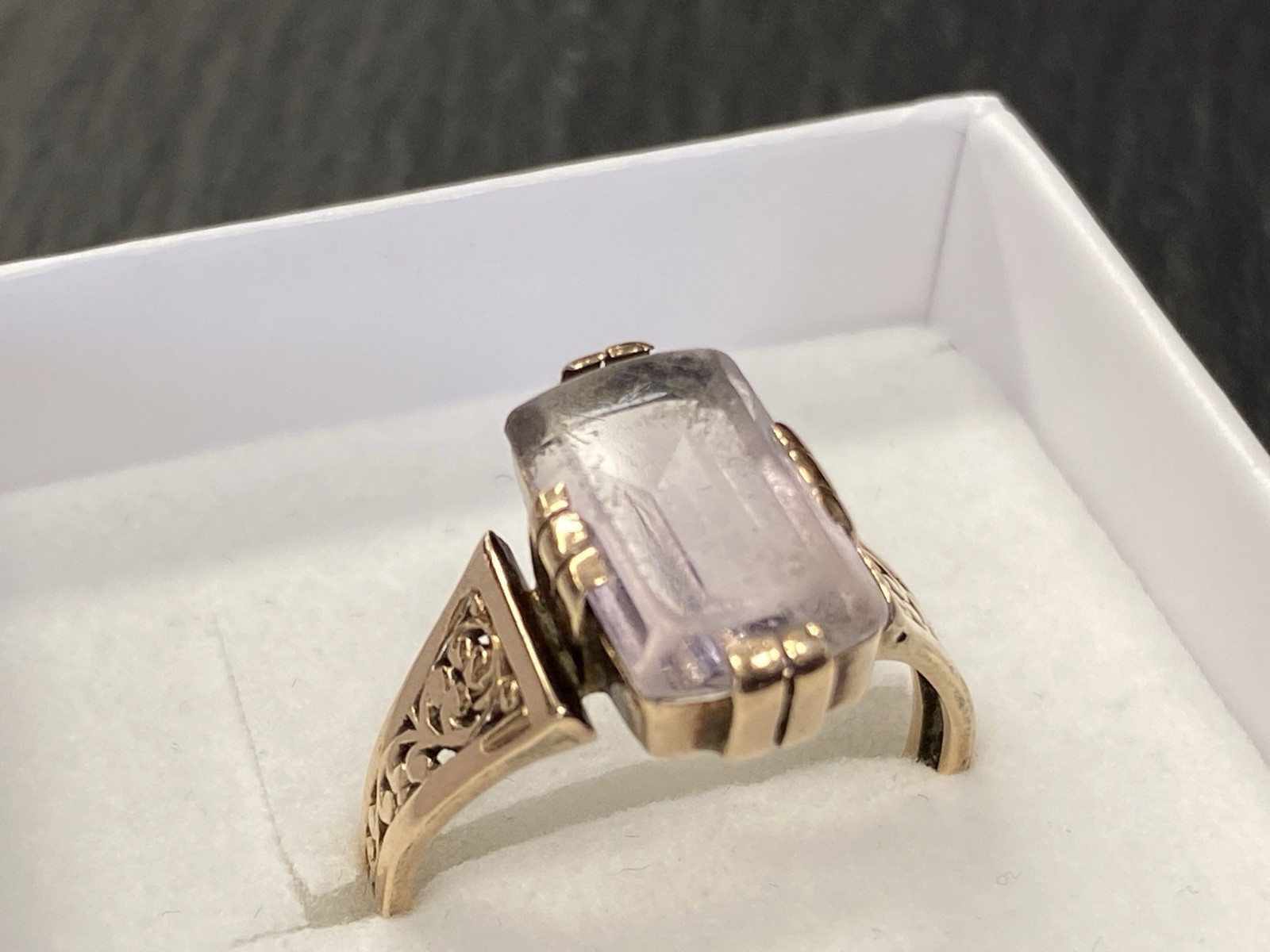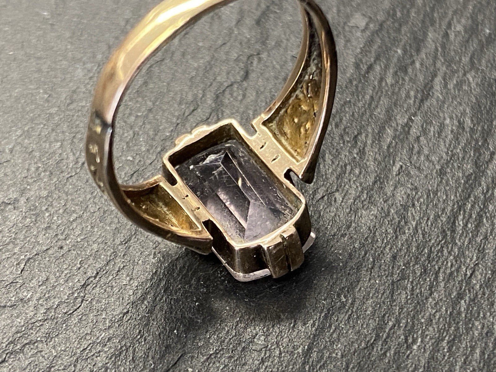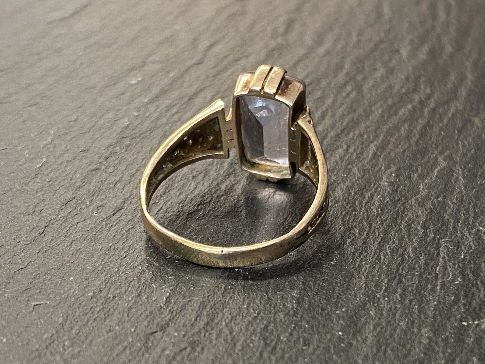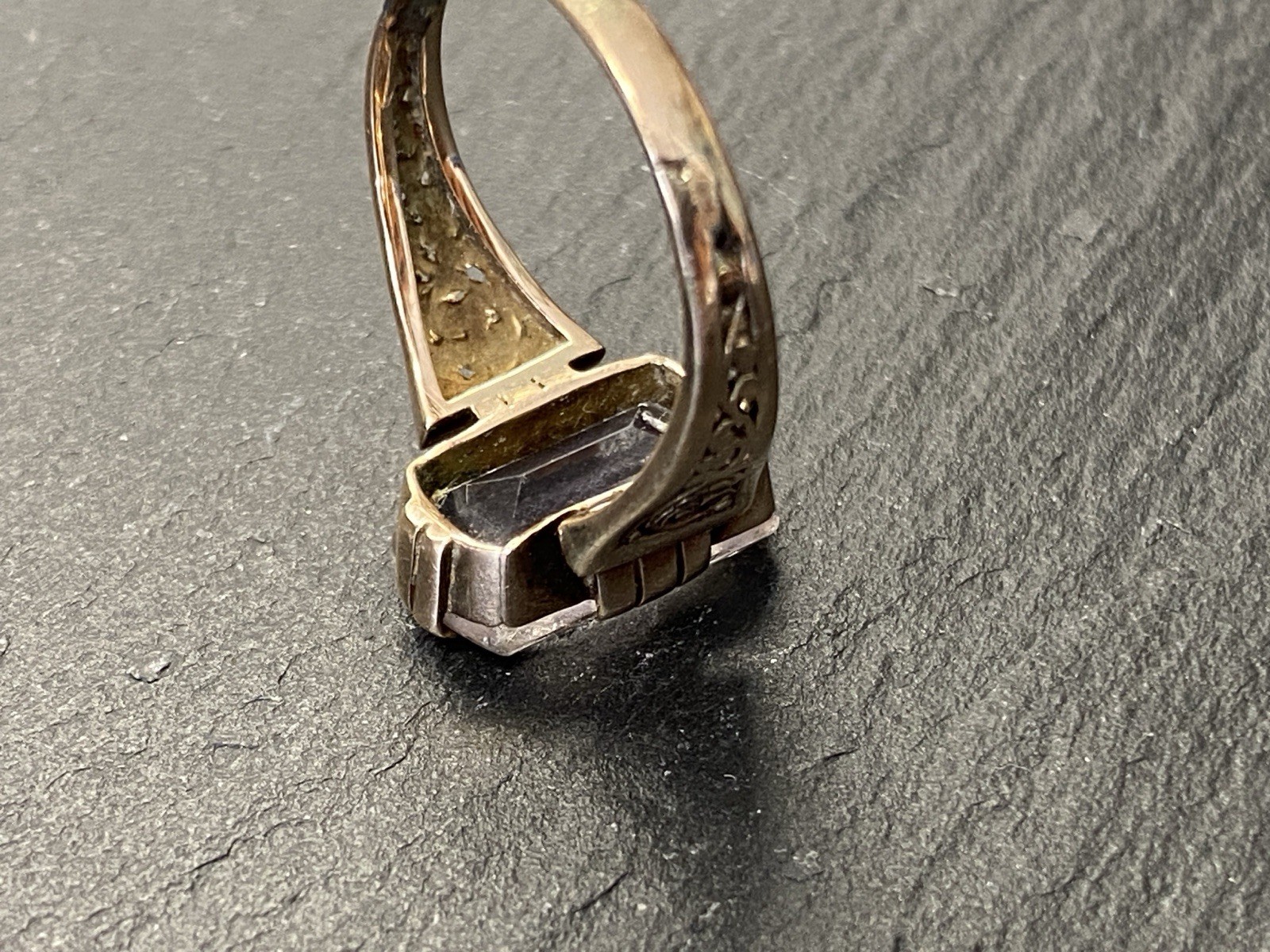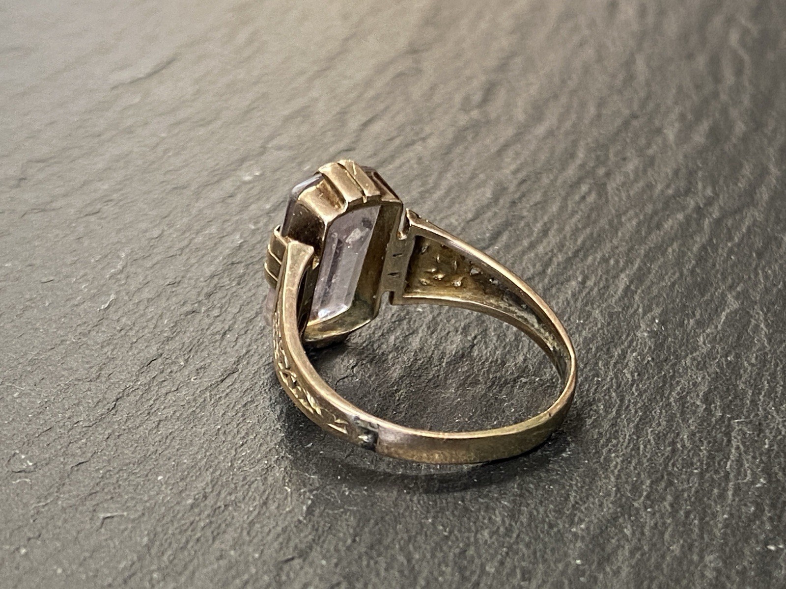 Alter Ring, ungestempelt, mit farblosen Bergkristall als Hauptstein. Zum Stein hin ist der Ring mit filigranem Blumendekor versehen. Der Stein ist stark bestoßen und zerkratzt, die restliche Oberfläche ebenfalls. Stellenweise Oxydation, RG 60. BTH des Oberteils 1/0,56/1,5cm, B/H der Ringschiene 0,3/0,1cm, Gesamtgewicht ca. 4,10g. Die Begutachtung der Stücke wird vorgenommen von einem Fachmitglied der deutschen gemmologischen Gesellschaft E.V. Ein Schmuckpass wird mitgeliefert.