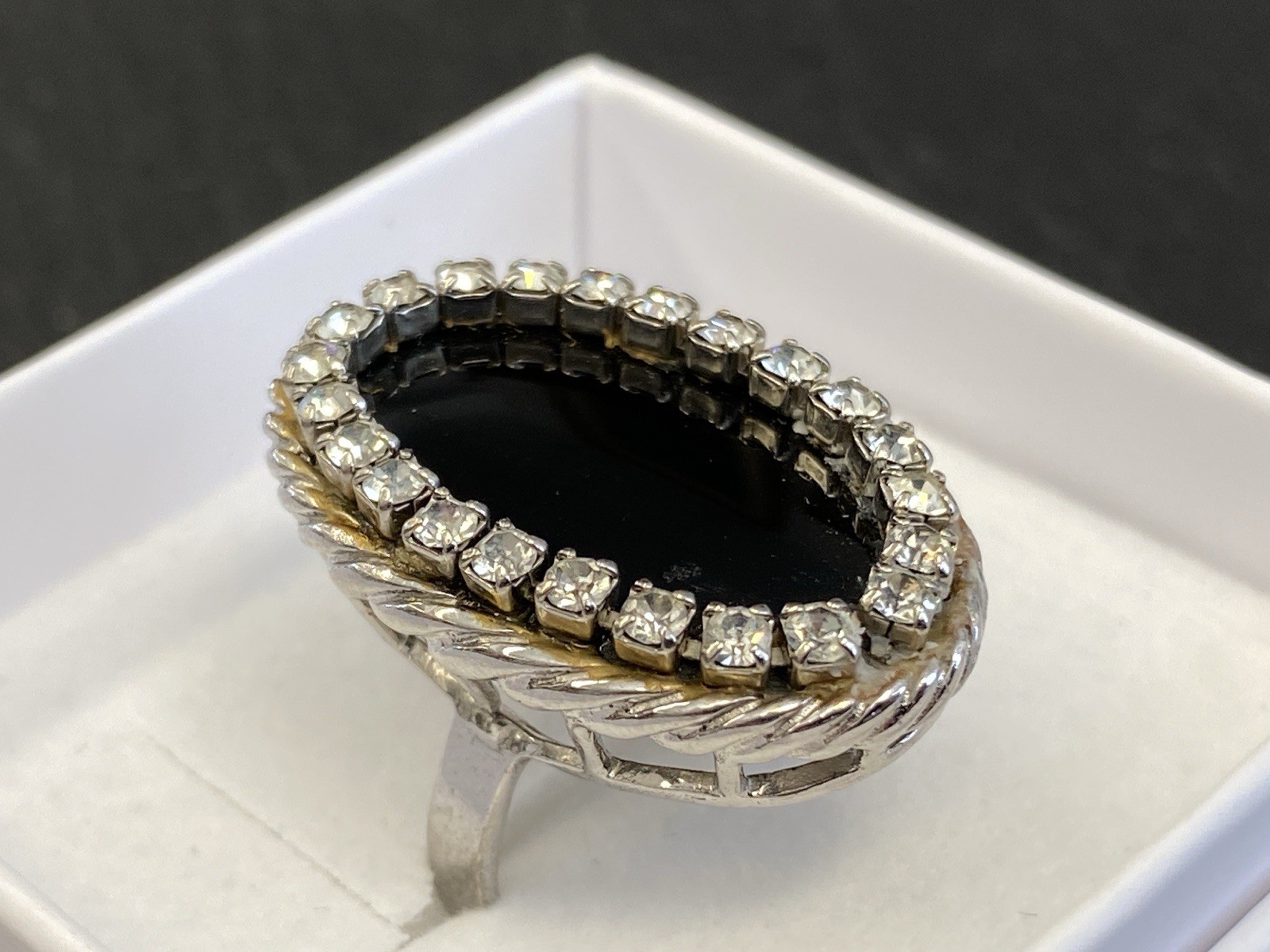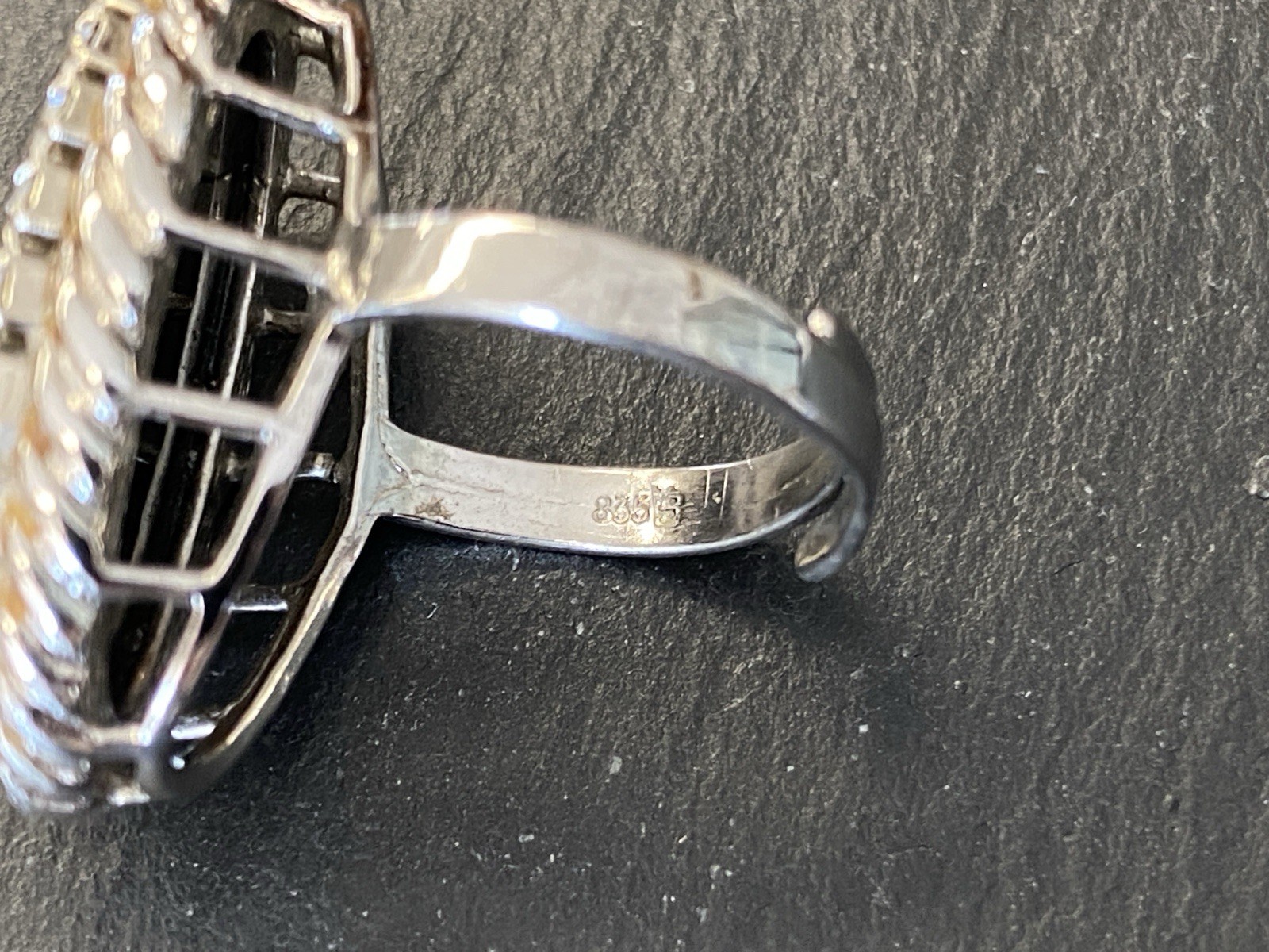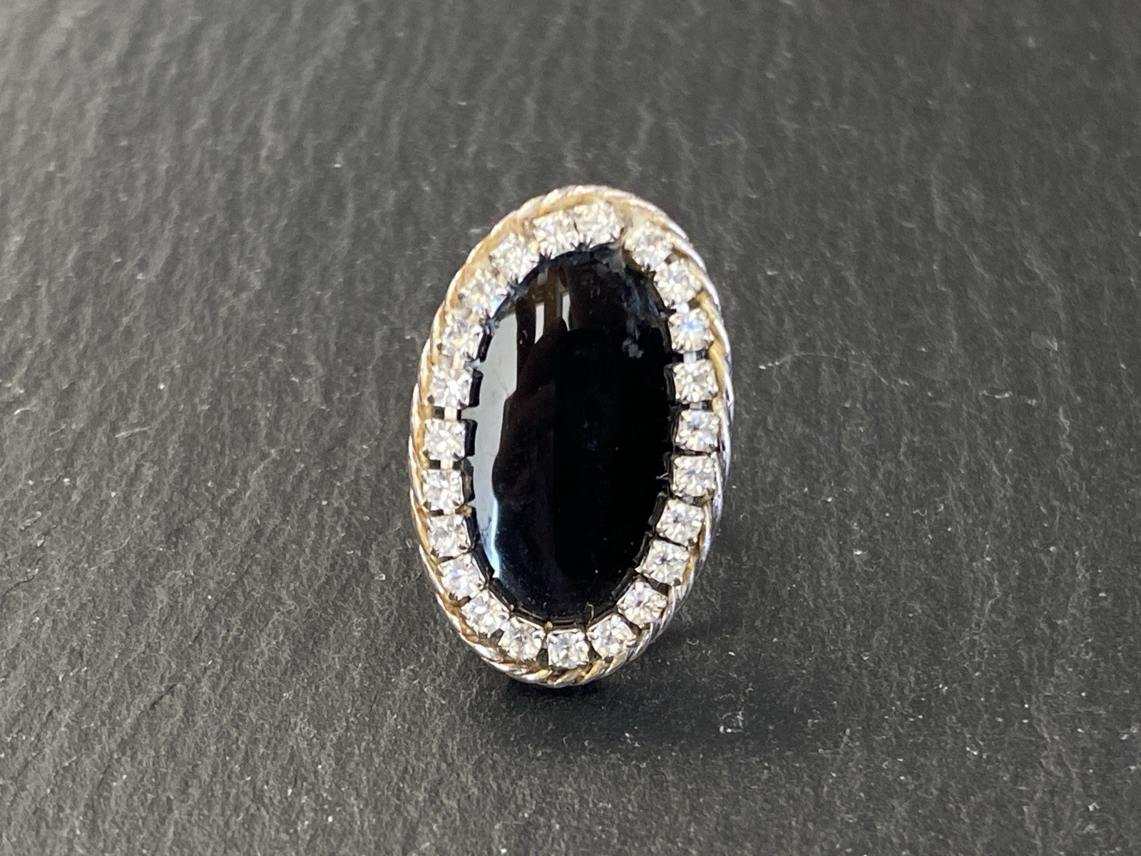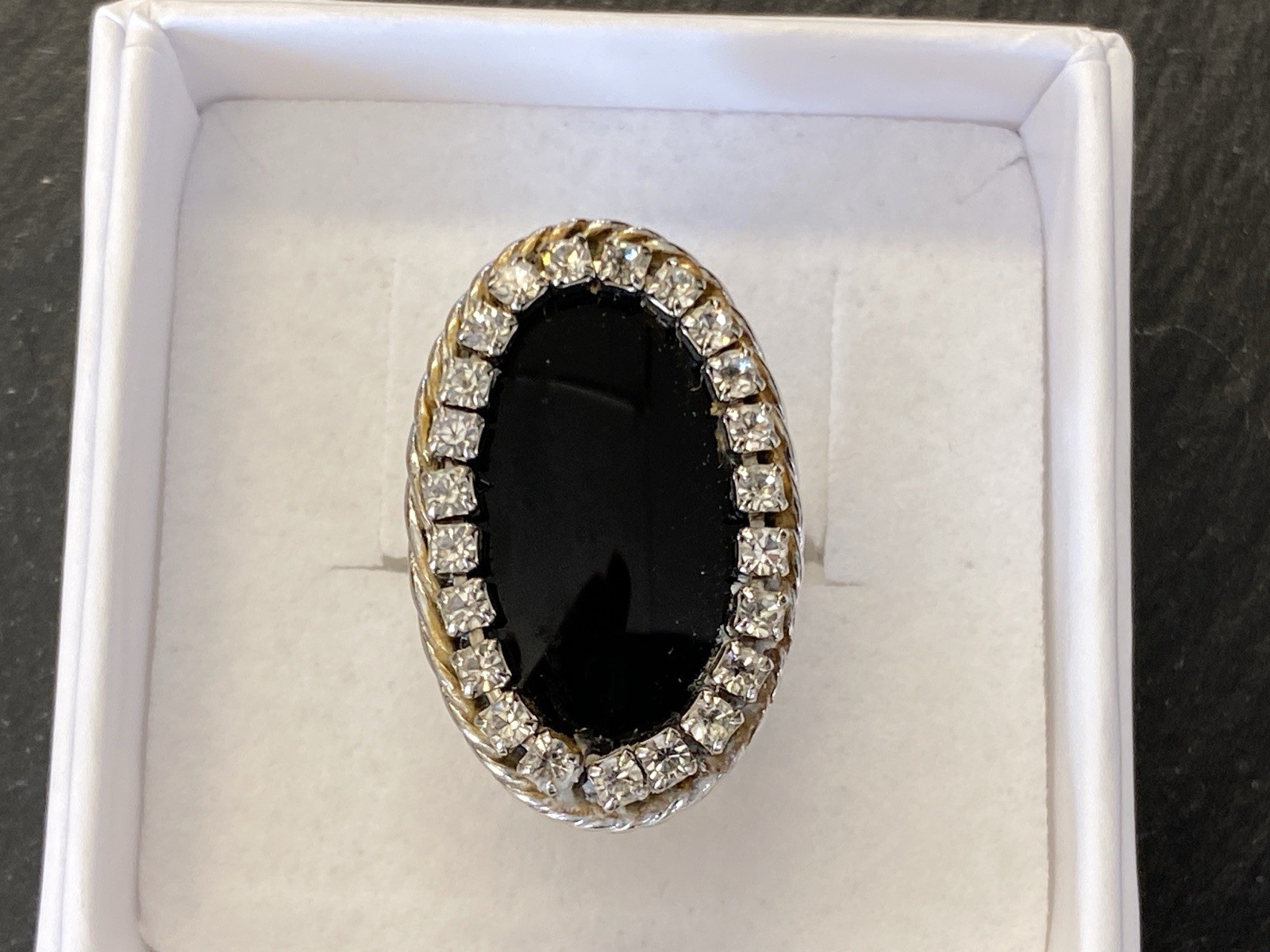 Ovaler Ring aus 835 Silber, gestempelt, mit Onyx und farblosen Glassteinen. Die Glassteine sind samt Fassung auf den Onyx geklebt worden, stellenweise löst sich dieser Kleber. Klebereste sichtbar. Die Steine sind vollständig, die Oberfläche berieben. Der Ring ist Größenverstellbar, aktuell hat er RG 54. BTH Mittelteil 1,8/0,65/2,8cm, B/H Ringschiene 0,5/0,1cm, Gesamtgewicht ca. 7,00g.