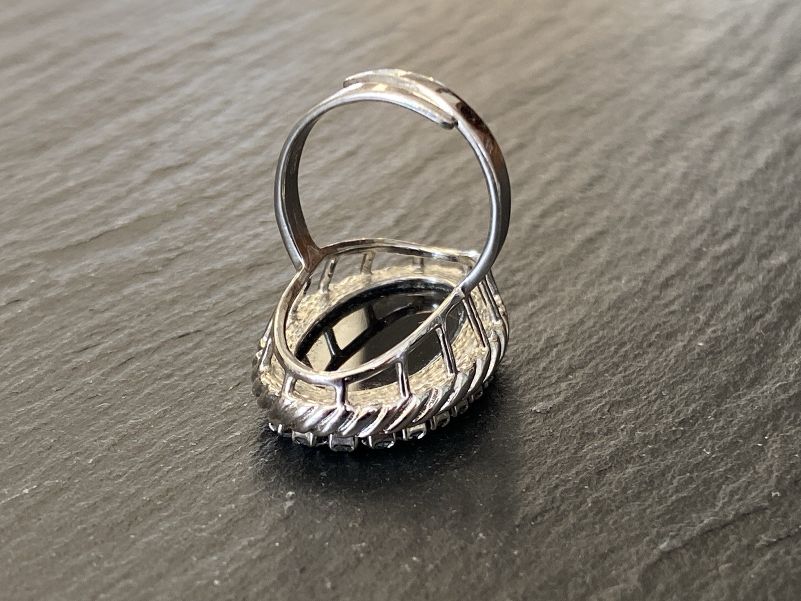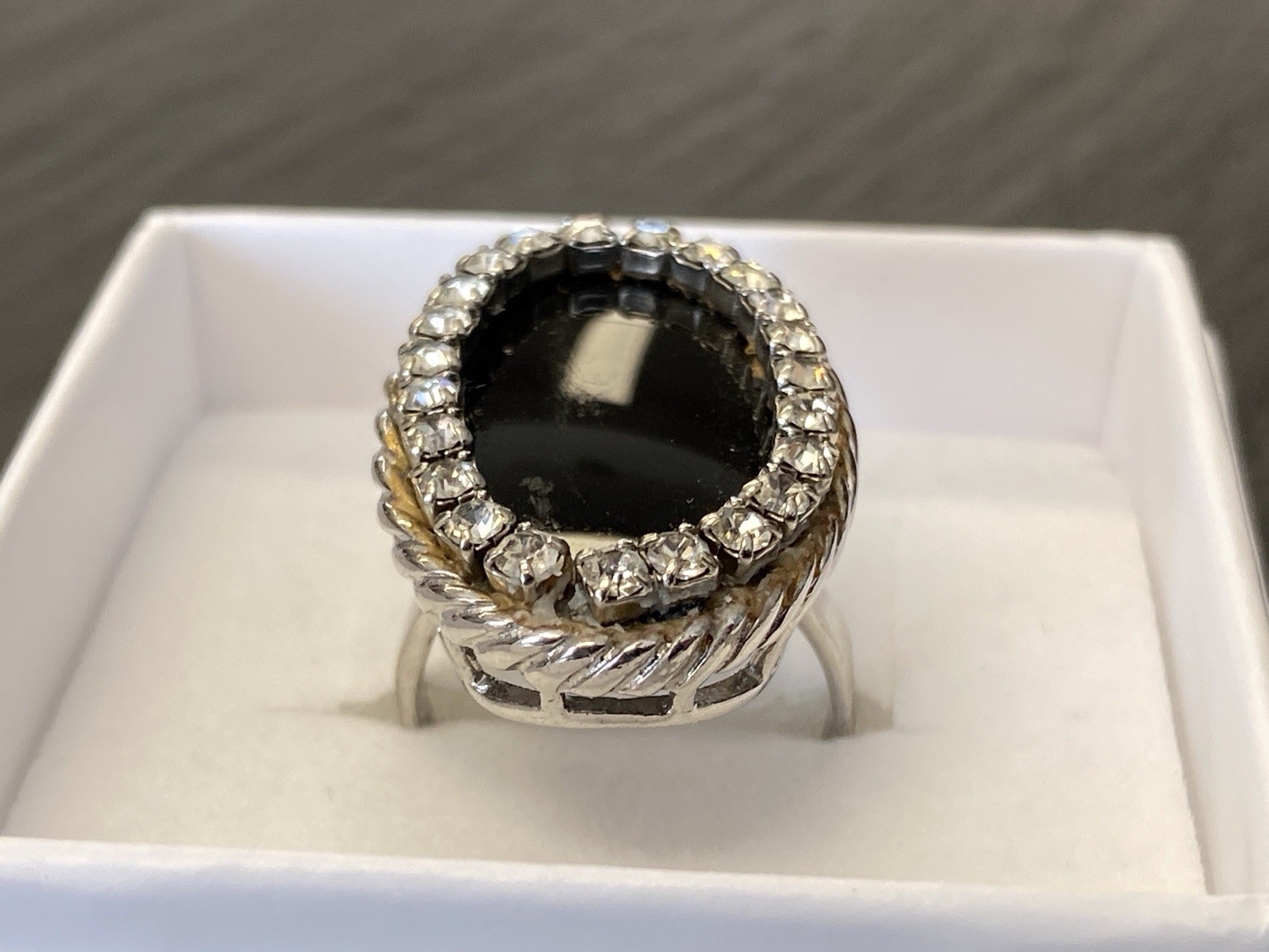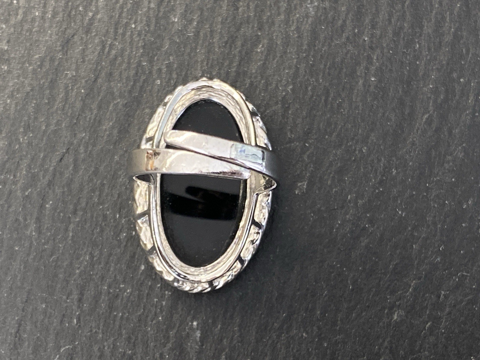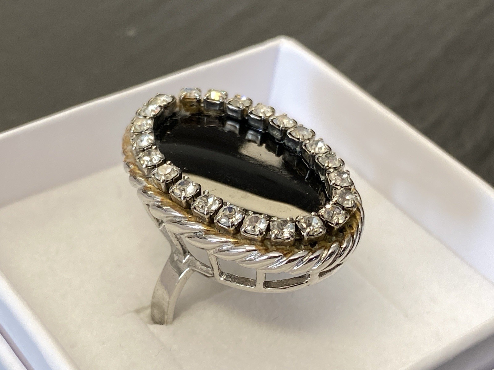 Ovaler Ring aus 835 Silber, gestempelt, mit Onyx und farblosen Glassteinen. Die Glassteine sind samt Fassung auf den Onyx geklebt worden, stellenweise löst sich dieser Kleber. Klebereste sichtbar. Die Steine sind vollständig, die Oberfläche berieben. Der Ring ist Größenverstellbar, aktuell hat er RG 54. BTH Mittelteil 1,8/0,65/2,8cm, B/H Ringschiene 0,5/0,1cm, Gesamtgewicht ca. 7,00g.