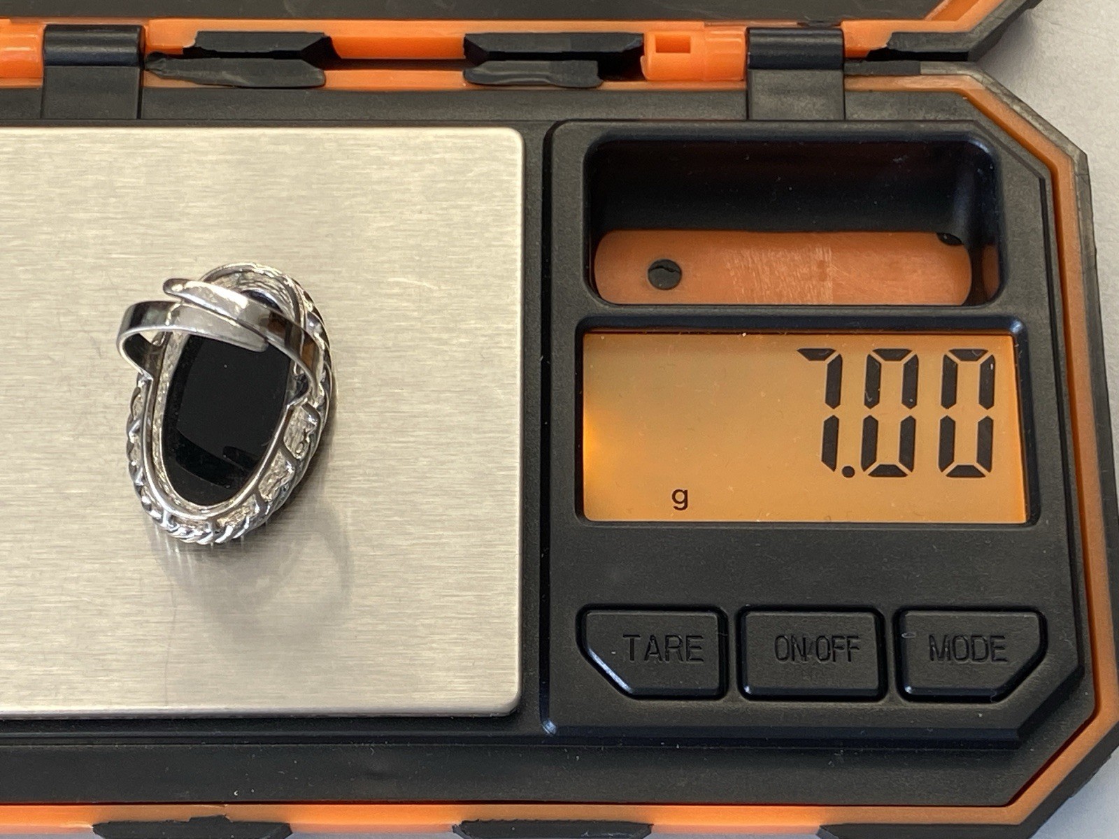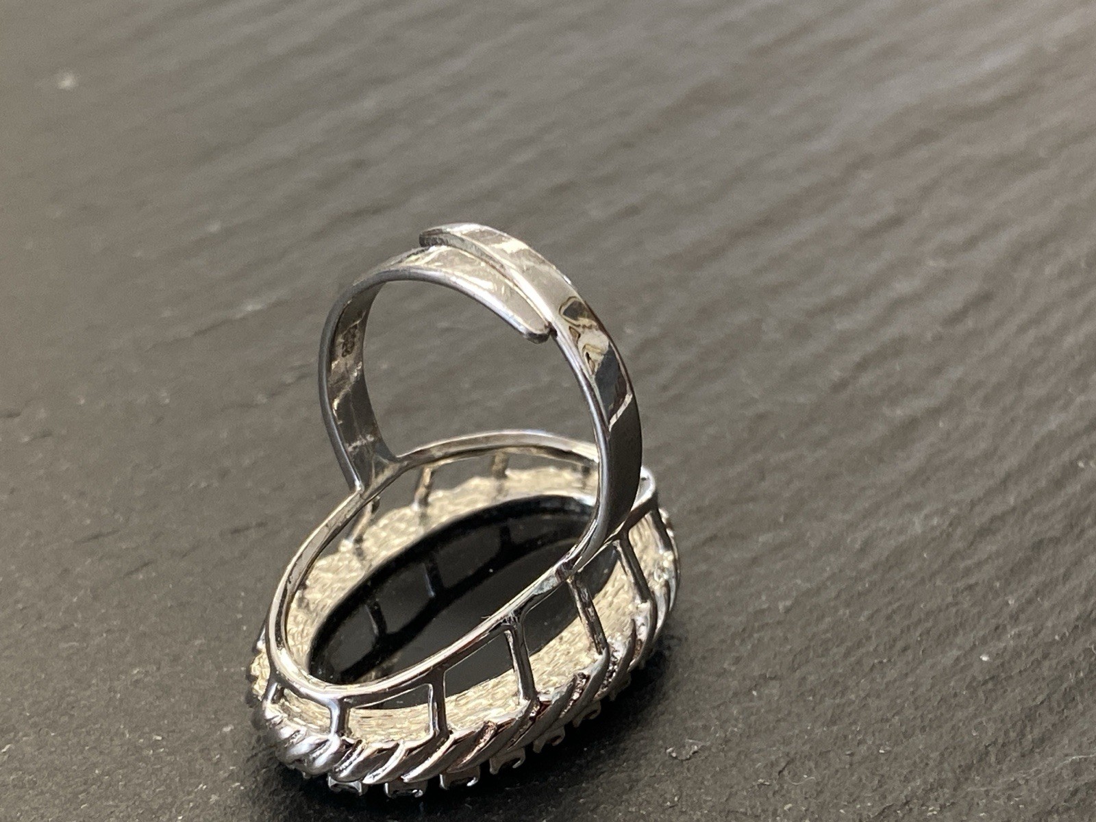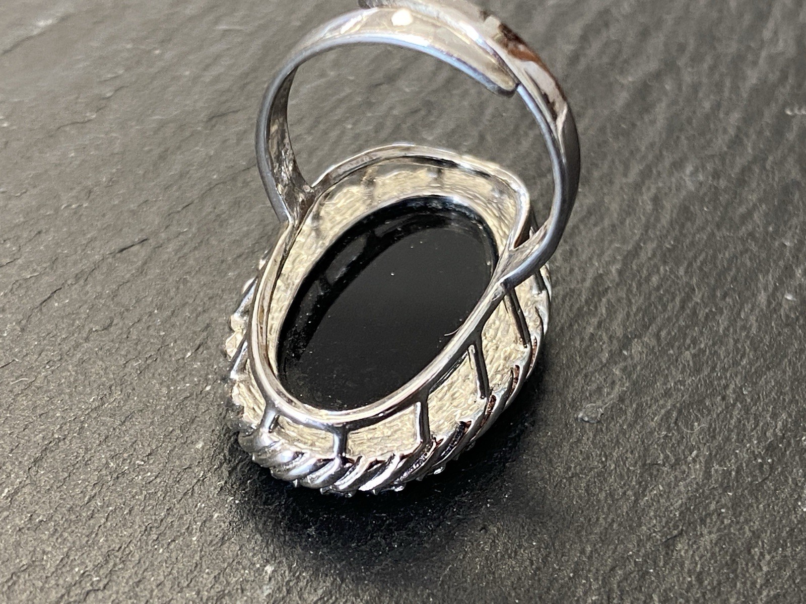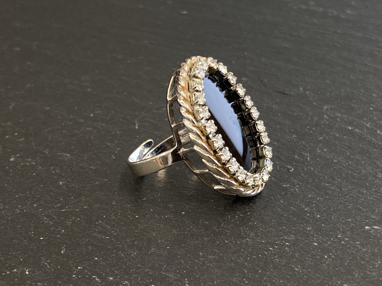Ovaler Ring aus 835 Silber, gestempelt, mit Onyx und farblosen Glassteinen. Die Glassteine sind samt Fassung auf den Onyx geklebt worden, stellenweise löst sich dieser Kleber. Klebereste sichtbar. Die Steine sind vollständig, die Oberfläche berieben. Der Ring ist Größenverstellbar, aktuell hat er RG 54. BTH Mittelteil 1,8/0,65/2,8cm, B/H Ringschiene 0,5/0,1cm, Gesamtgewicht ca. 7,00g.