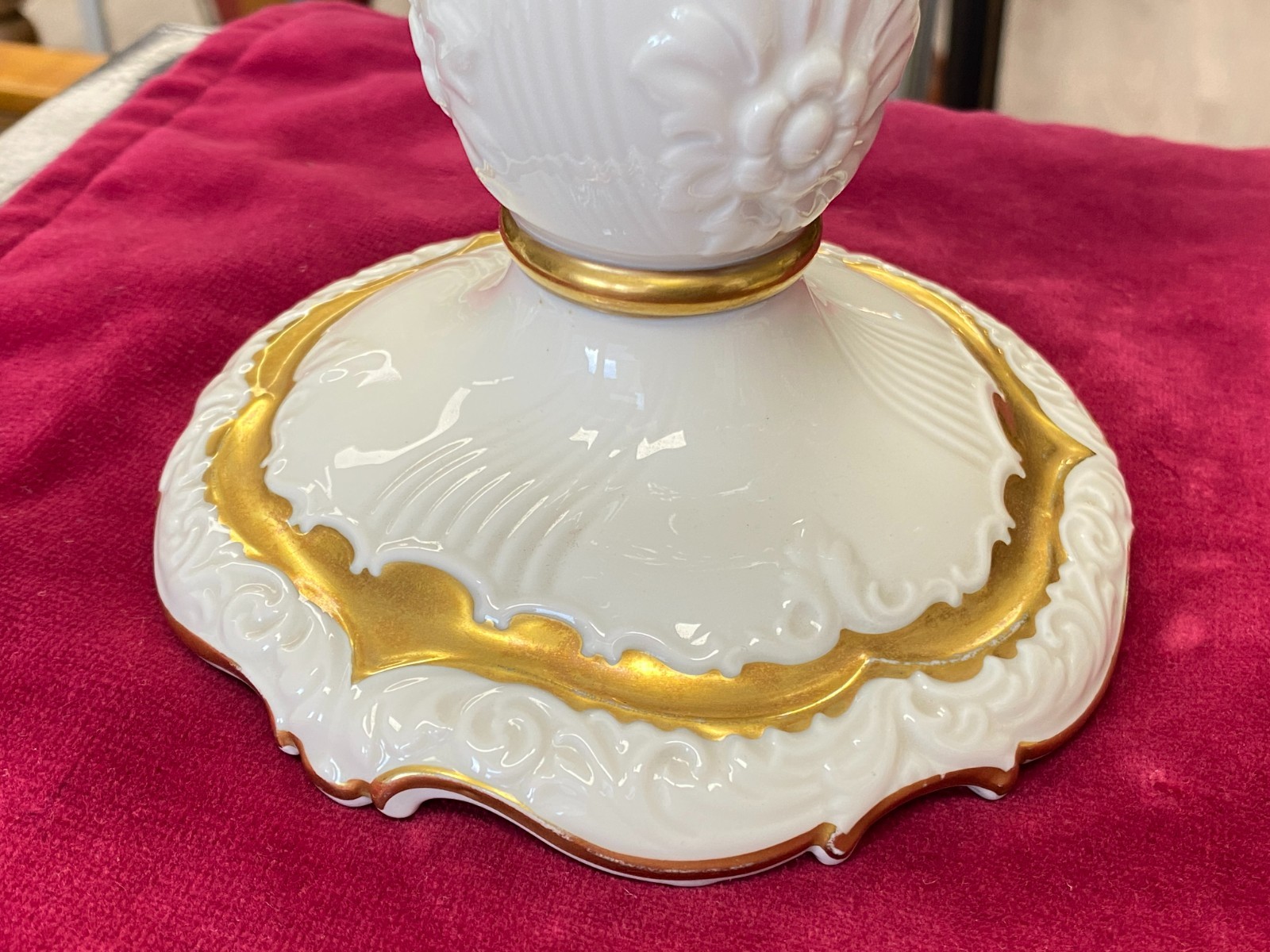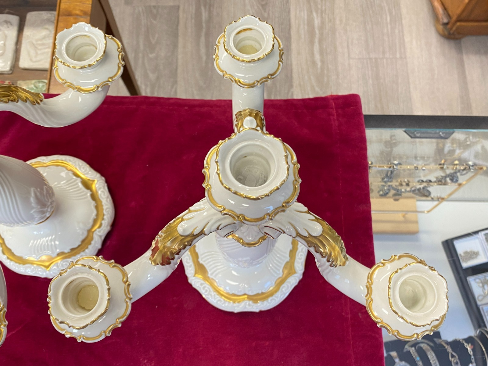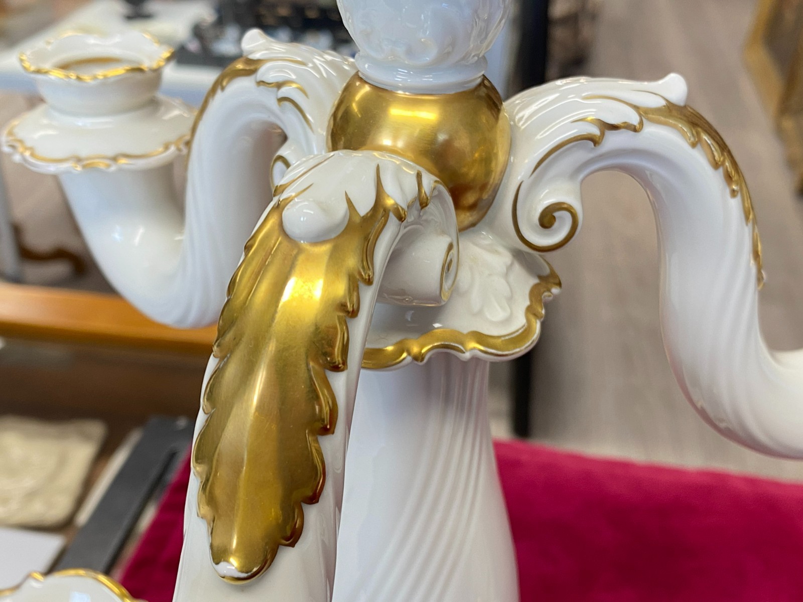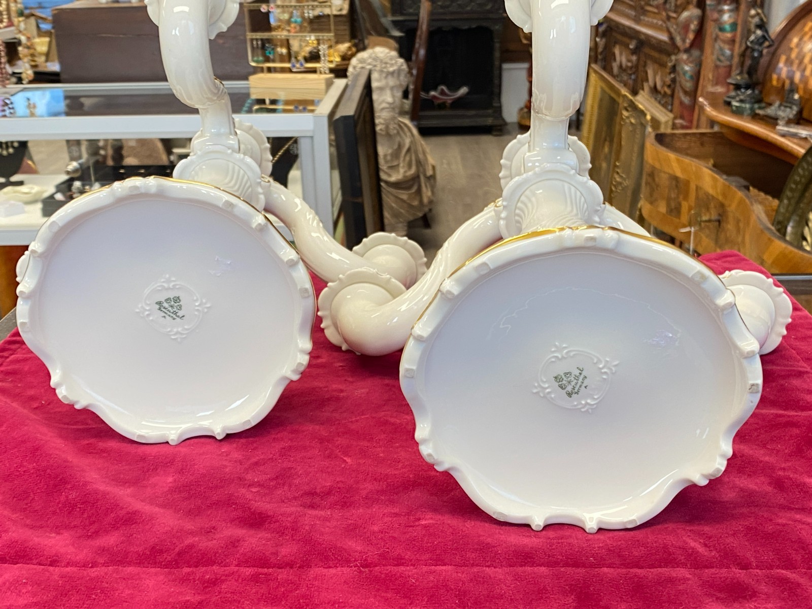 Paar dreiarmige Vintage Kerzenleuchter von der Manufaktur Rosenthal mit schöner Vergoldung. Die Vergoldung ist stellenweise berieben, wir konnten keine Chips oder Risse erkennen. Minimale Brandfehler. Den genauen Zustand entnehmen Sie bitte den Produktbildern. Gesamthöhe ca. 29cm, Durchmesser der Bodenplatte ca. 14cm, Länge der Arme ca. 14,5cm. Lieferung ohne Kerzen. Gerne würden wir hier aus Sicherheitsgründen auf den Postversand verzichten und bieten die Möglichkeit einer Abholung oder der Lieferung per Spediteur an.