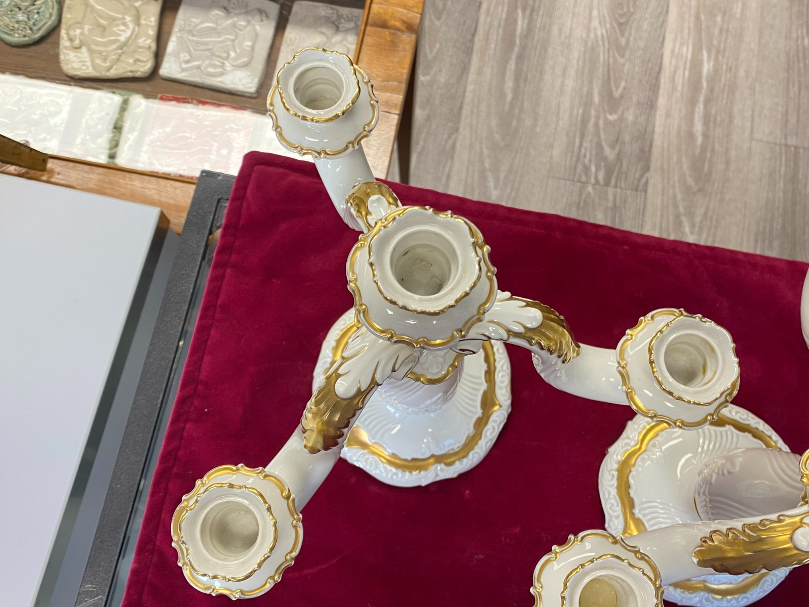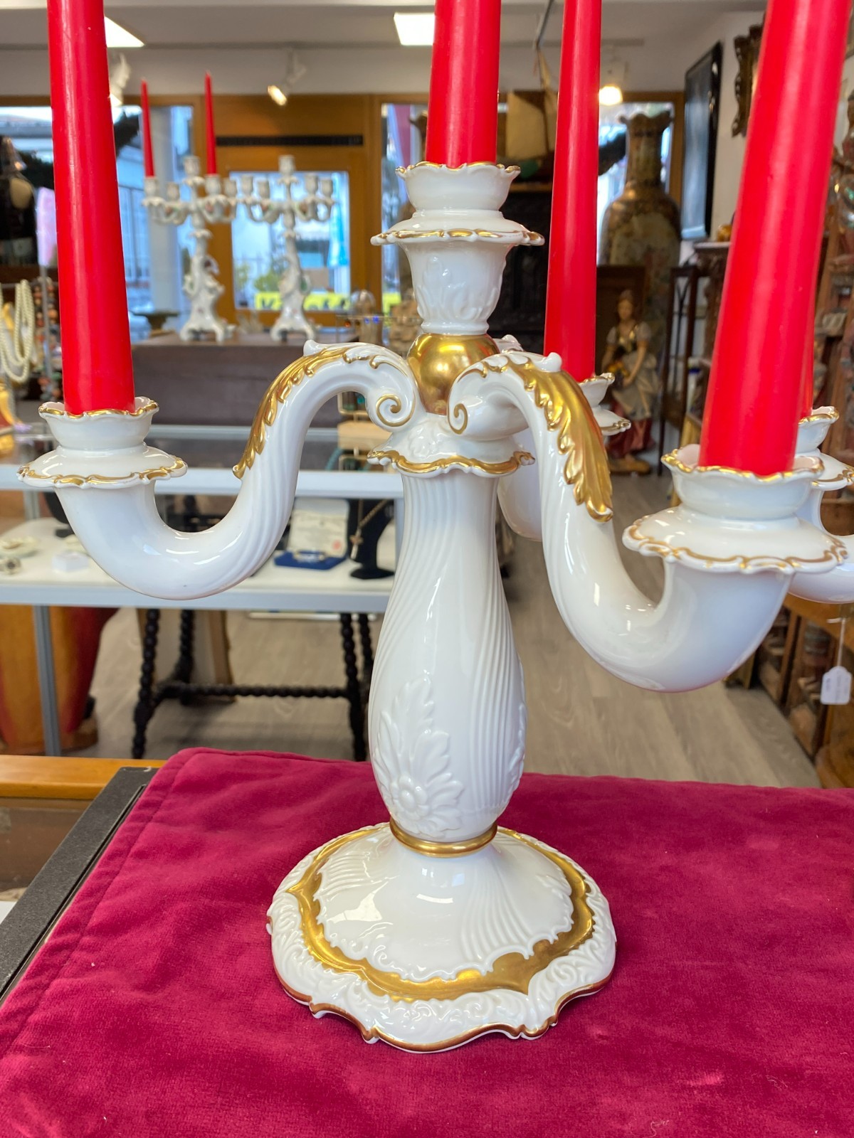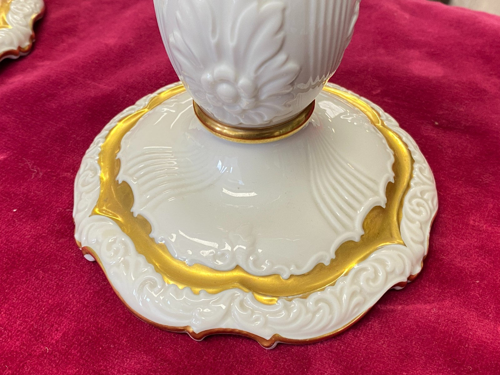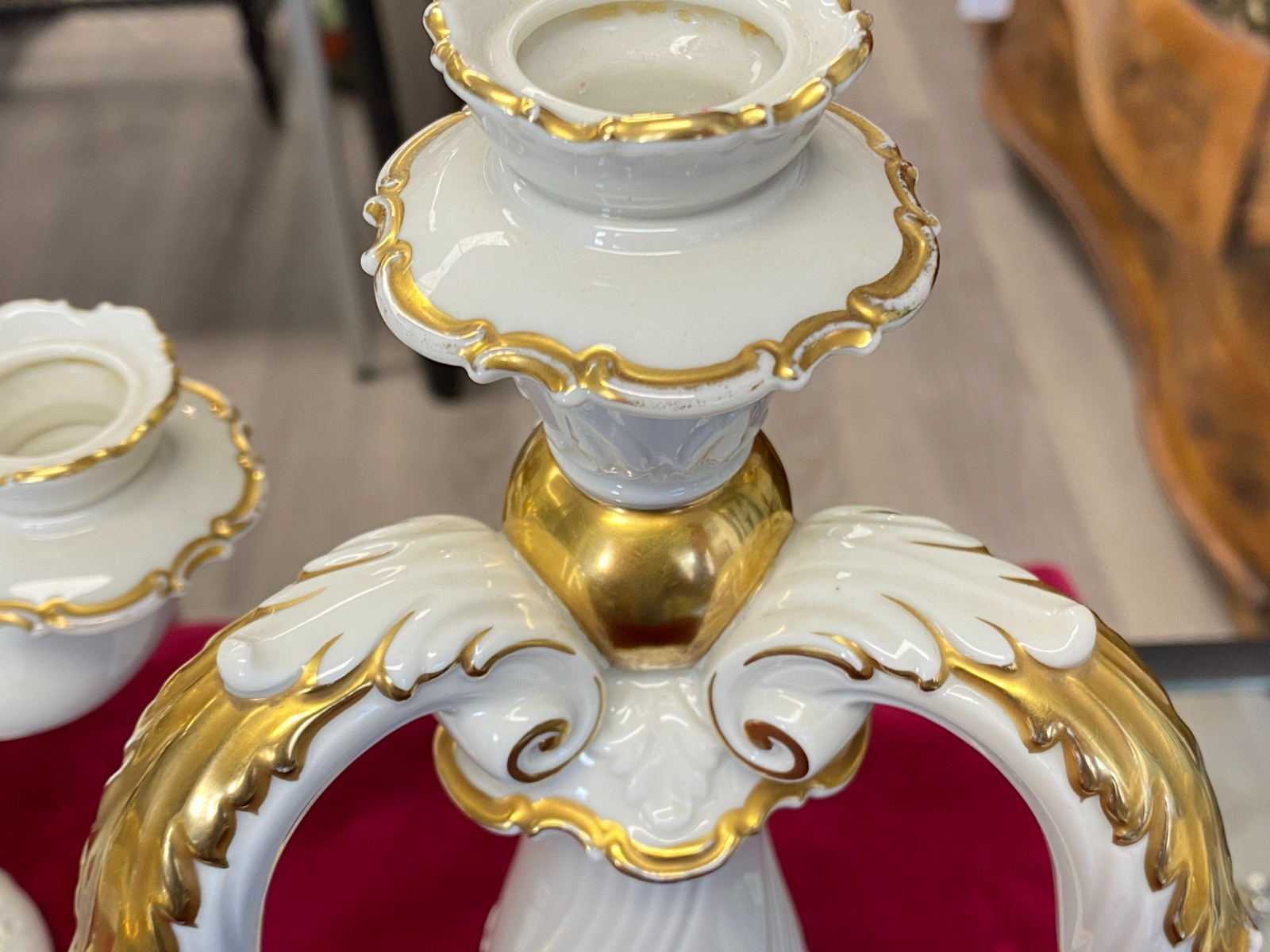 Paar dreiarmige Vintage Kerzenleuchter von der Manufaktur Rosenthal mit schöner Vergoldung. Die Vergoldung ist stellenweise berieben, wir konnten keine Chips oder Risse erkennen. Minimale Brandfehler. Den genauen Zustand entnehmen Sie bitte den Produktbildern. Gesamthöhe ca. 29cm, Durchmesser der Bodenplatte ca. 14cm, Länge der Arme ca. 14,5cm. Lieferung ohne Kerzen. Gerne würden wir hier aus Sicherheitsgründen auf den Postversand verzichten und bieten die Möglichkeit einer Abholung oder der Lieferung per Spediteur an.