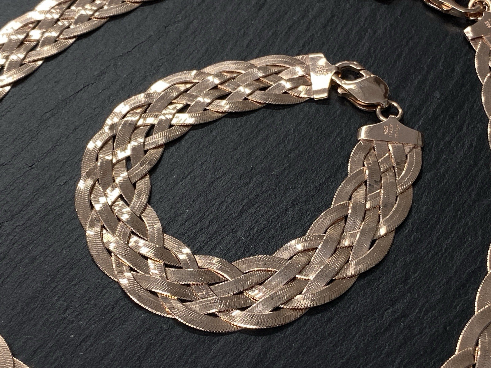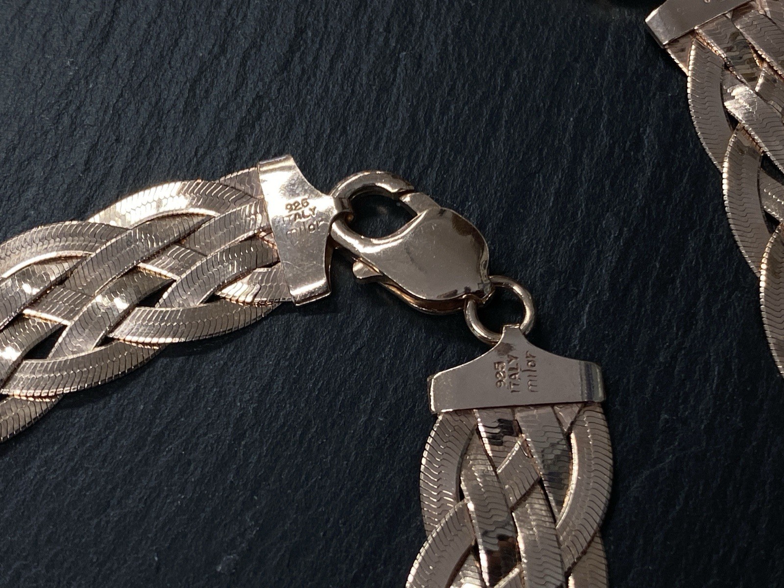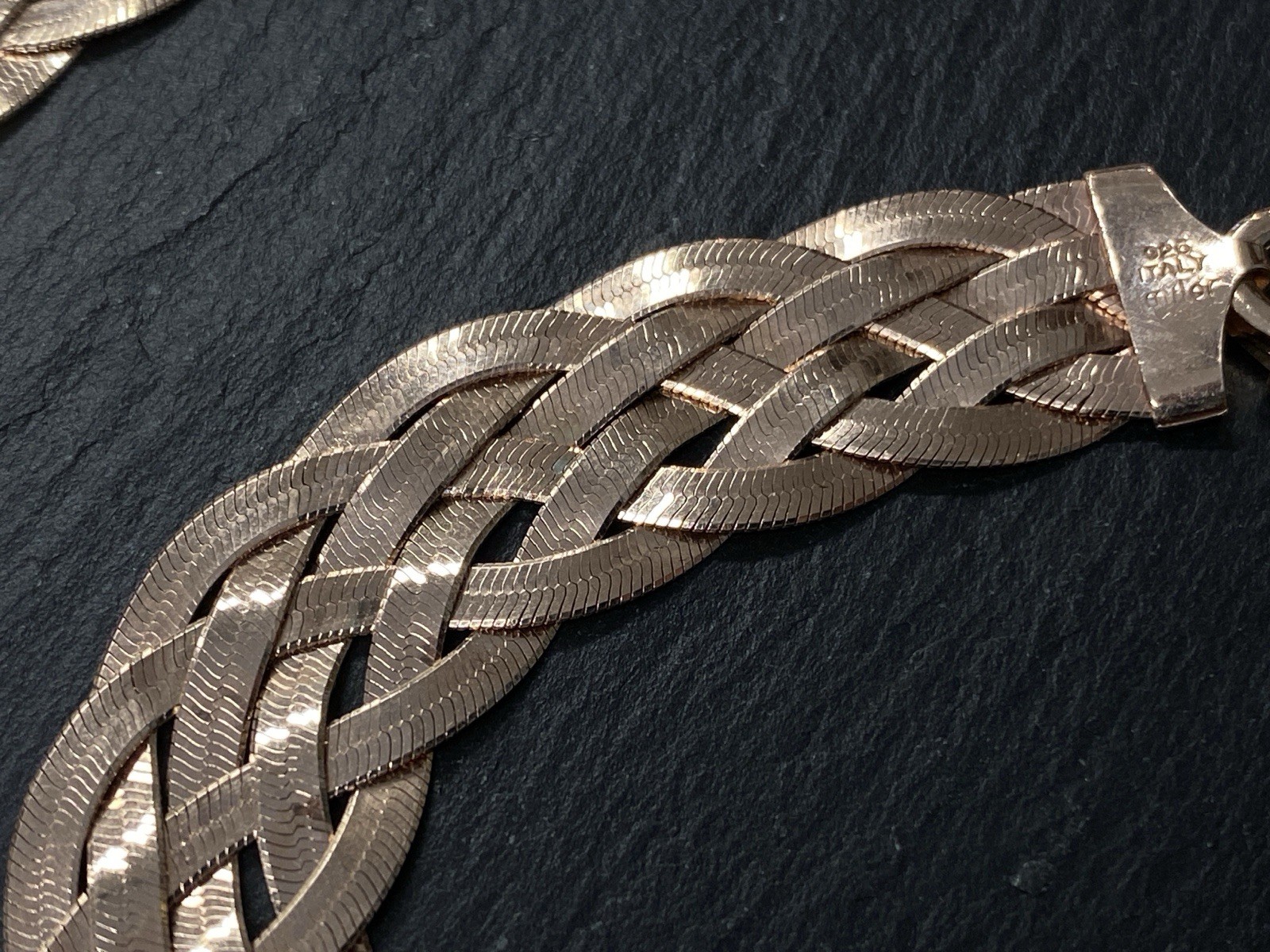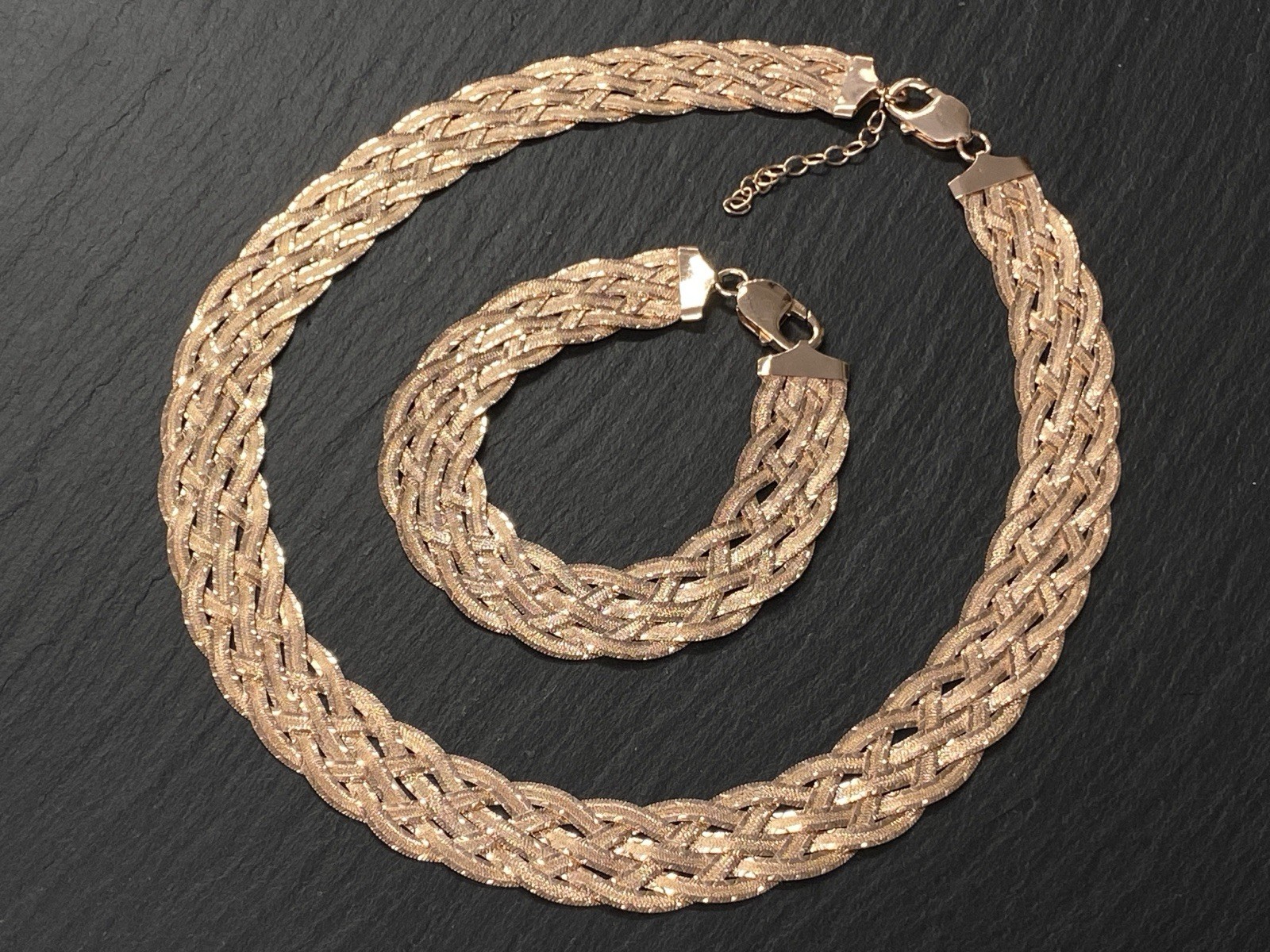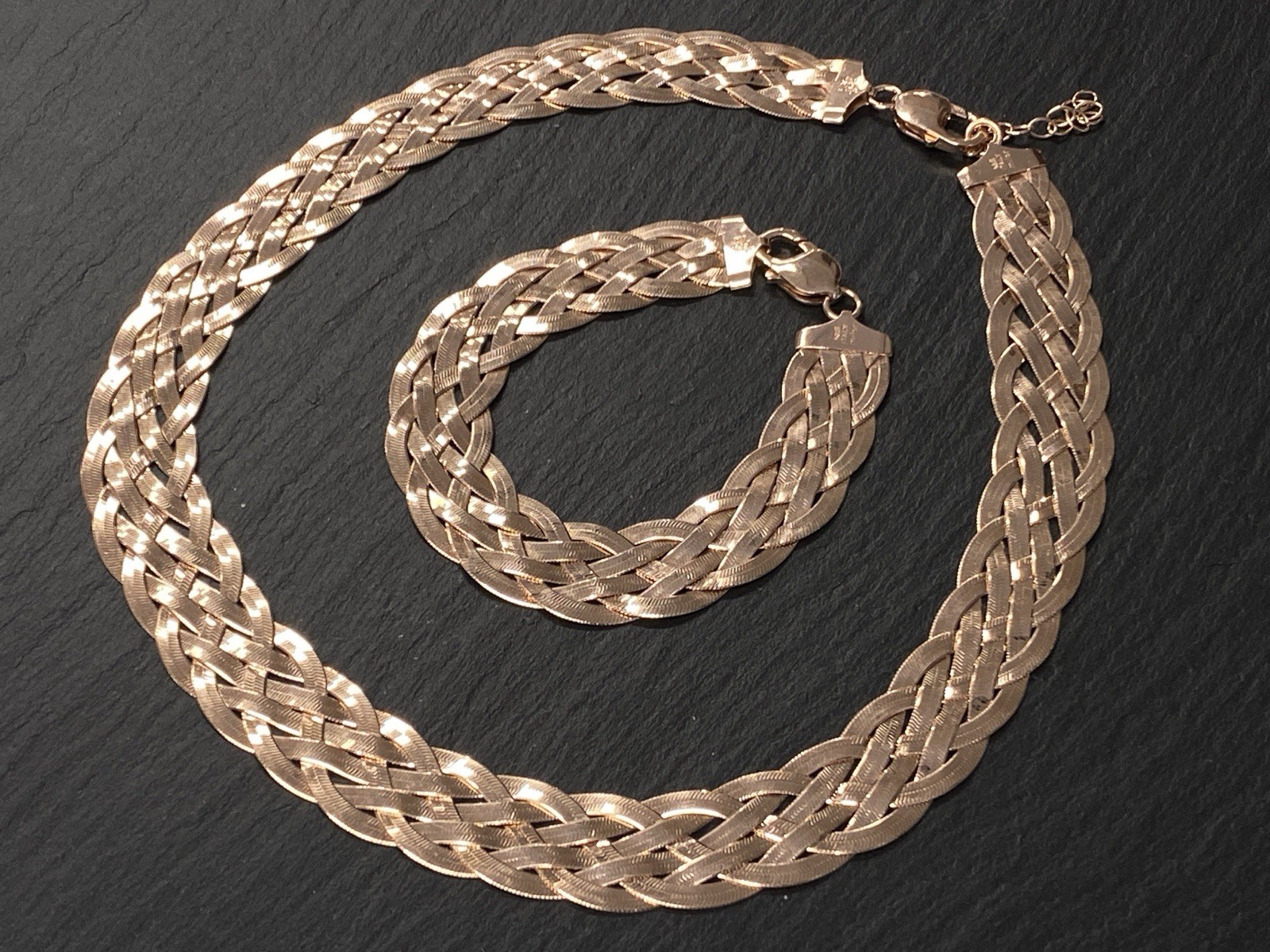 Set bestehend aus einem breiten Armband und einer breiten Kette in fünfreihigem Flechtmuster aus 925 Sterling Silber, beide gestempelt mit „925 ITALY milor“, in roségoldener Farbe. Die Oberflächen sind minimalst berieben, das Set ist vollständig. Am Armband ist die Verlängerungskette des Verschlusses fehlend. B/L der Kette 1,6/46,5cm, B/L des Armbands 1,6/20cm, Höhe der beiden 0,1cm. Gewicht Armband ca. 17,92g, Gewicht Kette ca. 40,63g.