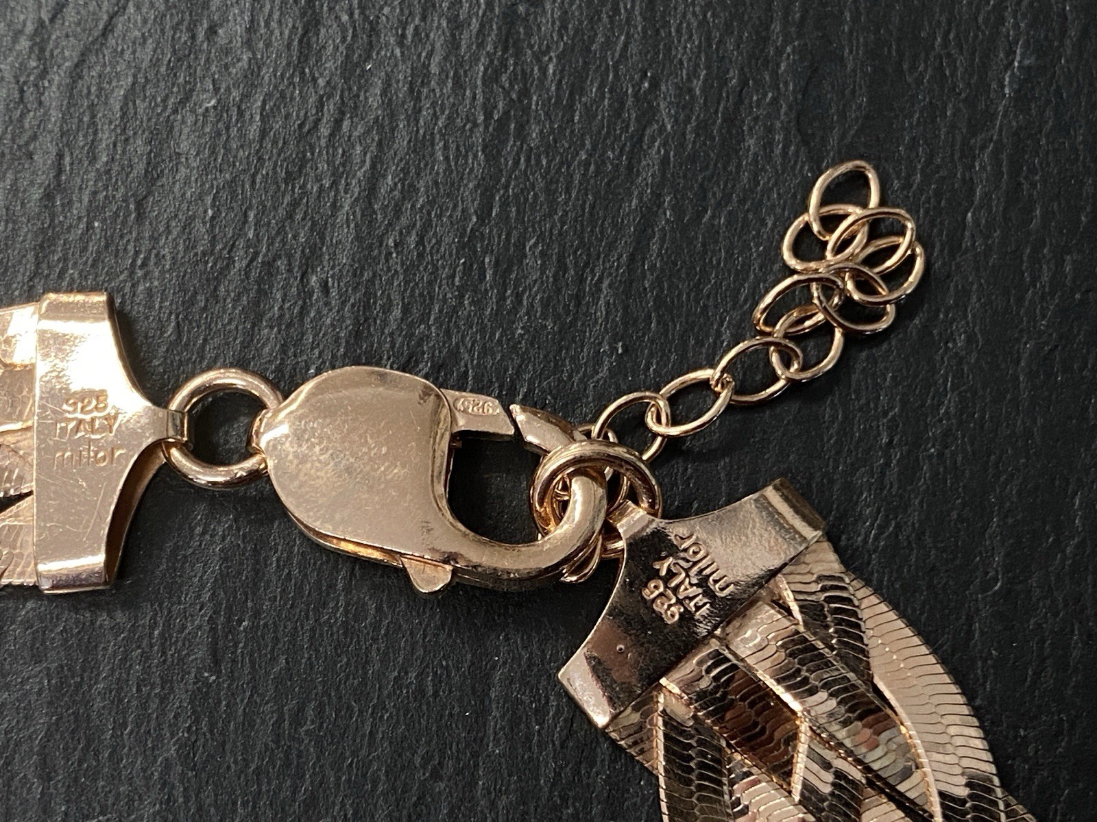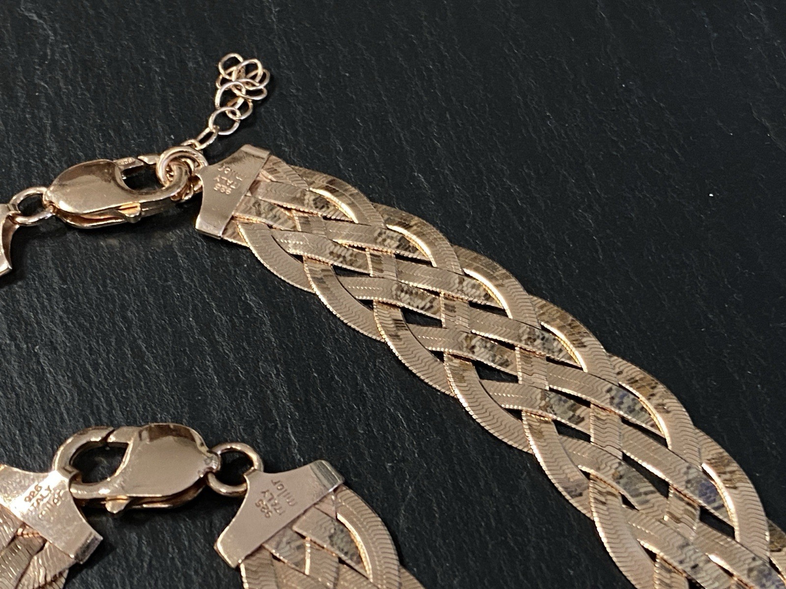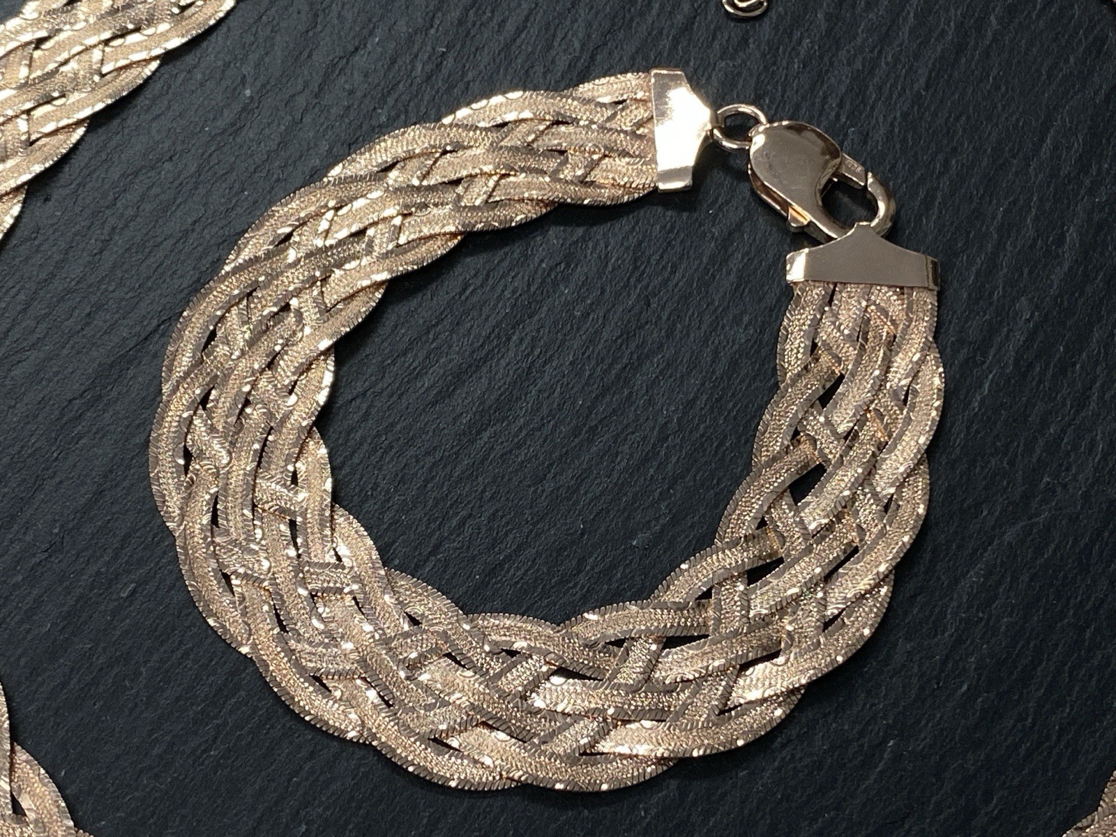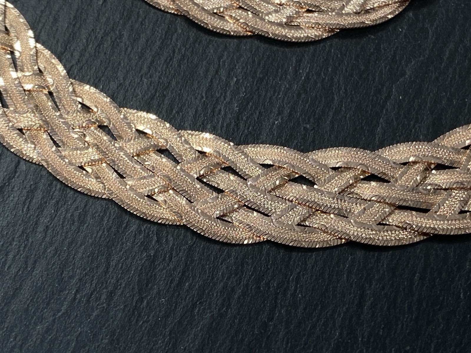 Set bestehend aus einem breiten Armband und einer breiten Kette in fünfreihigem Flechtmuster aus 925 Sterling Silber, beide gestempelt mit „925 ITALY milor“, in roségoldener Farbe. Die Oberflächen sind minimalst berieben, das Set ist vollständig. Am Armband ist die Verlängerungskette des Verschlusses fehlend. B/L der Kette 1,6/46,5cm, B/L des Armbands 1,6/20cm, Höhe der beiden 0,1cm. Gewicht Armband ca. 17,92g, Gewicht Kette ca. 40,63g.