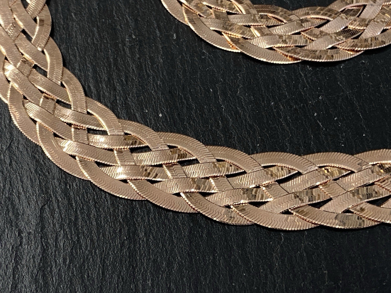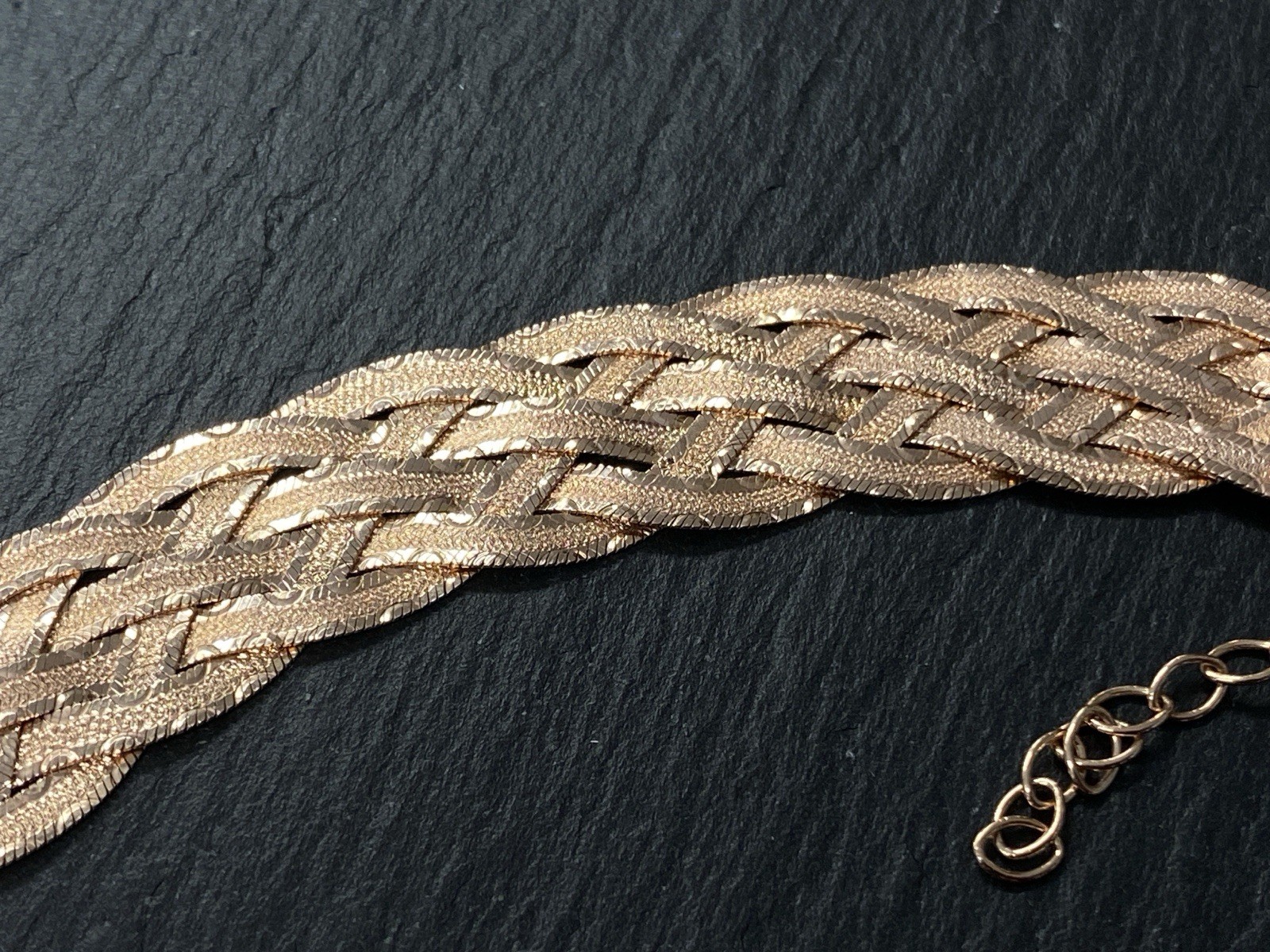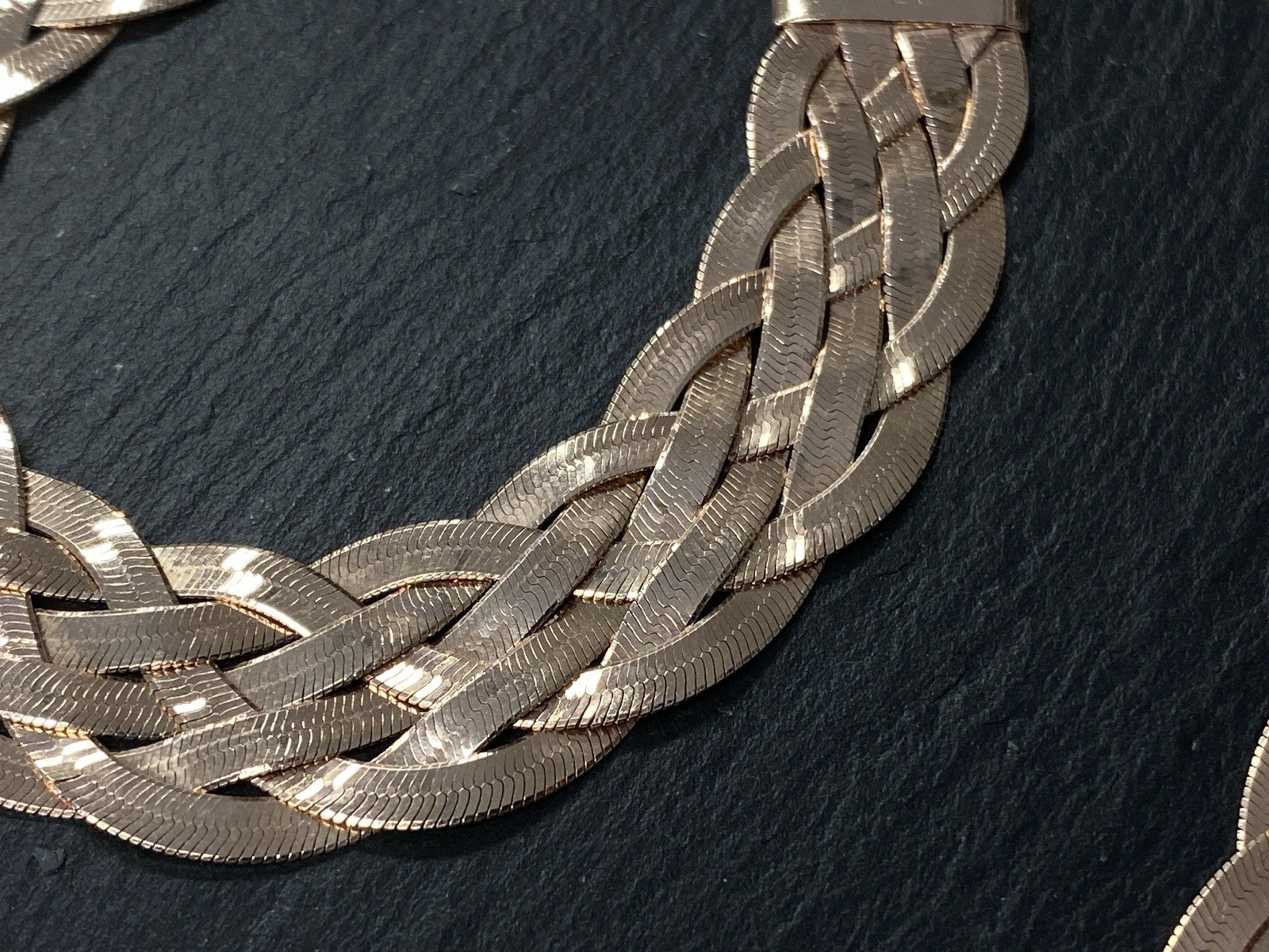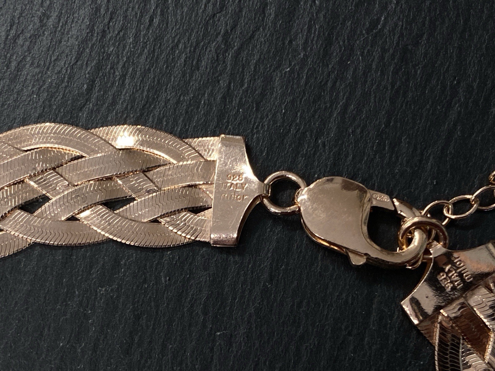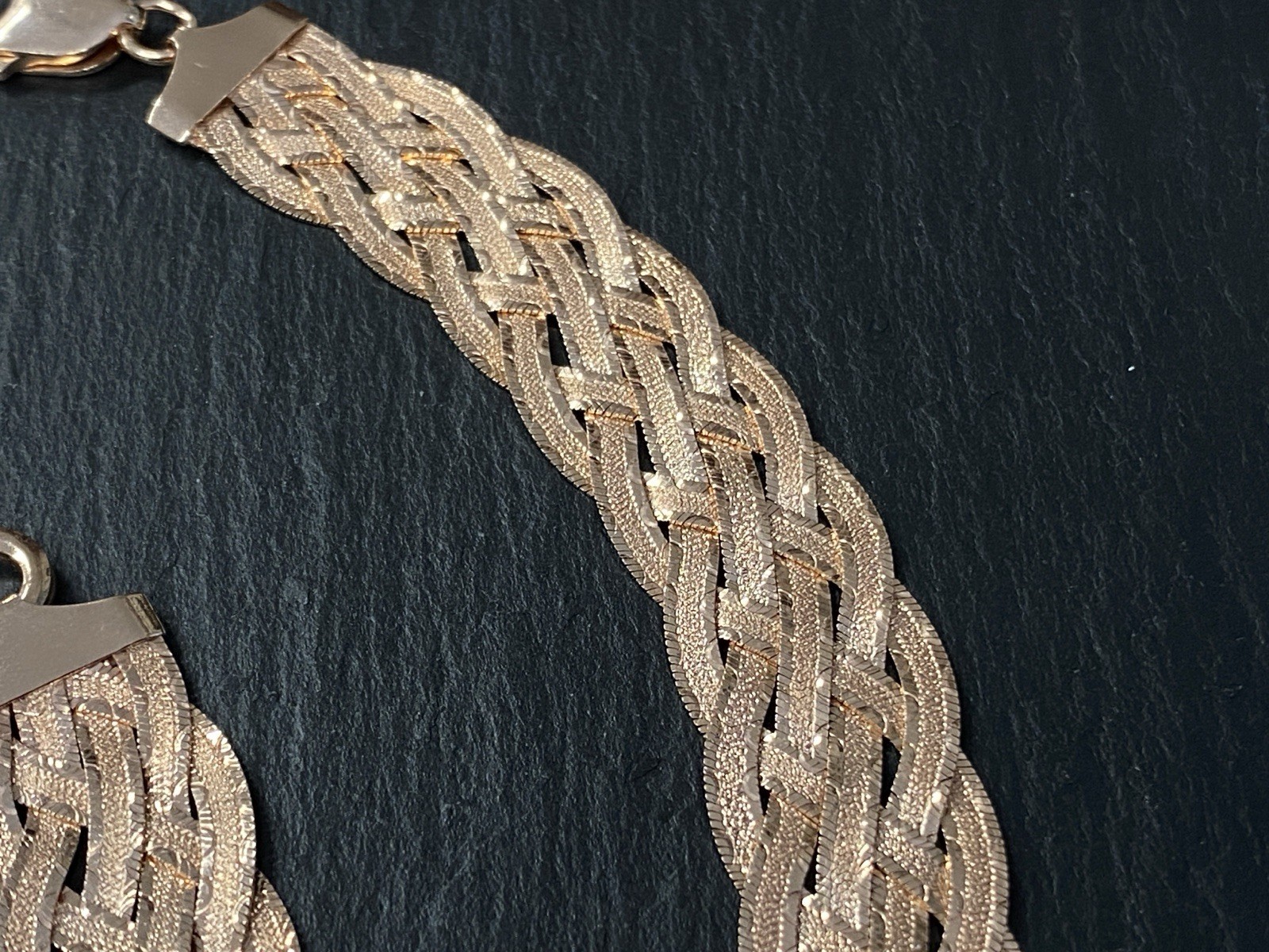 Set bestehend aus einem breiten Armband und einer breiten Kette in fünfreihigem Flechtmuster aus 925 Sterling Silber, beide gestempelt mit „925 ITALY milor“, in roségoldener Farbe. Die Oberflächen sind minimalst berieben, das Set ist vollständig. Am Armband ist die Verlängerungskette des Verschlusses fehlend. B/L der Kette 1,6/46,5cm, B/L des Armbands 1,6/20cm, Höhe der beiden 0,1cm. Gewicht Armband ca. 17,92g, Gewicht Kette ca. 40,63g.