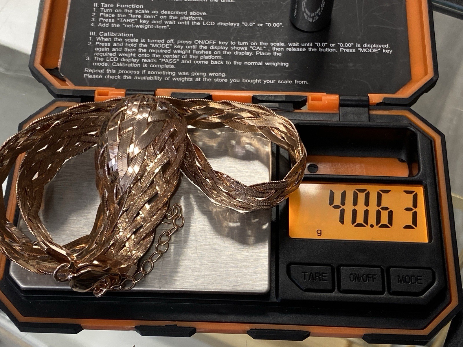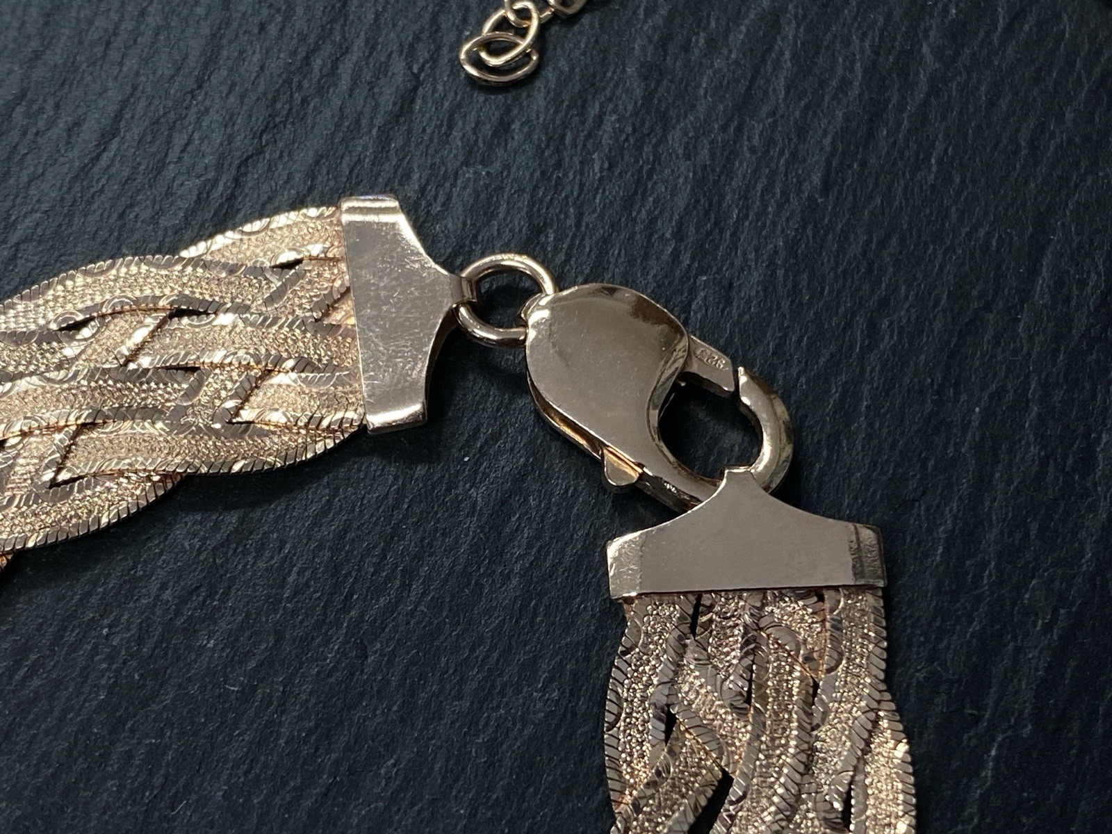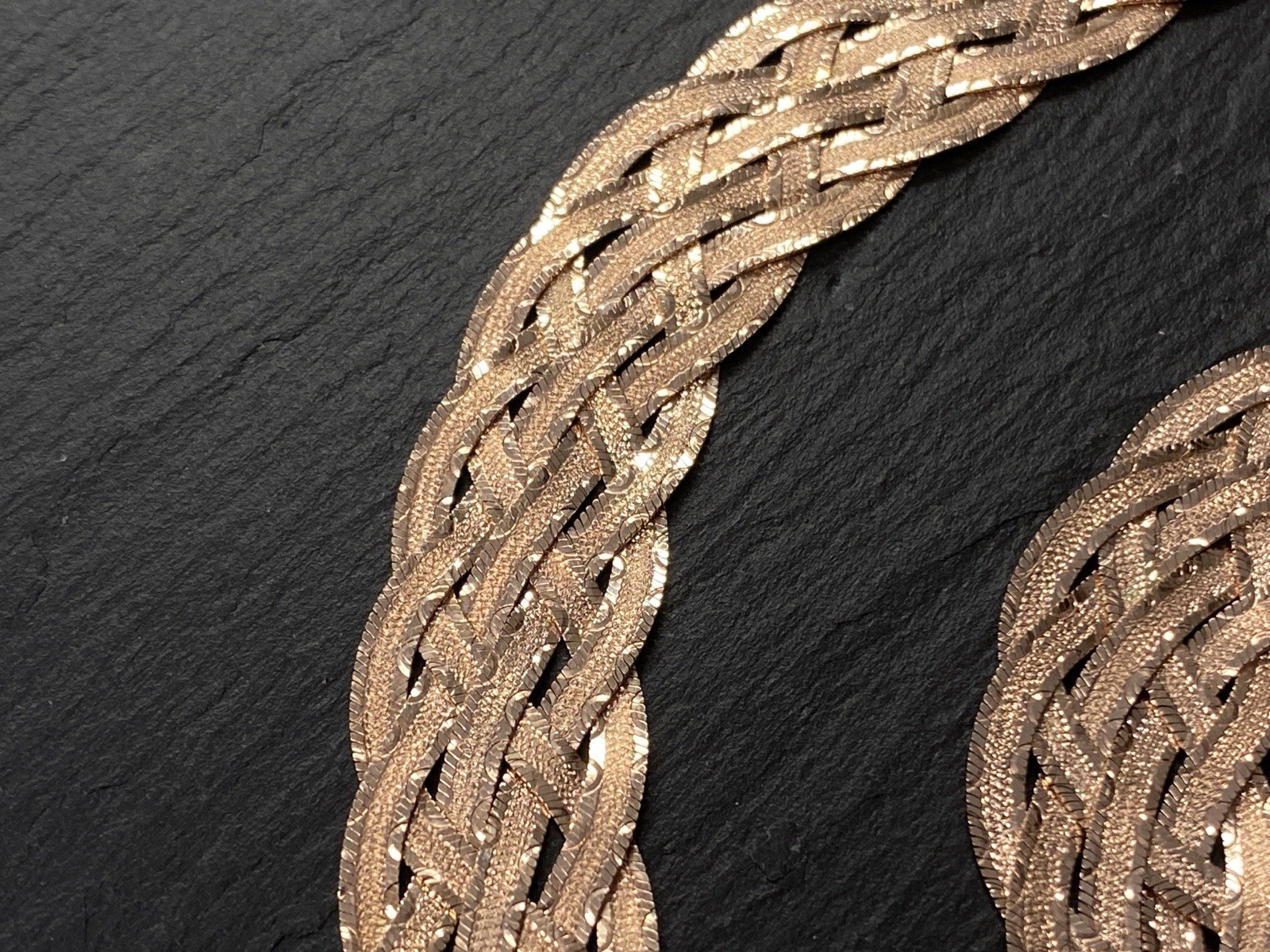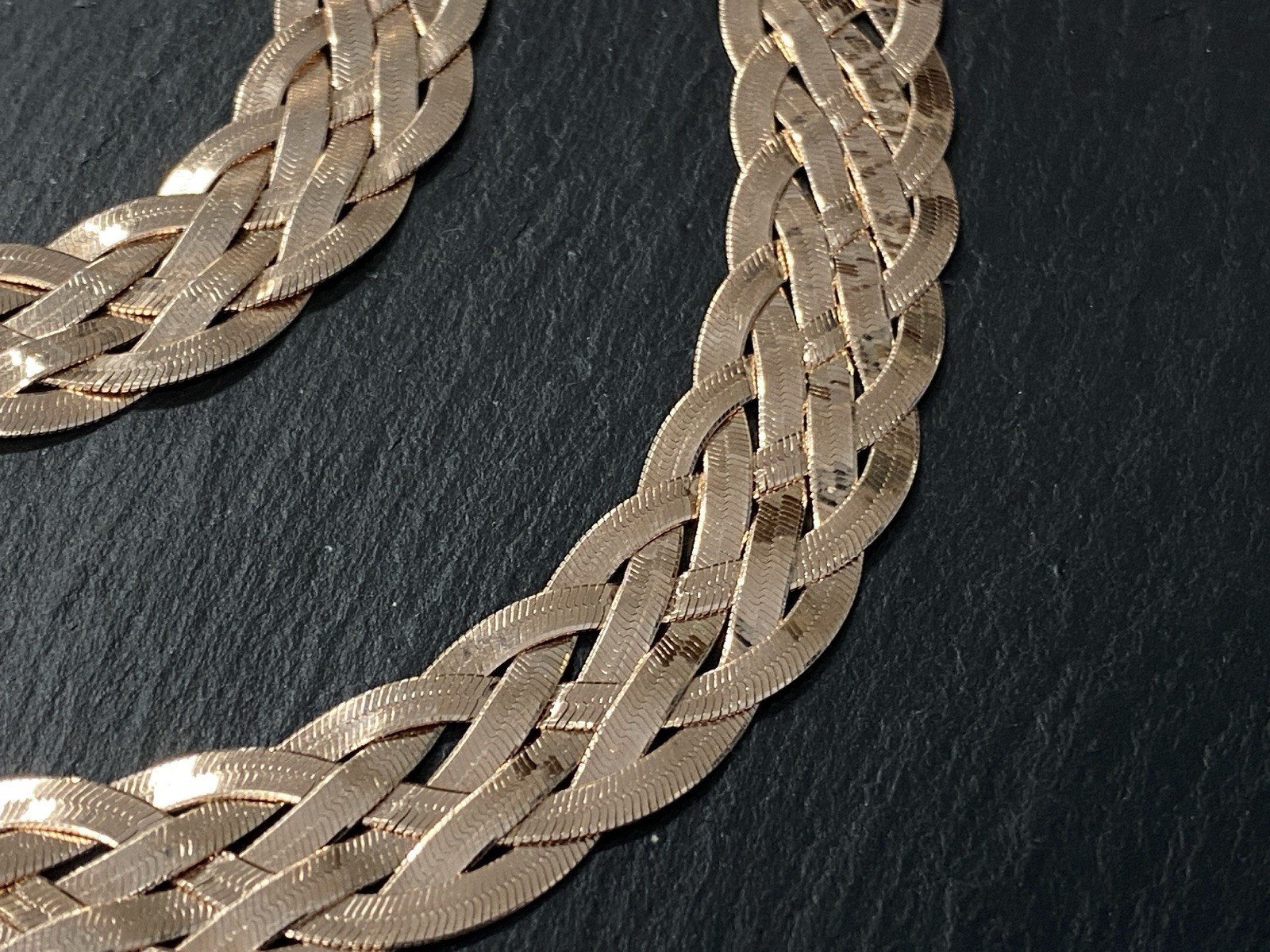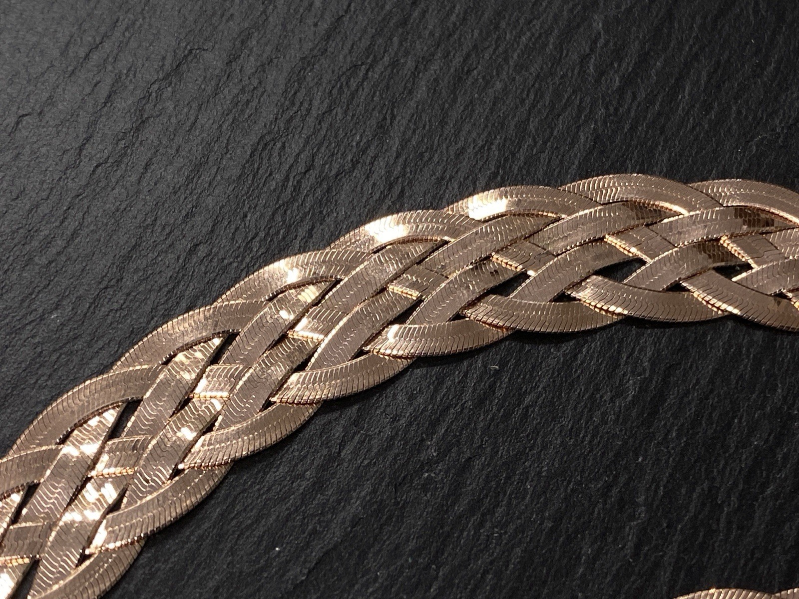 Set bestehend aus einem breiten Armband und einer breiten Kette in fünfreihigem Flechtmuster aus 925 Sterling Silber, beide gestempelt mit „925 ITALY milor“, in roségoldener Farbe. Die Oberflächen sind minimalst berieben, das Set ist vollständig. Am Armband ist die Verlängerungskette des Verschlusses fehlend. B/L der Kette 1,6/46,5cm, B/L des Armbands 1,6/20cm, Höhe der beiden 0,1cm. Gewicht Armband ca. 17,92g, Gewicht Kette ca. 40,63g.