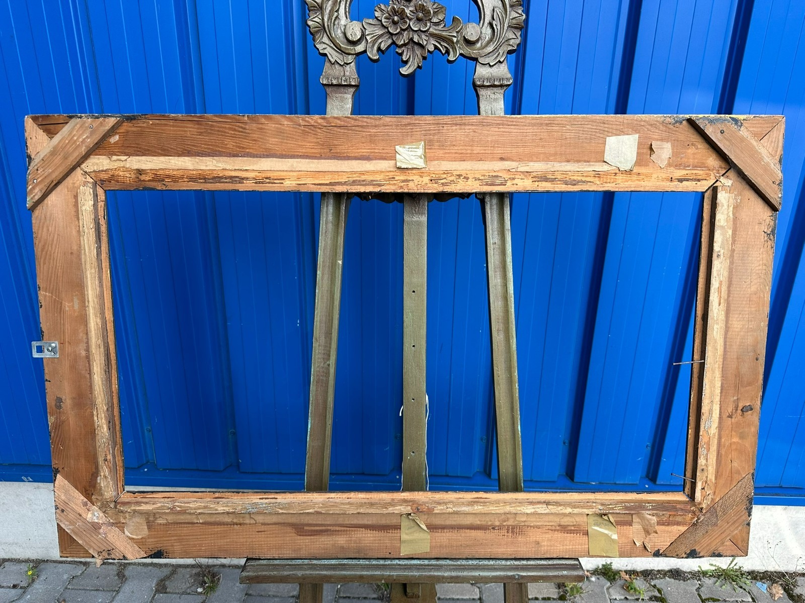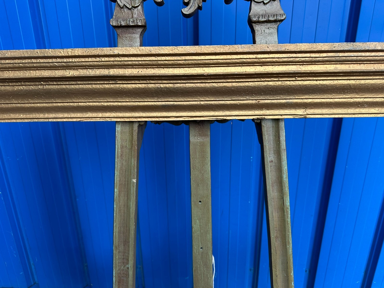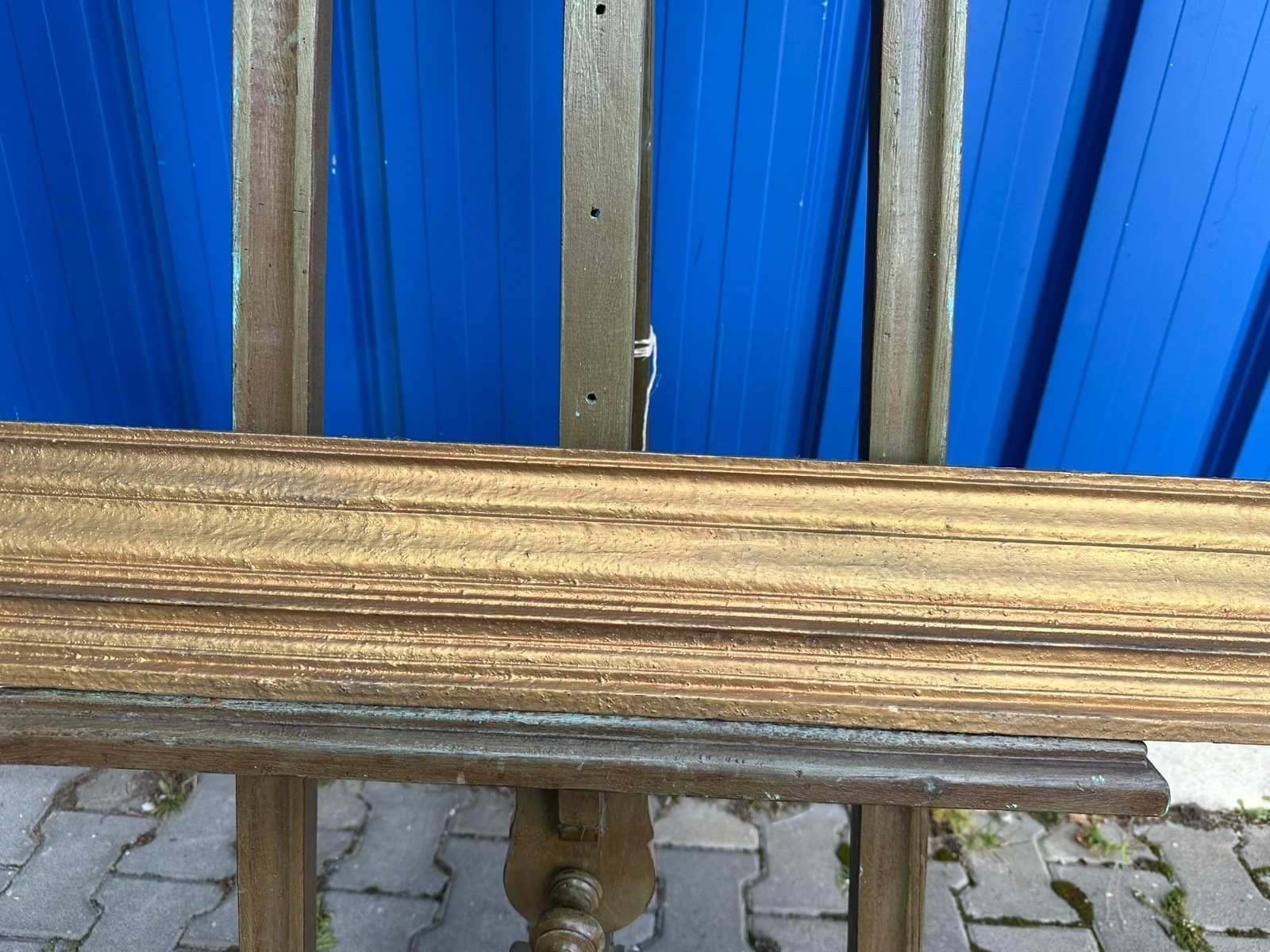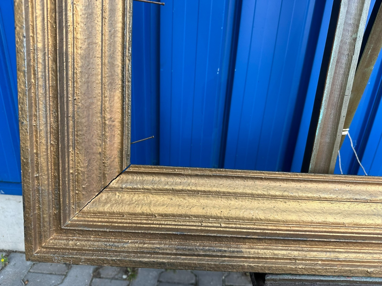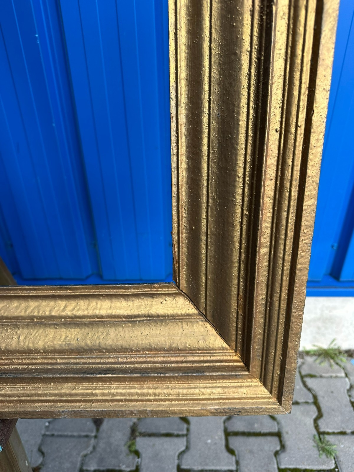 Massiver Vintage Bilderrahmen aus Holz mit goldener Oberfläche, wohl übermalt. Der Rahmen ist in sich stabil, an den Ecken kleine Spalten. Oberfläche leicht berieben. Oben mittig ist die Passepartoutleiste bestossen und leicht angerissen. An der Rückseite eine Bildbefestigungsleiste abhanden, das genaue Falzmass kann somit leicht variiert werden. Gesamtabmessungen 120x75x7cm, Lichtmass 95,5x51cm.