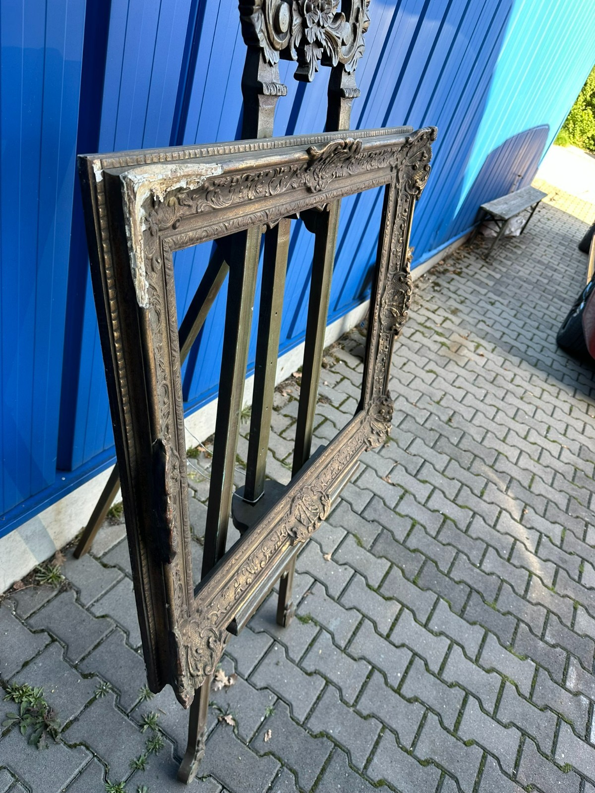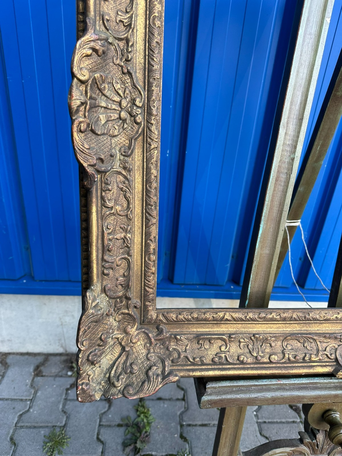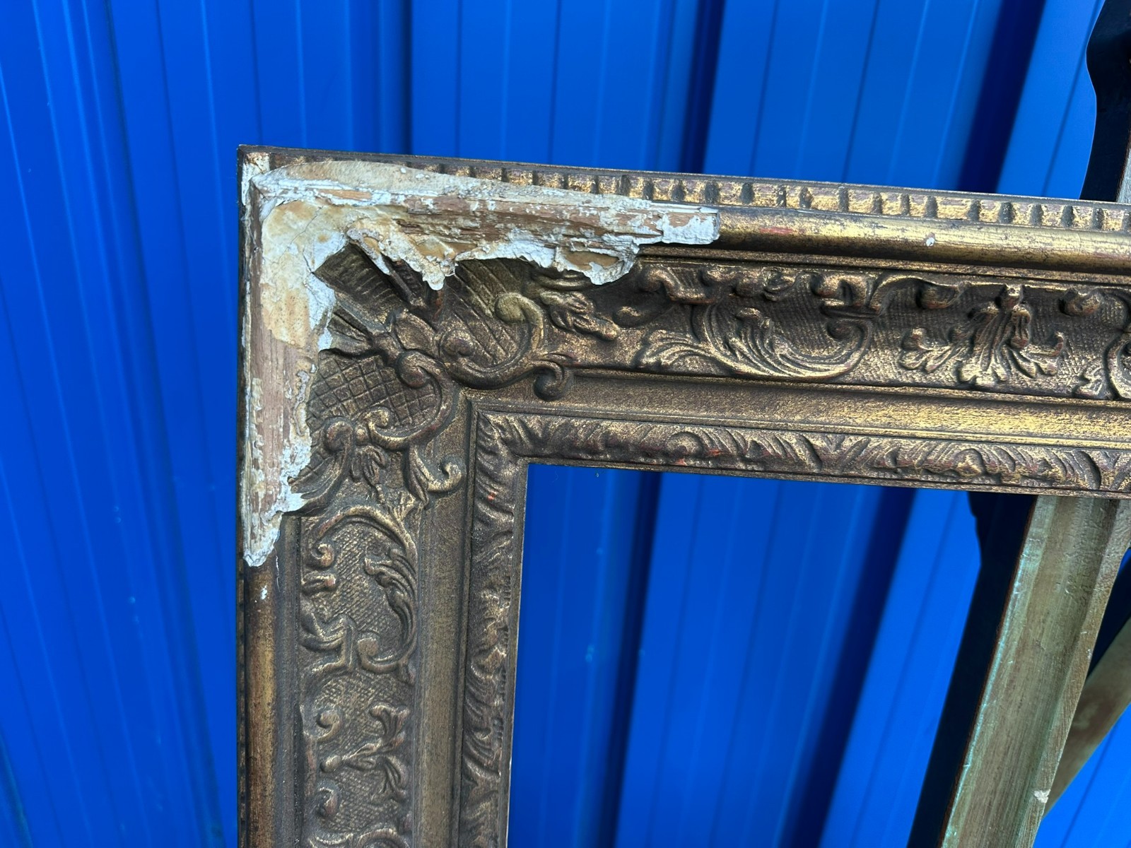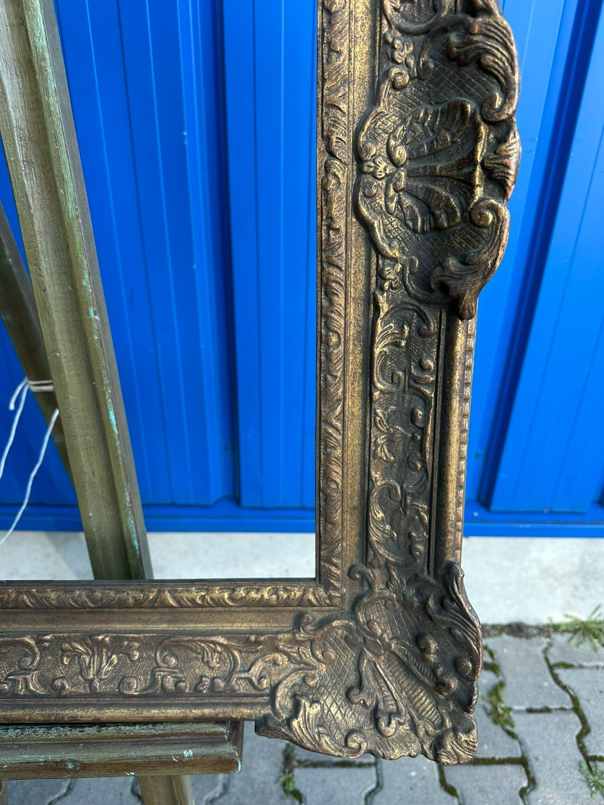 Großer Bilderrahmen in Barockstil, Holz mit Gipsaufbau und goldener Oberfläche. Eine Ecke insgesamt unvollständig, weiterhin kleinere Risse und Abrieb. Die Oberfläche ist insgesamt schmutzig, der Rahmen ist stabil. Gesamtabmessungen 92x76x9cm, Falzmass 73,7×57,5cm, Falzbreite 1,4cm, Falztiefe 1,2cm. Der Rahmen stammt wohl aus den 60er Jahren.