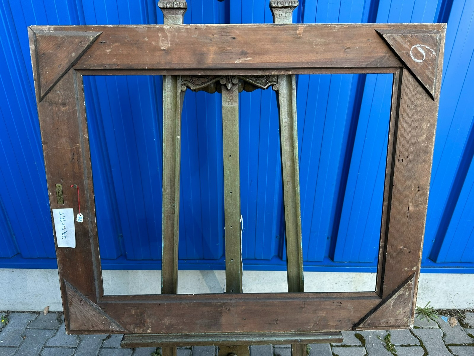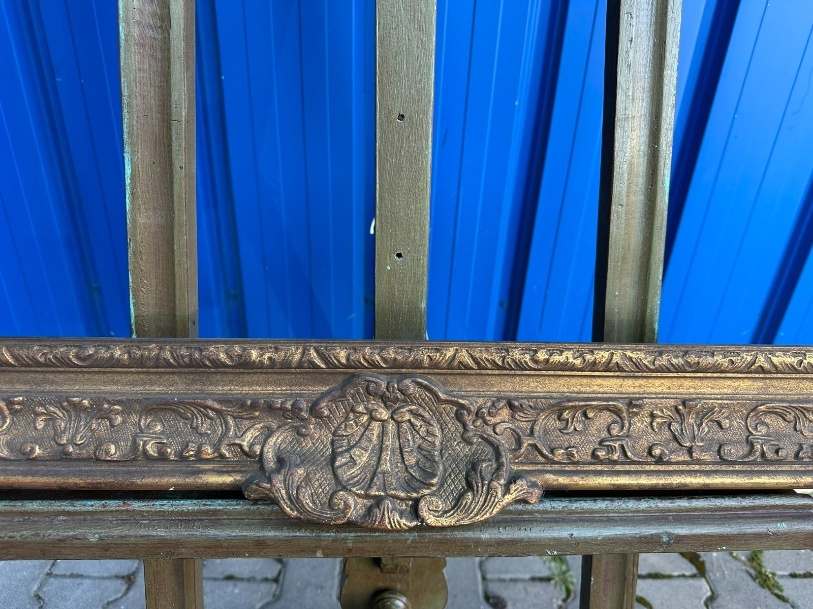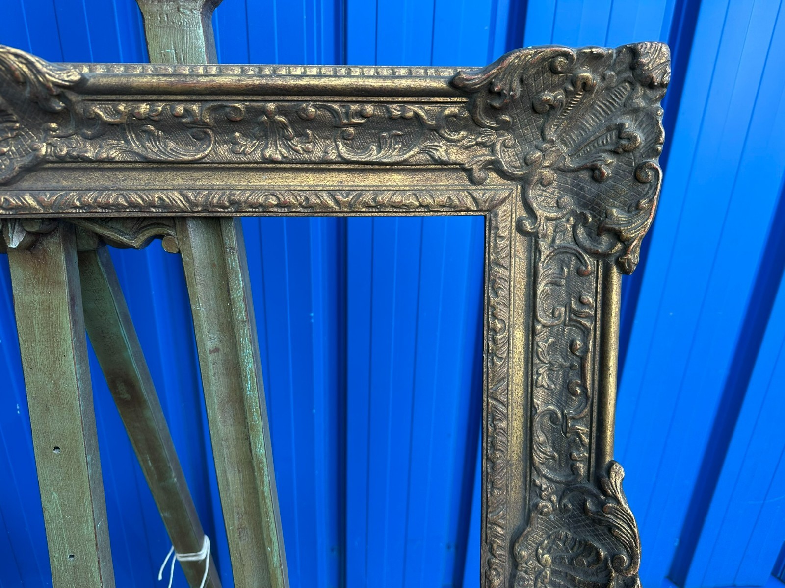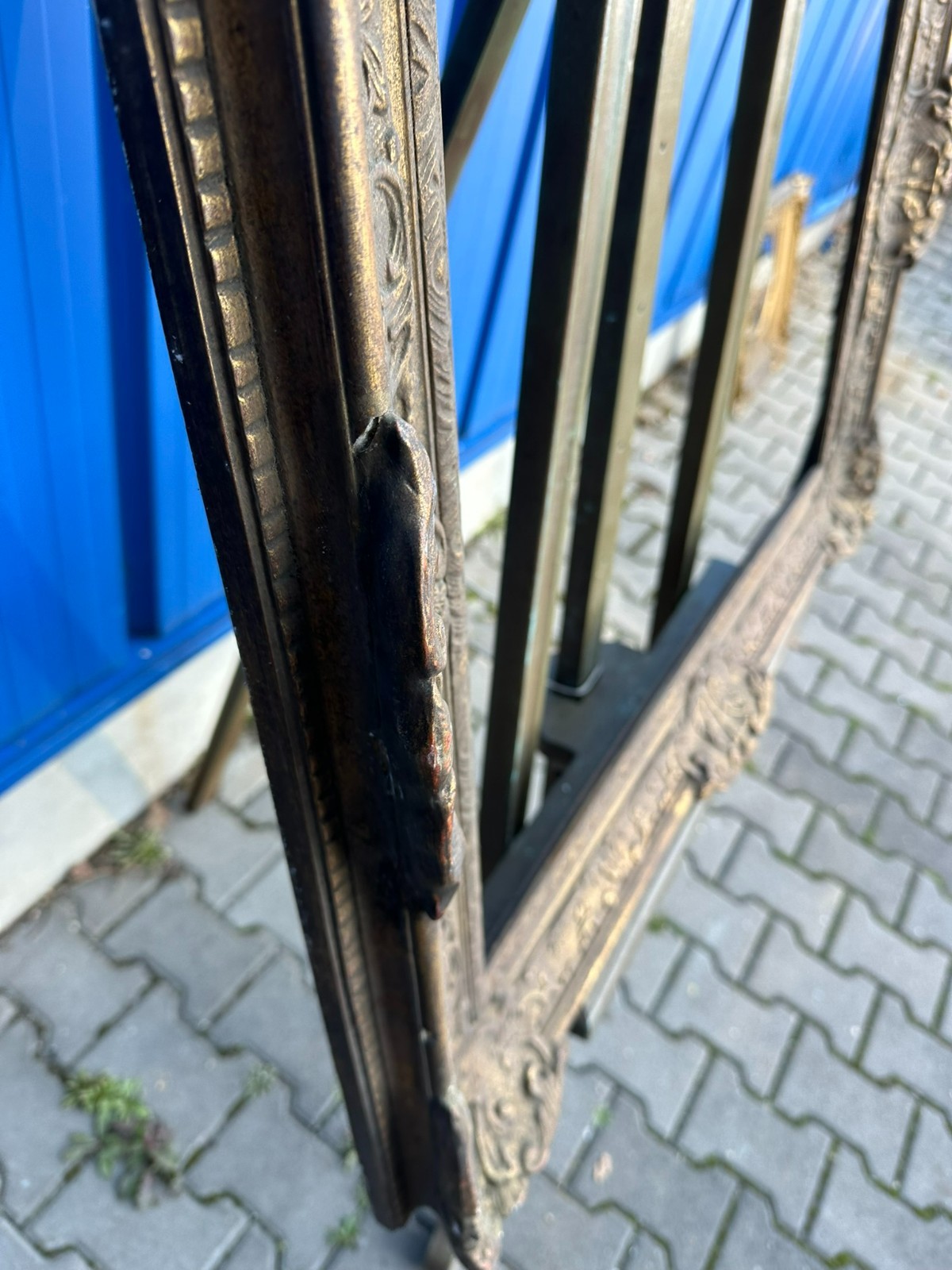 Großer Bilderrahmen in Barockstil, Holz mit Gipsaufbau und goldener Oberfläche. Eine Ecke insgesamt unvollständig, weiterhin kleinere Risse und Abrieb. Die Oberfläche ist insgesamt schmutzig, der Rahmen ist stabil. Gesamtabmessungen 92x76x9cm, Falzmass 73,7×57,5cm, Falzbreite 1,4cm, Falztiefe 1,2cm. Der Rahmen stammt wohl aus den 60er Jahren.
