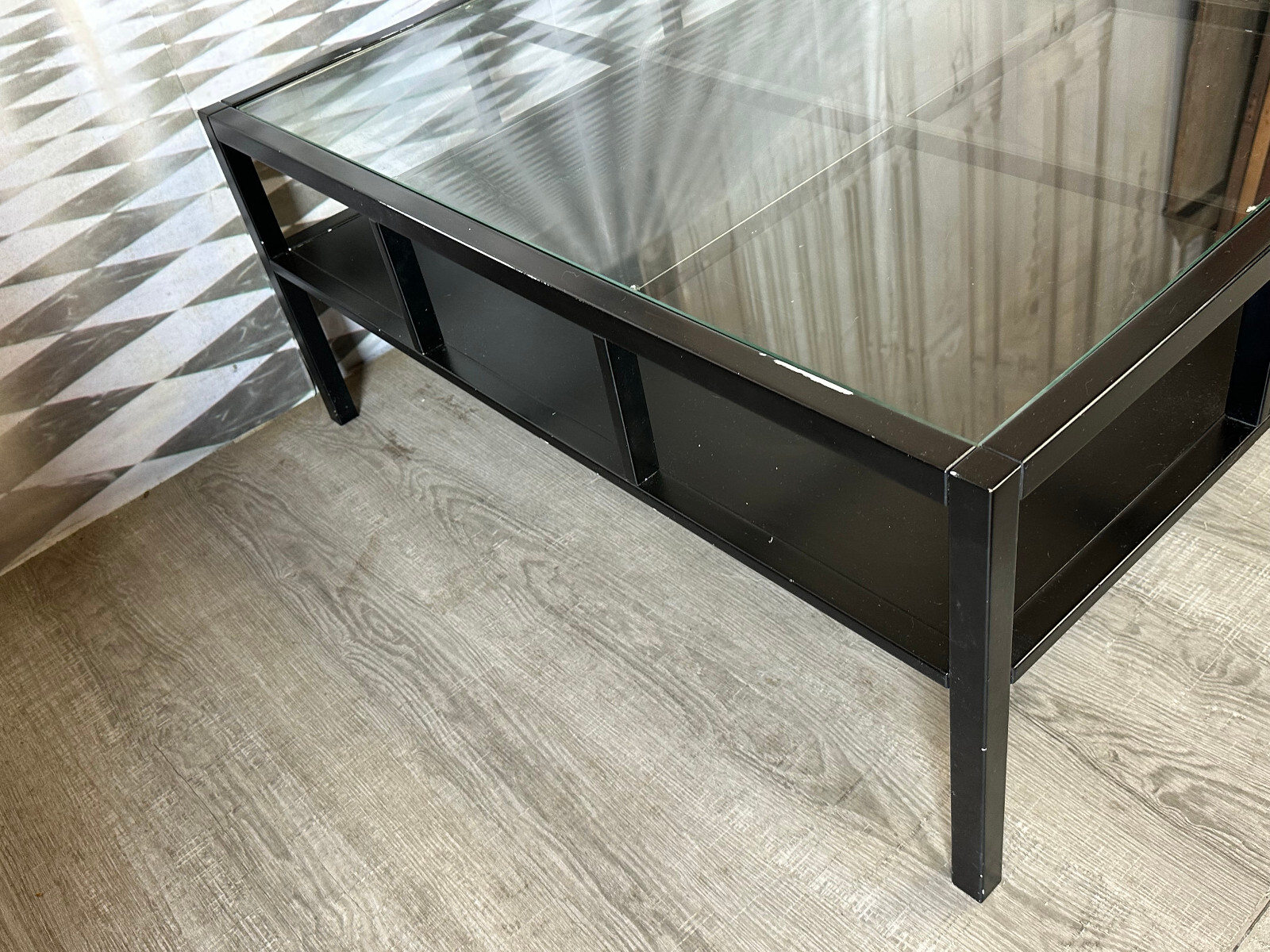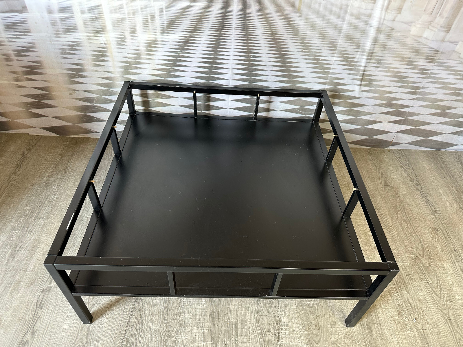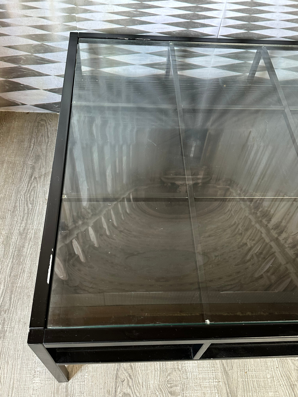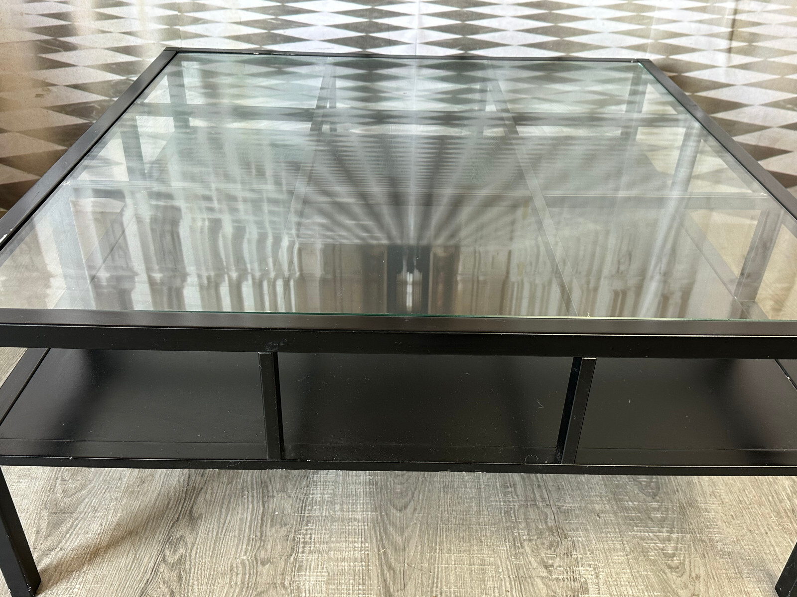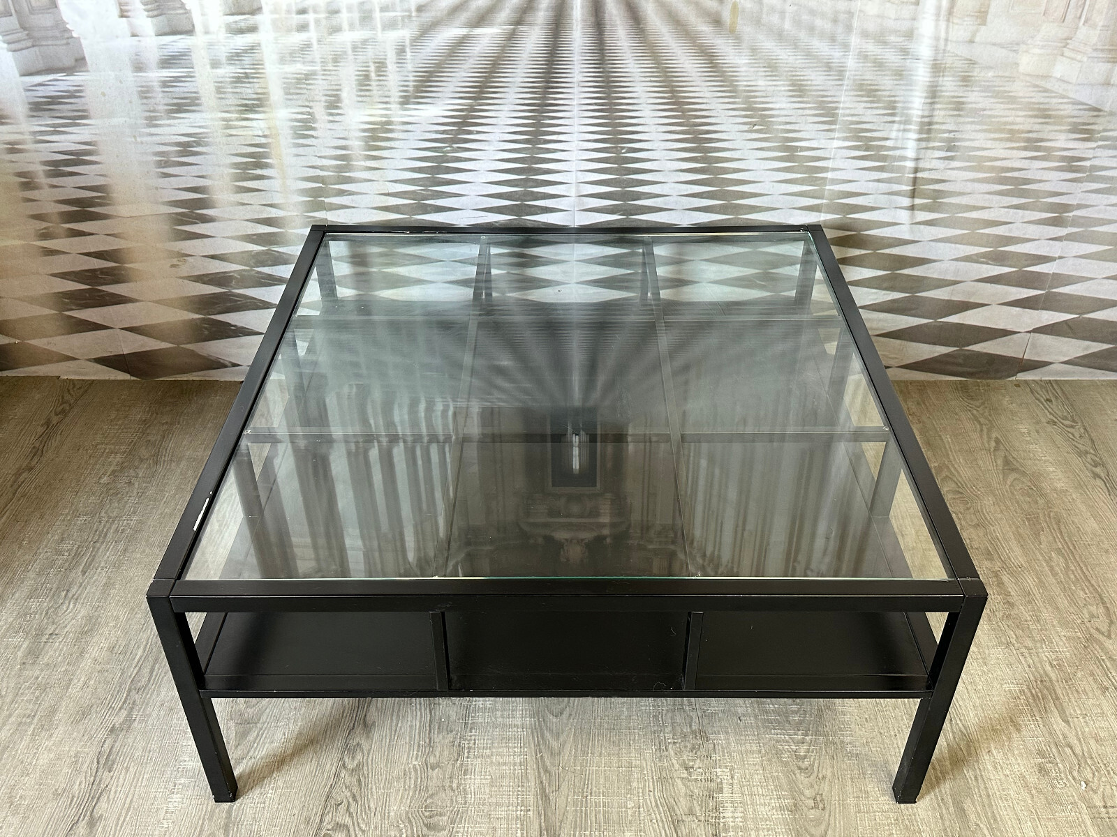 Sehr großer, vintage Beistelltisch, gestecktes Holzprofil, schwarz gefasst. In der schwarzen Schicht zum Teil Abrieb, hier ist die weiße Grundierung zu sehen, an einer Ecke aufgeblähte Lackschicht. An der Glasplatte zum Teil Kratzer. Stabiler Zustand, Abmessungen BTH: 100x100x42cm.