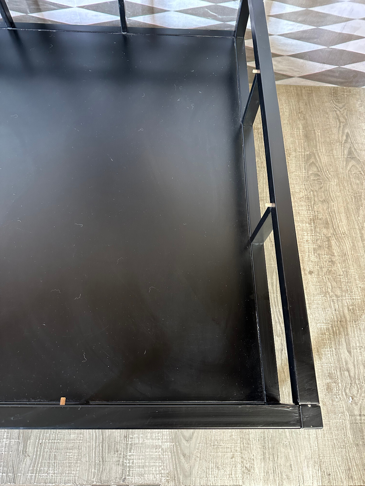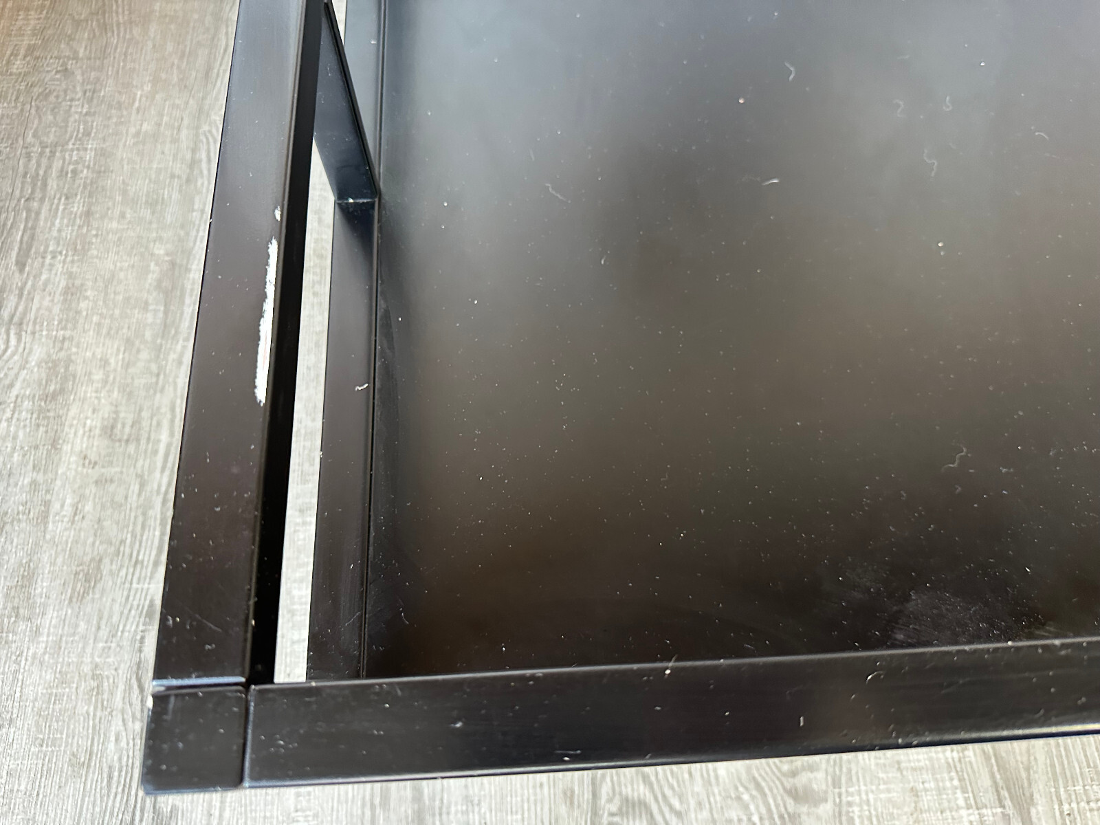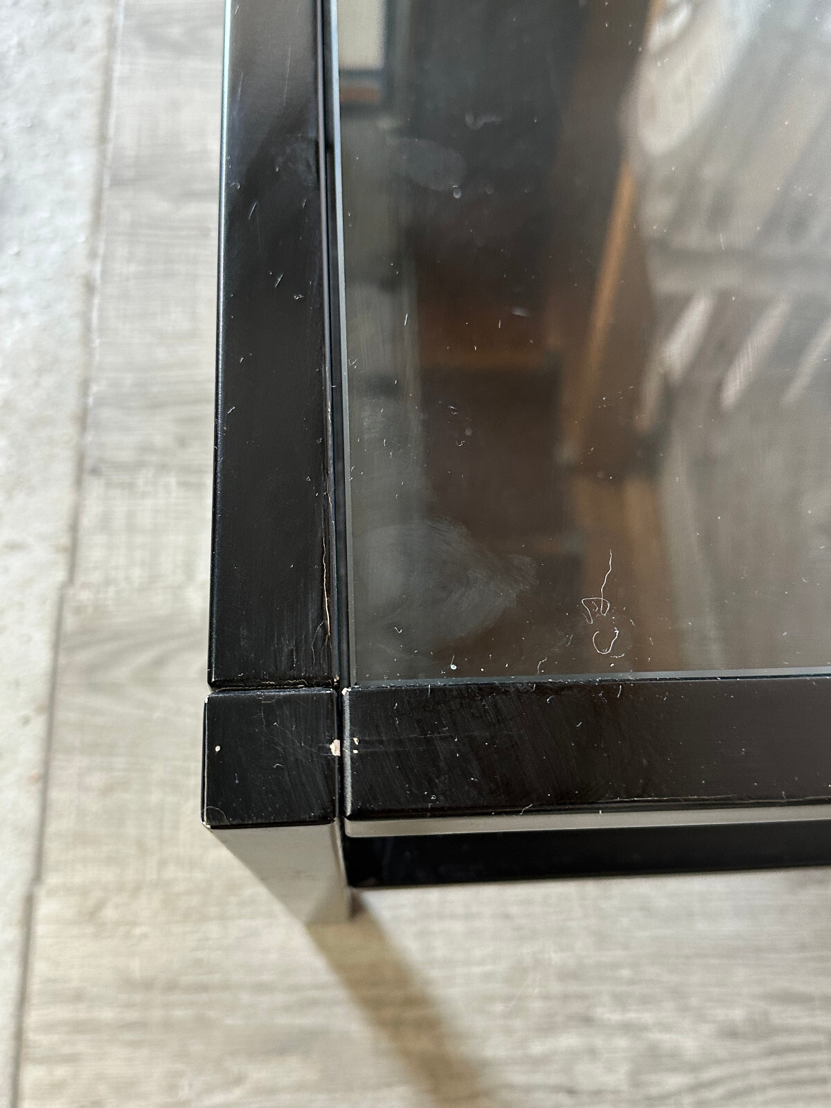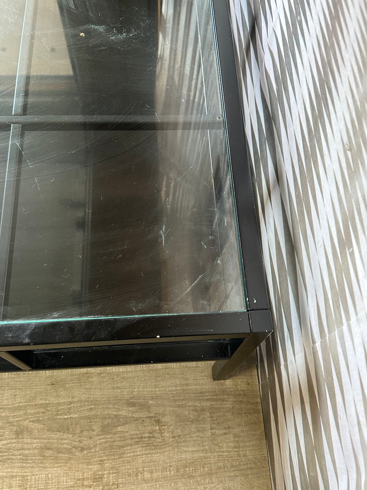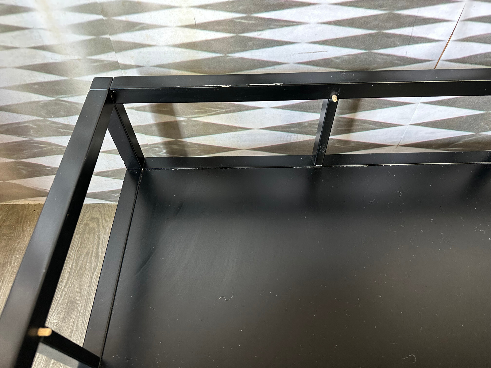 Sehr großer, vintage Beistelltisch, gestecktes Holzprofil, schwarz gefasst. In der schwarzen Schicht zum Teil Abrieb, hier ist die weiße Grundierung zu sehen, an einer Ecke aufgeblähte Lackschicht. An der Glasplatte zum Teil Kratzer. Stabiler Zustand, Abmessungen BTH: 100x100x42cm.