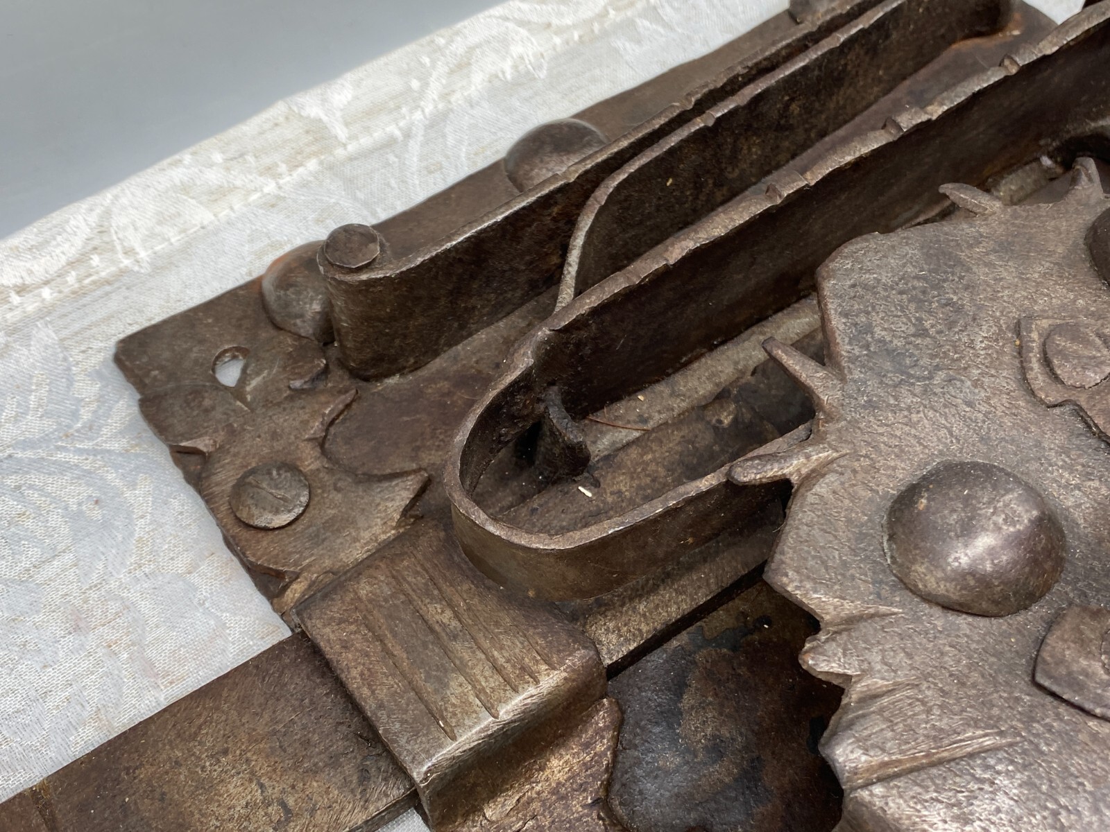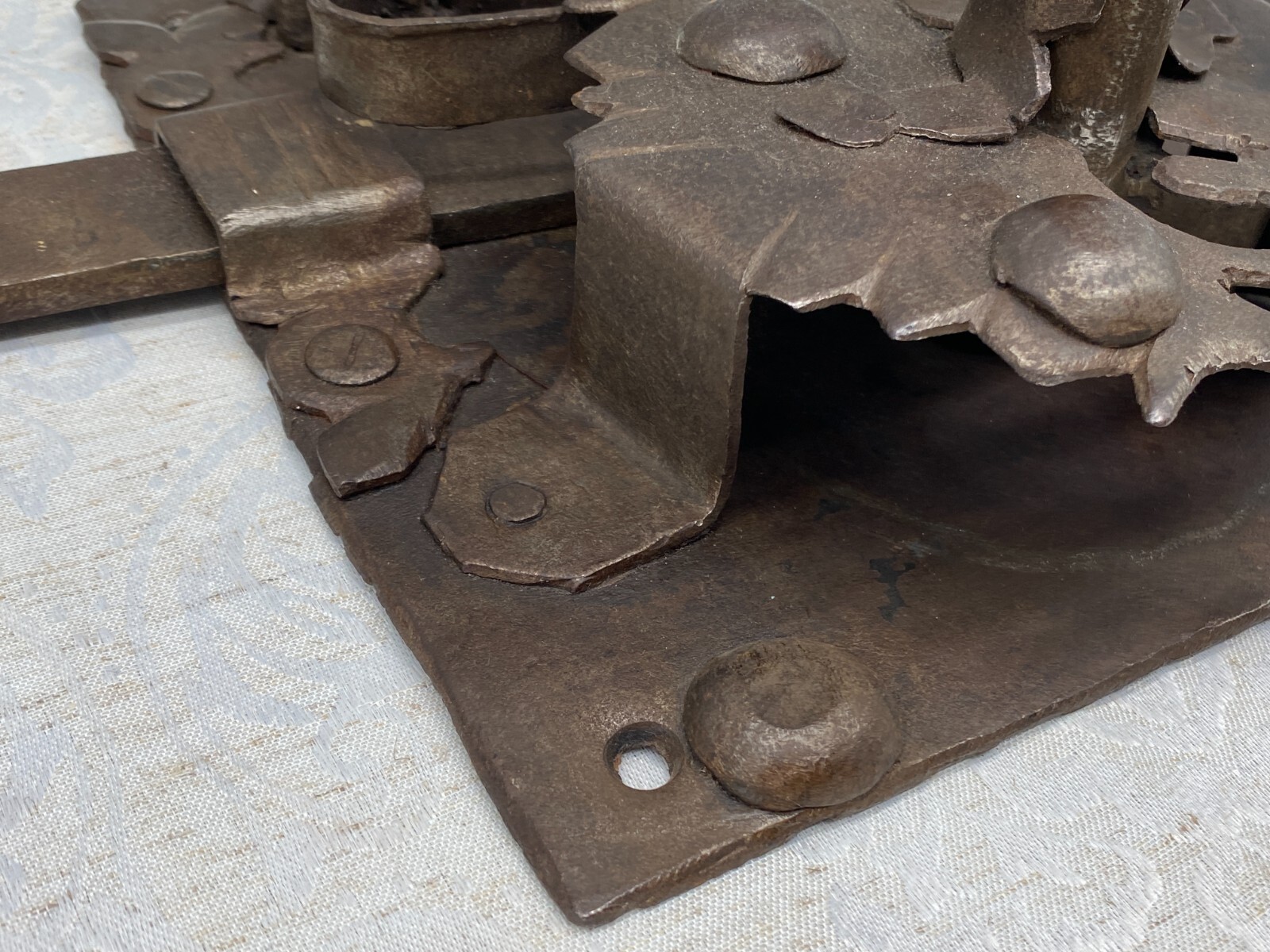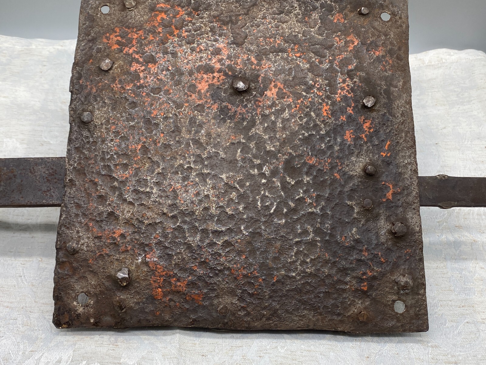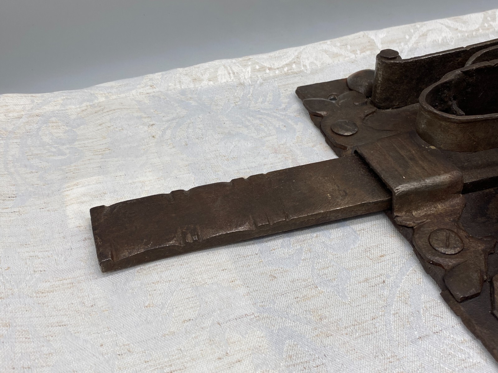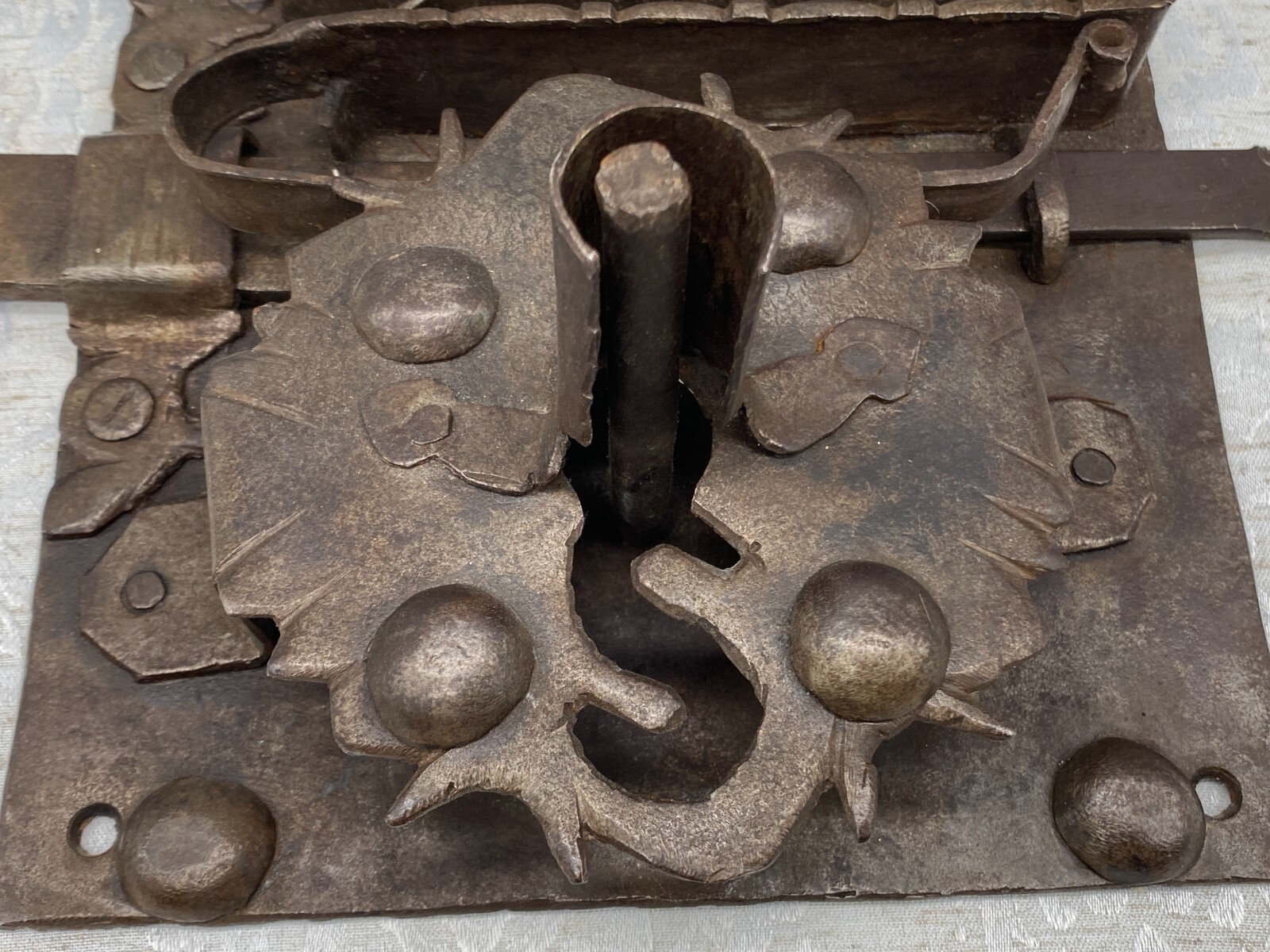 Sehr grosses Vorratstorschloss aus Eisen, handgeschmiedet, 17-tes Jhdt. Mechanik funktionsfähig, Oberfläche entrostet und geölt, Spuren von Korrosion. Gesamtabmessungen BTH 45/5/24,5cm, Grundplatte BxH 24,5×24,5cm.