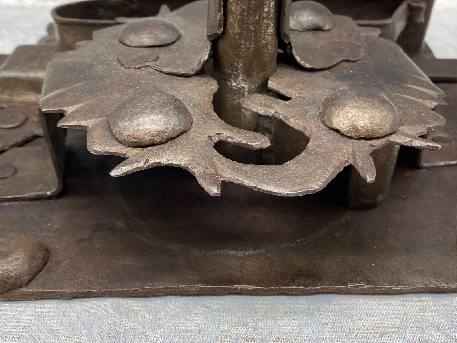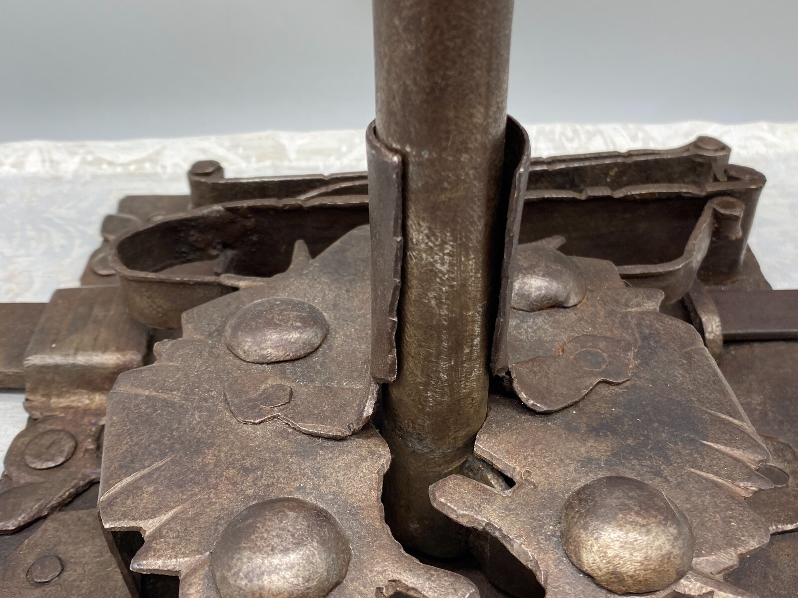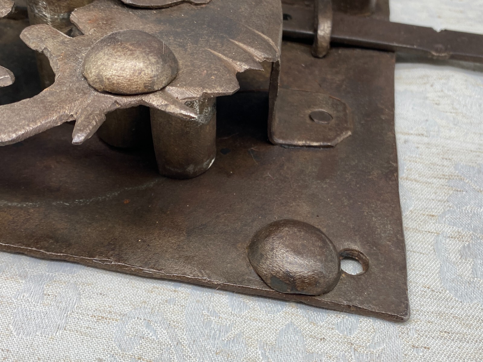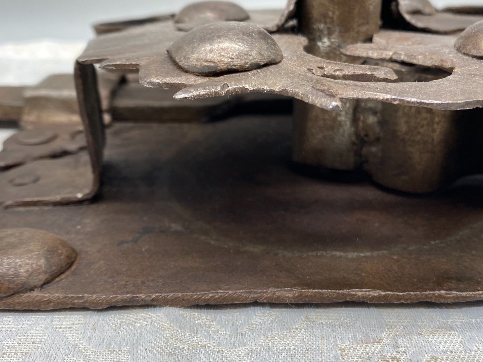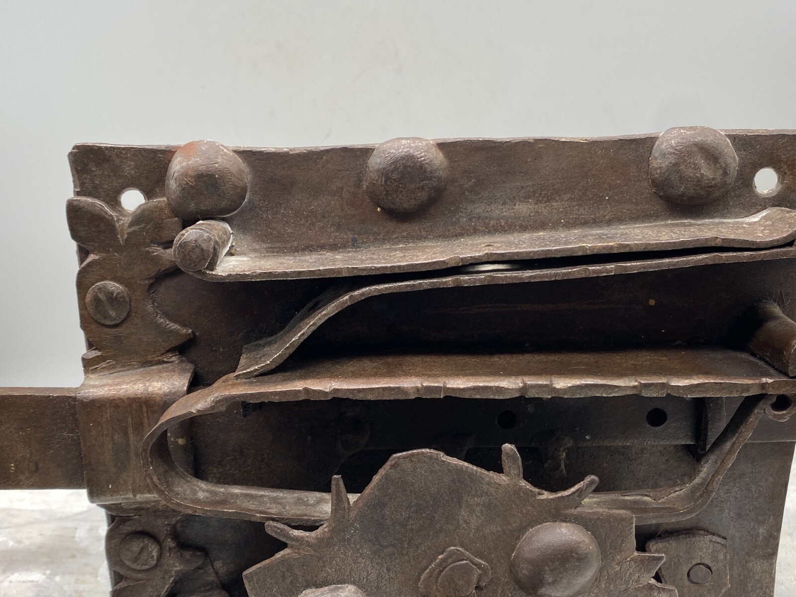 Sehr grosses Vorratstorschloss aus Eisen, handgeschmiedet, 17-tes Jhdt. Mechanik funktionsfähig, Oberfläche entrostet und geölt, Spuren von Korrosion. Gesamtabmessungen BTH 45/5/24,5cm, Grundplatte BxH 24,5×24,5cm.
