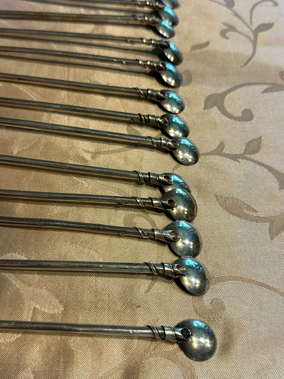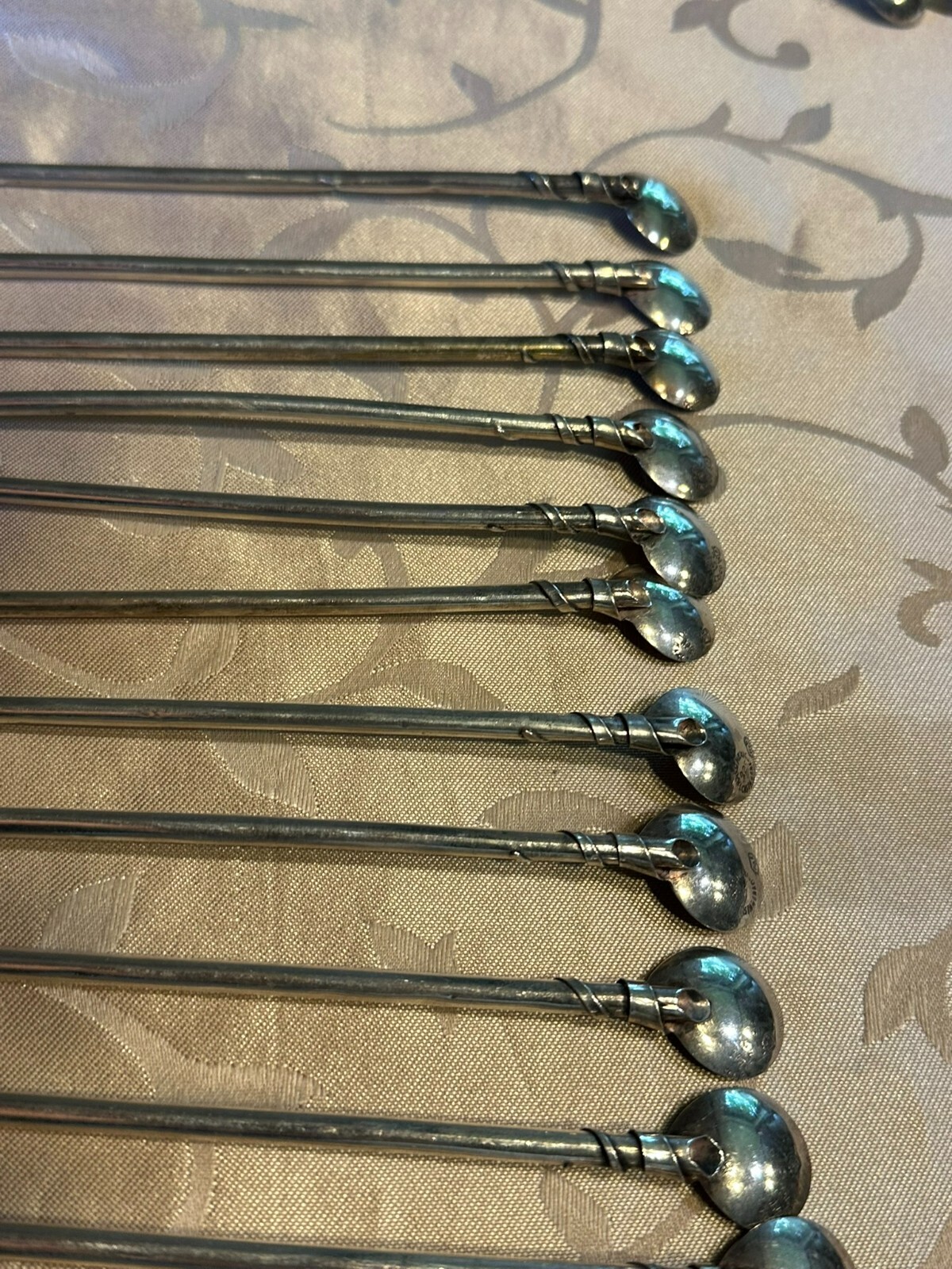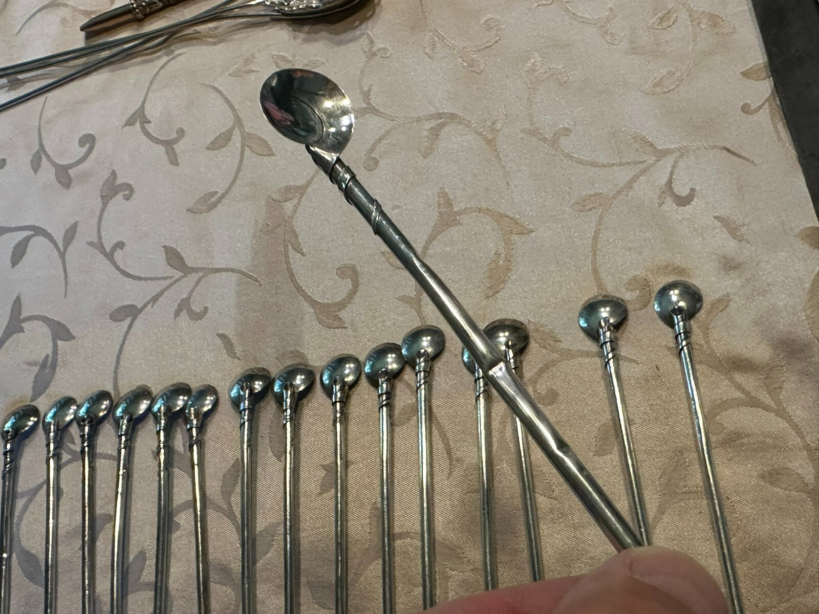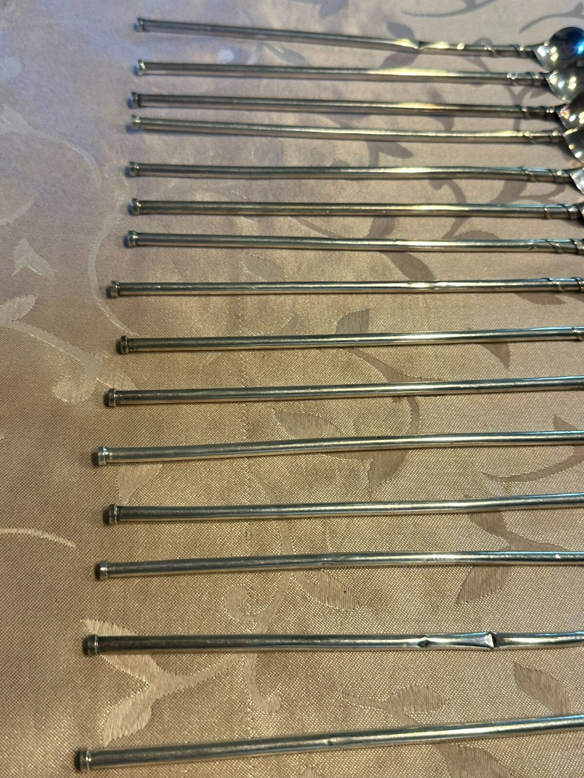 Set bestehend aus 17 Latte Macchiato Löffeln aus Sterling Silber 925, punziert. Einige der Löfffel haben Knicke im Schaft, möglicherwesie hier undicht. Gesamtlänge 18,5cm, Gesamtgewicht 57g.