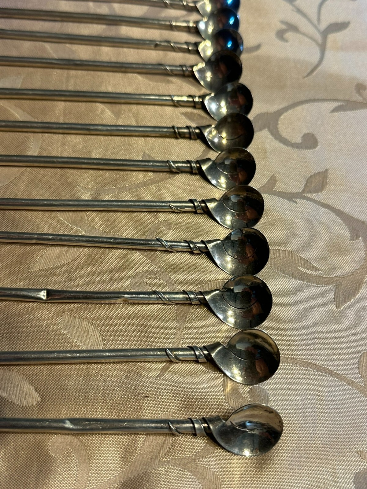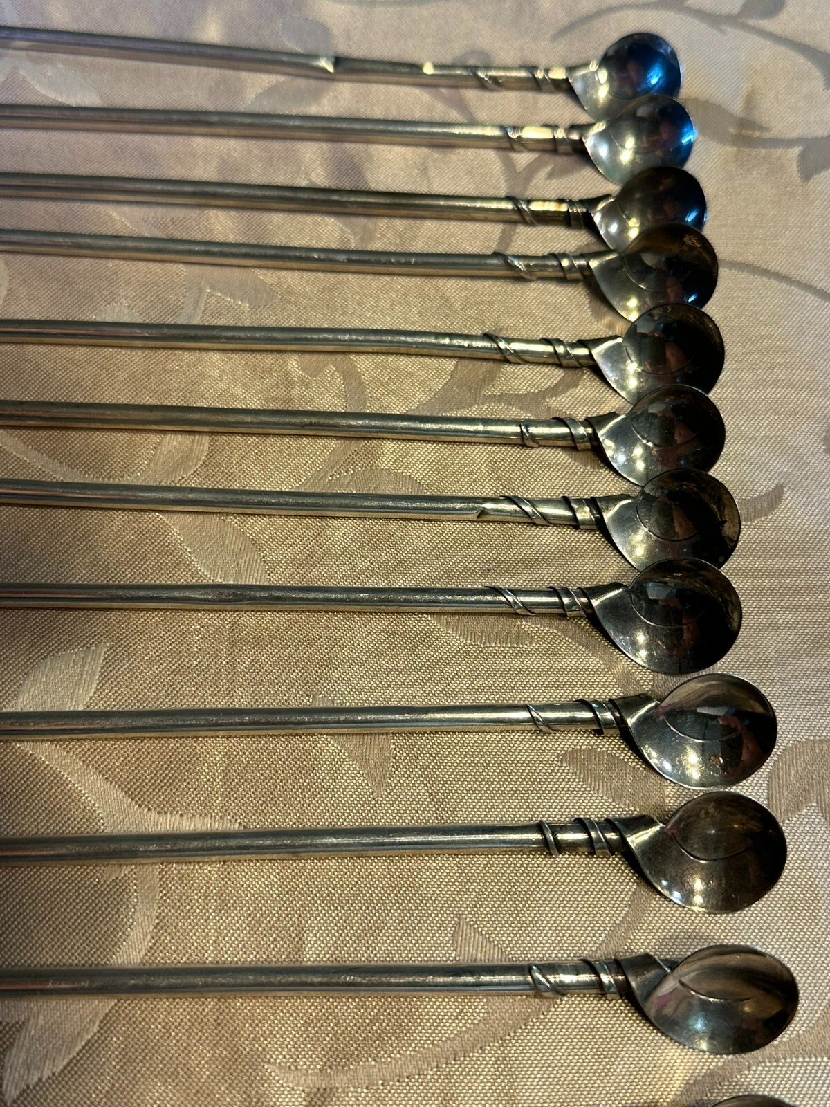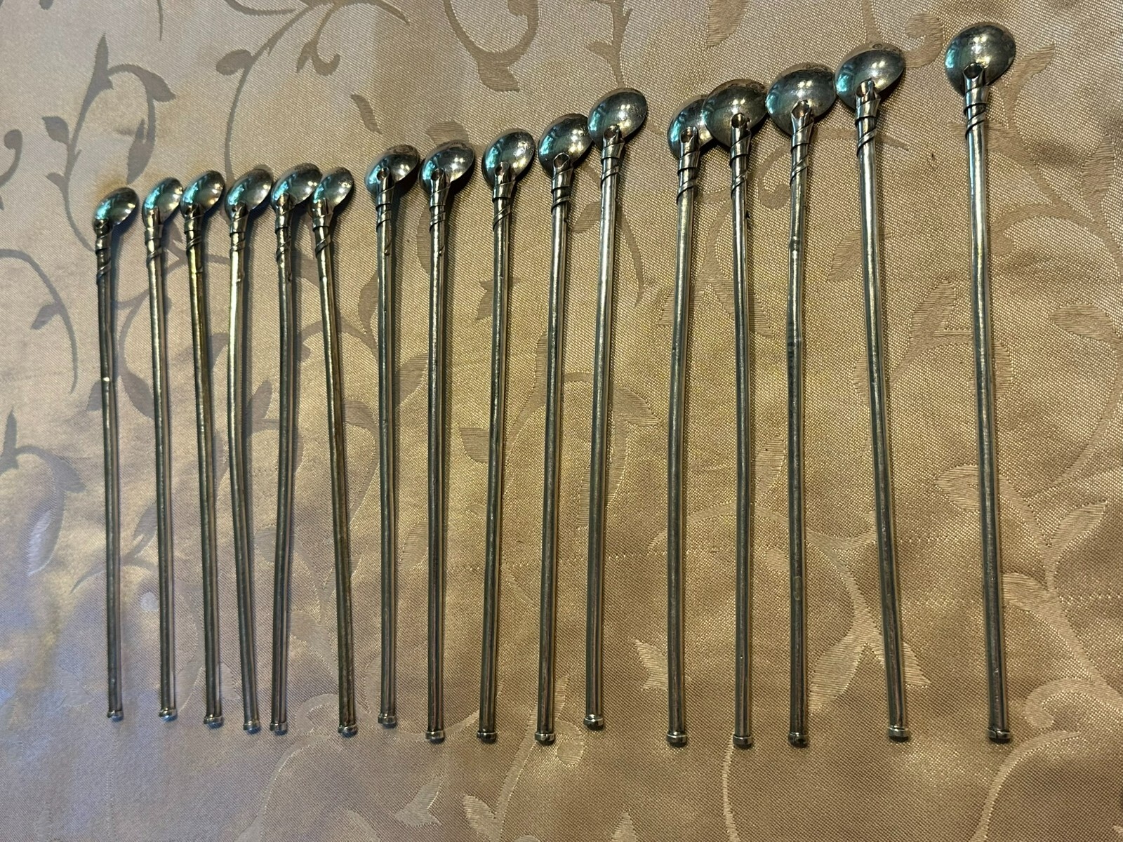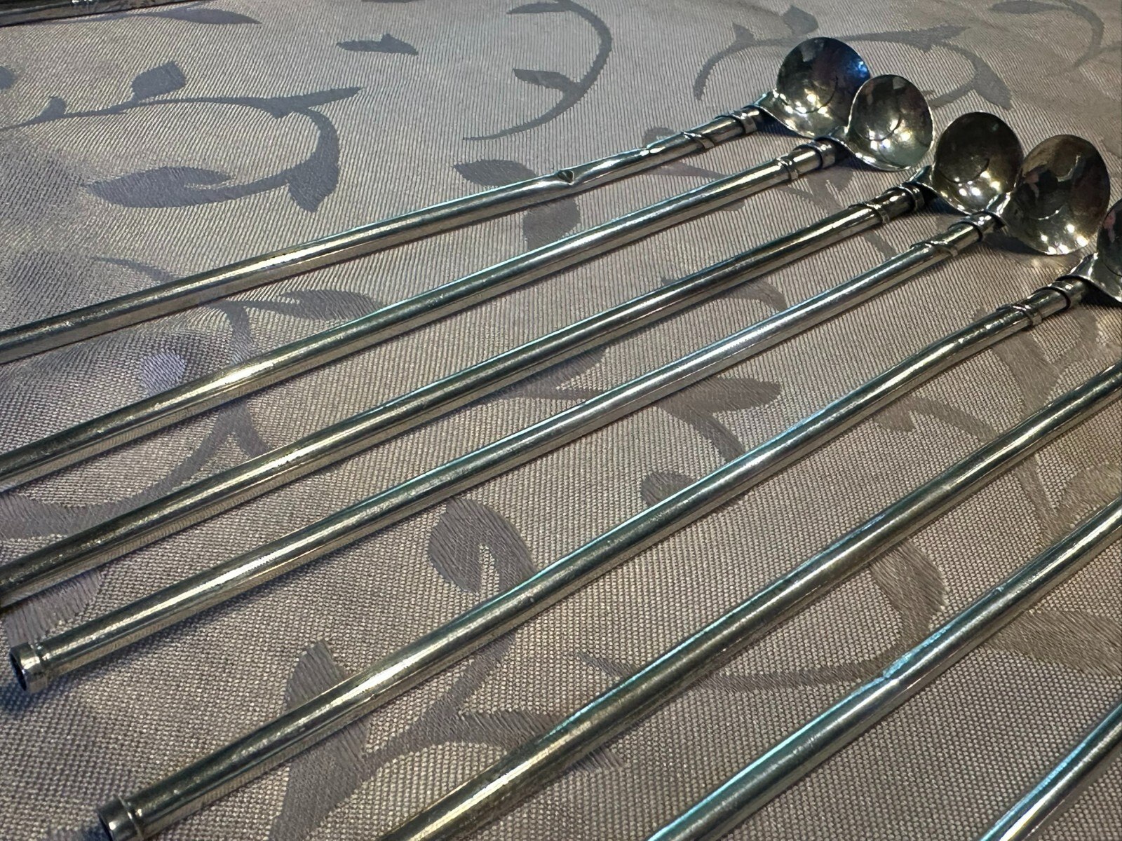 Set bestehend aus 17 Latte Macchiato Löffeln aus Sterling Silber 925, punziert. Einige der Löfffel haben Knicke im Schaft, möglicherwesie hier undicht. Gesamtlänge 18,5cm, Gesamtgewicht 57g.