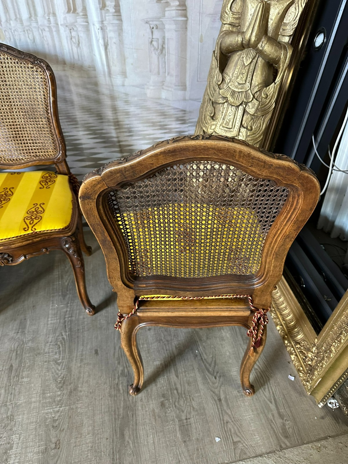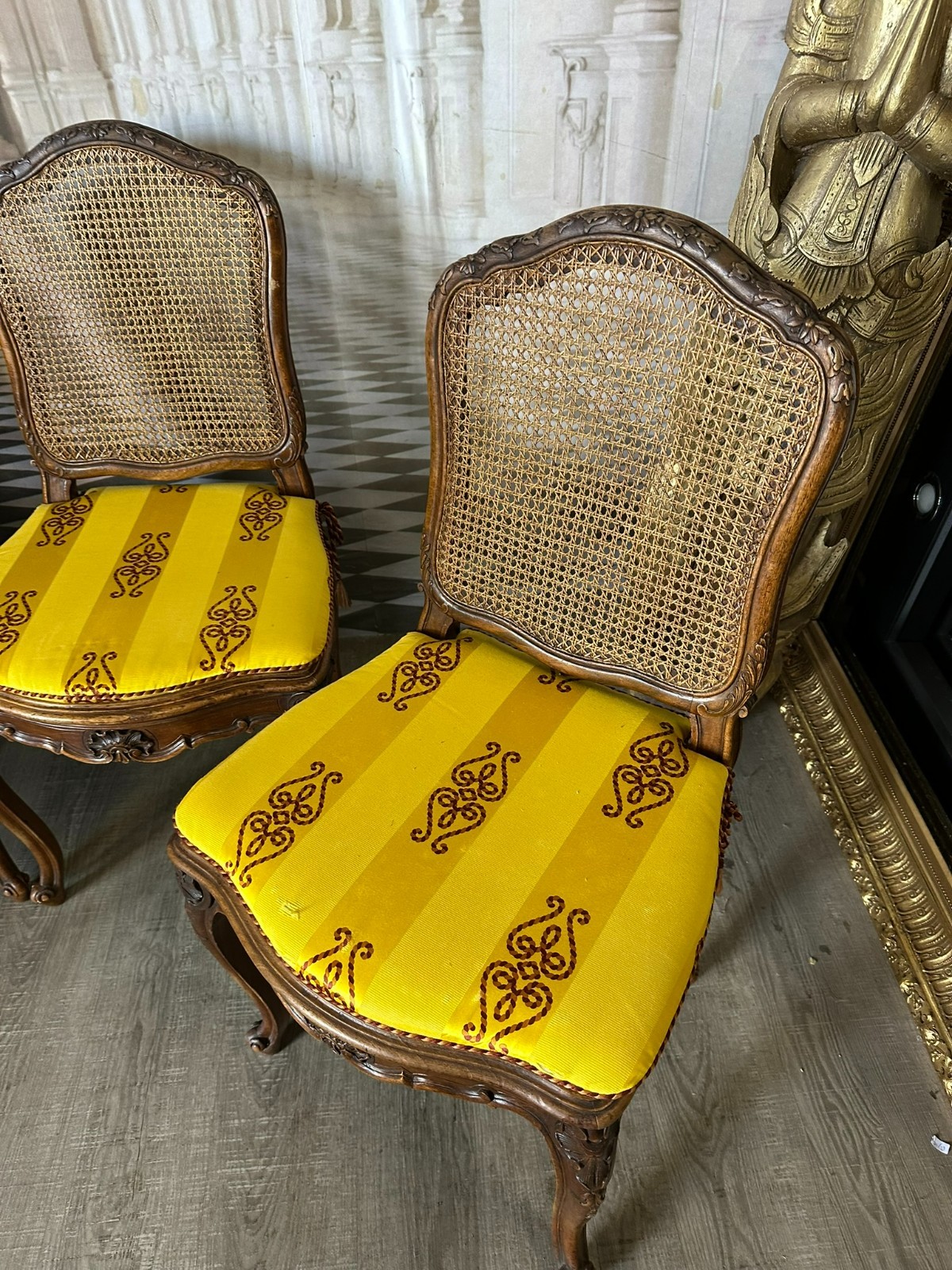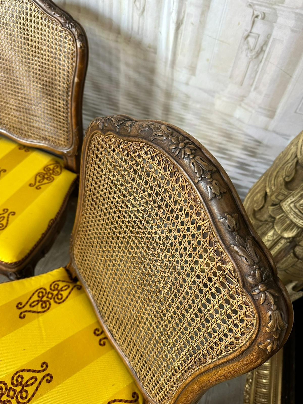 Sehr schönes Set bestehend aus vier Barockstühlen mit feinen Schnitzereien und Rattansitzflächen und Rückenlehnen. Am Rattan keine Schäden, Gestelle minimalst berieben. Die Stühle sind insgesamt in sich stabil. Abmessungen BTH 50/55/96cm, Sitzhöhe 50cm.