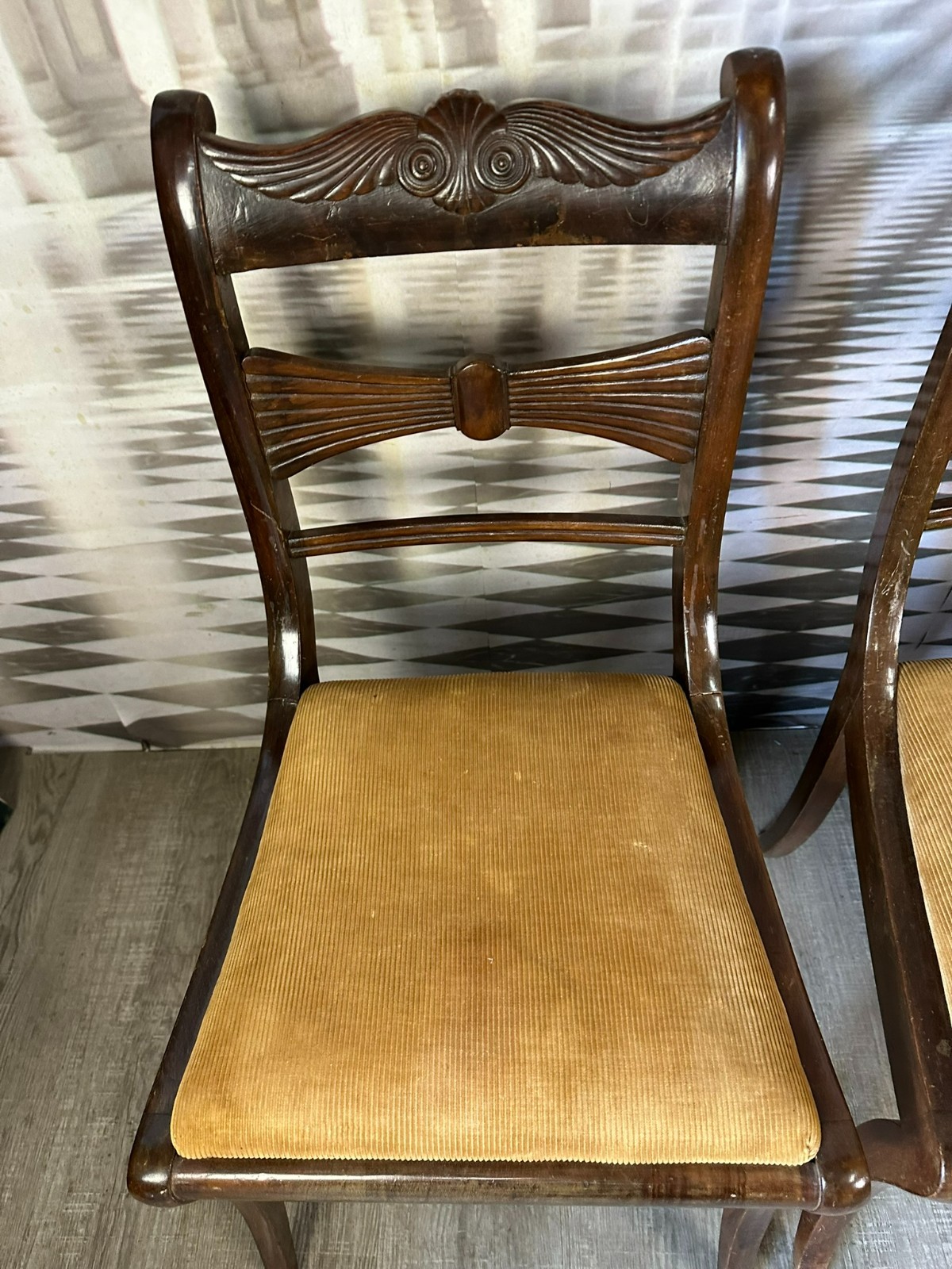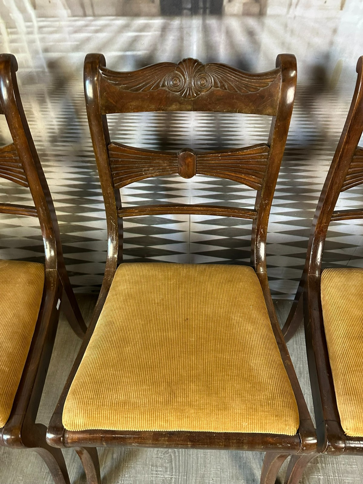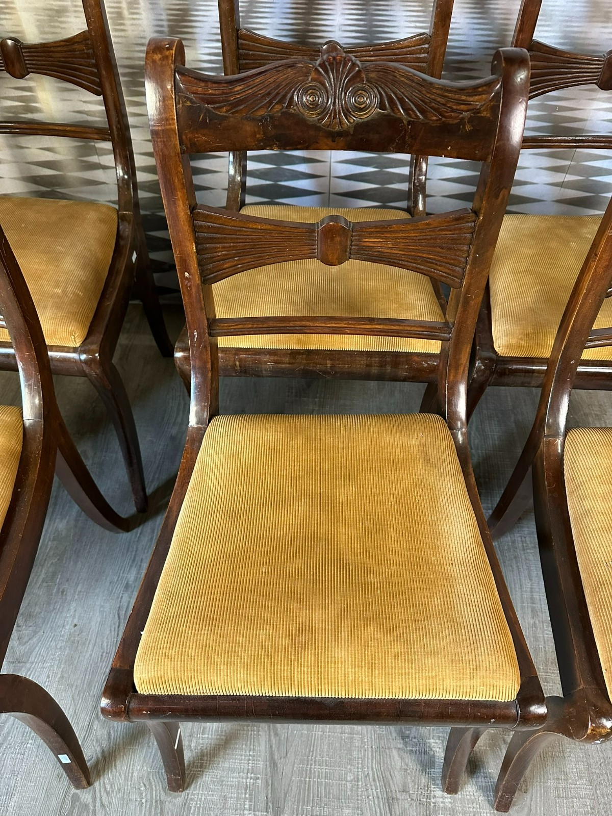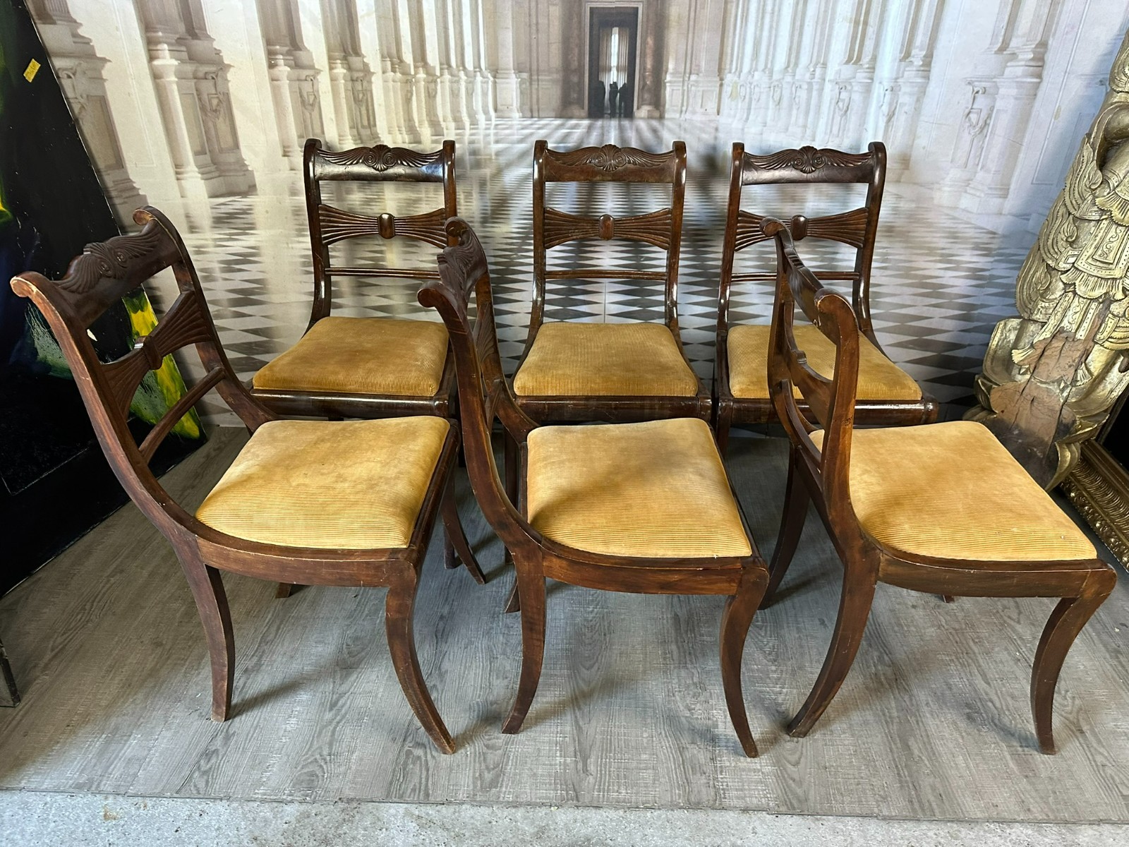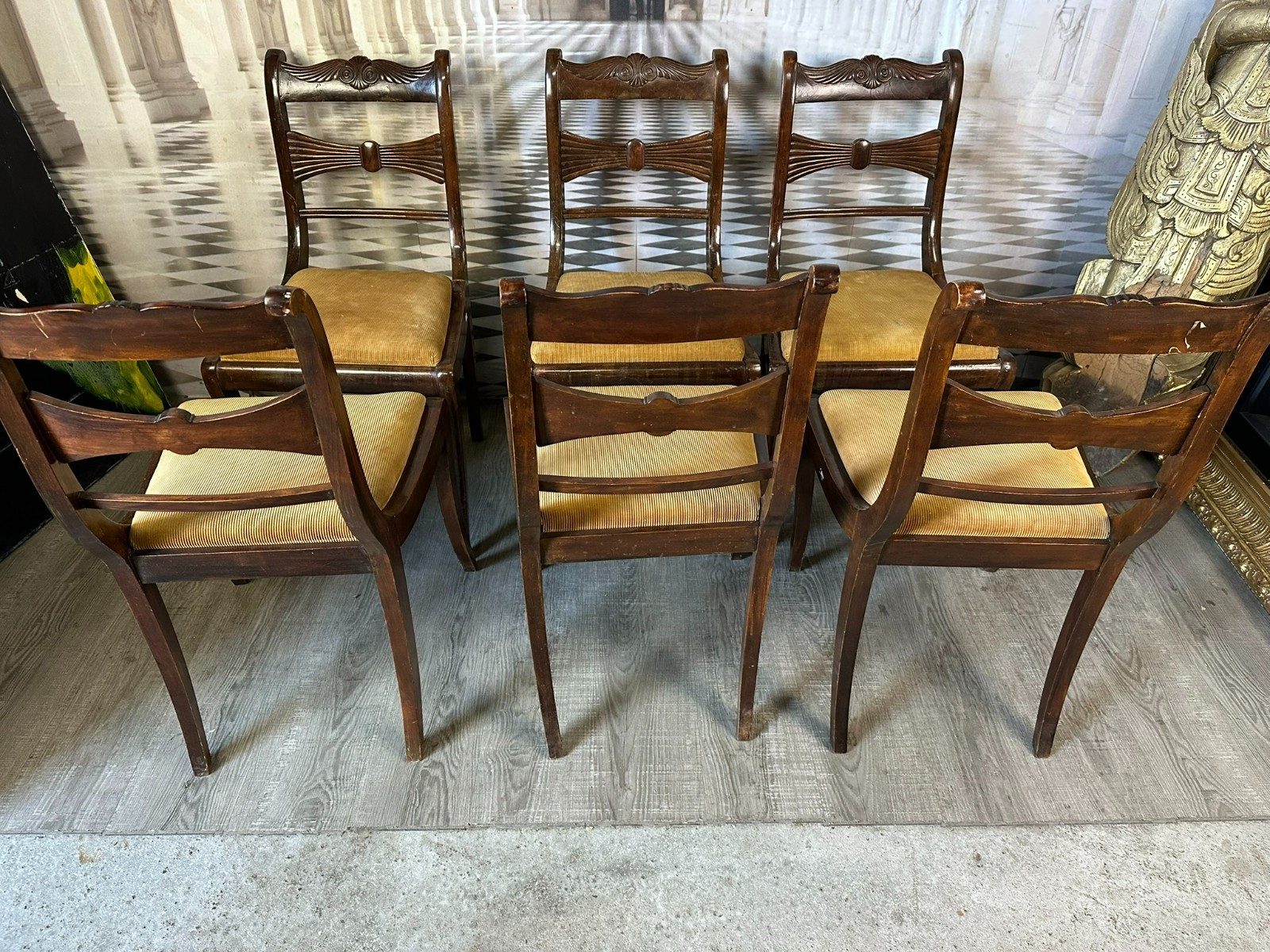 Set bestehend aus sechs antiken englischen Regency-Stühlen, 19-tes Jhdt. Die Sitzflächen wurden mal überarbeitet und sind leicht fleckig. Gestelle aus Mahagoni, dunkelbraun patiniert. Insgesamt Abrieb, kleiner Druckstellen und Nutzungsspuren. Die Füße zum Teil leicht krumm, die Stabilität wird dadurch nicht beeinträchtigt. Guter Sitzkomfort. Einer der sechs Stühle geht an einer hinteren Verbundstelle (siehe Foto) leicht auseinander. Abmessungen BTH 45/49/85cm, Sitzhöhe 47cm.